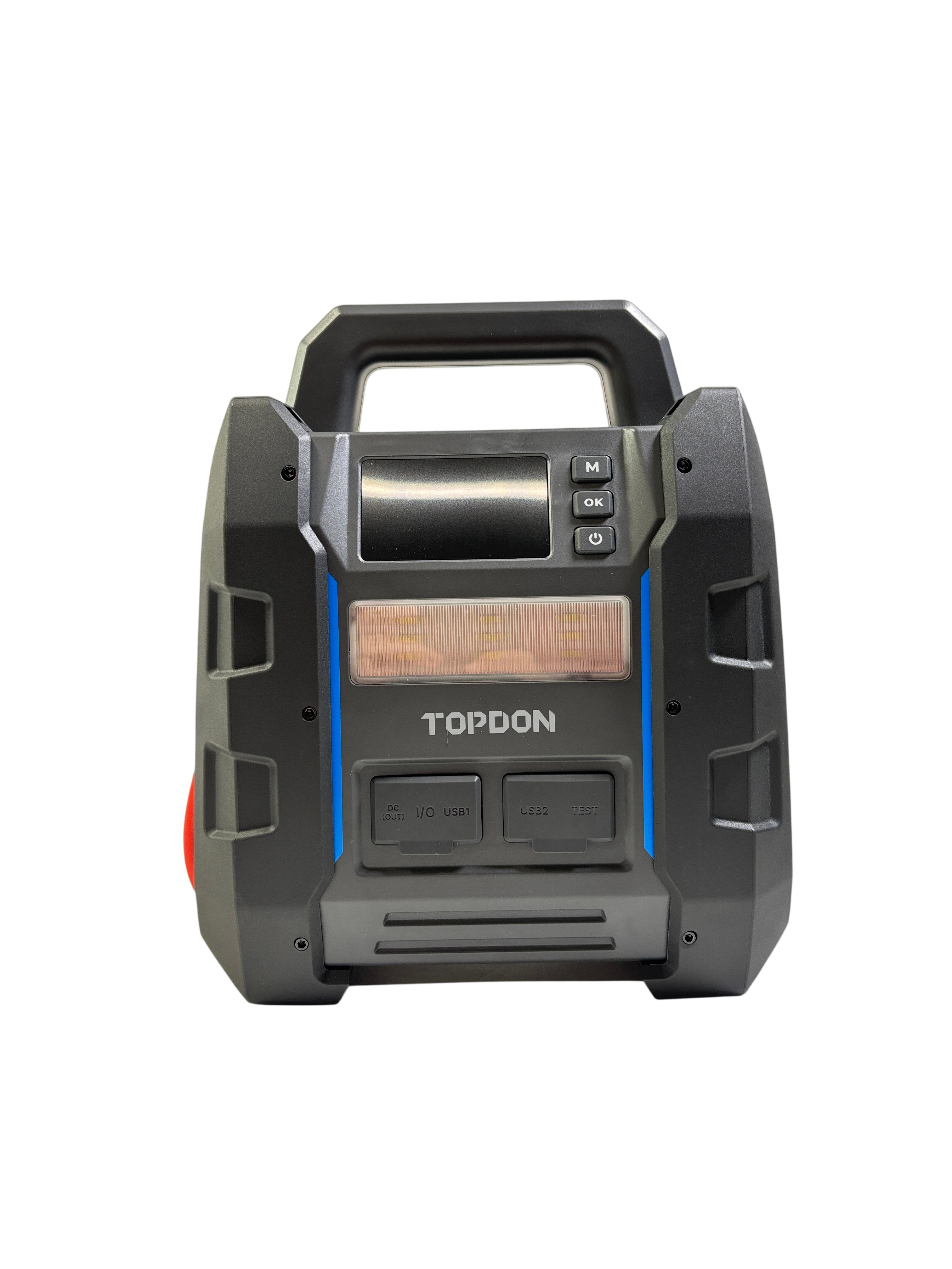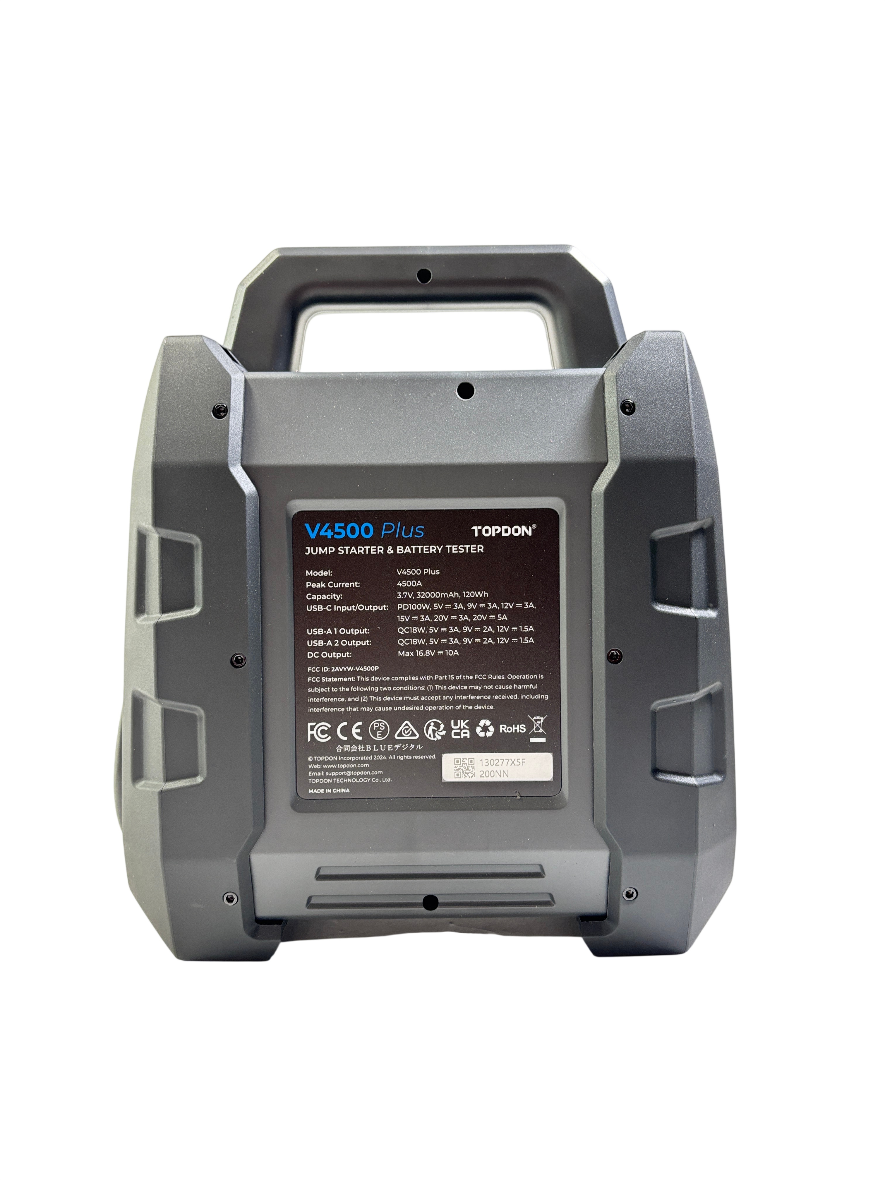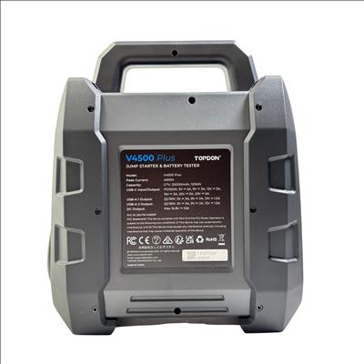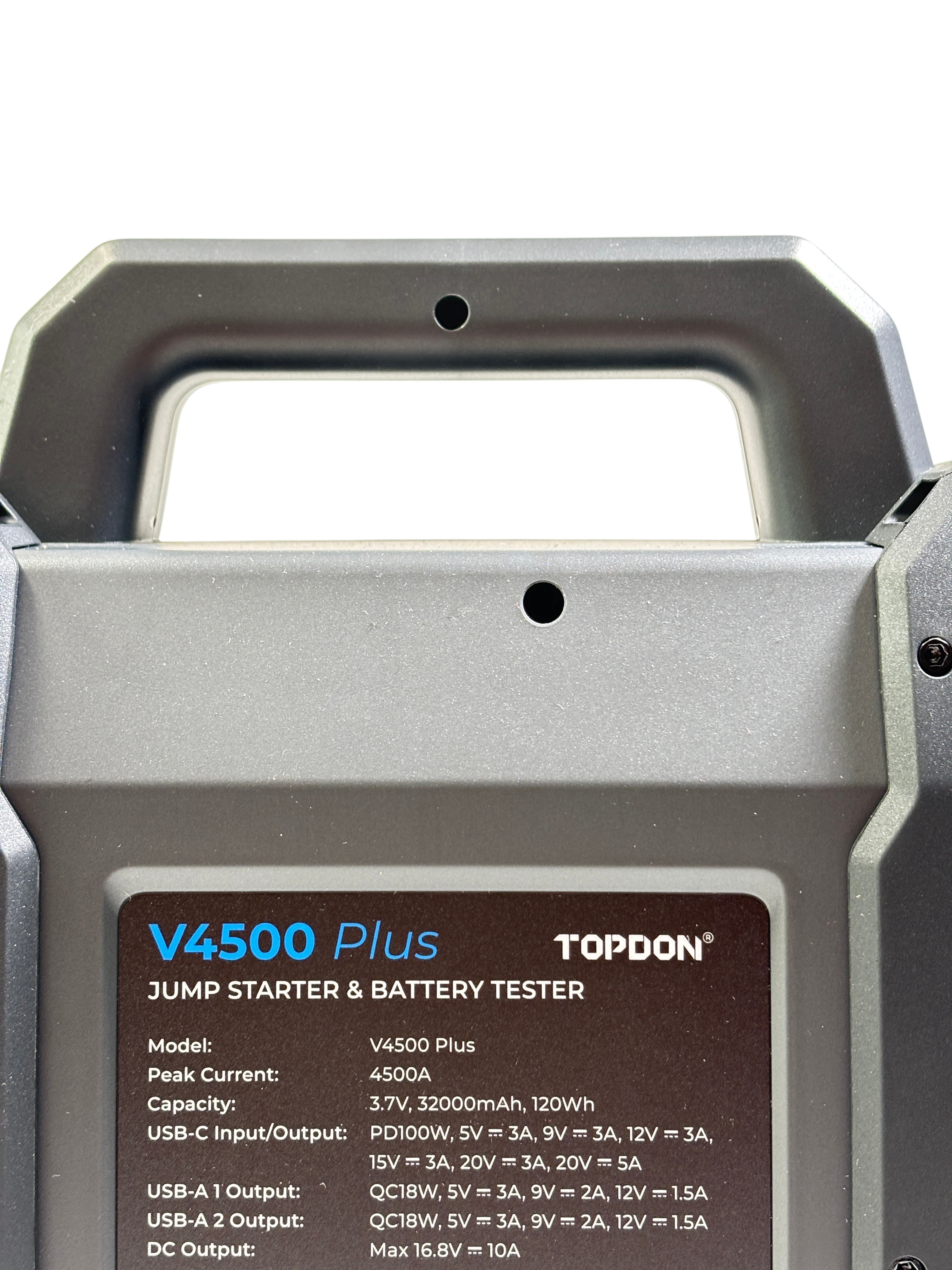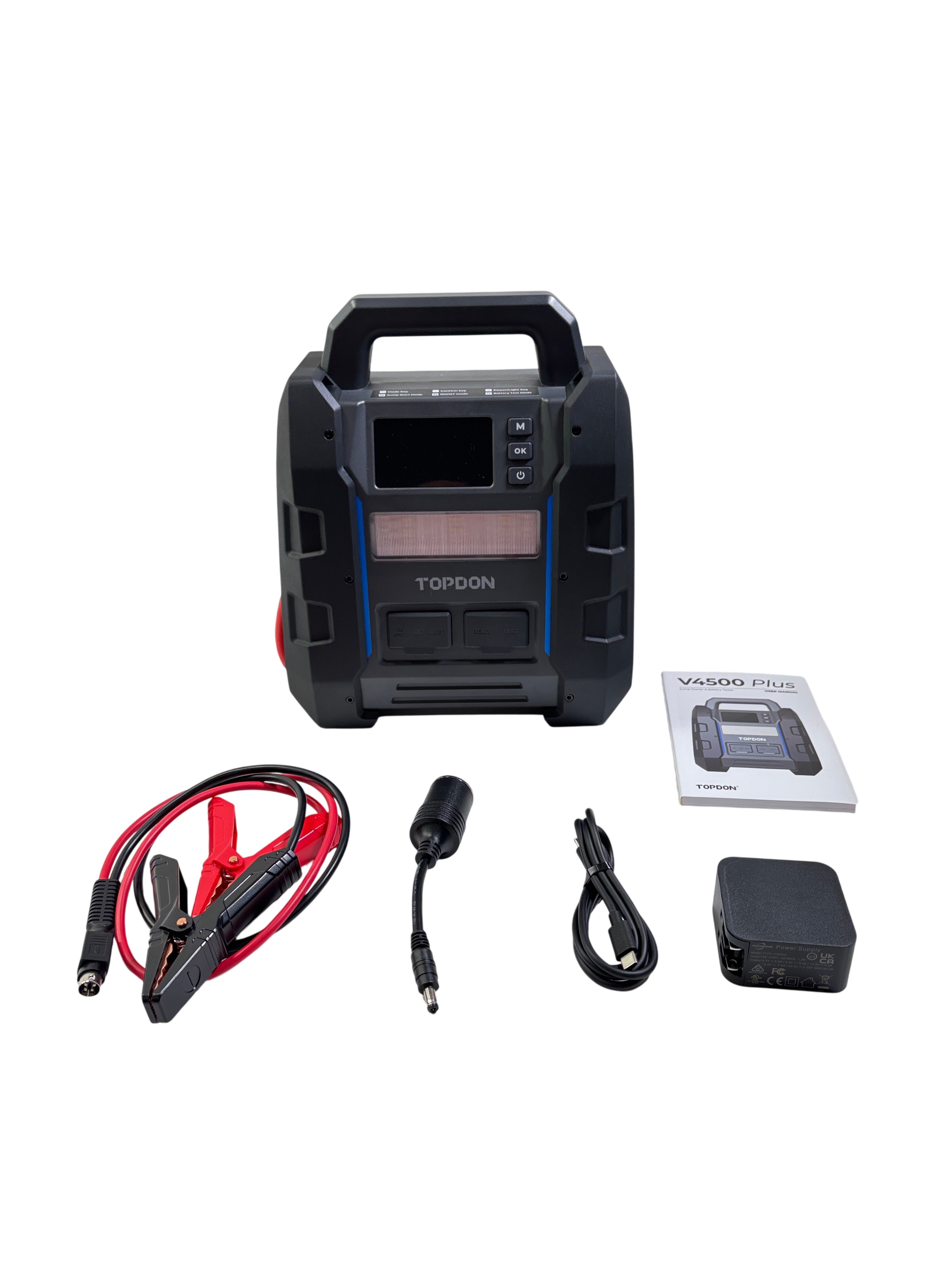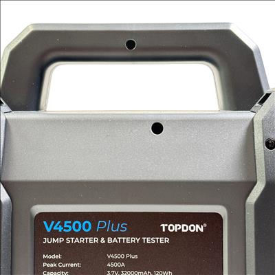 The TOPDON V4500 Plus Jump Starter & Battery Tester offers a powerful 4500A peak current and a high capacity 32000mAh lithium battery, making it an essential tool for automotive emergencies. Equipped with multiple USB outputs including a 100W USB-C Power Delivery port, it can charge a variety of devices while also providing reliable jump-starting capability. This compact and portable unit includes jumper cables, a DC adapter cable, USB-C cable, power adapter, and a user manual, making it ready for immediate use. Its built-in battery tester and durable design with a convenient handle make it ideal for both professional mechanics and everyday drivers.