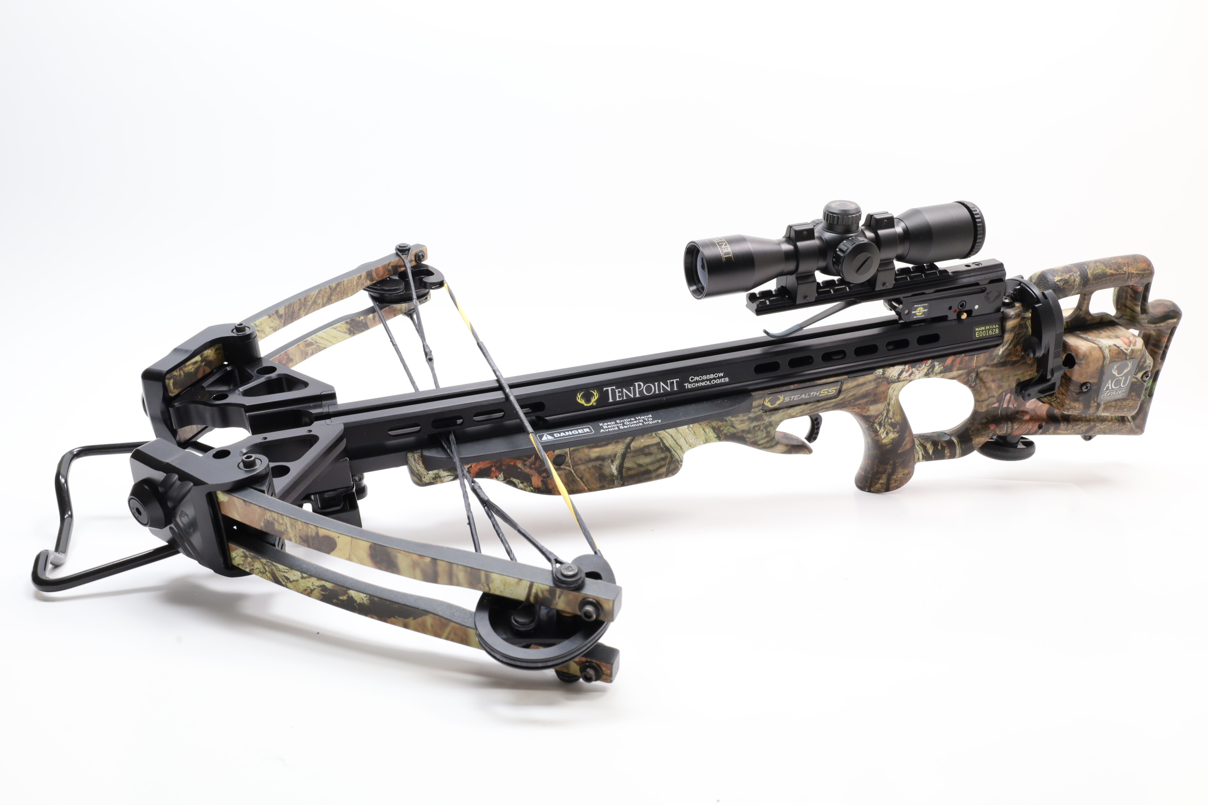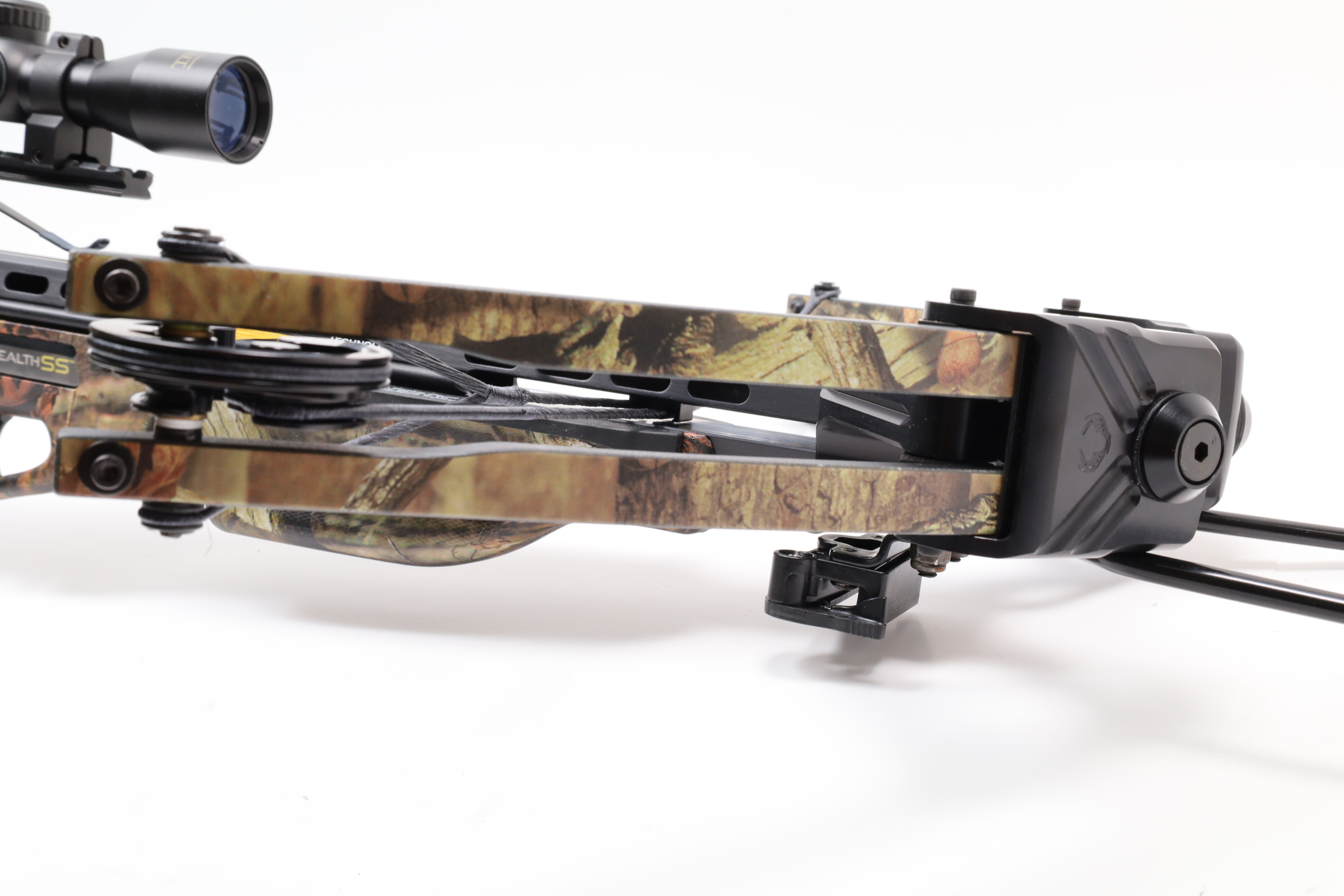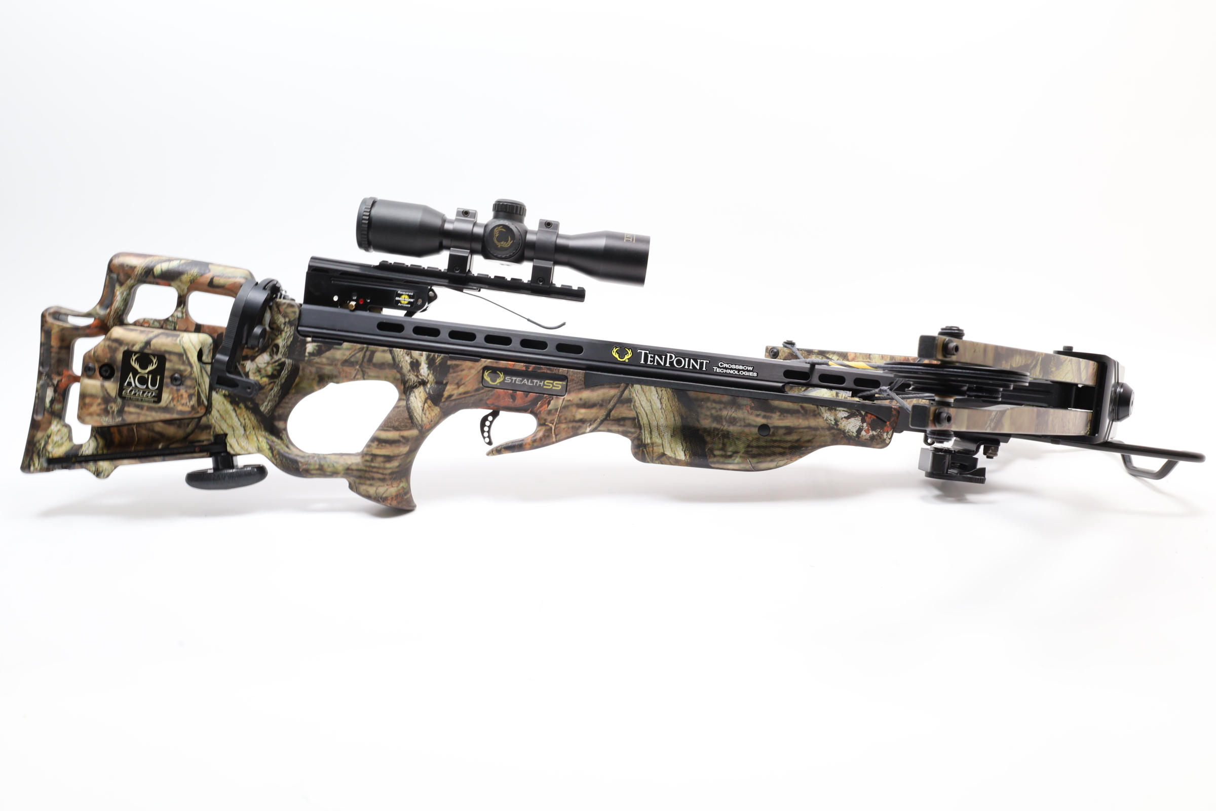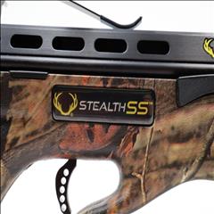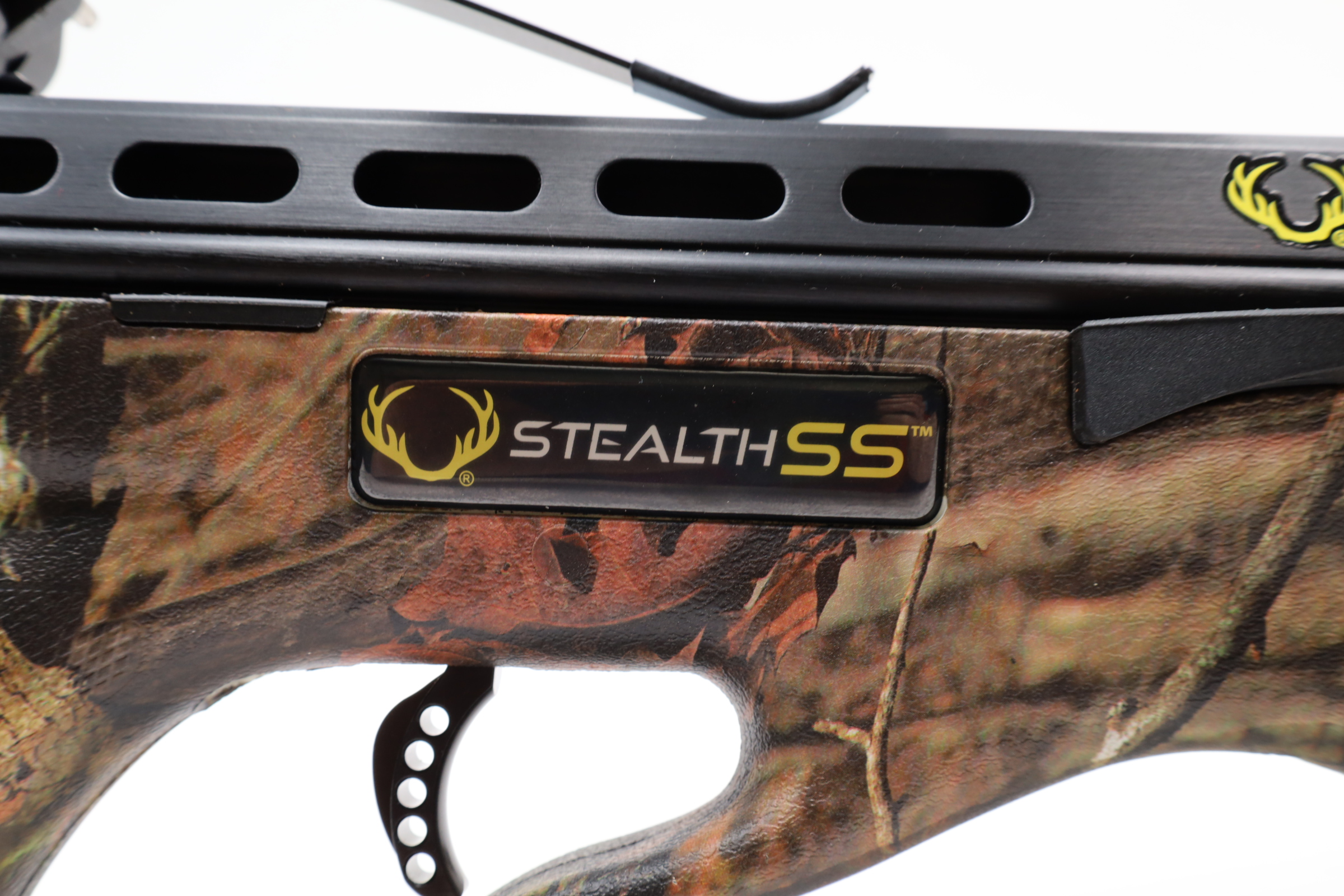 Delivers powerful performance with a 185-pound draw weight, firing arrows at up to 352 feet per second (fps) with 102 foot-pounds of kinetic energy. It measures 34.5 inches in length and 17.5 inches in width at rest, narrowing to 13.5 inches when cocked, and weighs 6.8 pounds. The crossbow's design incorporates an FSB (Functionally Superior Bullpup) stock that allows for a compact frame while maintaining a 12.6-inch power stroke. Safety features include molded rubber finger guards and TenPoint’s DFI (Dry Fire Inhibitor) to prevent misfires. The Stealth SS is compatible with TenPoint’s Omni Nock system and comes in a package that includes a 3x Pro-View 2 scope, a three-arrow ambidextrous quiver, and options for either ACUdraw or ACUdraw 50 cocking aids. The crossbow is finished with a black anodized barrel and a Mossy Oak Breakup Infinity stock, offering a combination of power, compact design, and ease of handling for hunting in varied environments.