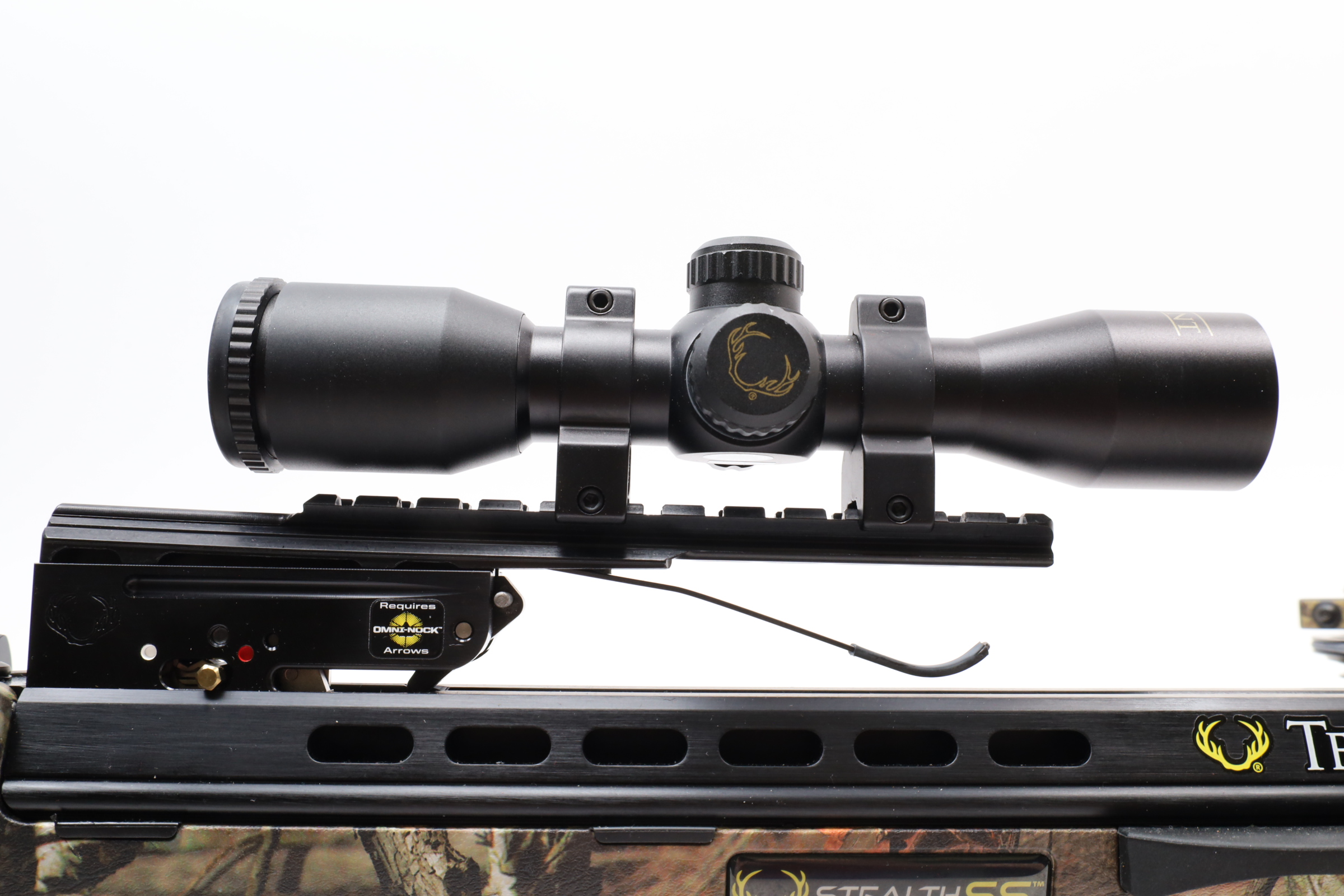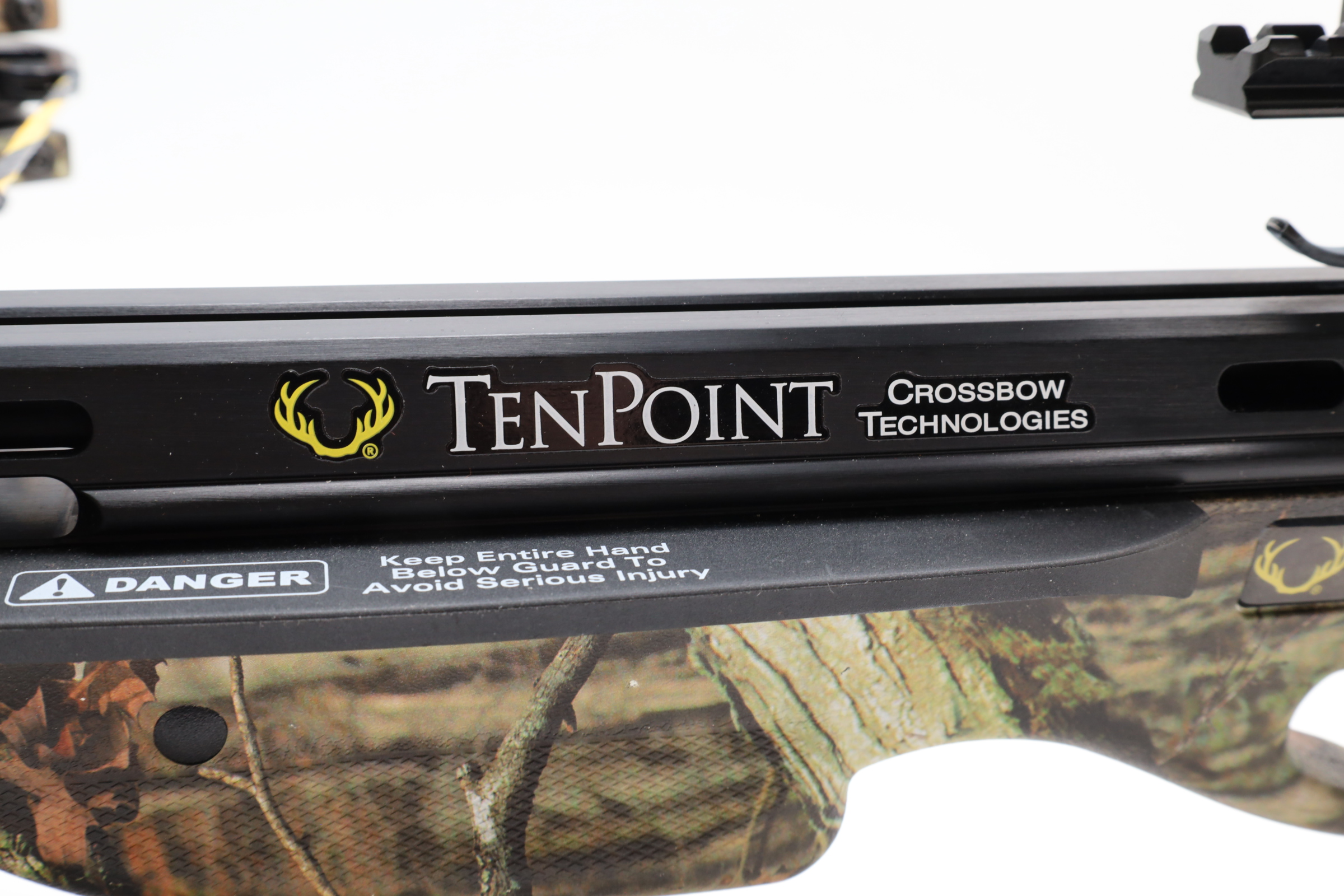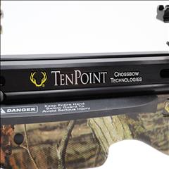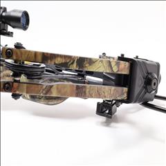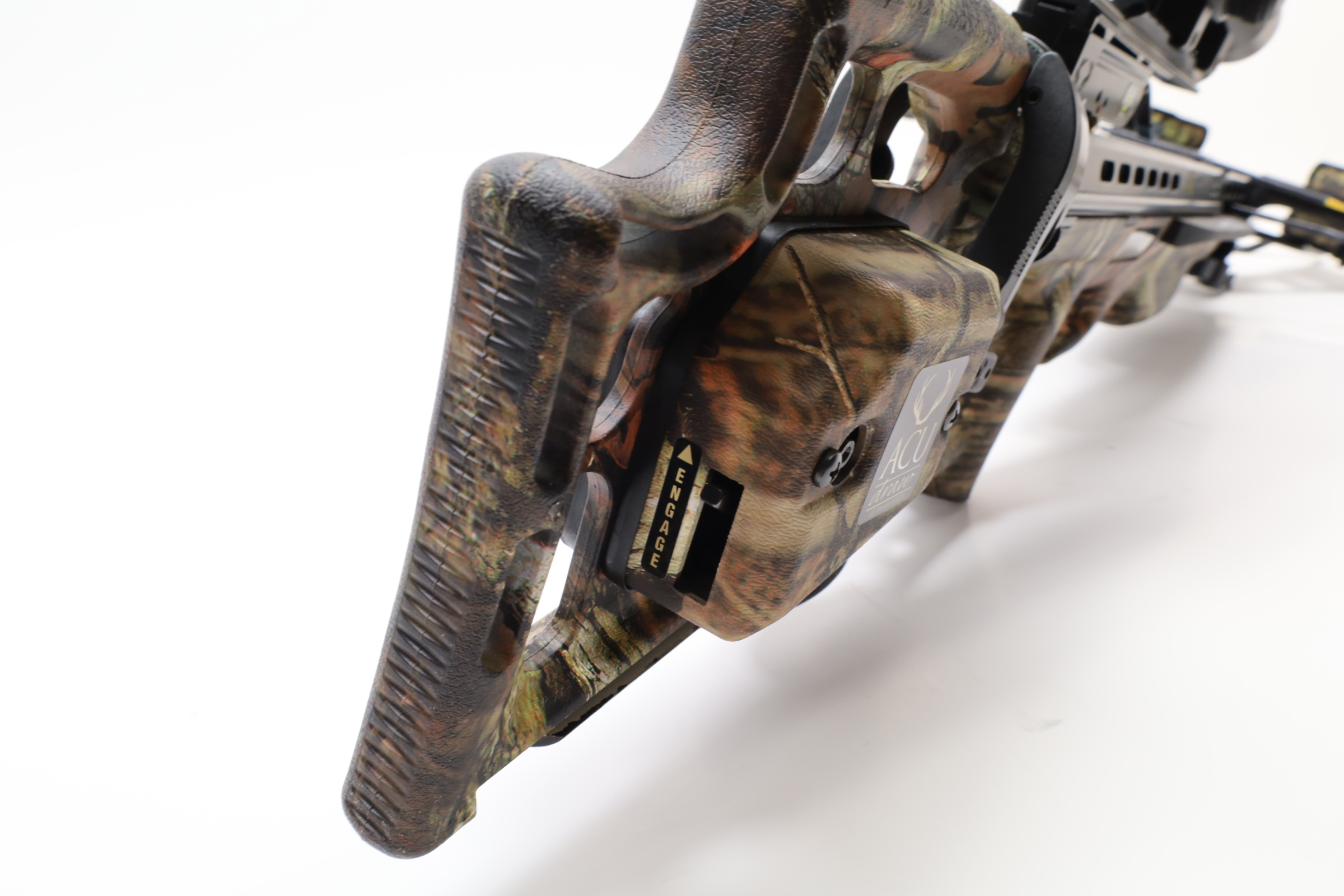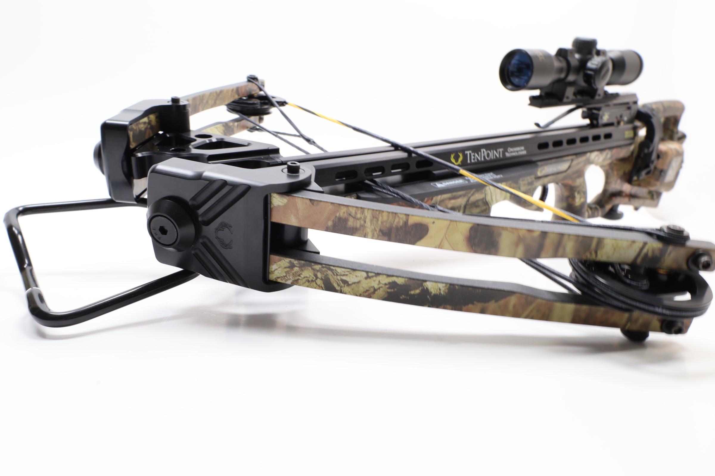 Delivers powerful performance with a 185-pound draw weight, firing arrows at up to 352 feet per second (fps) with 102 foot-pounds of kinetic energy. It measures 34.5 inches in length and 17.5 inches in width at rest, narrowing to 13.5 inches when cocked, and weighs 6.8 pounds. The crossbow's design incorporates an FSB (Functionally Superior Bullpup) stock that allows for a compact frame while maintaining a 12.6-inch power stroke. Safety features include molded rubber finger guards and TenPoint’s DFI (Dry Fire Inhibitor) to prevent misfires. The Stealth SS is compatible with TenPoint’s Omni Nock system and comes in a package that includes a 3x Pro-View 2 scope, a three-arrow ambidextrous quiver, and options for either ACUdraw or ACUdraw 50 cocking aids. The crossbow is finished with a black anodized barrel and a Mossy Oak Breakup Infinity stock, offering a combination of power, compact design, and ease of handling for hunting in varied environments.