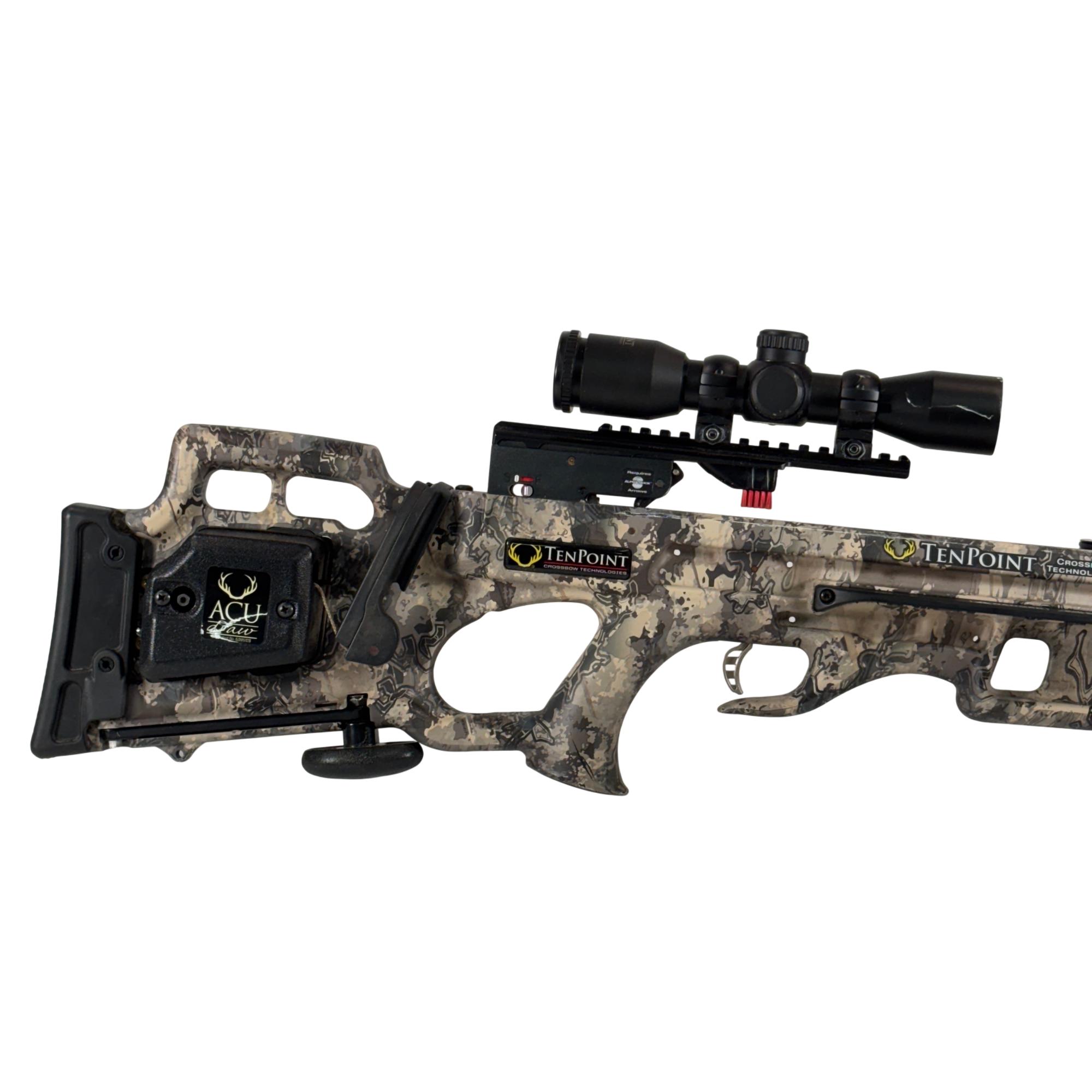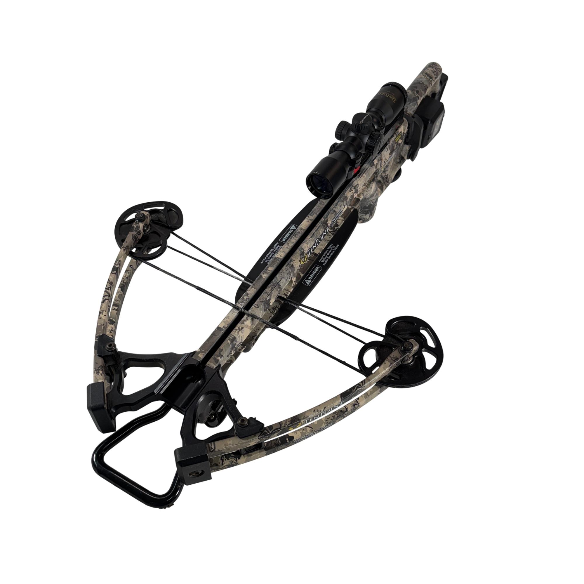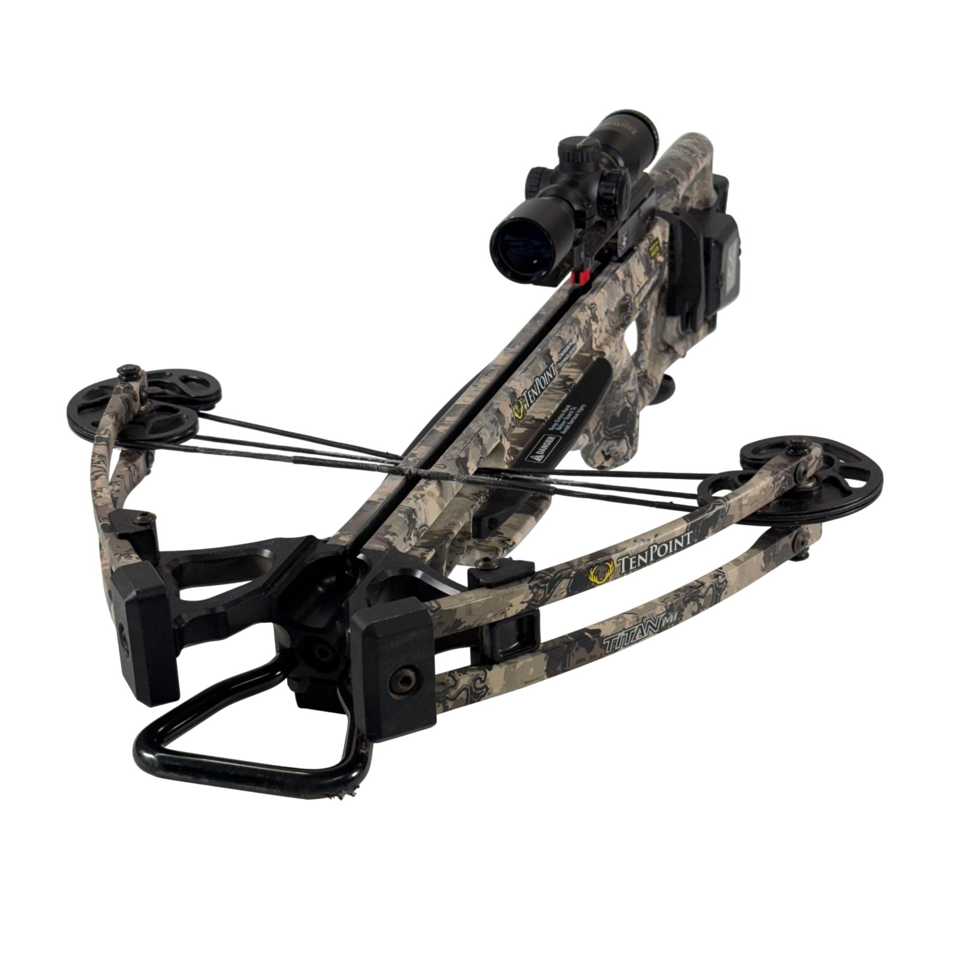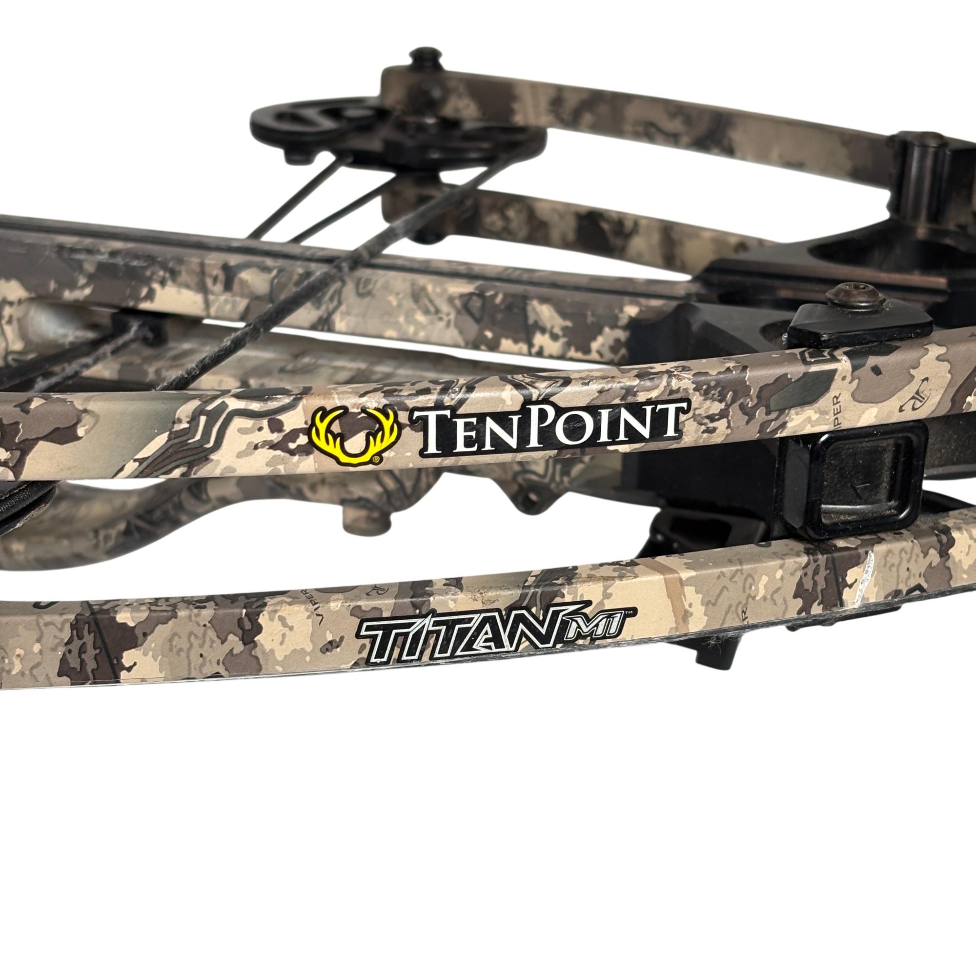 The TenPoint Titan M1 is a high-performance hunting compound crossbow delivering speeds up to 370 fps with 113 ft-lb of energy from a compact, narrow platform. VX-5 inverted cam technology provides a 14-inch power stroke for consistent accuracy, while the ambidextrous T5 trigger system offers smooth operation with an auto-engaging safety and dry-fire inhibitor. Fully integrated ACUdraw cocking simplifies handling of the 180 lb draw weight, and the lightweight, 9-inch axle-to-axle design when cocked enhances maneuverability in the field.