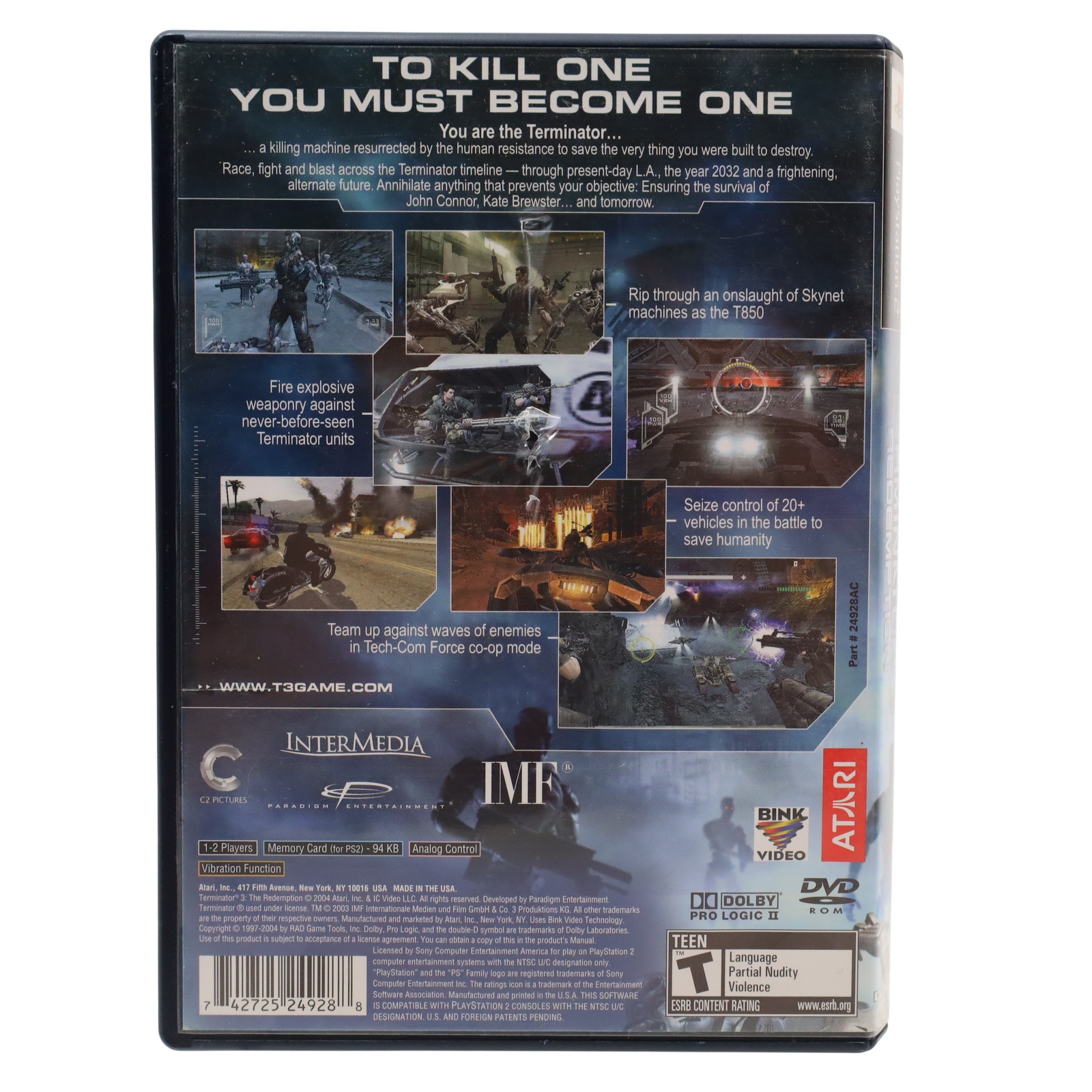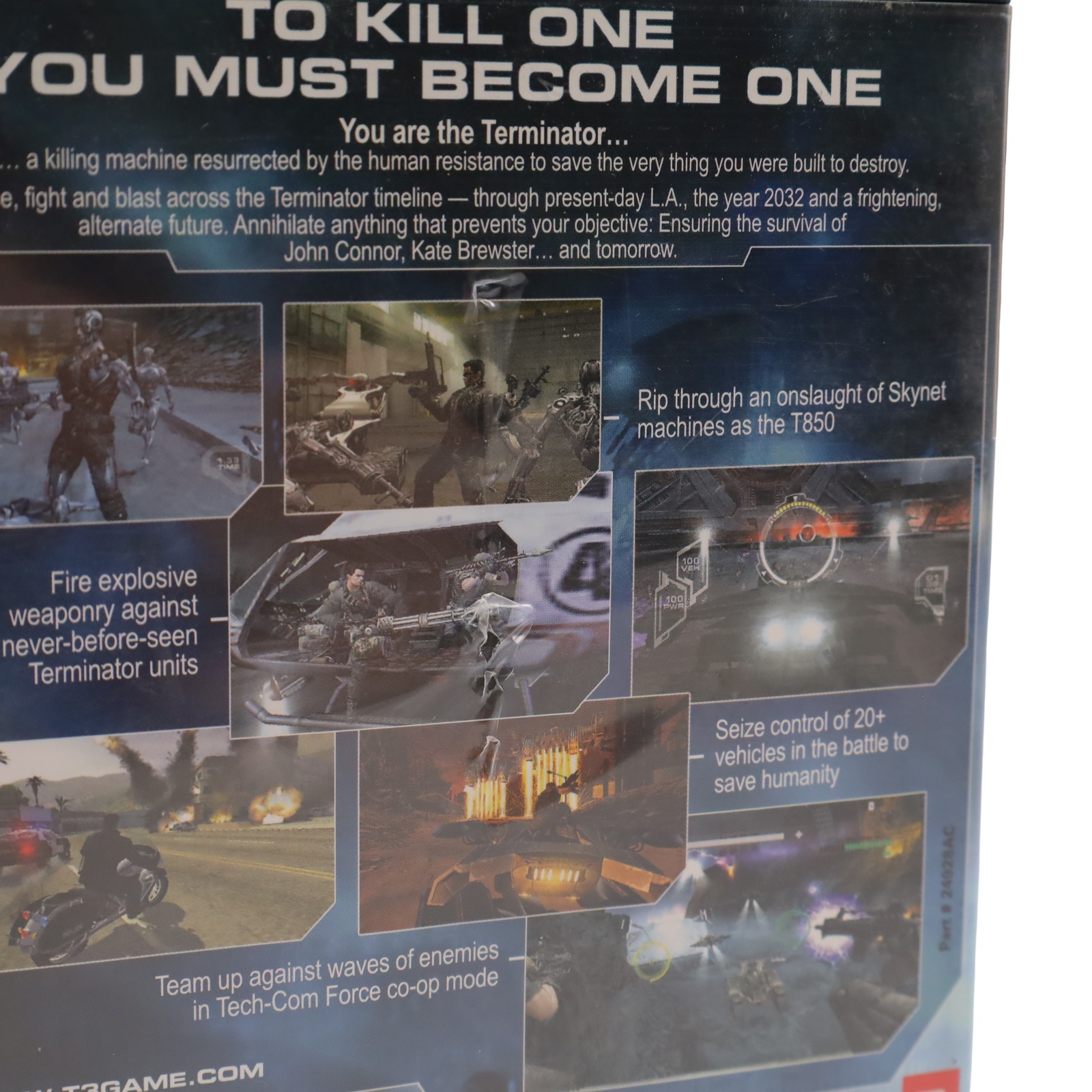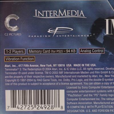 A third-person action game for the Sony PlayStation 2. The player controls a T-850 Terminator across 14 levels that expand upon the story of the film Terminator 3: Rise of the Machines. Gameplay consists of on-foot combat using firearms, hand-to-hand fighting, and improvised weapons, as well as a red-colored scan mode that is upgraded by collecting Terabytes. The title also features driving levels with various vehicles and rail shooter segments. The T-X serves as the primary antagonist, and a two-player cooperative rail shooter mode is included. The plot follows the T-850 as it is sent back in time to protect John and Kate from the T-X, concluding with a final confrontation at the Crystal Peak bunker.