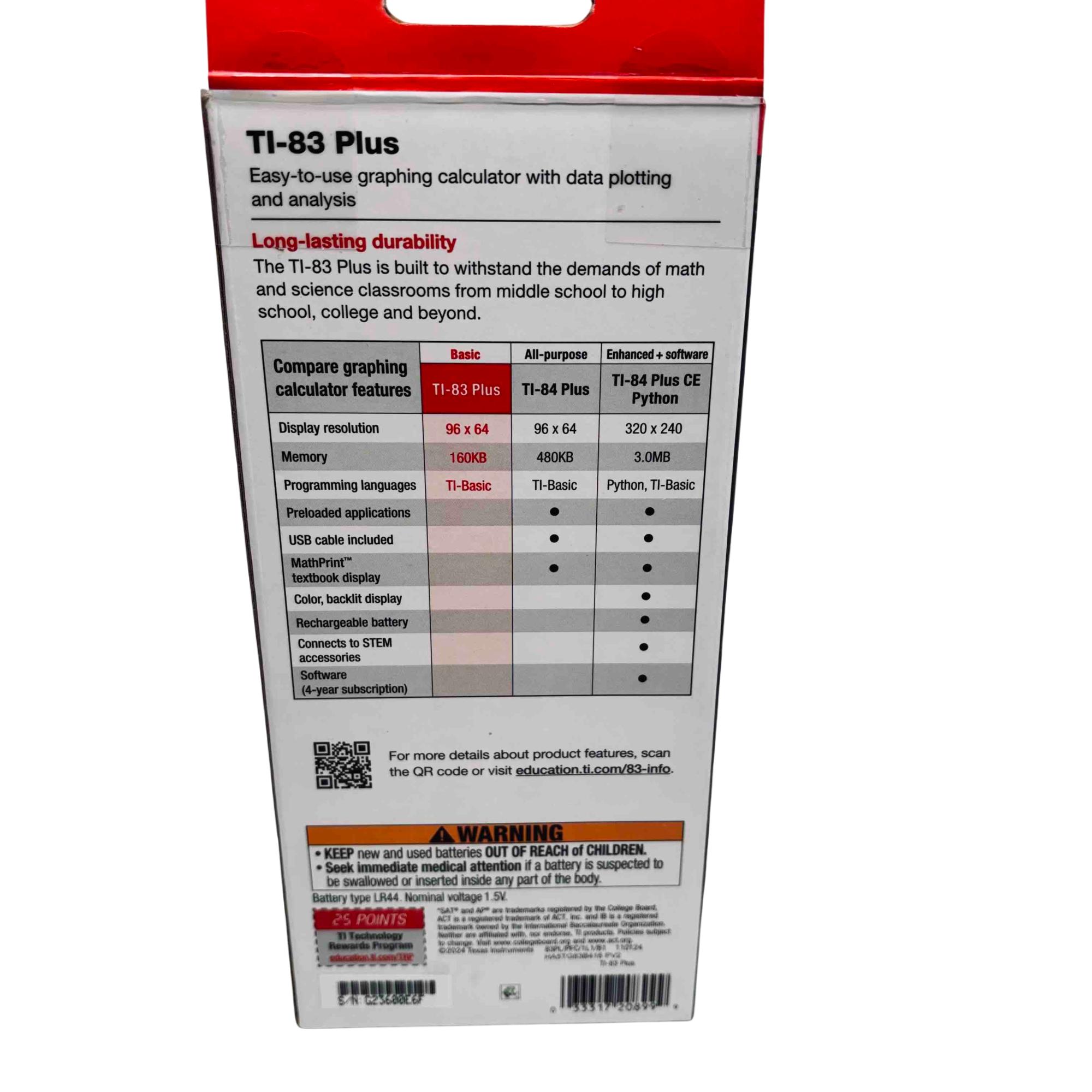 The Texas Instruments TI-83 Plus is a versatile, easy-to-use graphing calculator designed to handle data plotting, analysis, and complex mathematical functions. Built with durability in mind, it’s ideal for students from middle school to college, excelling in both math and science classrooms. With its intuitive interface and compatibility with various standardized tests, this calculator is a reliable companion for academics and test prep alike.