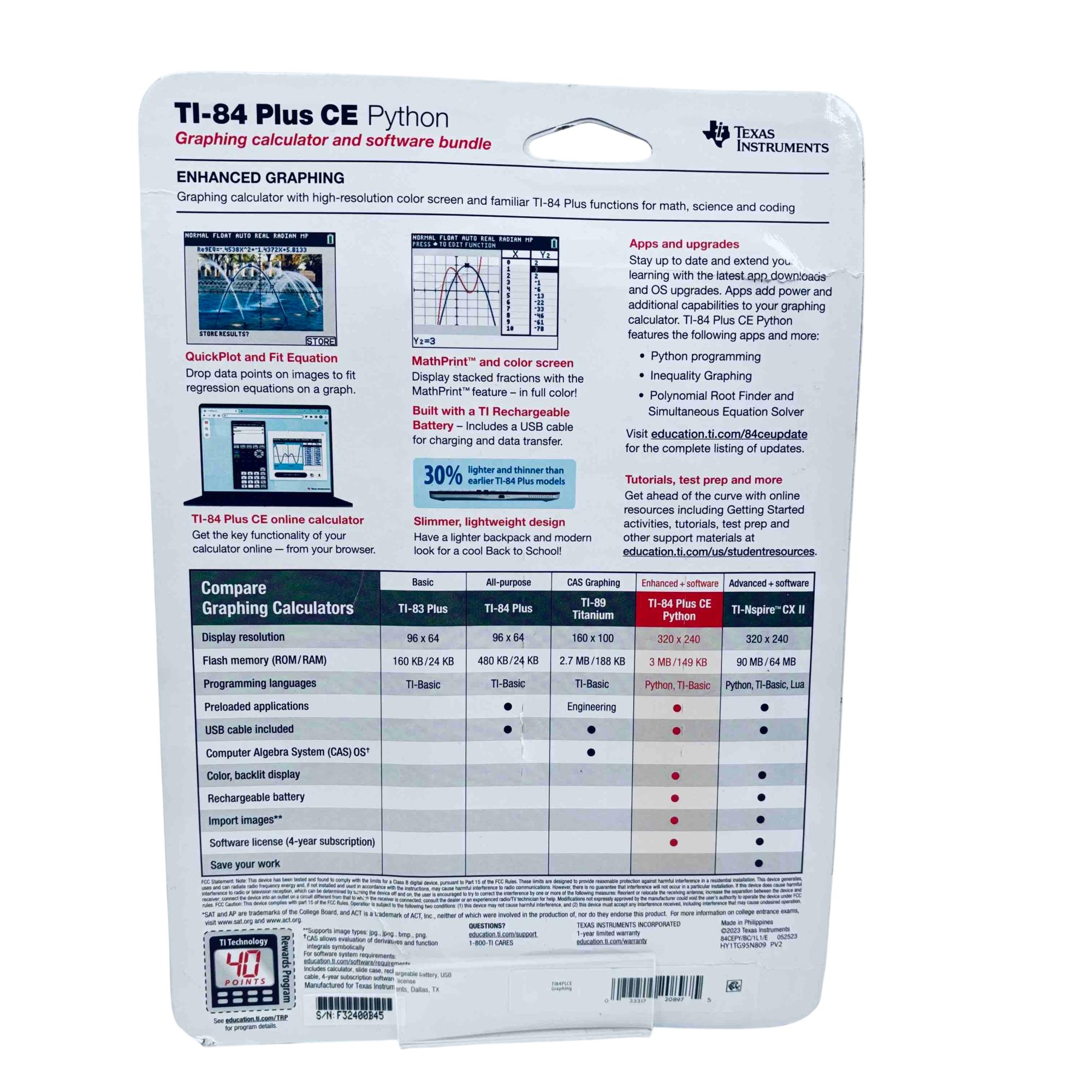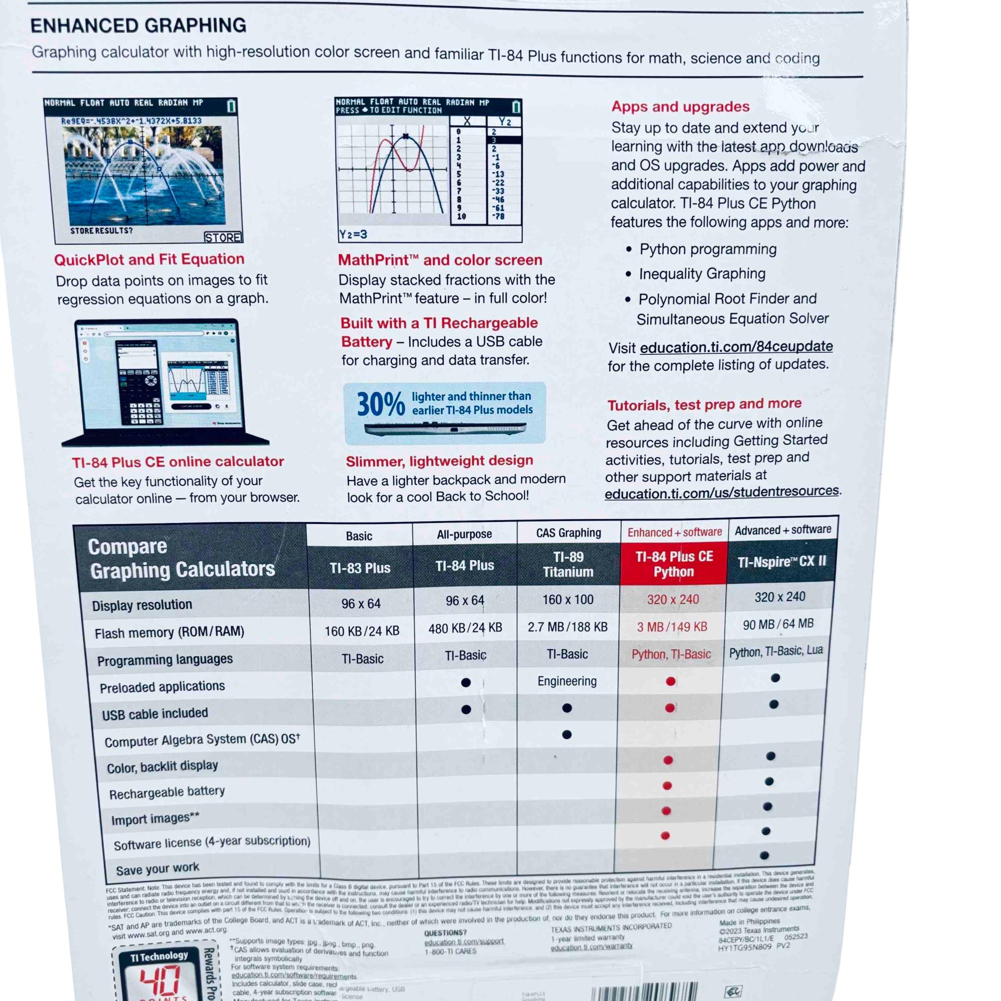 Unlock the potential of your mathematics and science education with the Texas Instruments TI-84 Plus CE Python Enhanced Graphing Calculator. Featuring a high-resolution color display and rechargeable battery, this calculator offers all the familiar functions of the TI-84 series with enhanced capabilities for coding in Python. It’s the perfect tool for students tackling algebra, calculus, and more, making learning math and science more engaging and efficient.