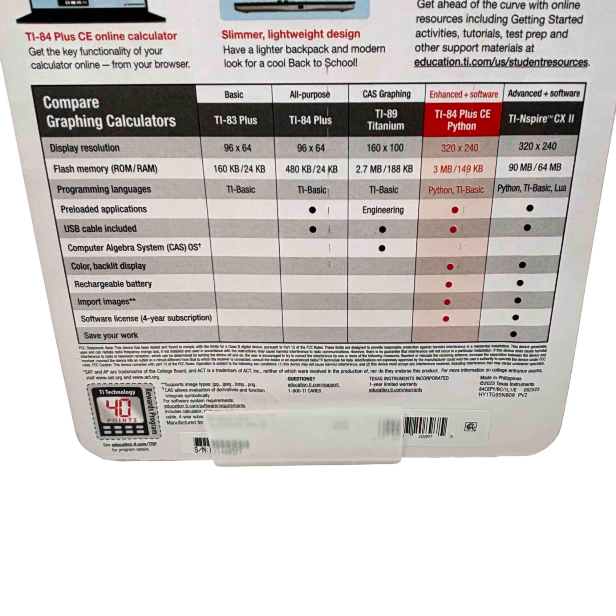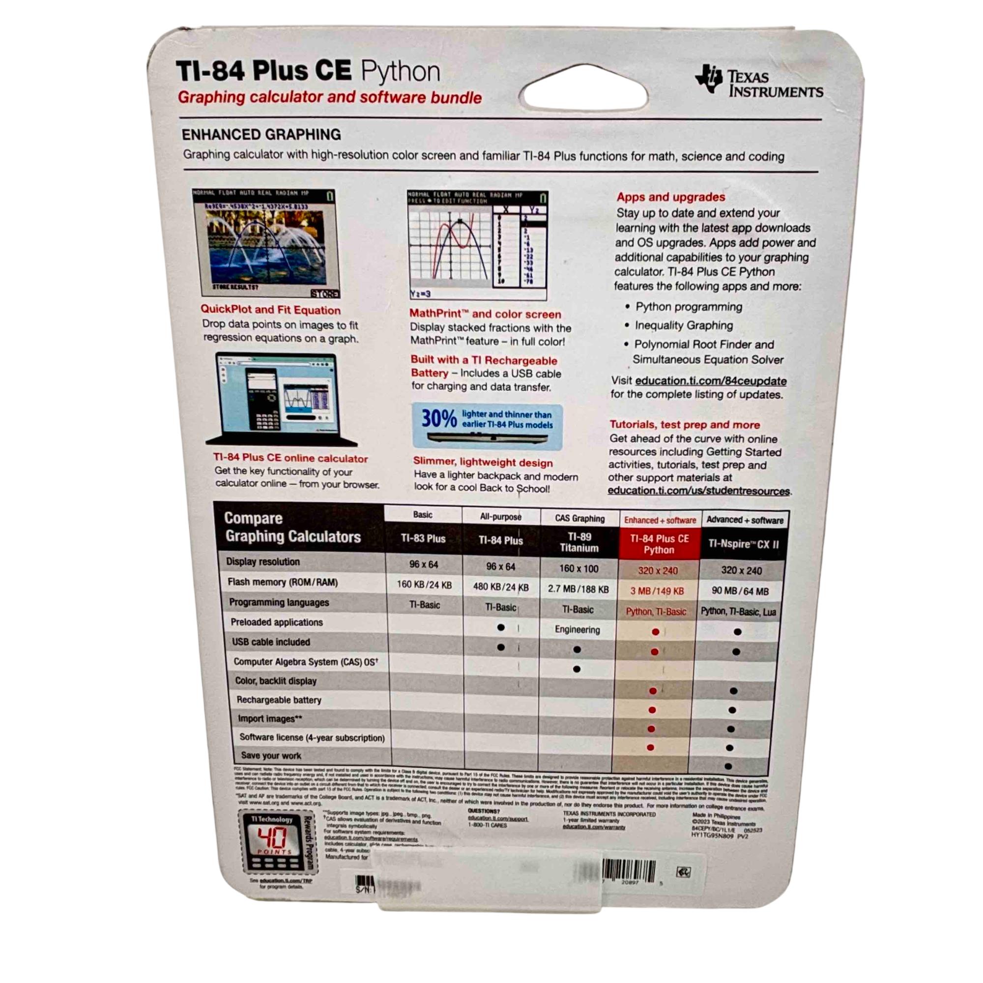 Unleash your mathematical potential with the Texas Instruments TI-84 Plus CE Python Enhanced Graphing Calculator. This cutting-edge device features a high-resolution color screen, preloaded apps, and a slim, lightweight design that makes it easy to carry. Whether tackling algebra, calculus, or programming, this versatile calculator is perfect for students and professionals looking to enhance their learning experience.