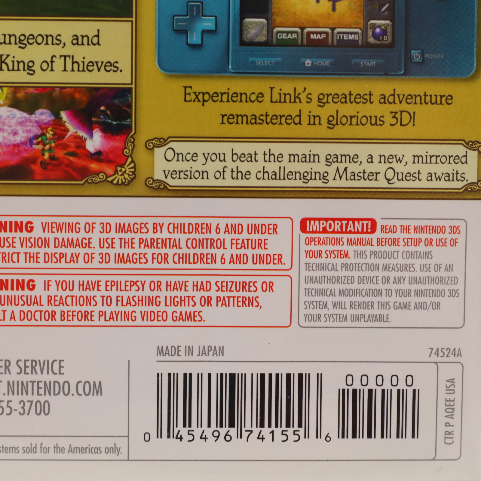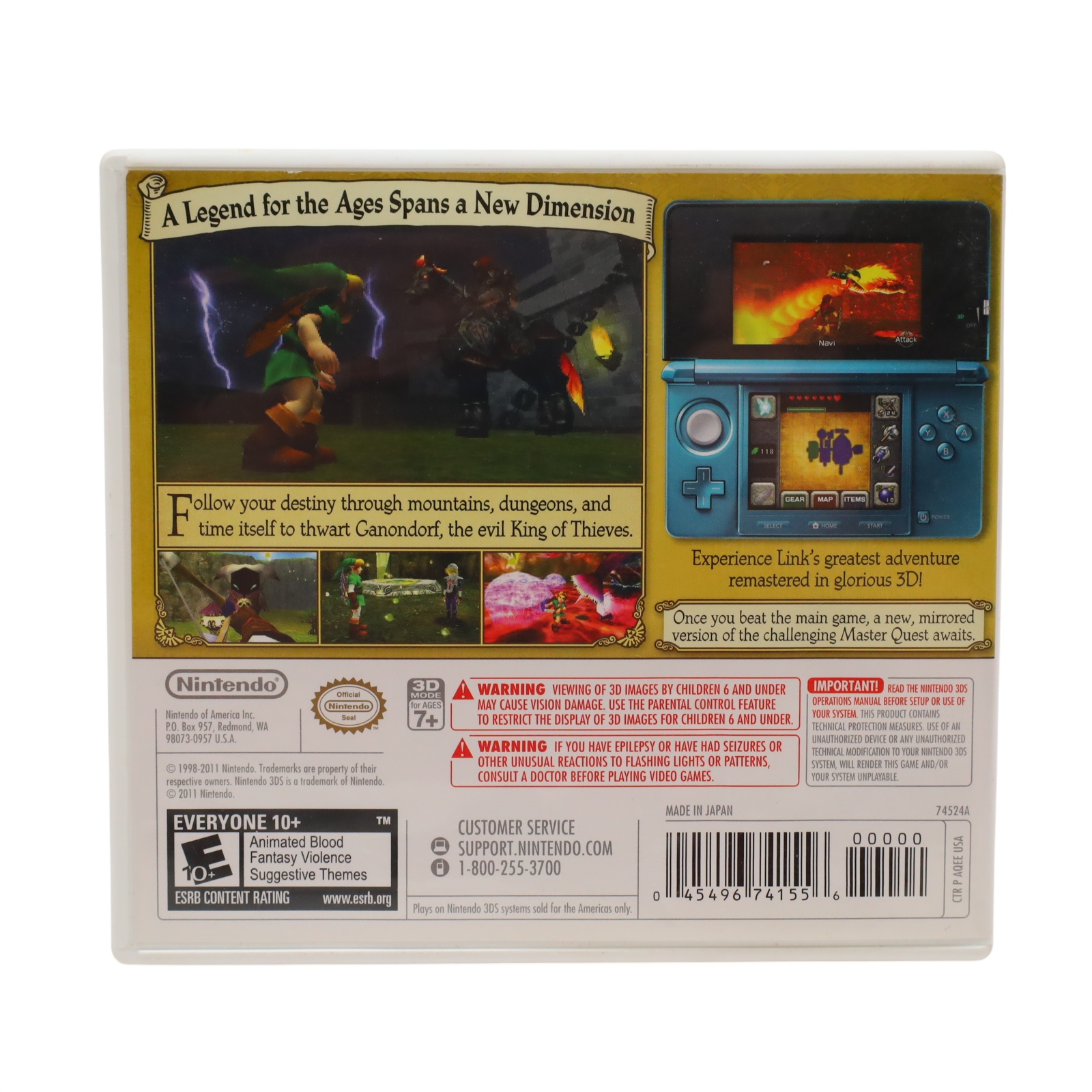A remake of the original adventure with specific modifications to gameplay mechanics. Players control Link within the land of Hyrule as they quest to prevent Ganondorf, King of the Gerudo tribe, from acquiring the Triforce, utilizing time travel and dungeon navigation to awaken sages. Musical progression is required to advance, involving learning and performing various songs on an ocarina. The system integrates gyroscopic technology for aiming specific items like the bow or slingshot in first-person mode, though alternative analog stick controls remain available. Inventory management and song performance can be executed via the touchscreen interface. Additional content includes the modified Master Quest dungeons, a mirrored overworld, and the original game campaign. A Boss Challenge mode allows combat against bosses individually or sequentially, with a distinct version available for Master Quest featuring mirrored arenas and increased enemy damage values.