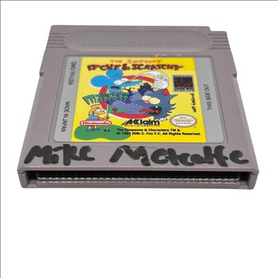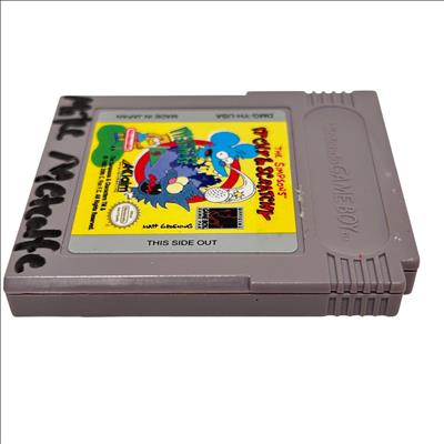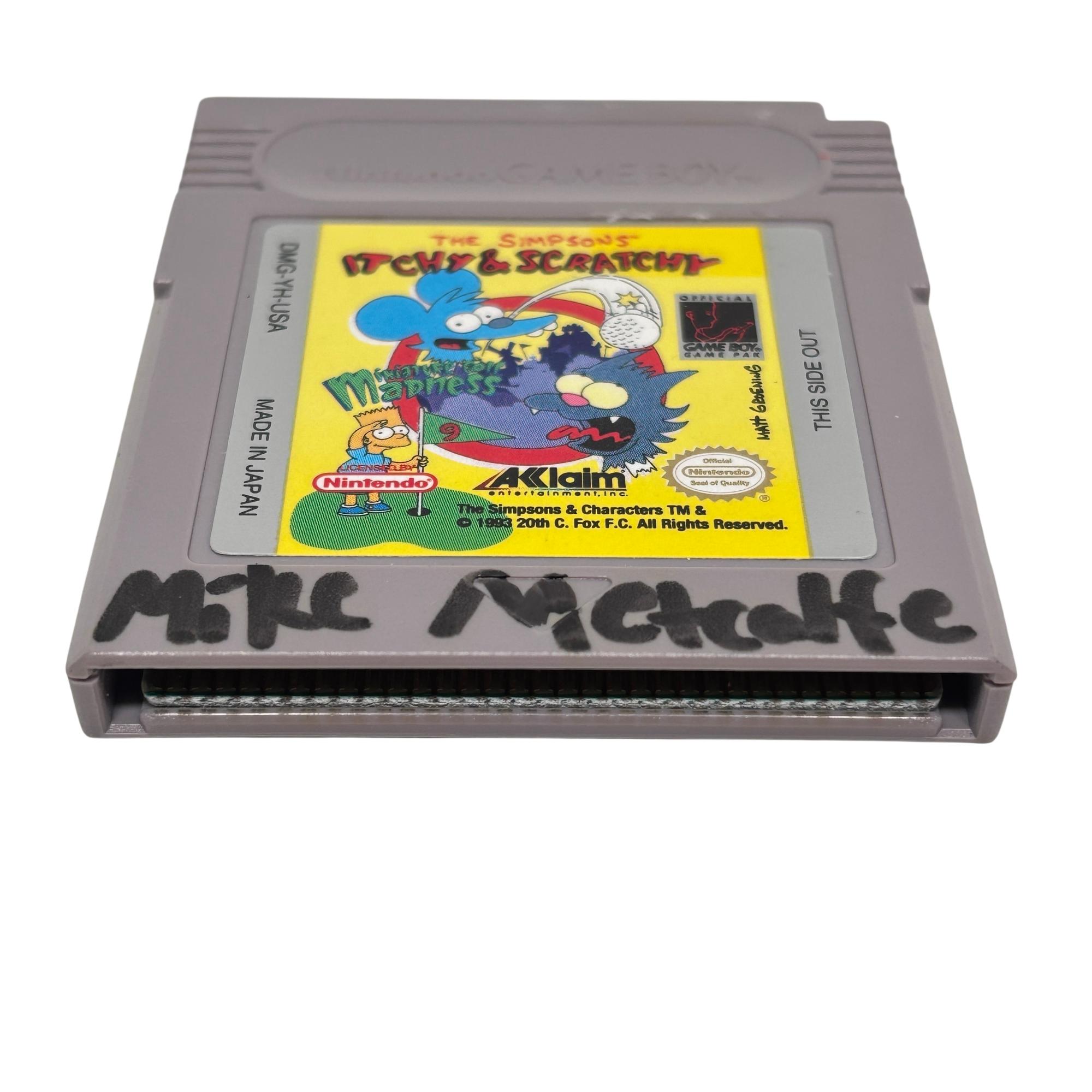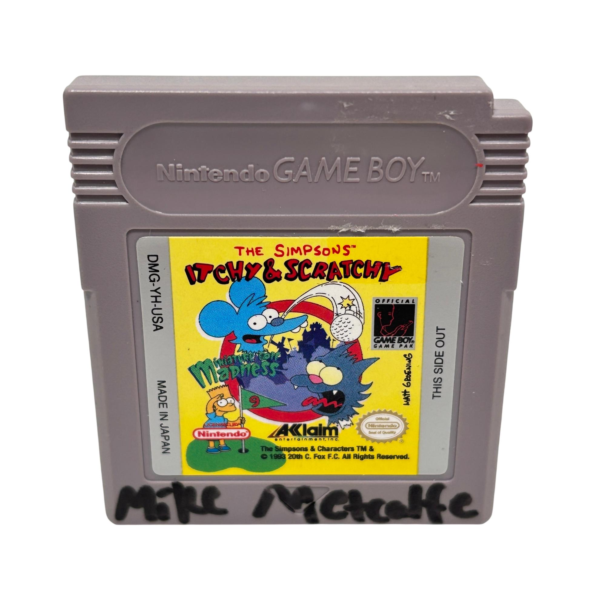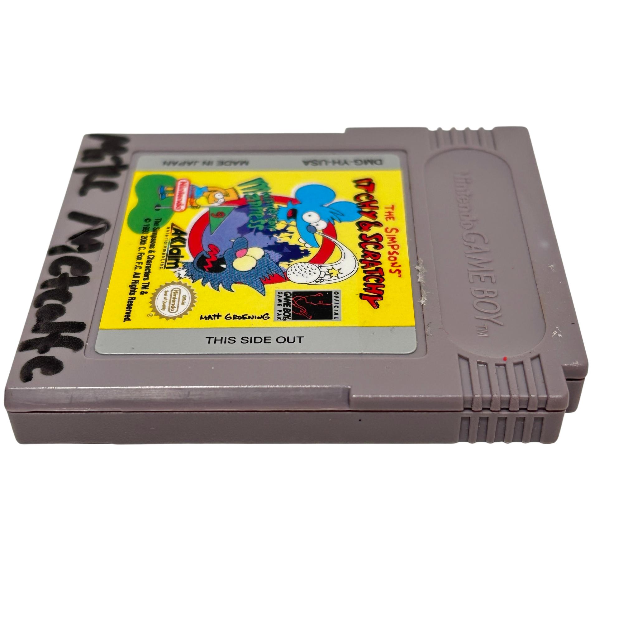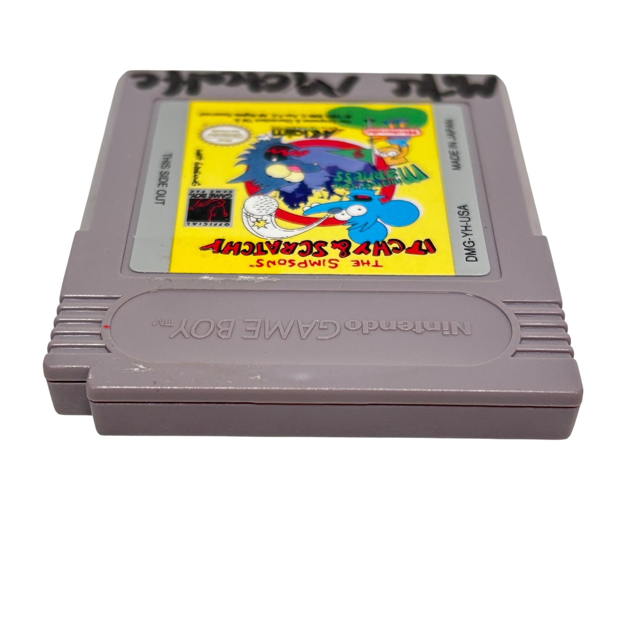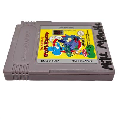 Nintendo Game Boy The Simpsons: Itchy & Scratchy (DMG-YH-USA) Cartridge by Acclaim features classic handheld gameplay with a distinctive yellow label showcasing characters from the Simpsons franchise. This authentic grey game cartridge, made in Japan, delivers nostalgic 8-bit action based on the popular Itchy and Scratchy show segment. Designed for the original Nintendo Game Boy system, it offers engaging platform-style challenges with vibrant cartoon visuals.