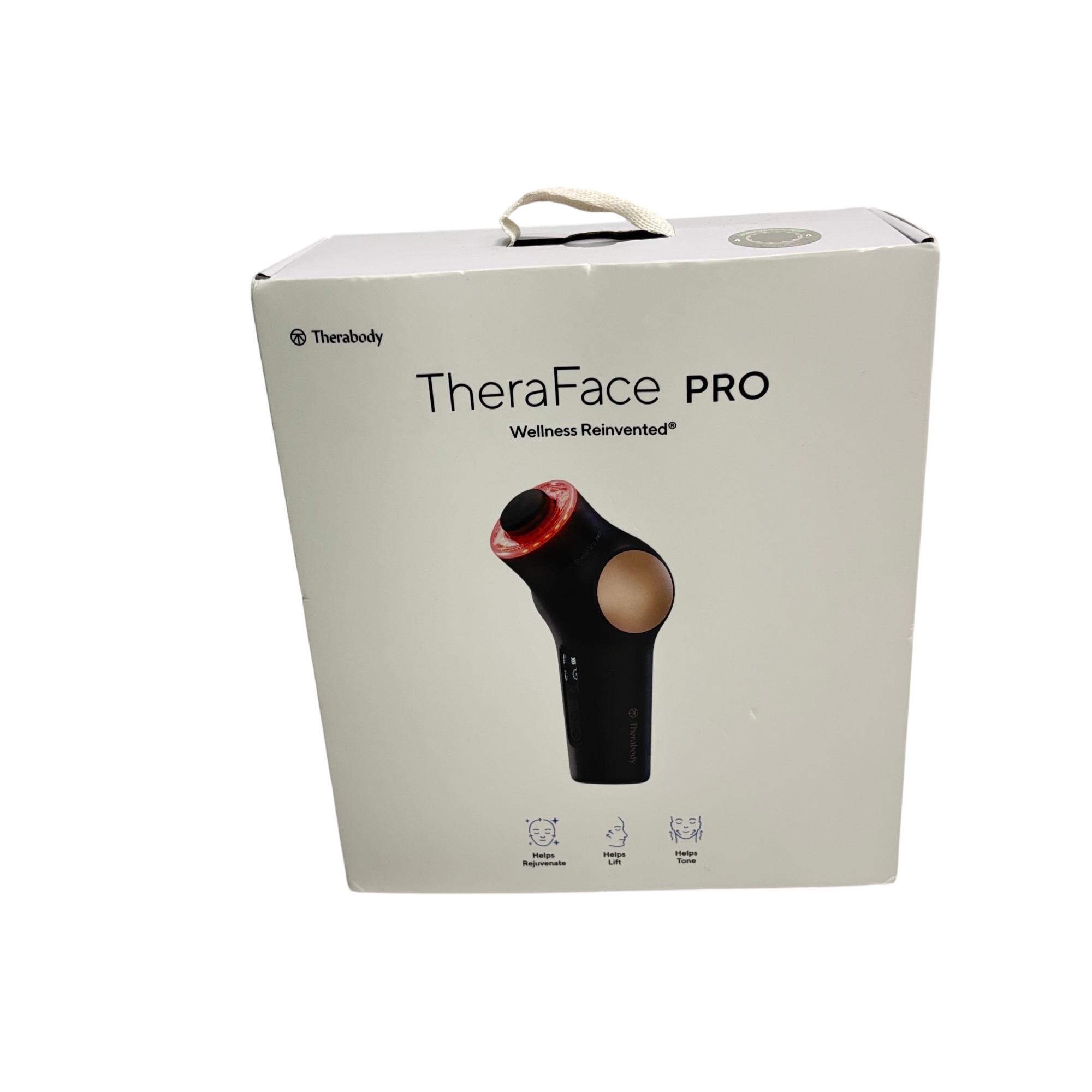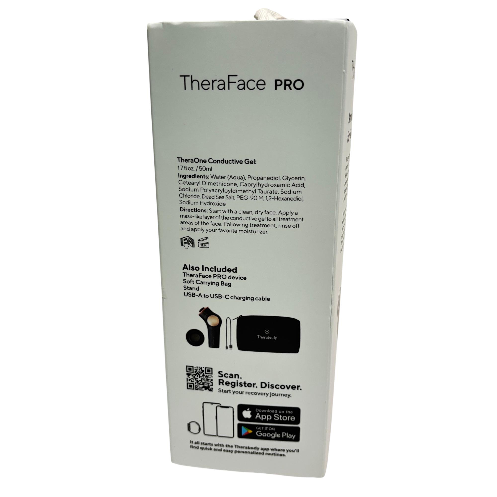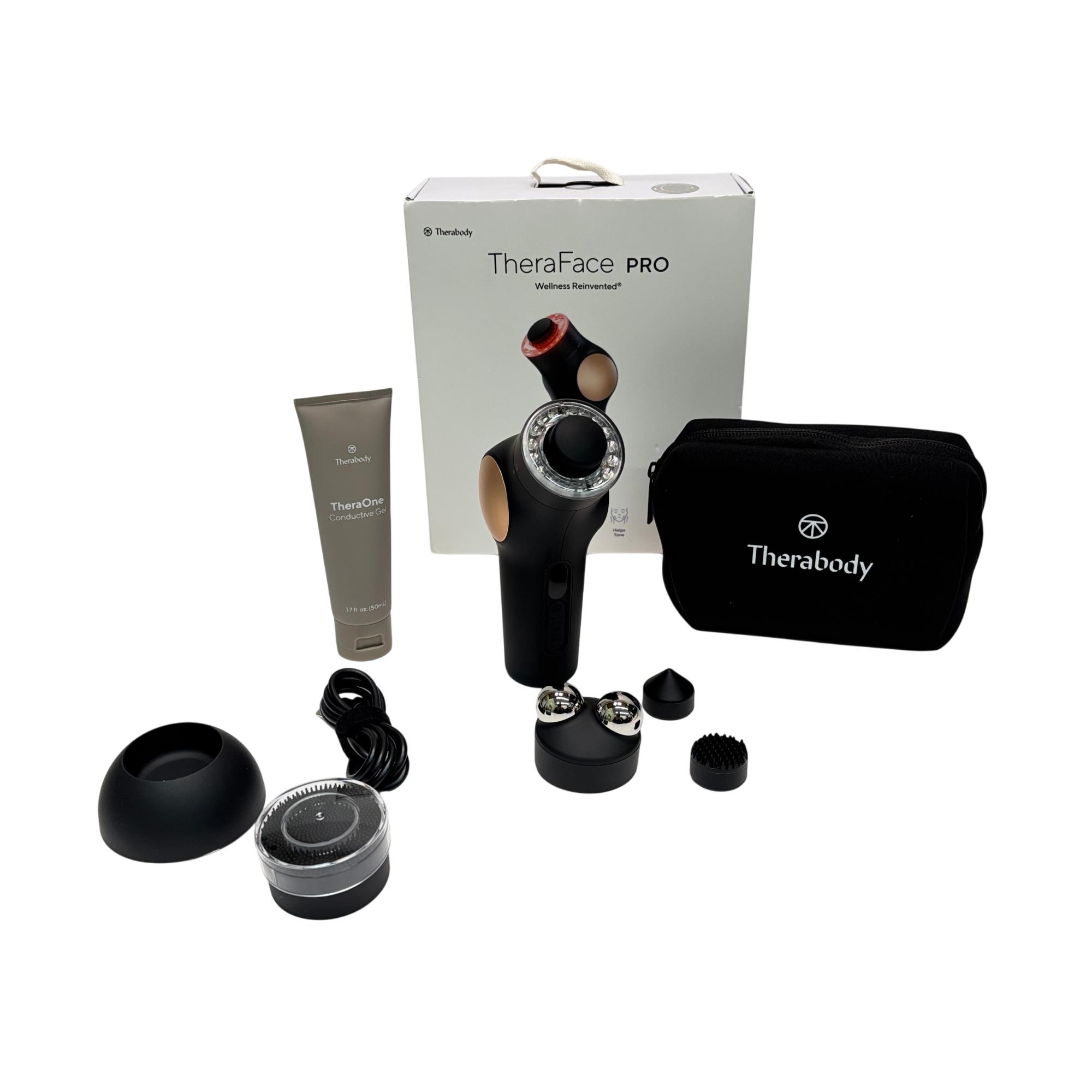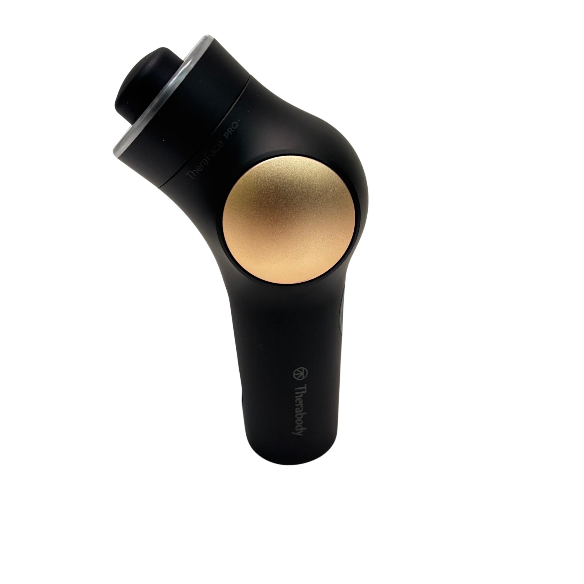 Therabody TheraFace PRO Facial Health Device Kit features an advanced black and gold design that targets facial muscle recovery and skin health using microcurrent technology. This innovative device stimulates blood flow and enhances skin tone through customized routines guided by an intuitive app. Its ergonomic shape and conductive gel optimize facial treatments for a professional-level skincare experience.