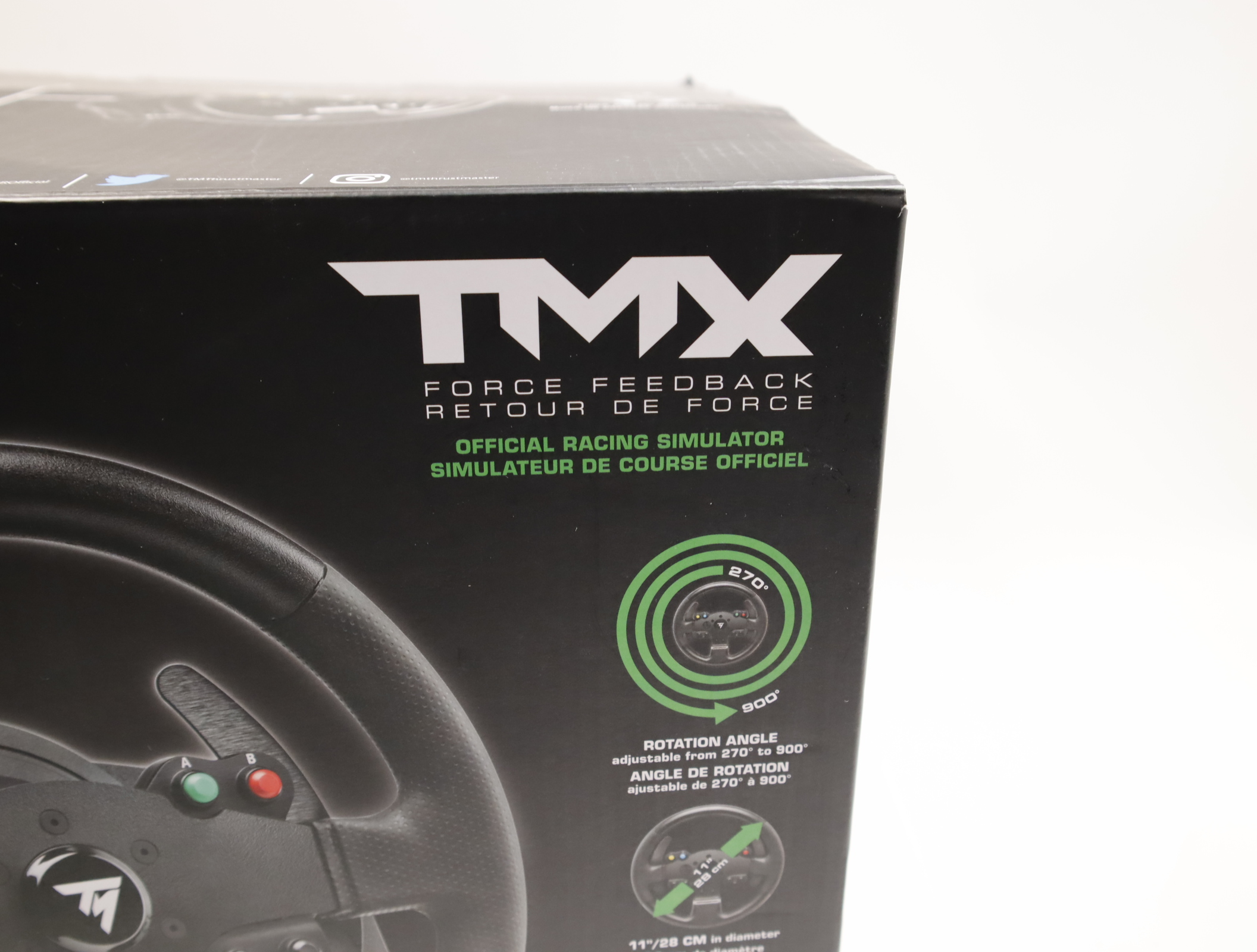 Realistic “competition” wheel design: 11”/28 cm in diameter, with an ergonomic design perfectly adapted for all racing games