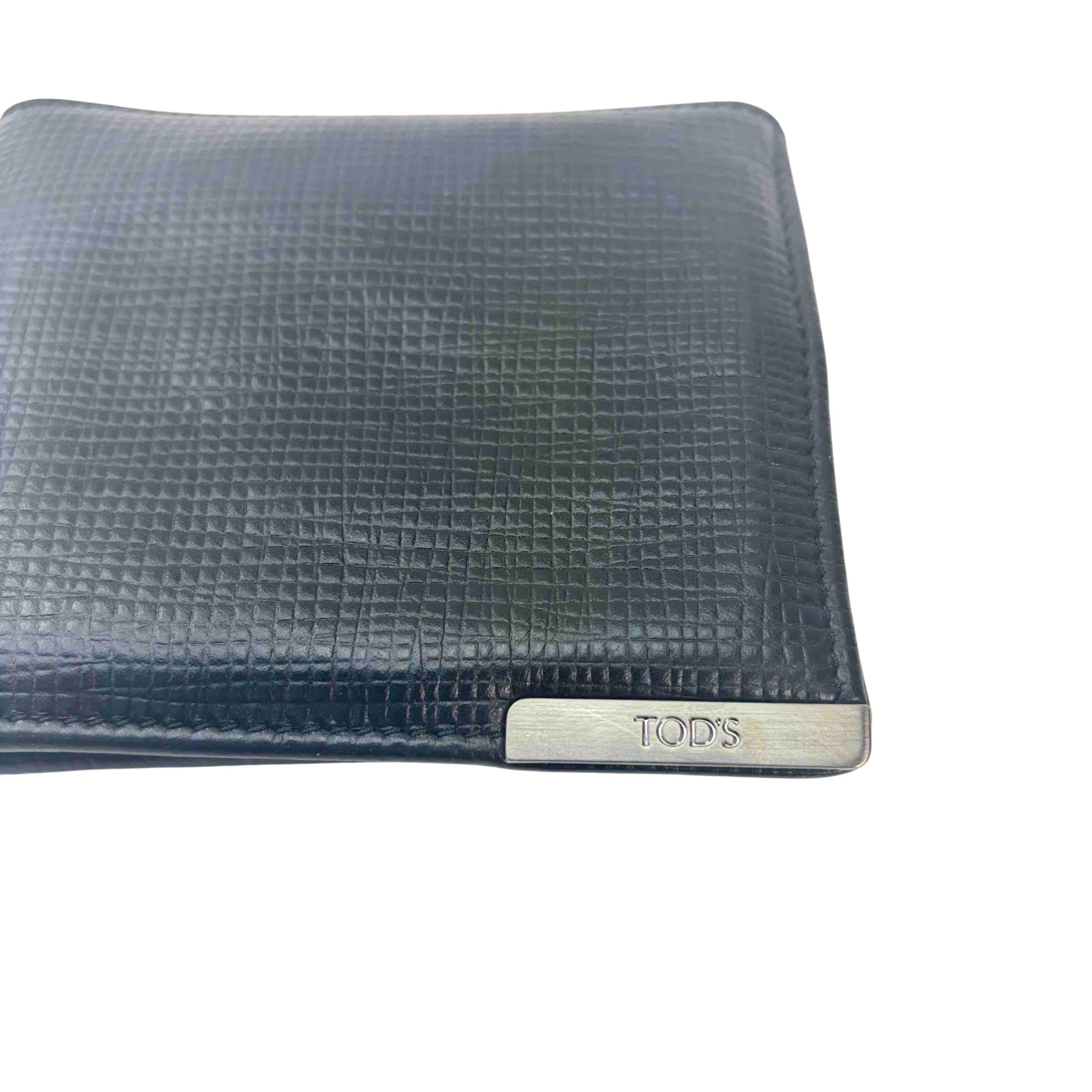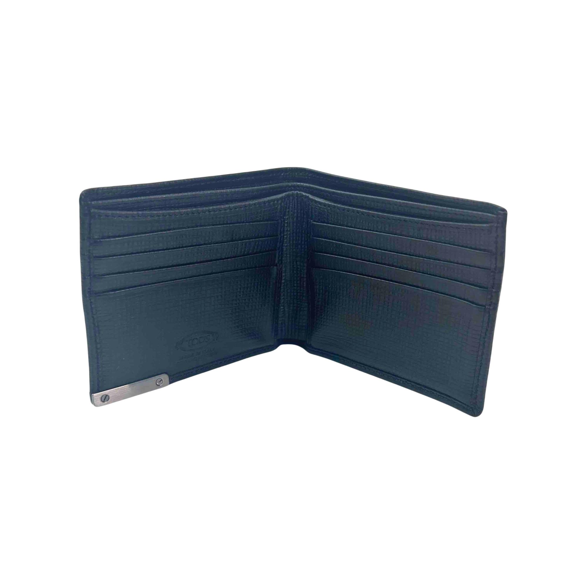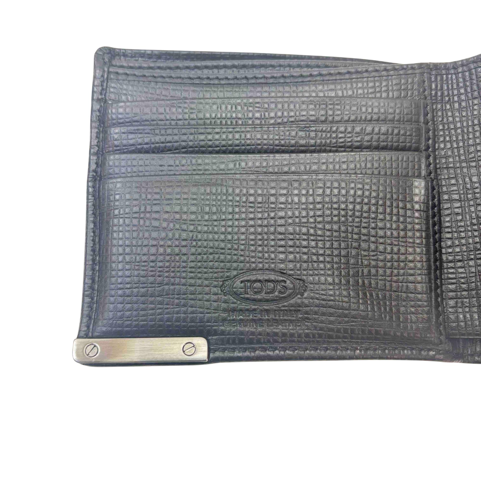 Elevate your style with this Tods Black Textured Leather Wallet, featuring a sleek silver metal logo plate. Crafted from premium leather, this wallet combines durable sophistication with timeless elegance, making it a must-have accessory for the modern individual.