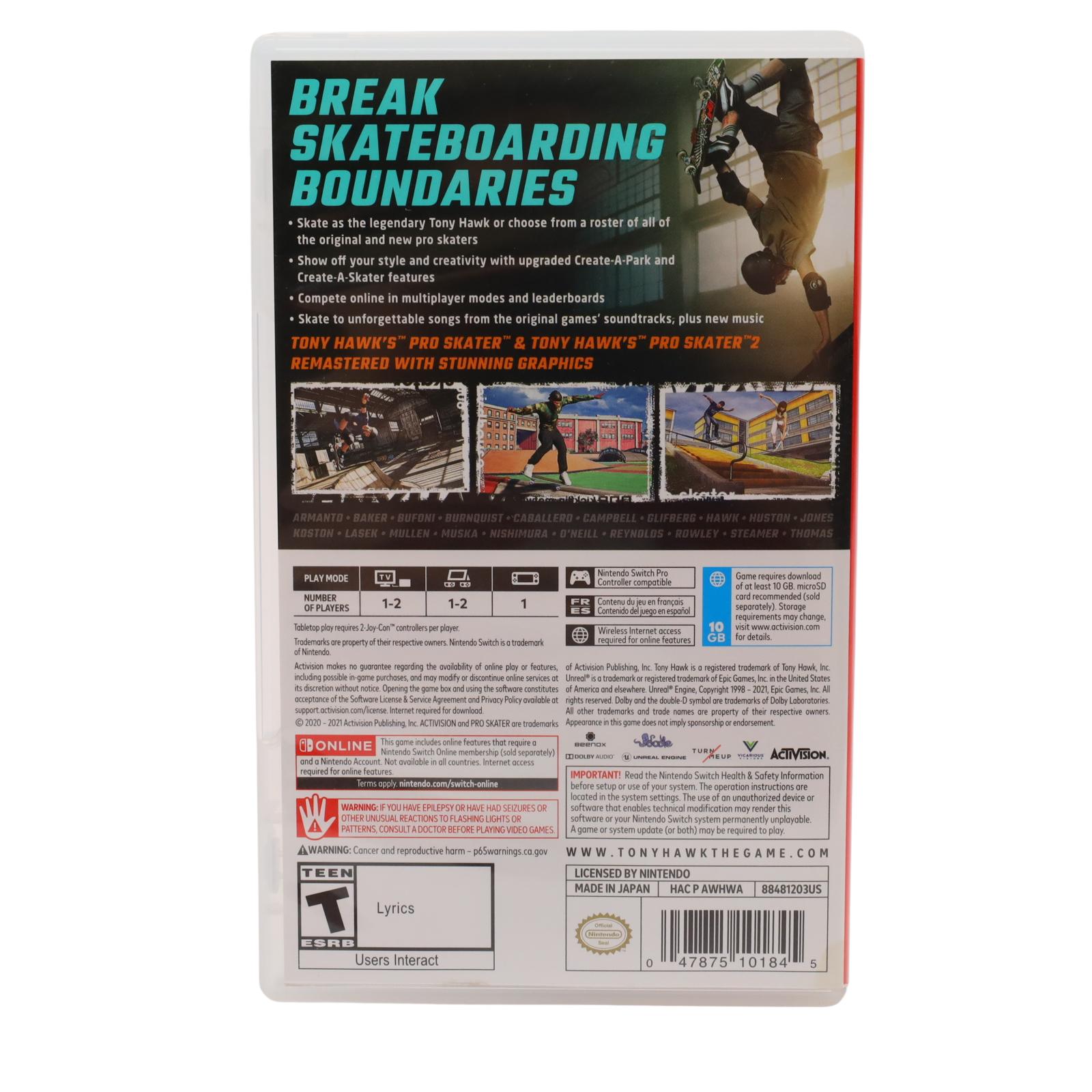 This collection features the rebuilt Tony Hawk’s Pro Skater and Tony Hawk’s Pro Skater 2 in high definition for the Nintendo Switch. Players can experience the original pro roster alongside new skaters, performing iconic tricks and combos across remastered levels. The game includes original game modes and local two-player functionality, as well as online multiplayer options with leaderboards. Enhanced Create-A-Park and Create-A-Skater features allow for customization and creative expression, all set to a soundtrack featuring both classic and new music.