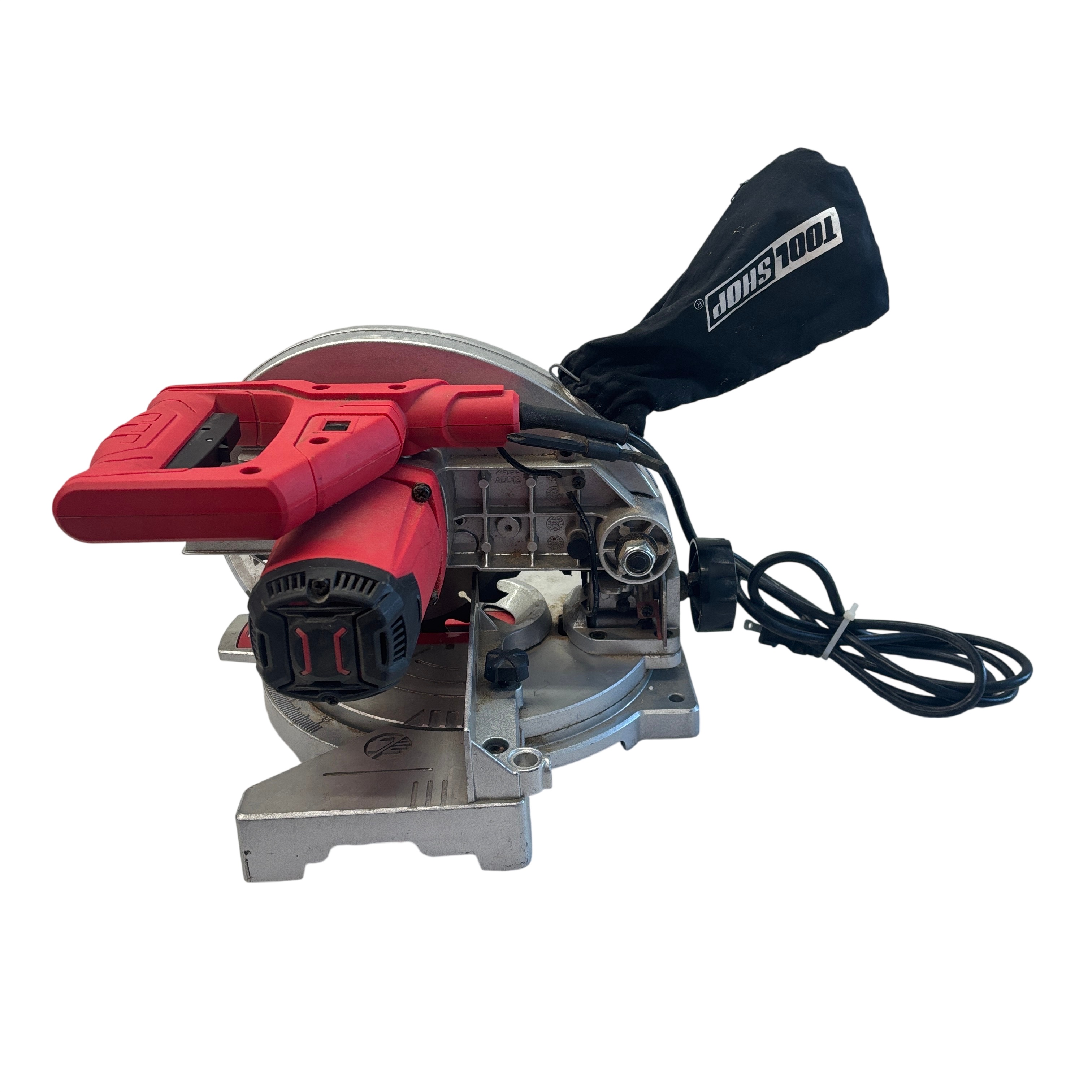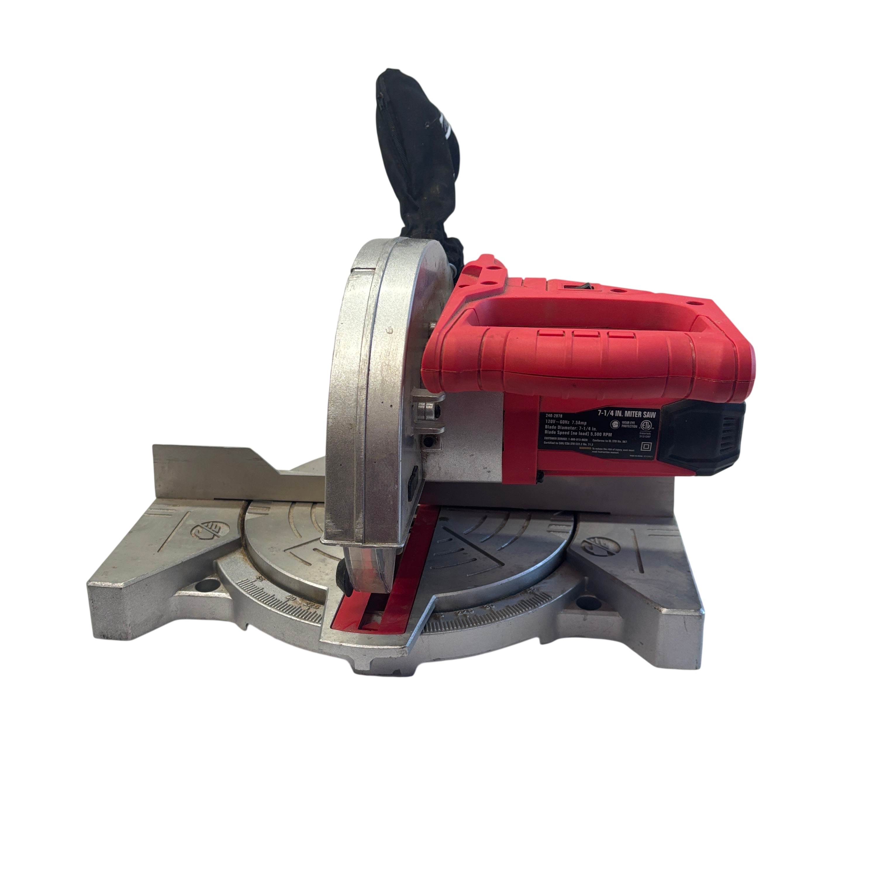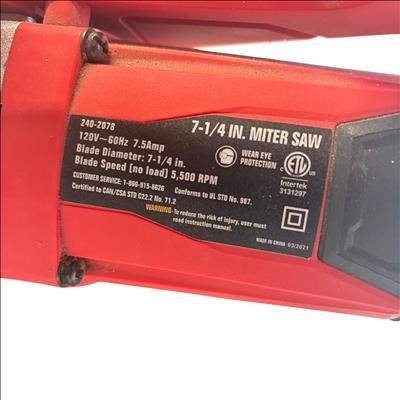 The ToolShop 7-1/4 Inch Miter Saw (Model 240-2078) is a powerful corded electric saw designed for precision cutting with a 7.5 Amp motor and a blade speed of 5,500 RPM. Featuring a 7-1/4 inch carbide tipped blade, this miter saw is ideal for woodworking and general purpose cutting tasks. It includes an adjustable miter base for angled cuts and a dust collection bag to help keep your workspace clean. Compact and durable, this saw is perfect for both DIY enthusiasts and professional users seeking reliable performance.