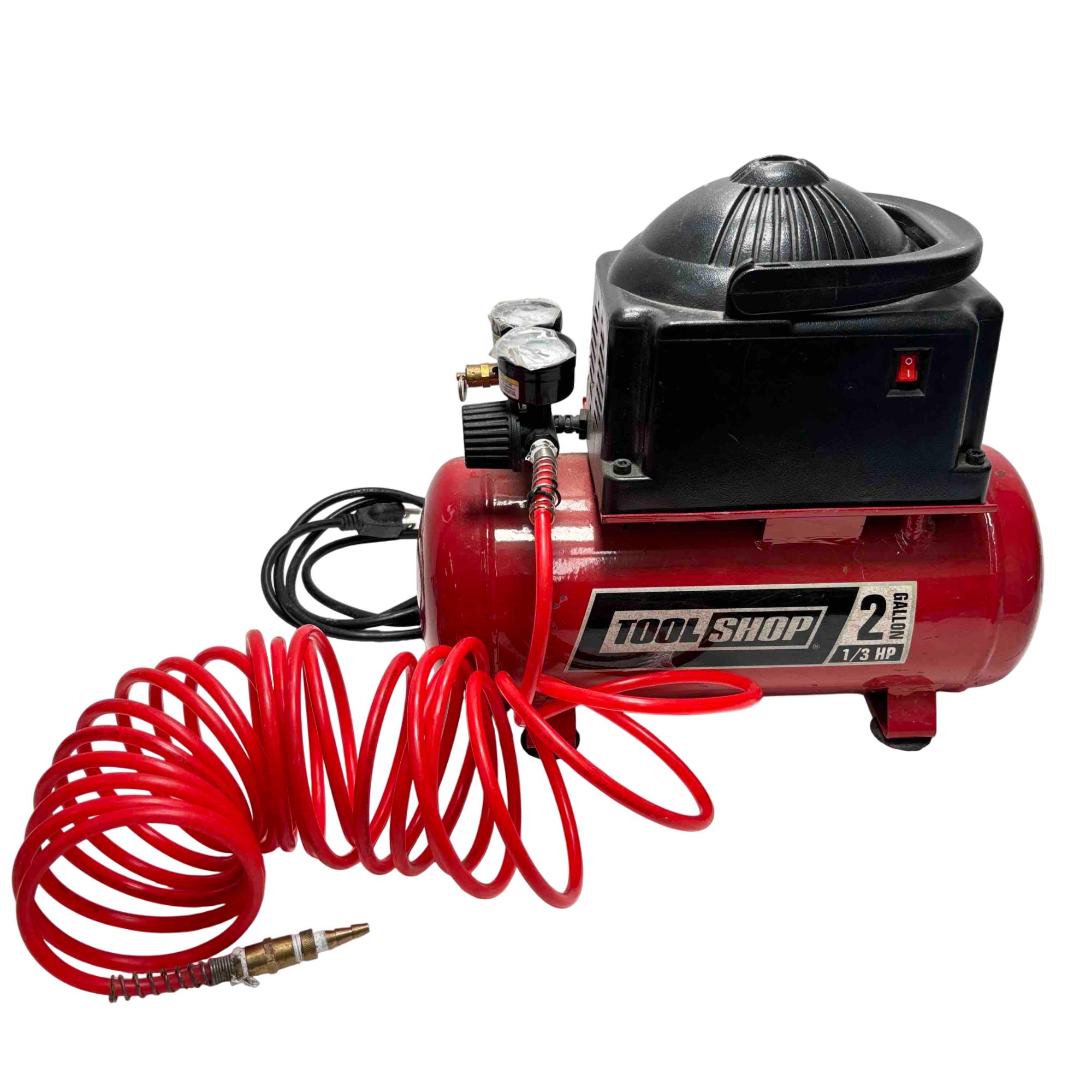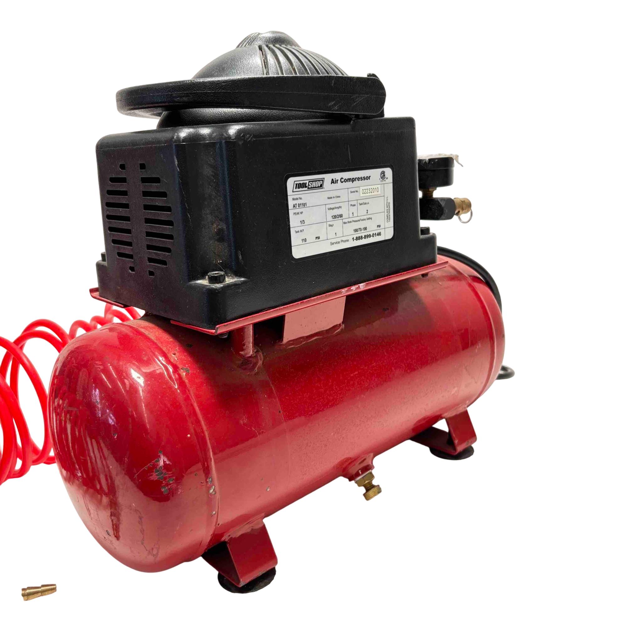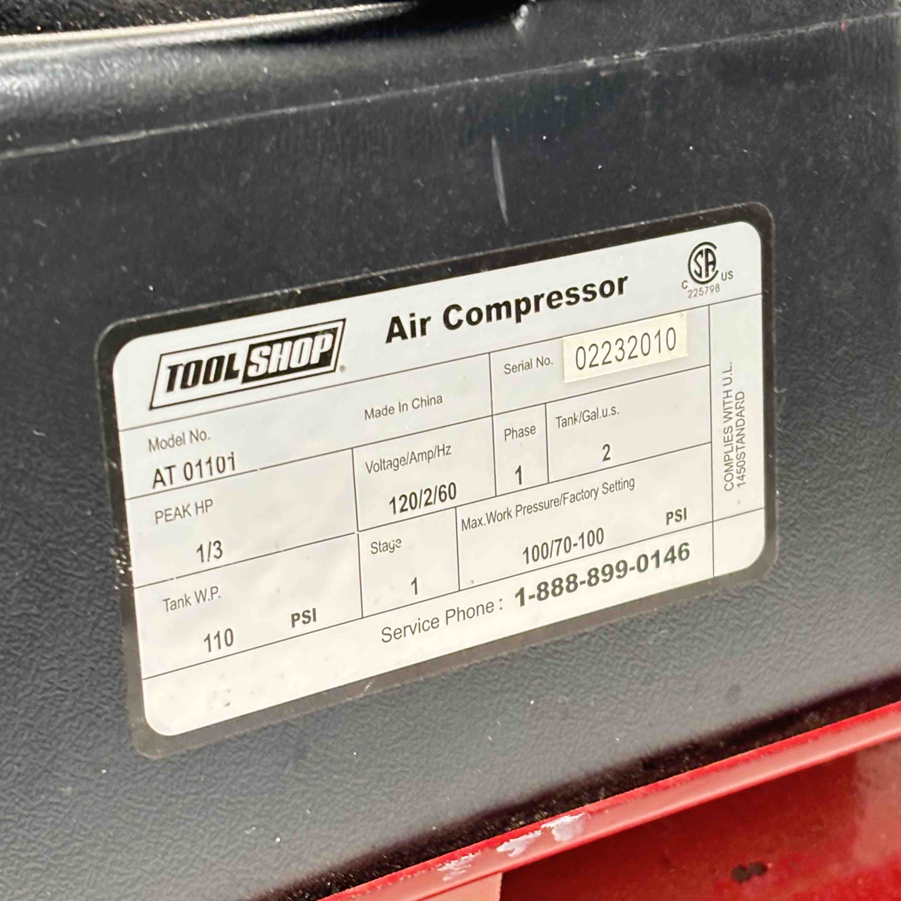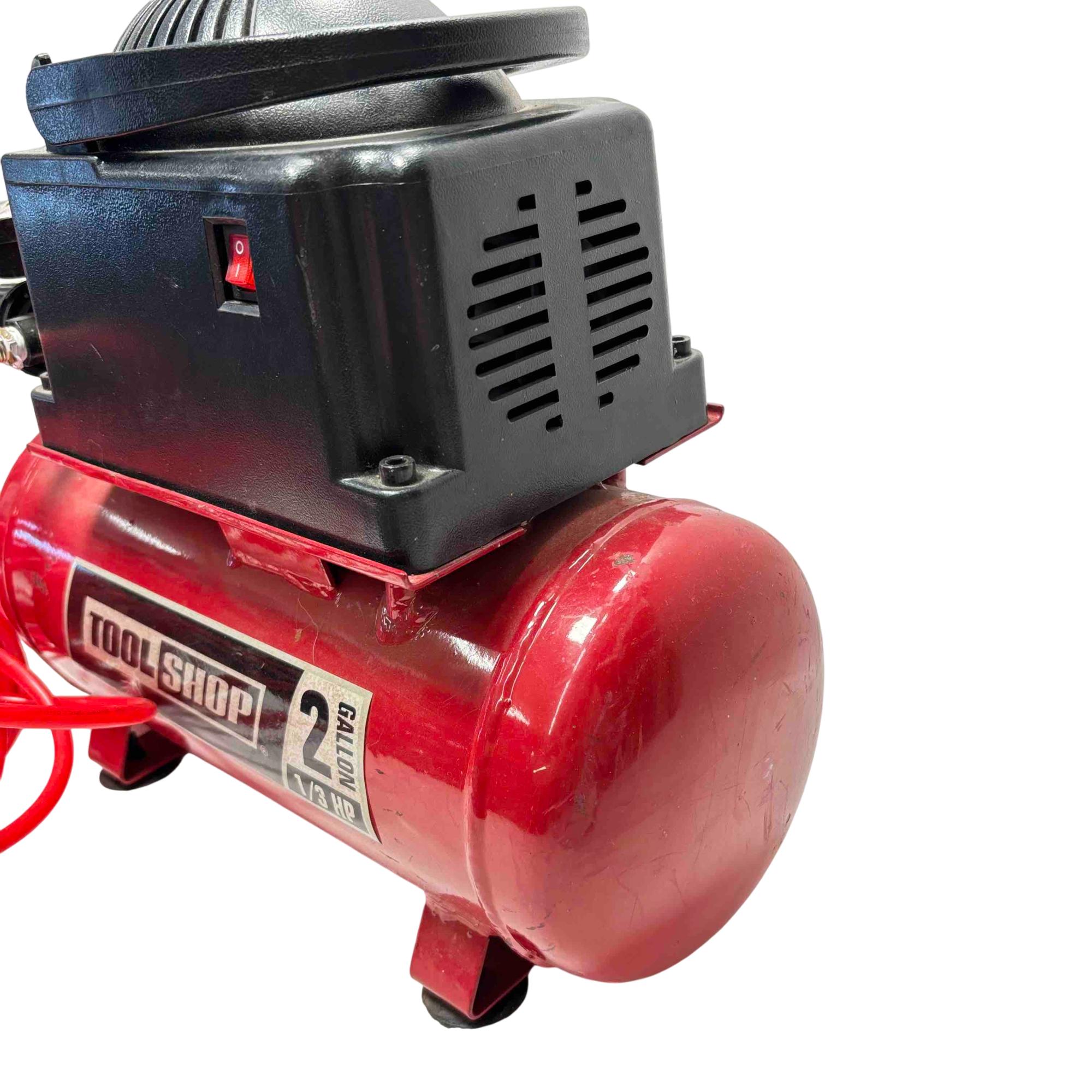 Introducing the Tool Shop AT01101, a powerful and compact 2-gallon air compressor perfect for home and professional use. With a robust 1/3 HP motor, this red and black machine efficiently handles small to medium air compressor tasks, making it an essential addition to your tool collection. Whether youre inflating tires or powering pneumatic tools, rely on this air compressor for smooth and reliable performance.