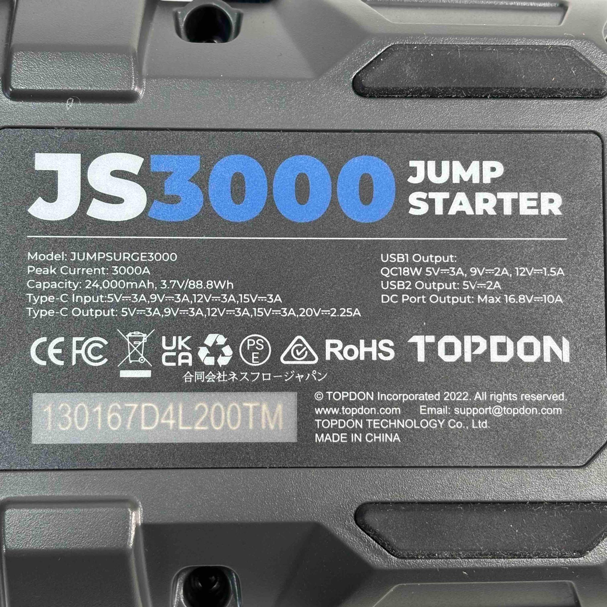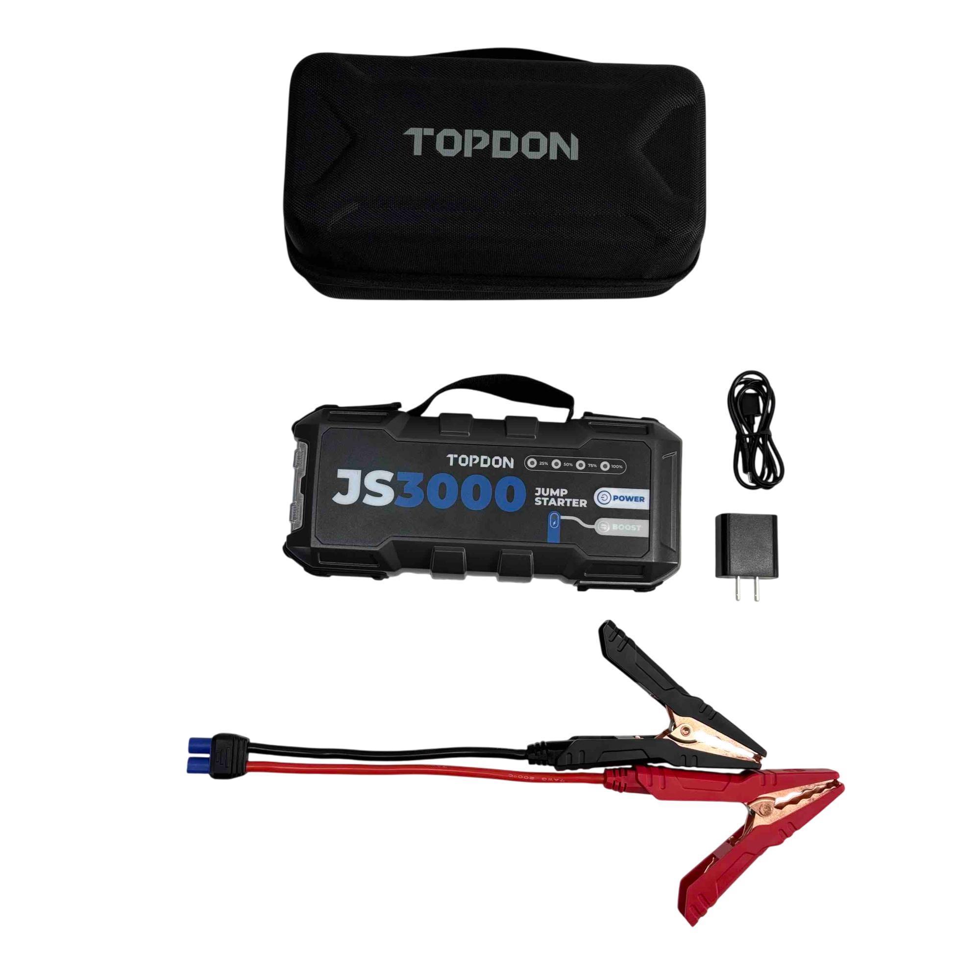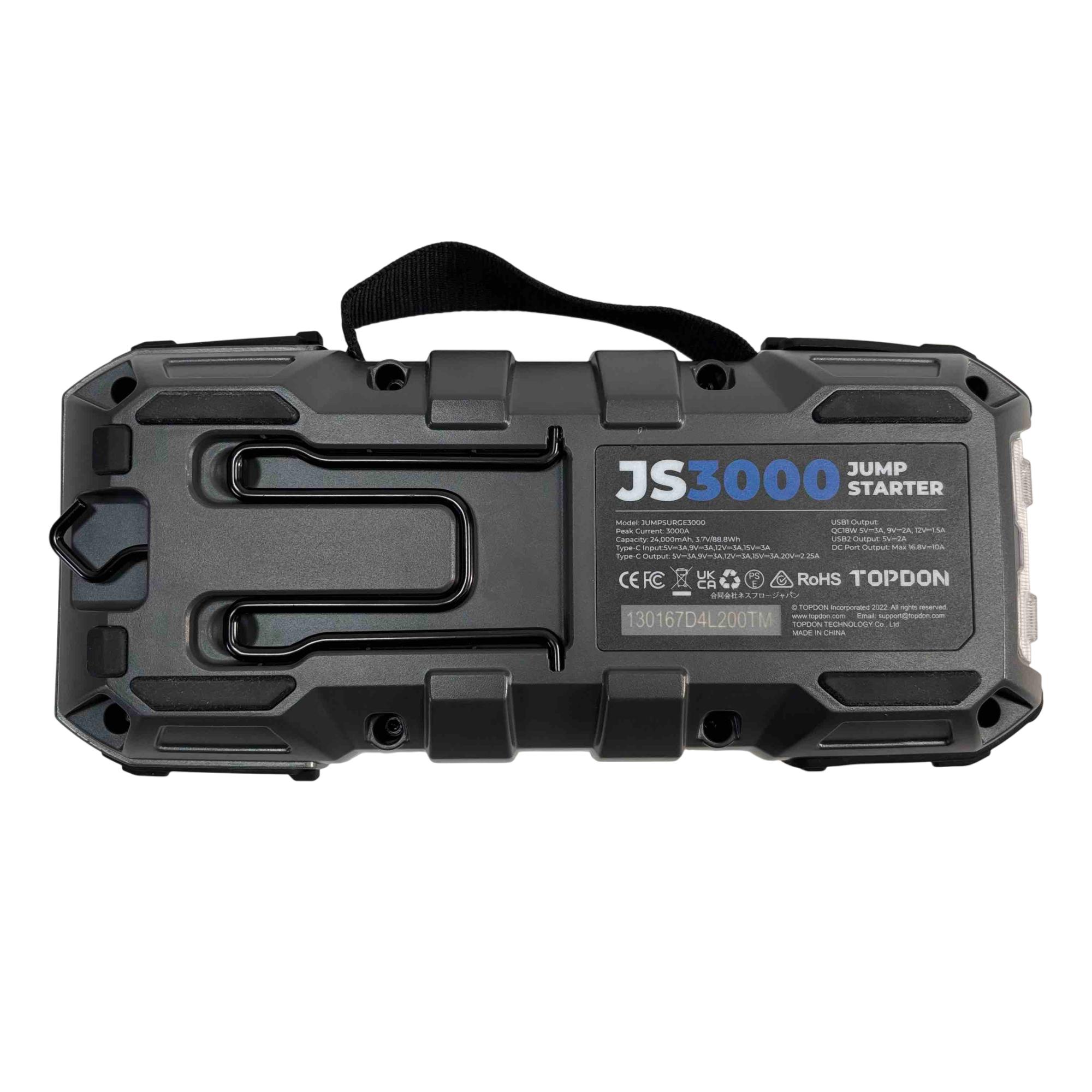 Introducing the TOPDON Jumpsurge3000, a powerful jump starter that can revive your vehicle with ease. Boasting an impressive 3000A peak current and a 24000mAh capacity, this compact and portable device ensures youre never stranded with a dead battery again. Whether youre taking a long road trip or just need a reliable backup, the Jumpsurge3000 is your ultimate power solution.