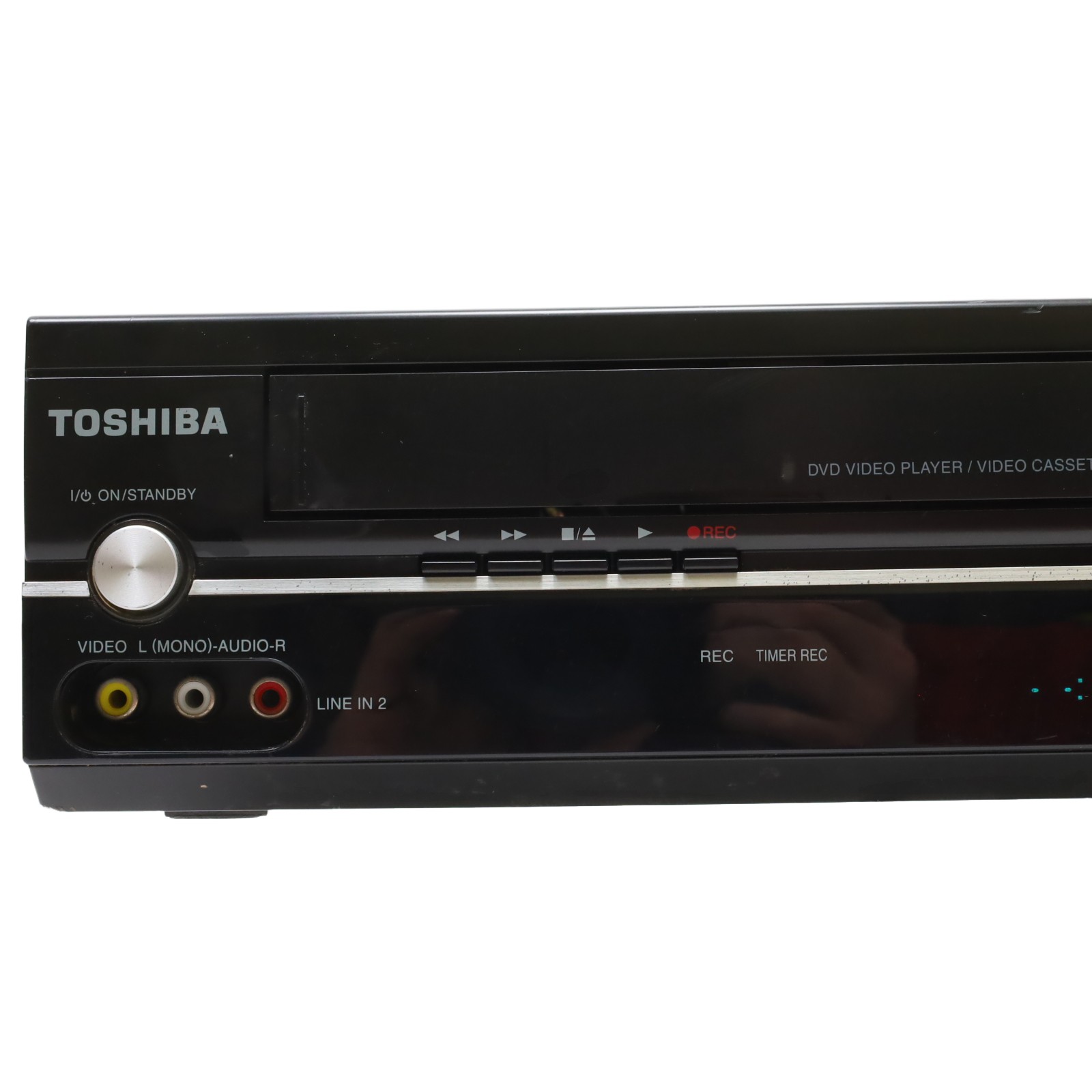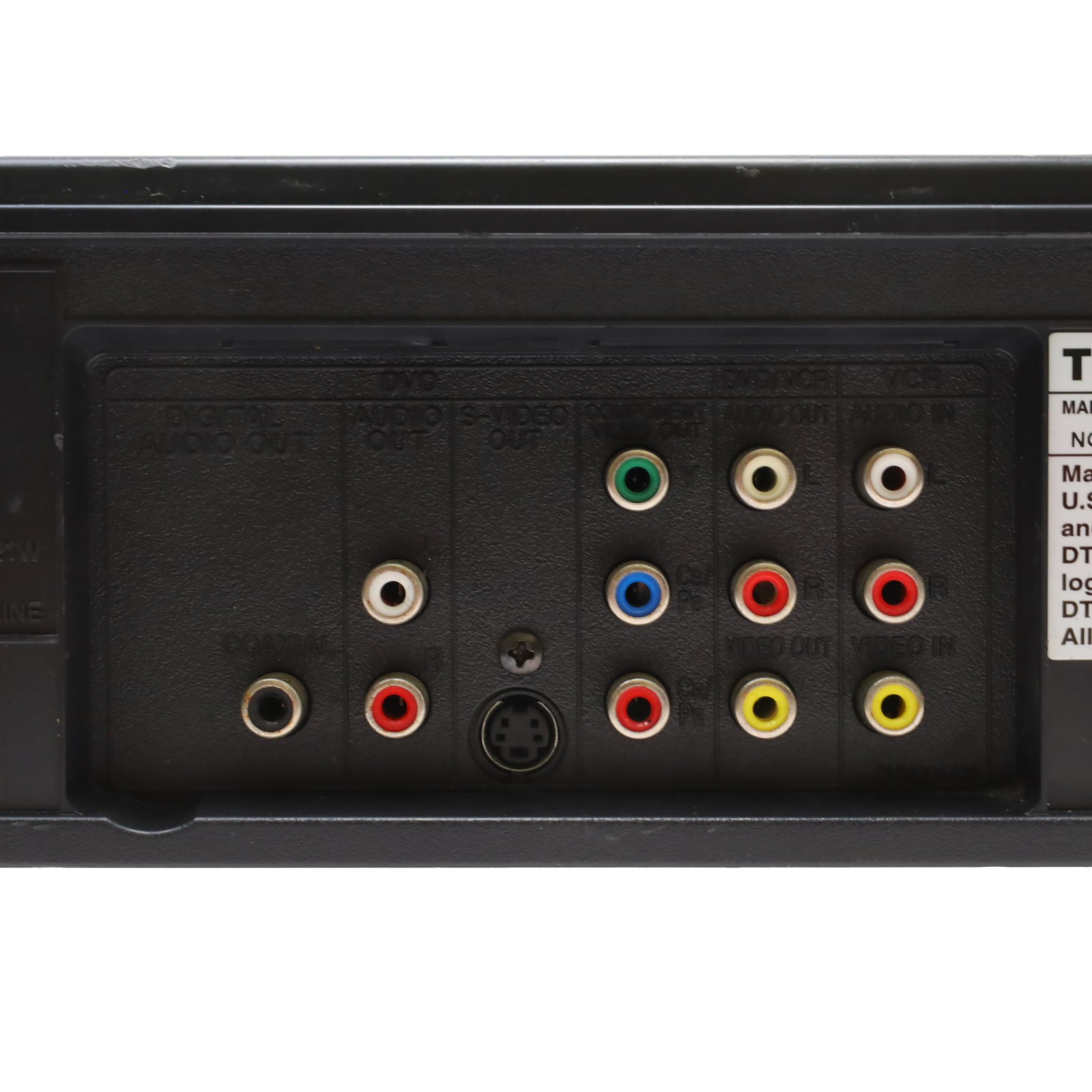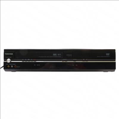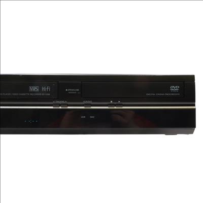 A DVD and VCR combination unit that supports multiple disc formats, including DVD-Video, DVD-R, DVD RW, CD, CD-R, CD-RW, and VCD. It features a 108MHz/14-bit video digital-to-analog converter and outputs component video through ColorStream Pro. For audio, it includes a 192kHz/24-bit digital-to-analog converter and supports Dolby Digital and DTS formats with 3D surround sound capability. On-screen display languages include English, French, and Spanish.