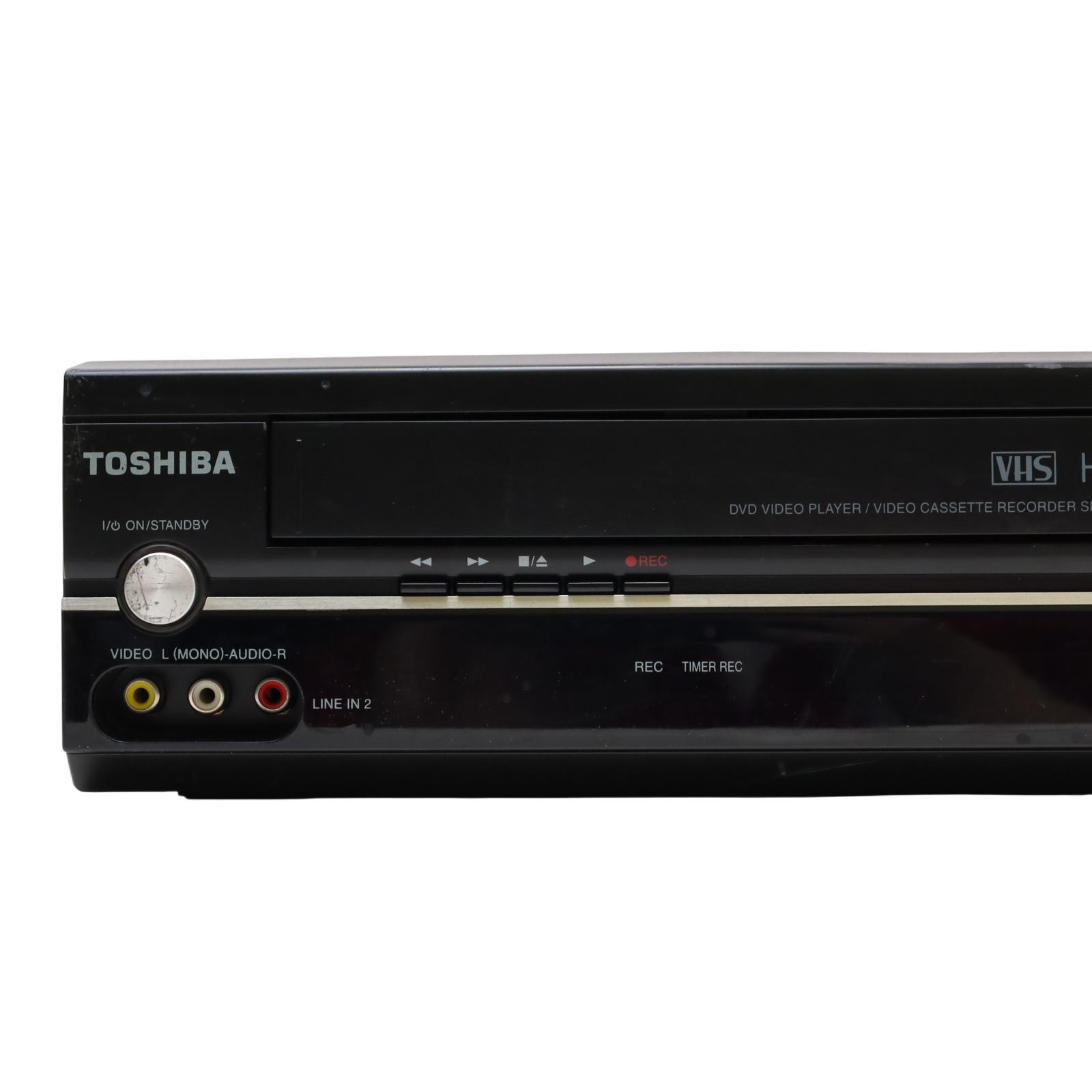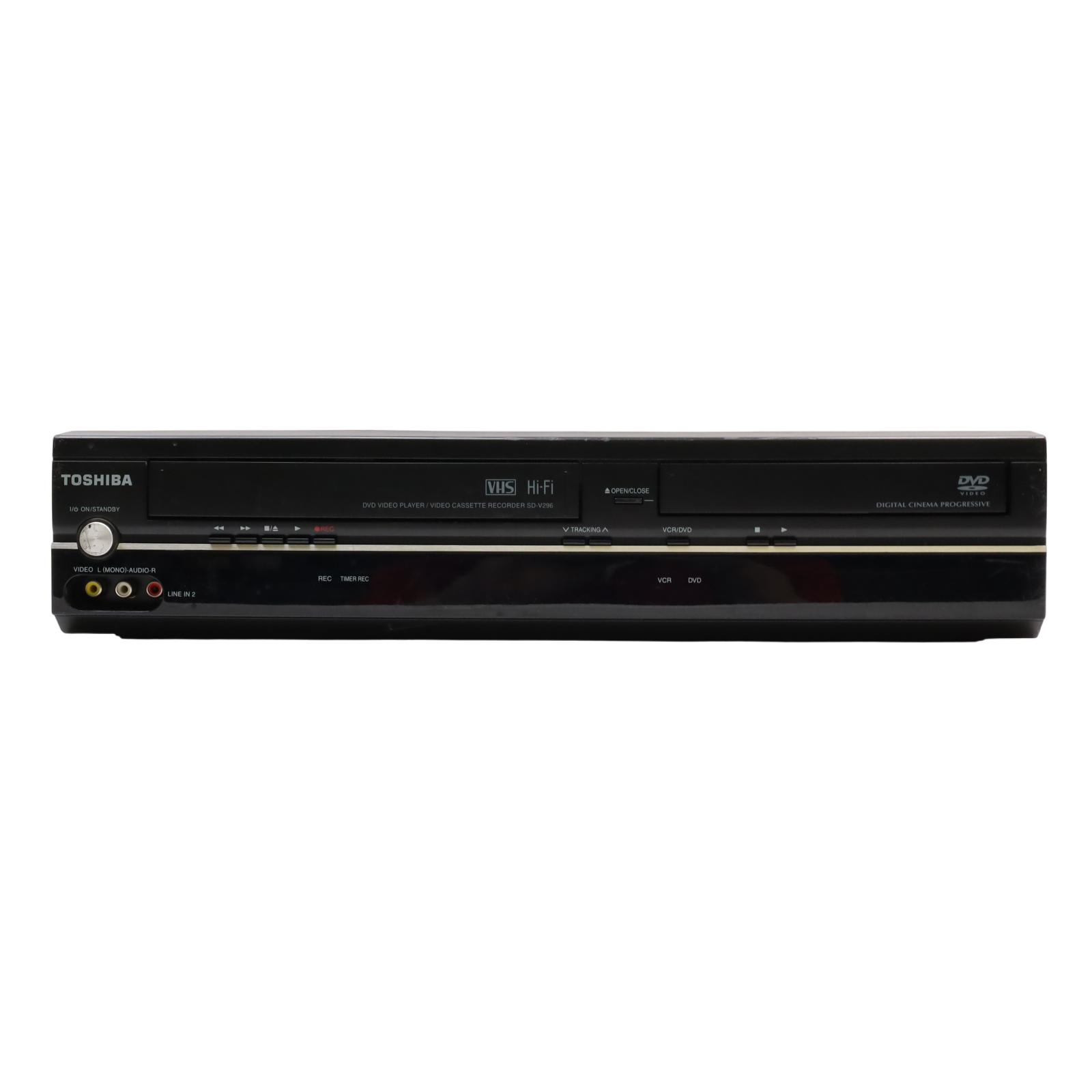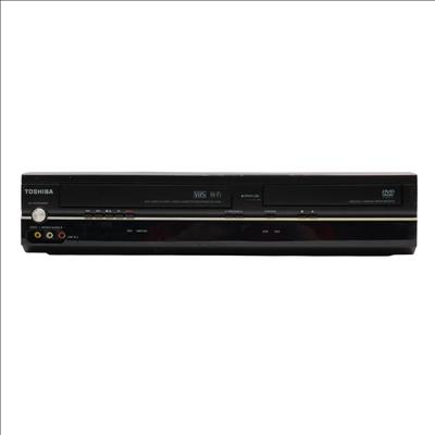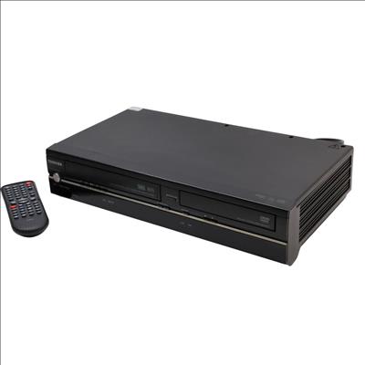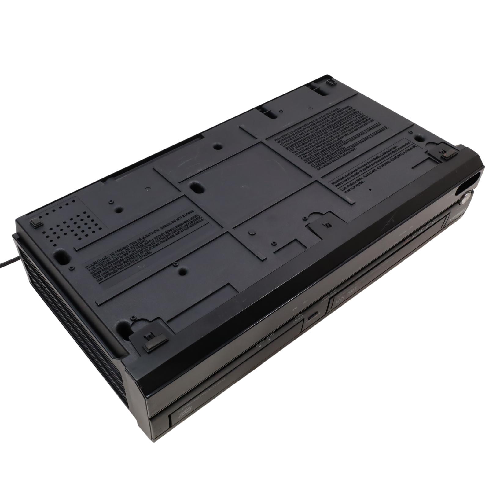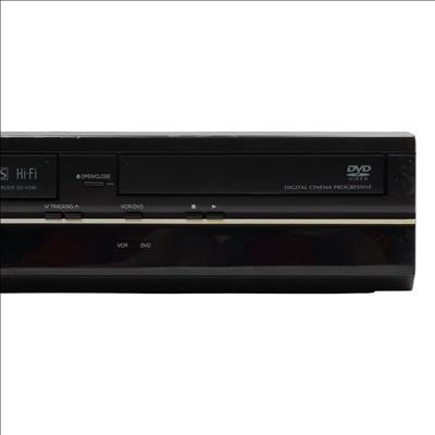 A DVD and VCR combination unit that supports multiple disc formats, including DVD-Video, DVD-R, DVD RW, CD, CD-R, CD-RW, and VCD. It features a 108MHz/14-bit video digital-to-analog converter and outputs component video through ColorStream Pro. For audio, it includes a 192kHz/24-bit digital-to-analog converter and supports Dolby Digital and DTS formats with 3D surround sound capability. On-screen display languages include English, French, and Spanish.
