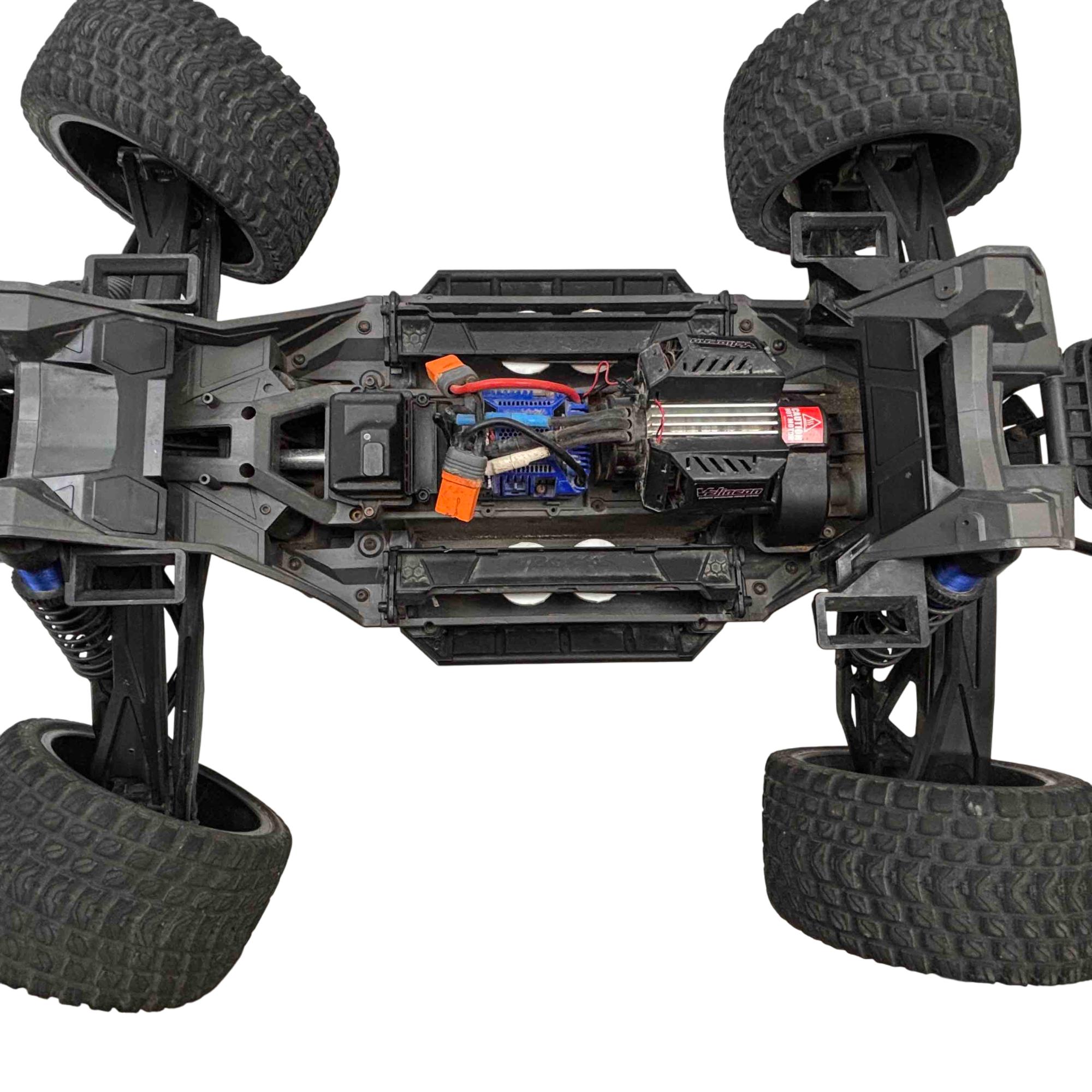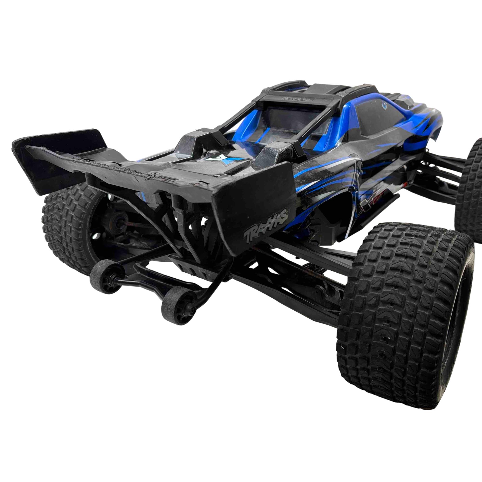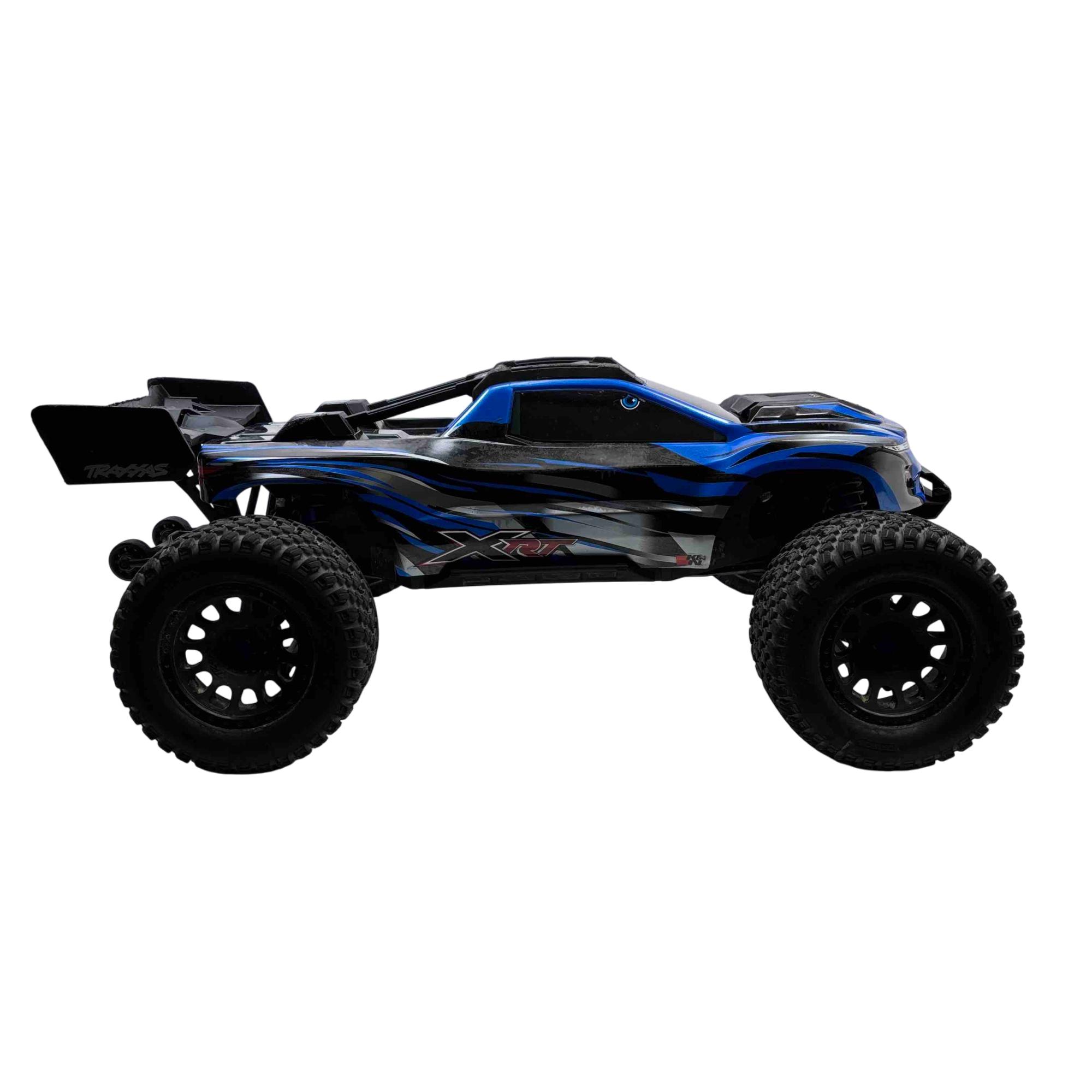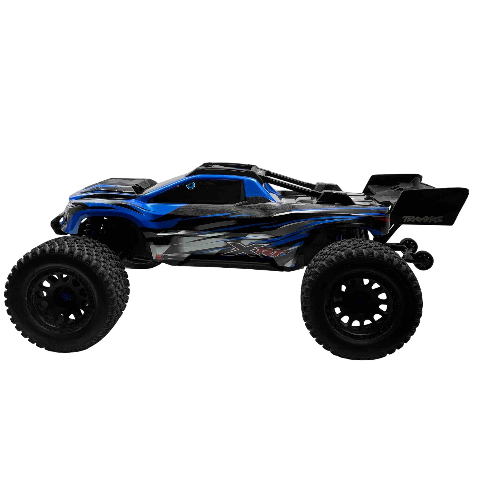A high-performance, race-inspired vehicle engineered for exceptional speed, handling, and durability. It features a low center of gravity chassis with a wide stance for enhanced stability and precision at speeds exceeding 60 MPH. The all-metal driveline includes steel 4-gear differentials, steel driveshafts, and a robust aluminum center shaft, ensuring durability under extreme conditions. The clipless body system allows for quick and secure attachment, while the Gravix race tires deliver excellent grip and quiet operation on hard surfaces. Powered by the Velineon VXL-8s system and a 1200XL brushless motor with dual fans, the XRT provides powerful acceleration and control. Additional features include a sealed, limited-slip differential, electronic braking, shaft-driven 4WD, and a TQi 2.4GHz transmitter with TSM receiver for advanced handling. With its sharp handling and innovative design, this truck is designed to deliver a thrilling racing experience.