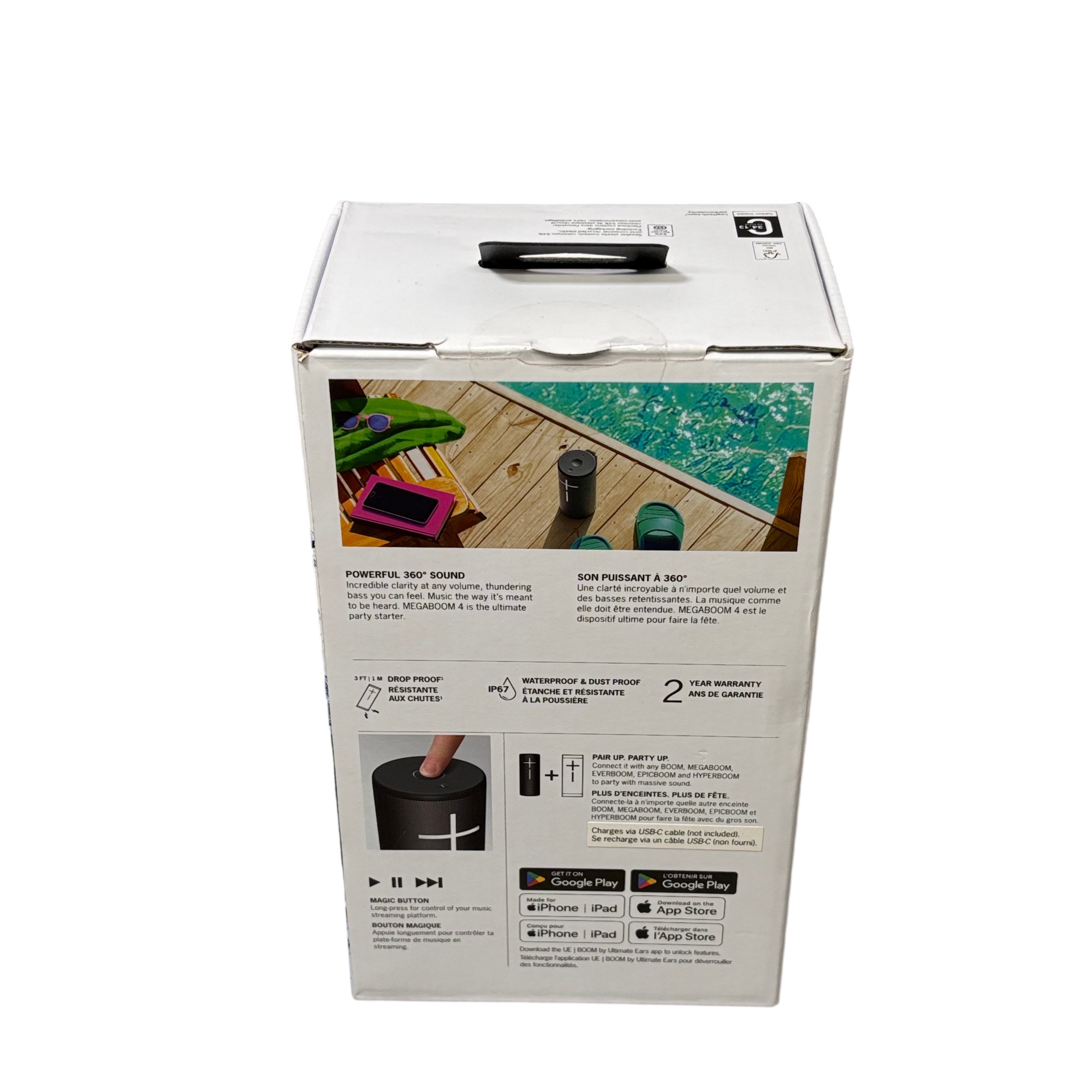 The Ultimate Ears Megaboom 4 Portable Bluetooth Speaker delivers powerful 360-degree sound with incredible clarity and thundering bass. Featuring an IP67 waterproof and dustproof rating, this speaker is built to withstand drops up to 3 feet, making it perfect for outdoor and poolside use. The Magic Button allows easy control of your music streaming platform, and compatibility with iPhone, iPad, and Android devices makes it versatile for all users.