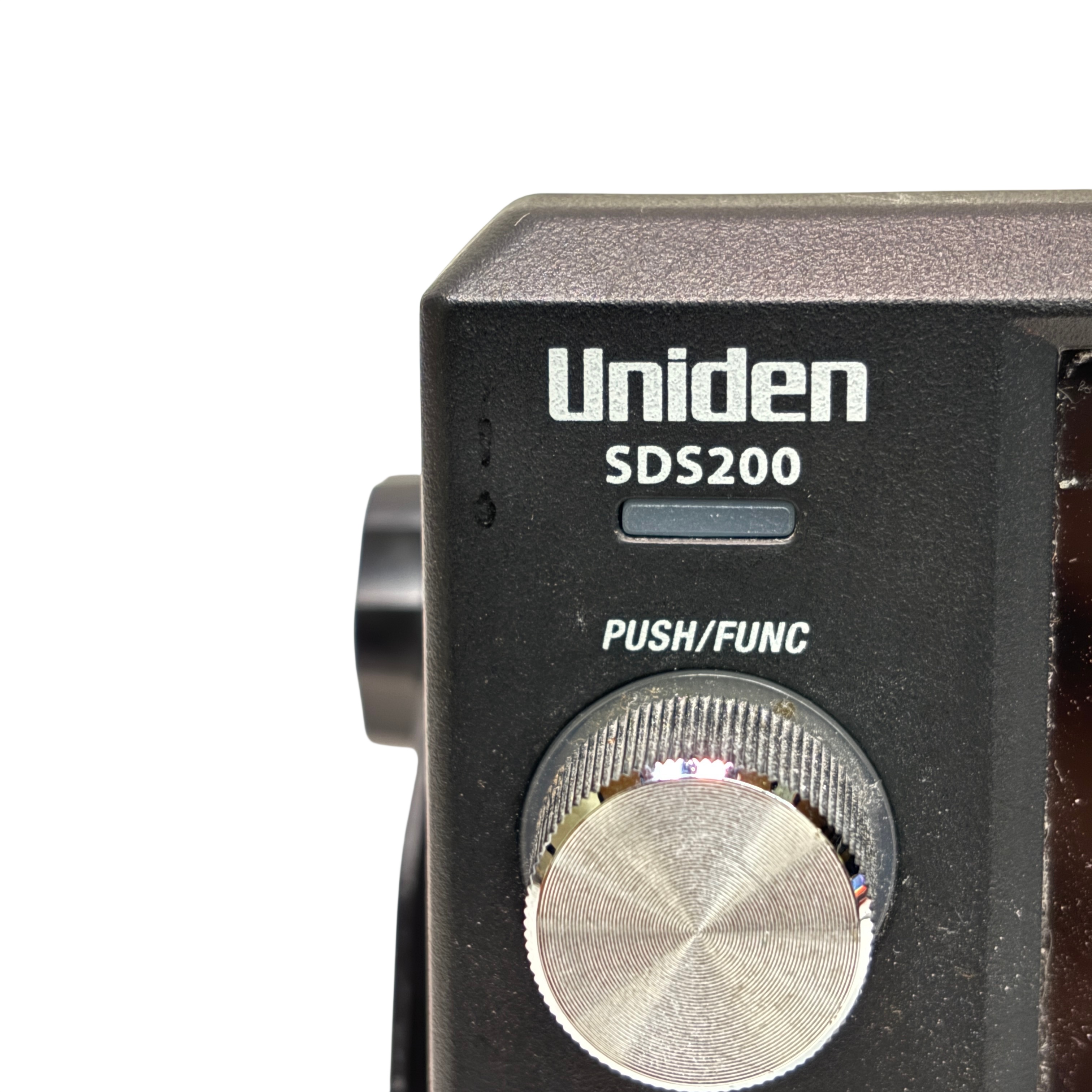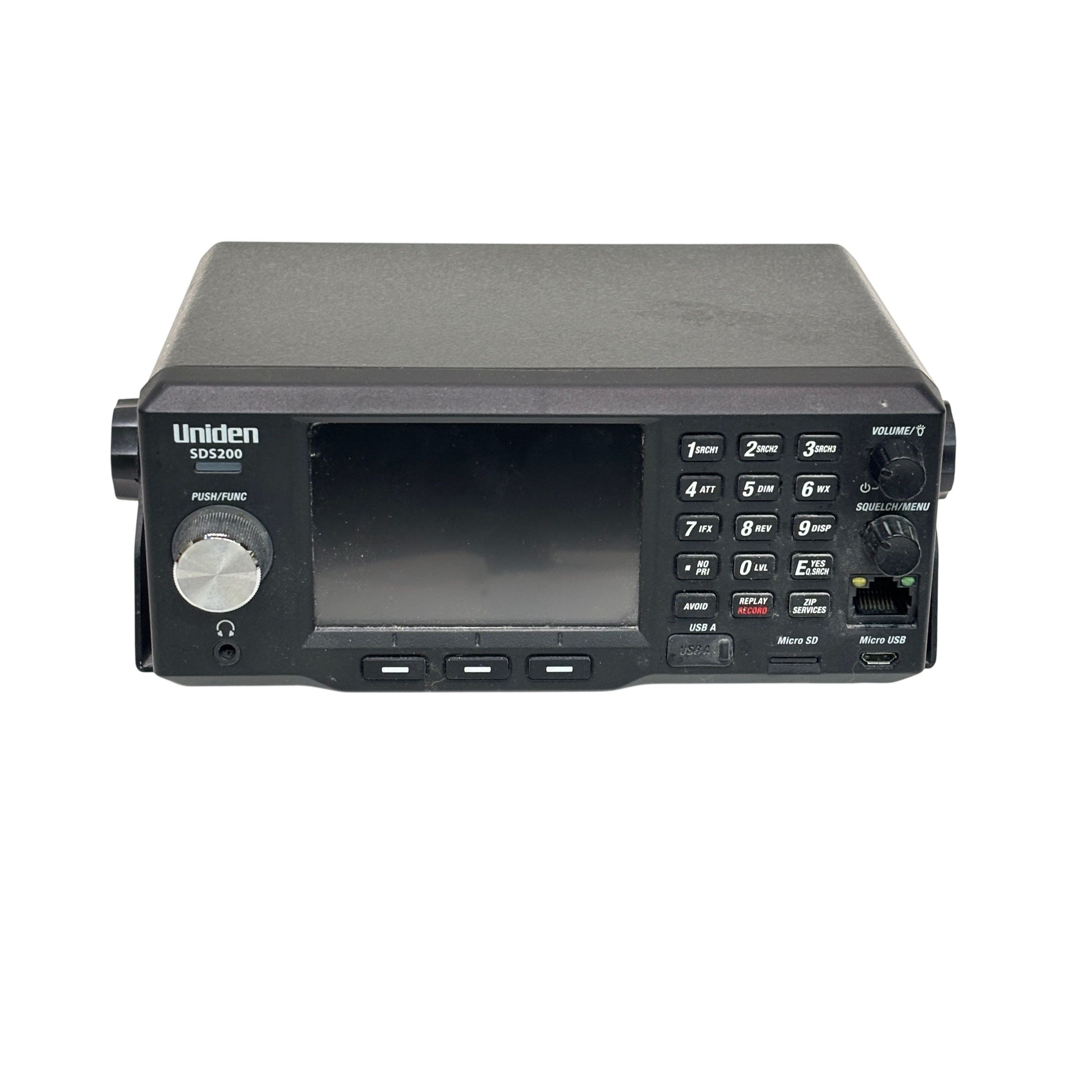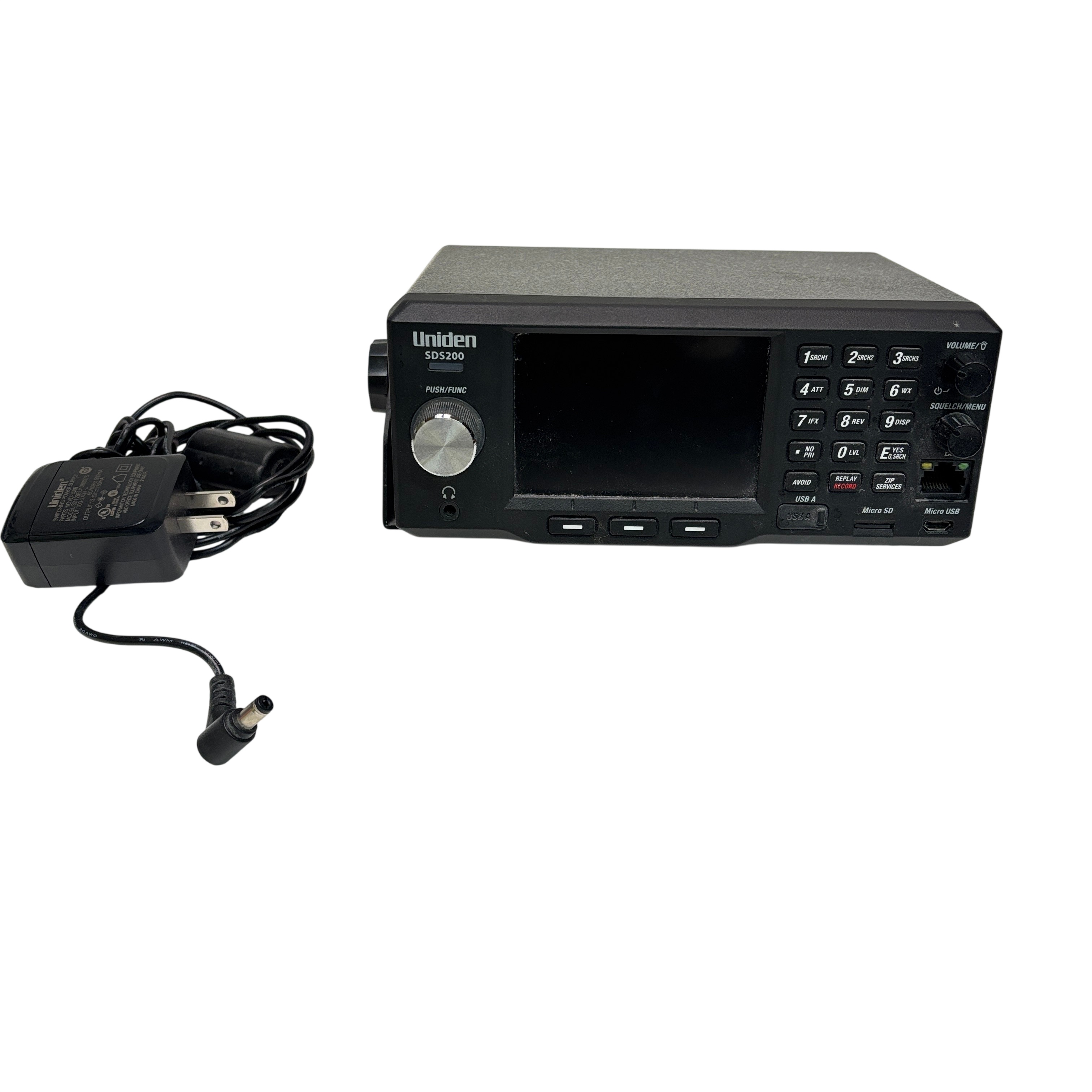 The Uniden SDS200 Radio Scanner is a versatile and feature-rich scanning receiver designed for wideband monitoring. This model features a color LCD screen for easy navigation and supports multiple search modes including replay record and ZIP services. Connectivity options include USB, Micro USB, Micro SD card slot, GPS, and Ethernet ports, making it suitable for advanced scanning and recording needs. The package includes the scanner unit and an AC power adapter, ideal for home or mobile use. Compact and weighing approximately 3 pounds, the SDS200 offers reliable performance for hobbyists and professionals alike.