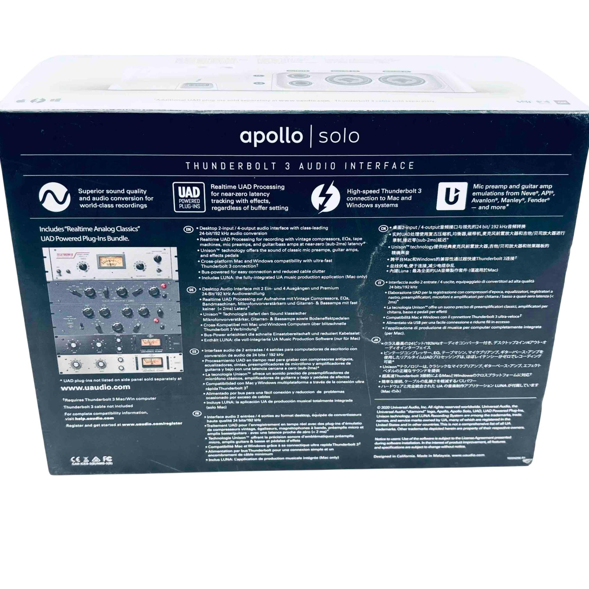 Experience professional studio quality wherever you go with the Universal Audio Apollo Solo Thunderbolt 3 Audio Interface. This compact desktop interface features 2 inputs and 4 outputs, world-class 24-bit/192 kHz audio conversion, Realtime UAD processing for vintage hardware emulation, and Unison™ mic preamps for pristine vocal and instrument recording. Perfect for musicians, producers, and engineers who demand top-tier sonic performance with near-zero latency and seamless Mac/Windows compatibility.