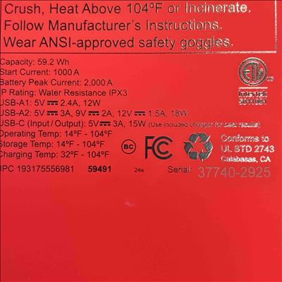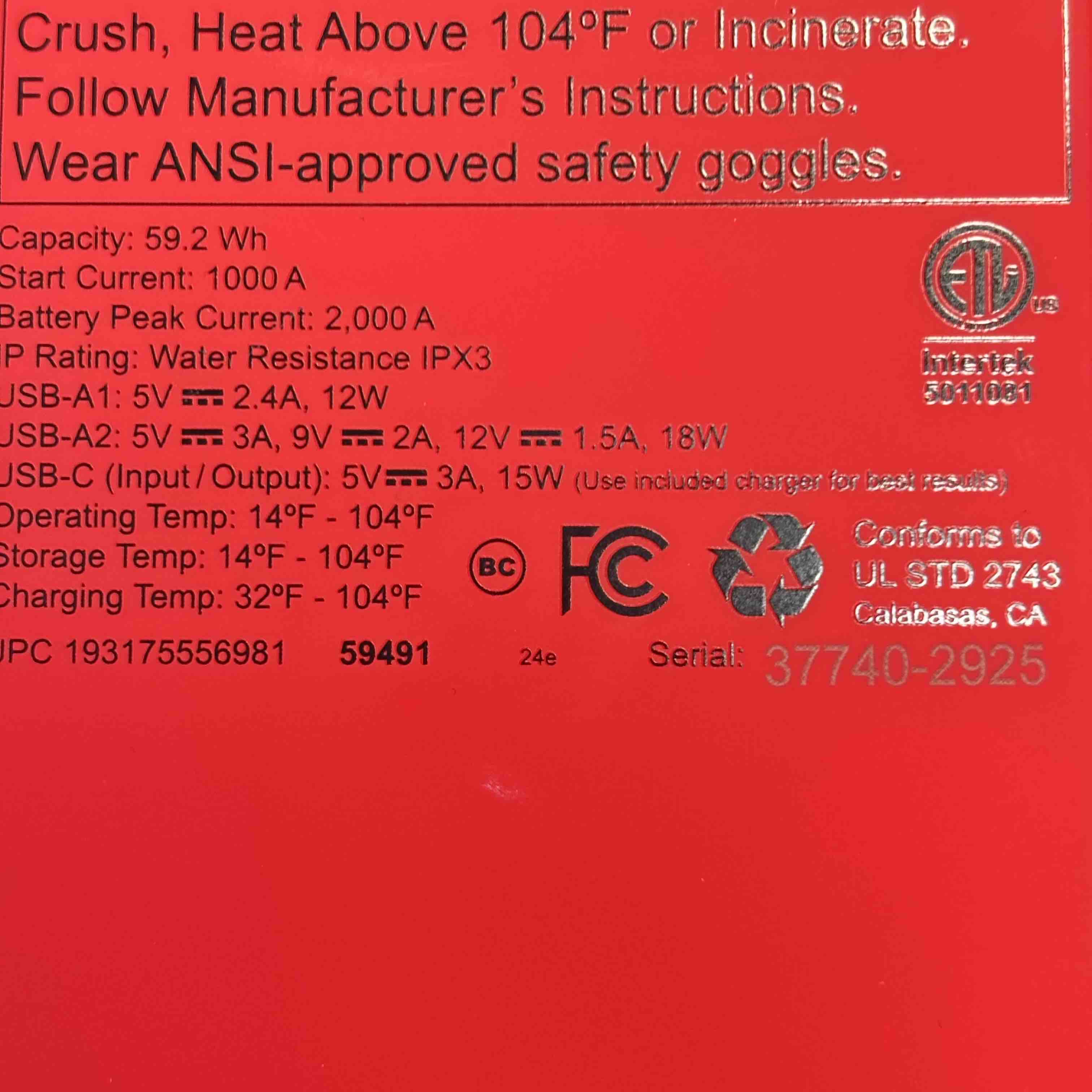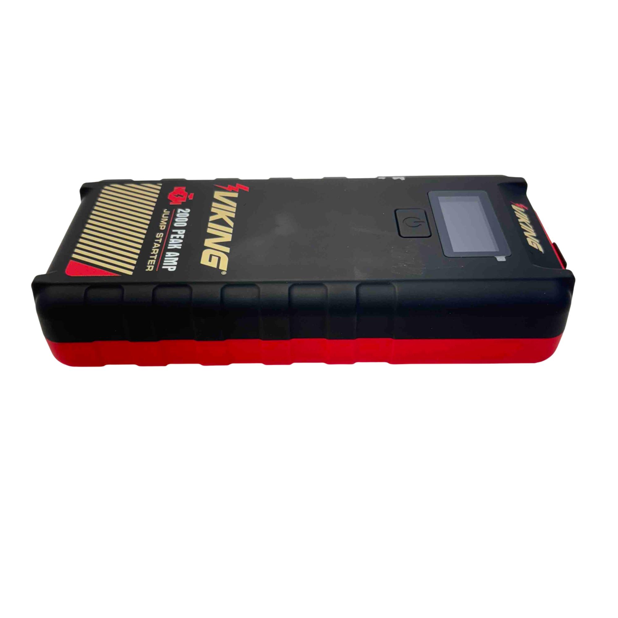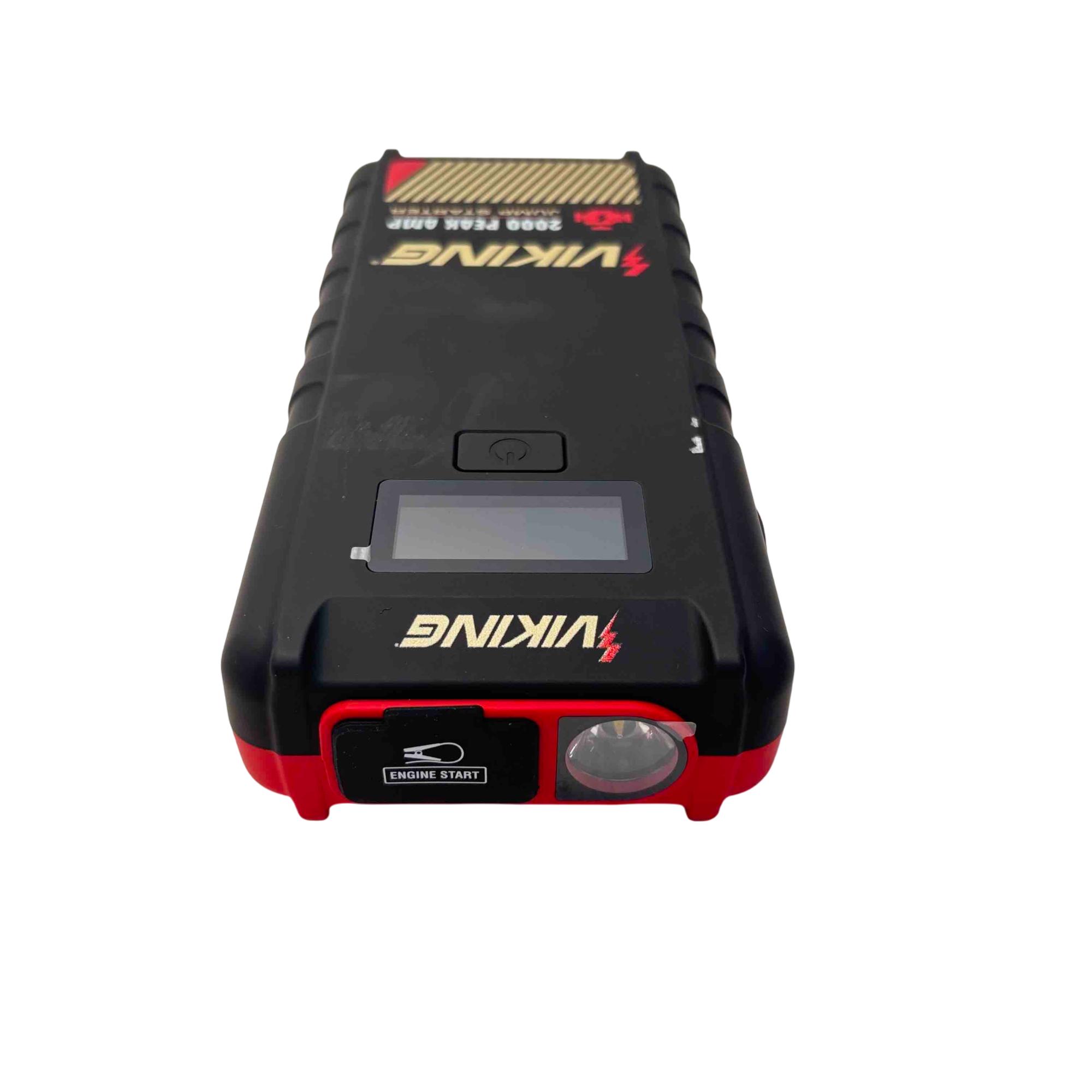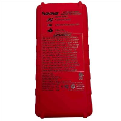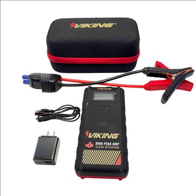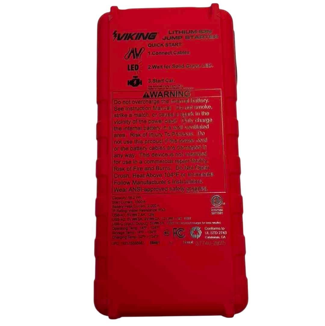 The VIKING 2000 Peak Amp Lithium-Ion Jump Starter and Power Bank Model 59491 offers powerful jump-start capabilities with a peak current of 2,000 amps and a starting current of 1,000 amps. Designed with water resistance rated at IPX3, it features multiple USB outputs including USB-A and USB-C ports for versatile charging options. This compact, durable device operates efficiently within a temperature range of 14°F to 104°F, making it suitable for various environments and emergency situations.