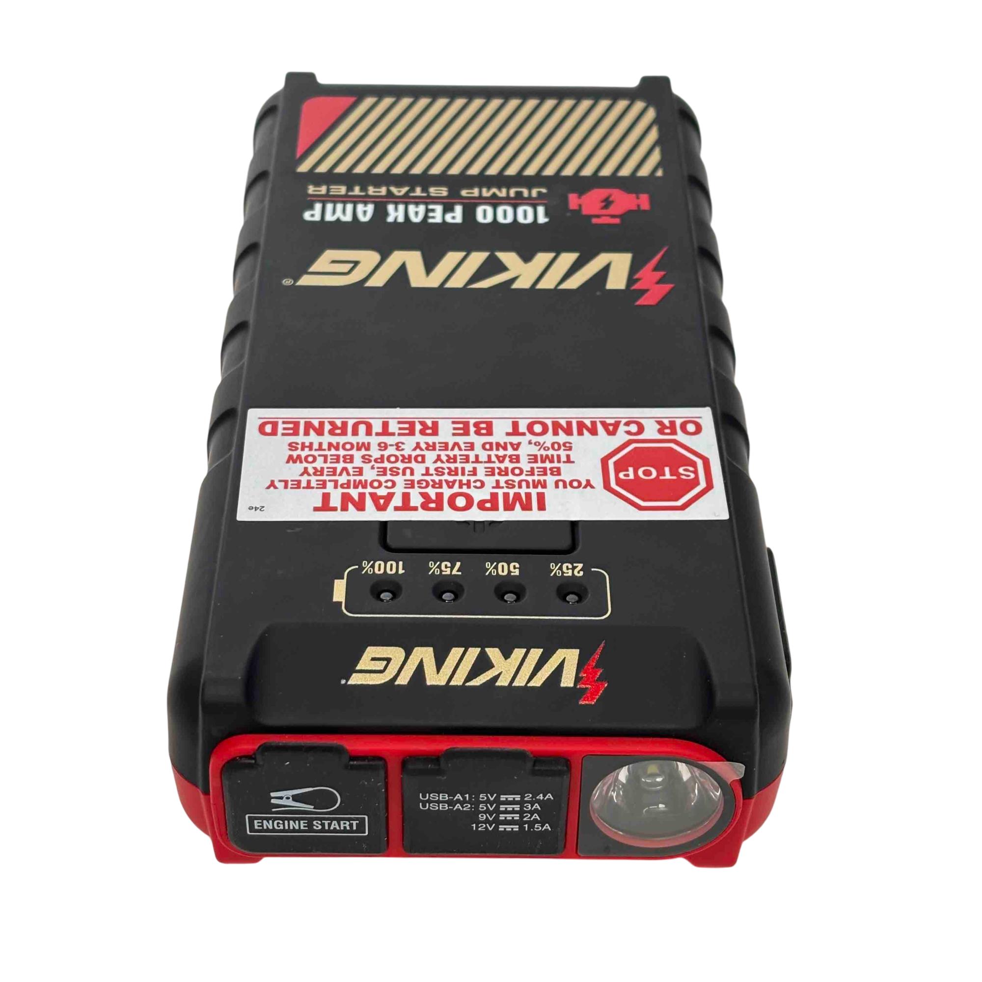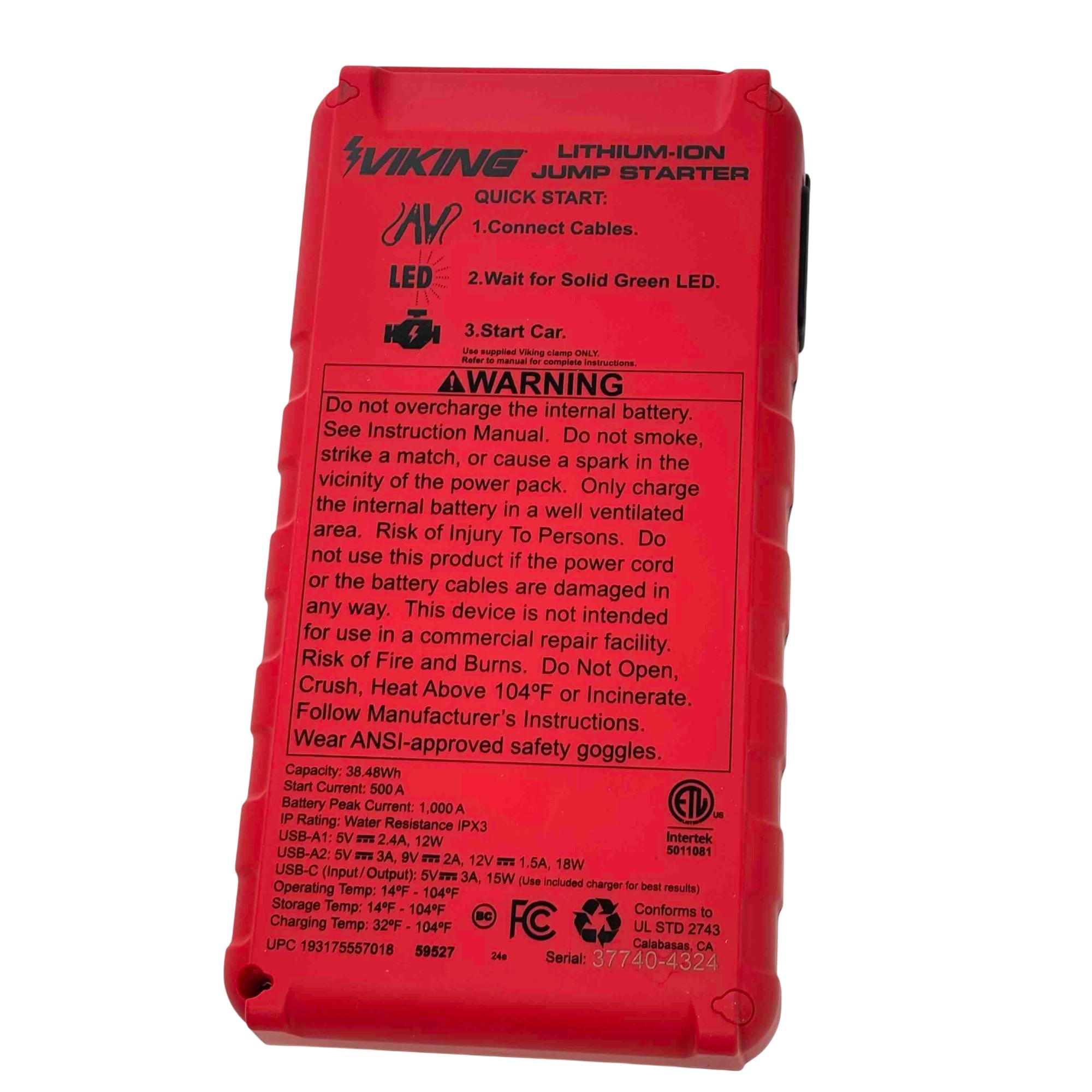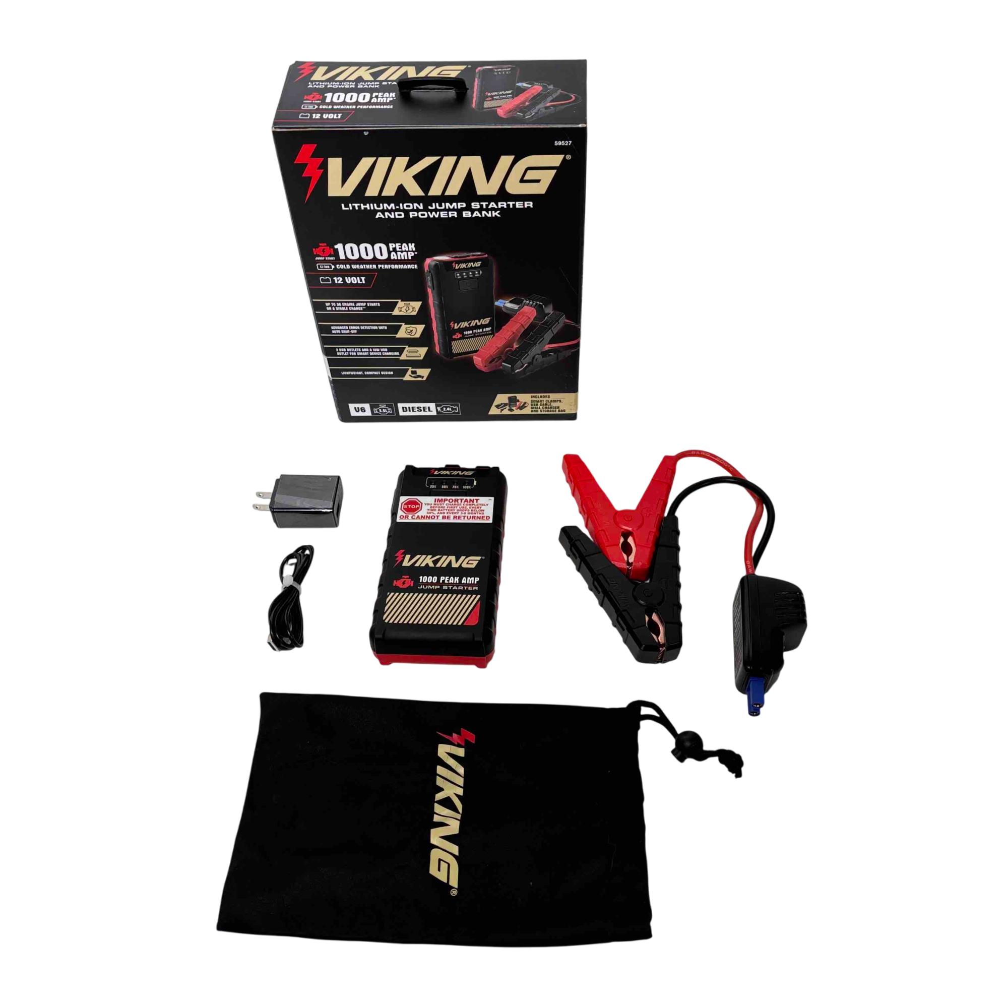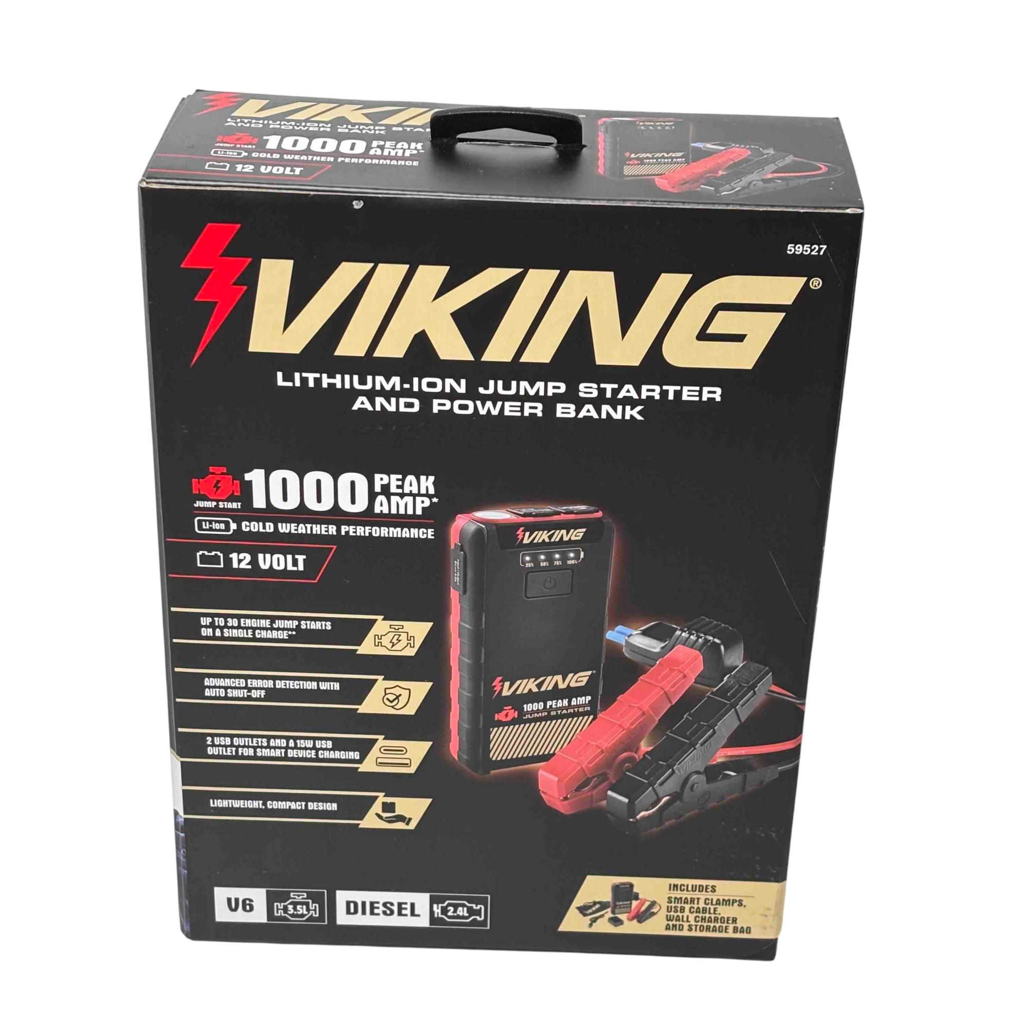 Rev up with confidence using the Viking 59527 Lithium-Ion Jump Starter and Power Bank. This powerhouse delivers a reliable 1000 Peak Amps to jump-start your vehicle and boasts a compact design for easy storage. Equipped with smart clamps and versatile USB charging ports, its your all-in-one solution for road emergencies and travel convenience.