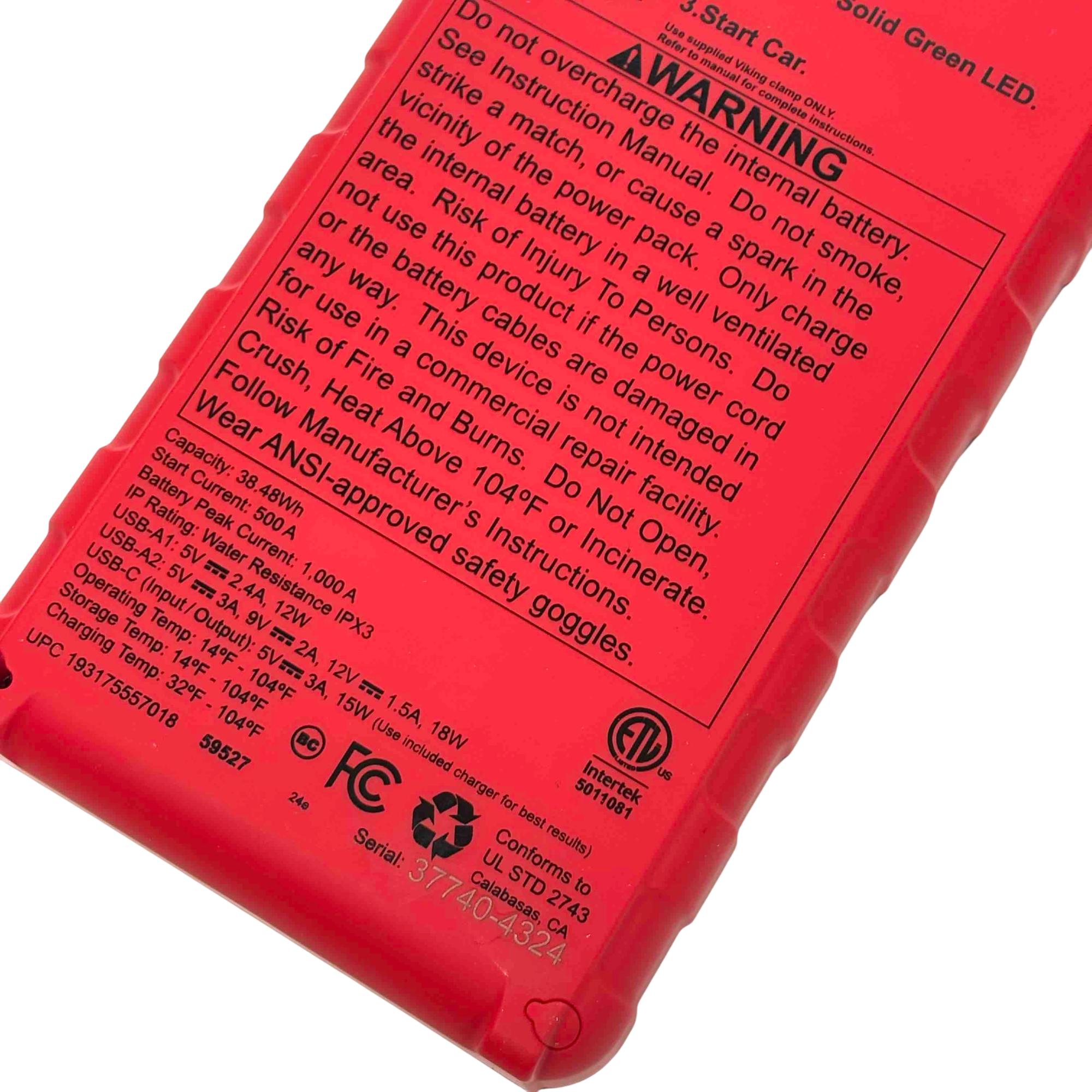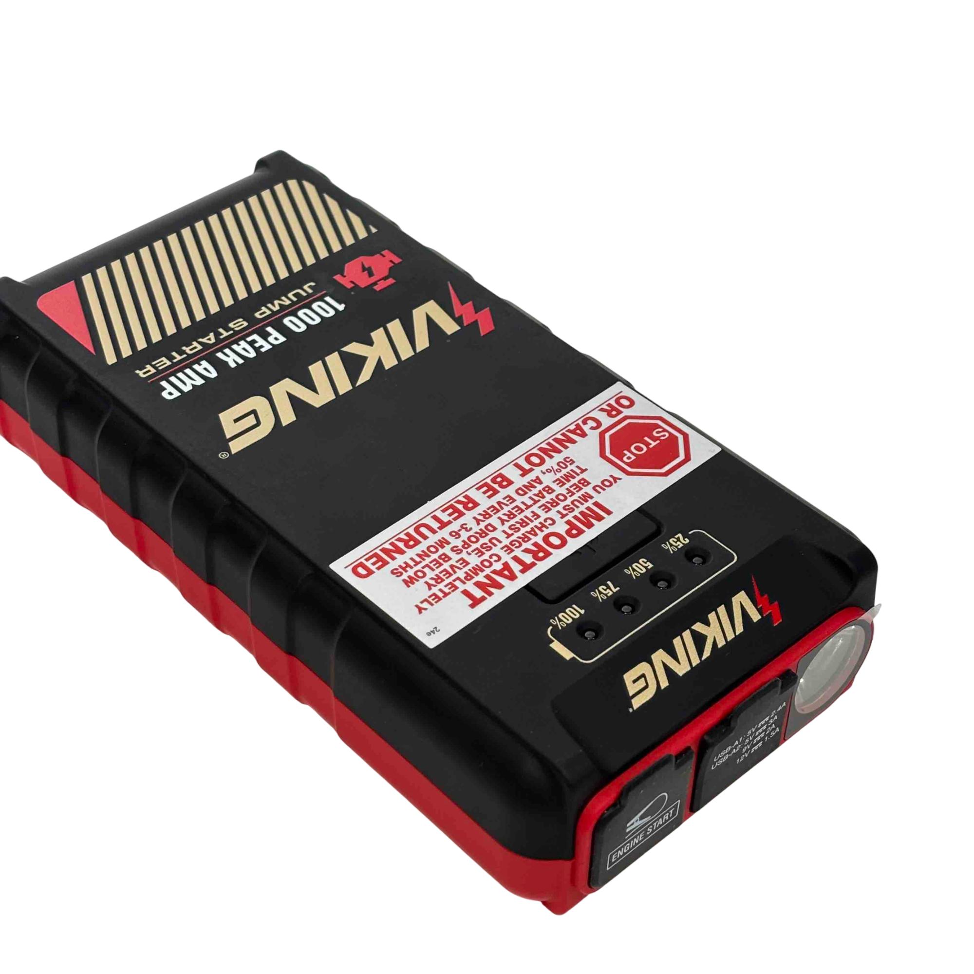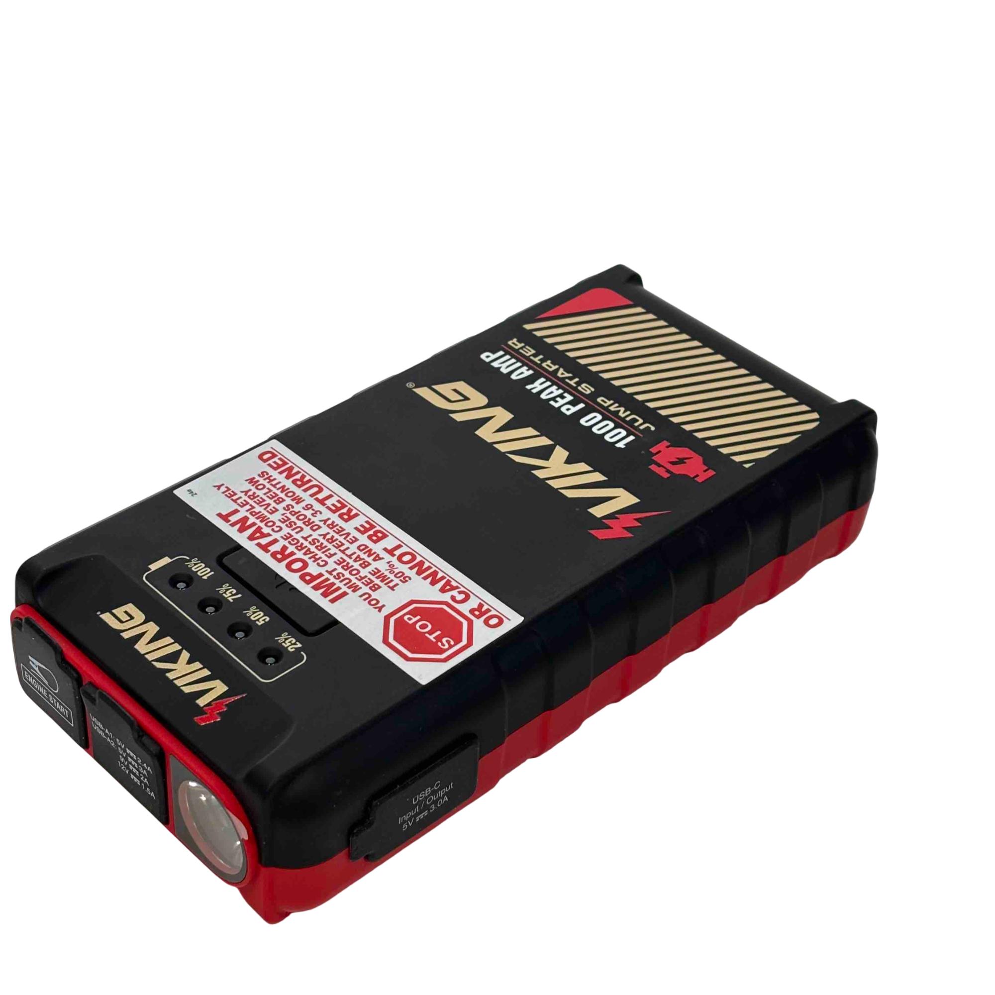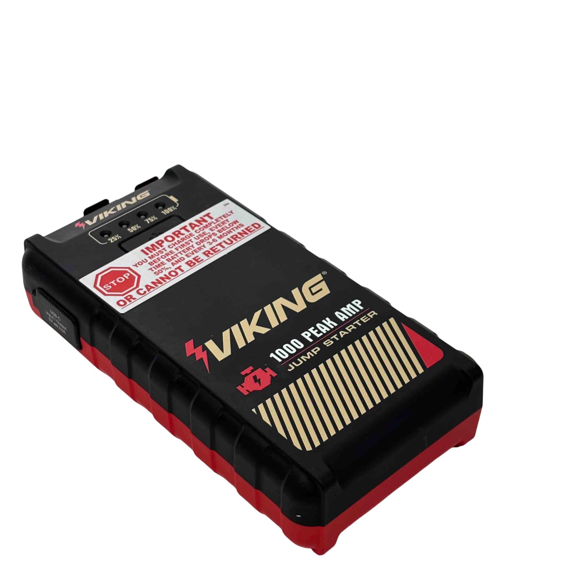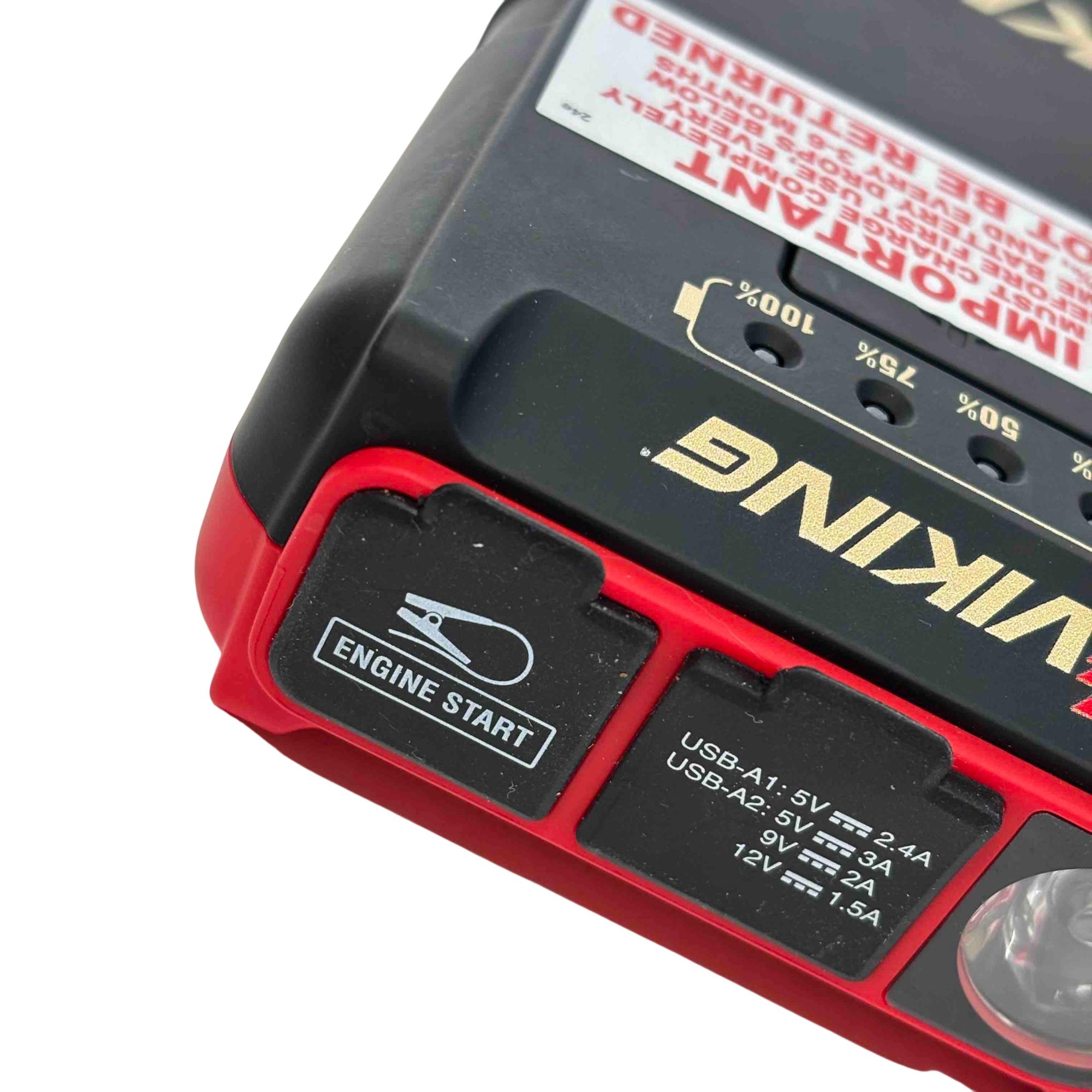Rev up with confidence using the Viking 59527 Lithium-Ion Jump Starter and Power Bank. This powerhouse delivers a reliable 1000 Peak Amps to jump-start your vehicle and boasts a compact design for easy storage. Equipped with smart clamps and versatile USB charging ports, its your all-in-one solution for road emergencies and travel convenience.
