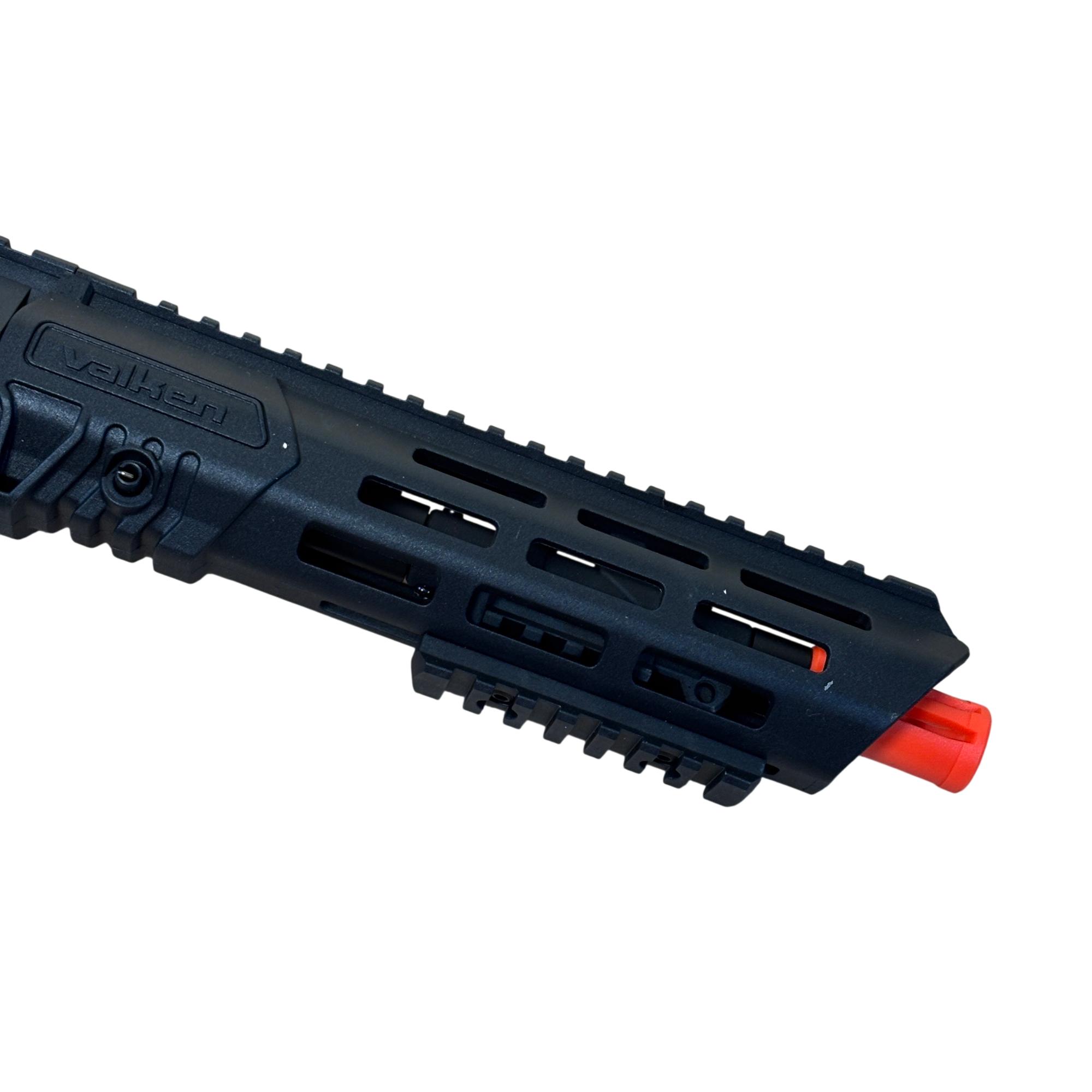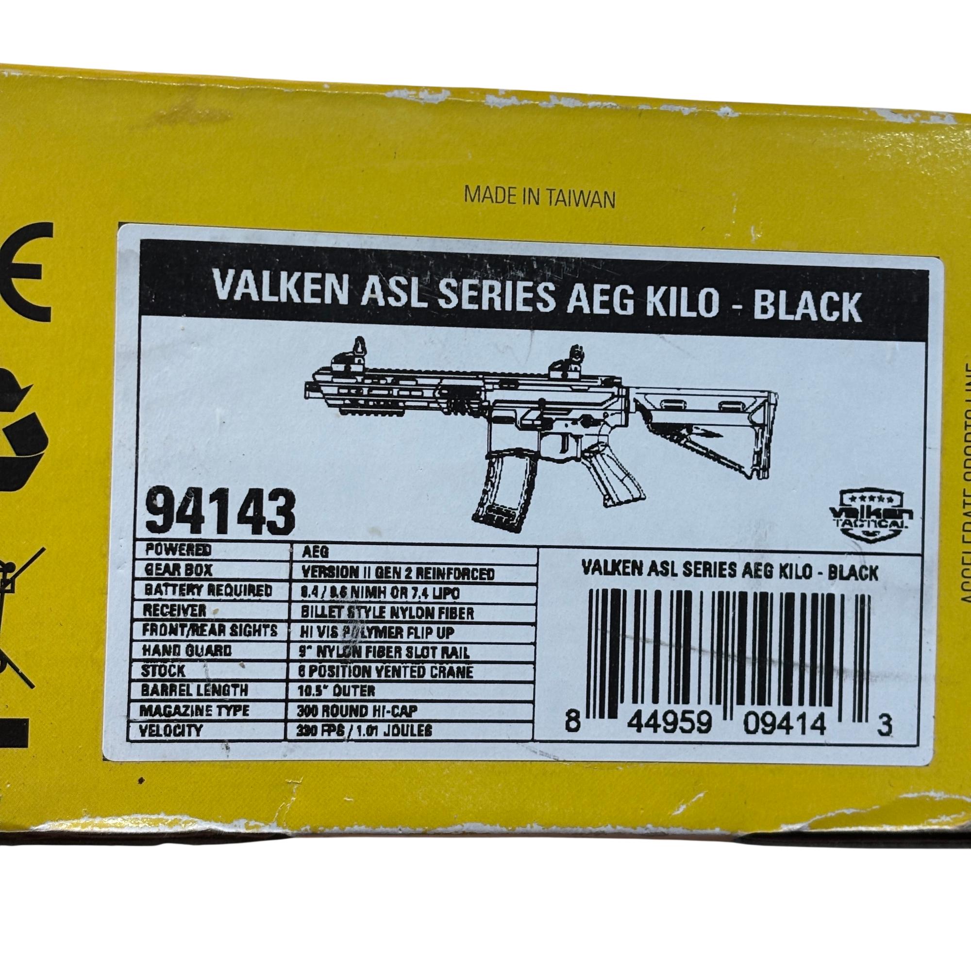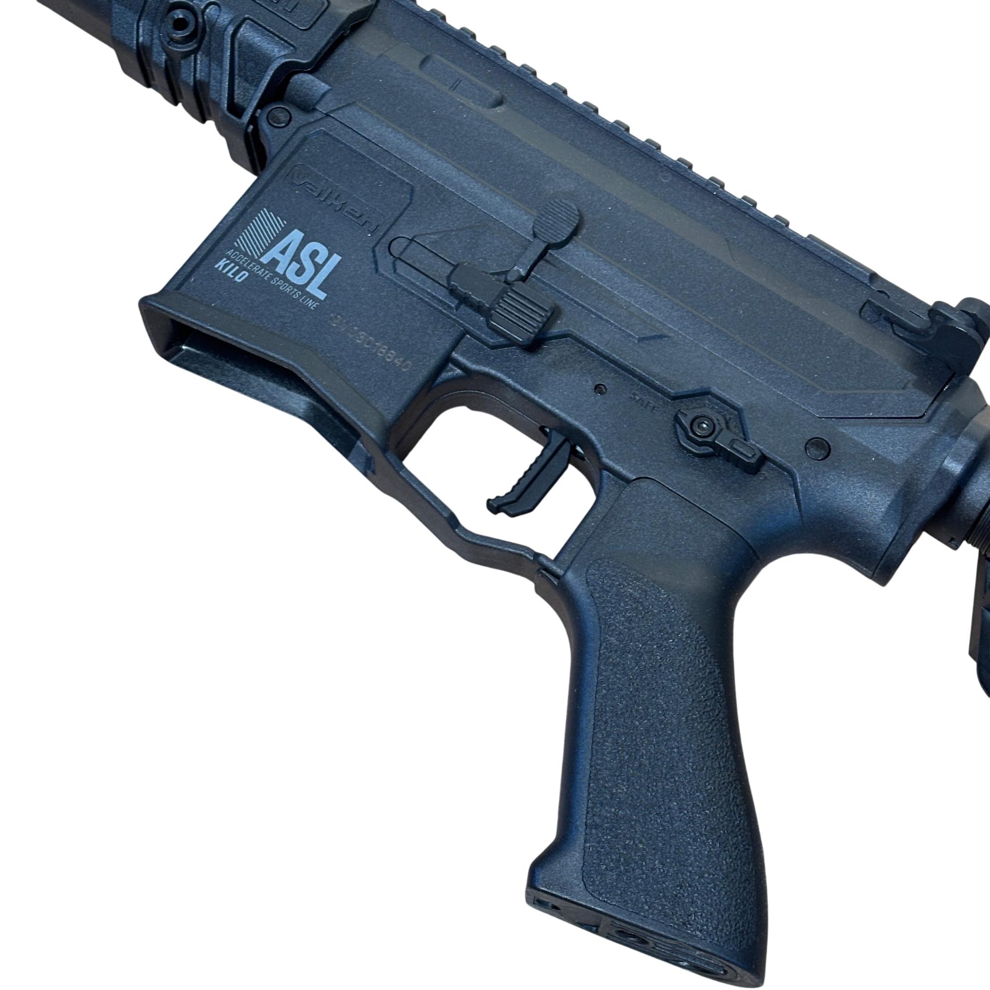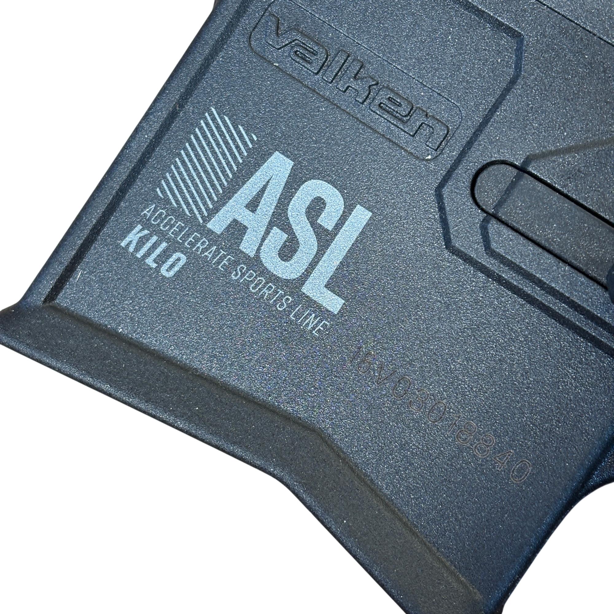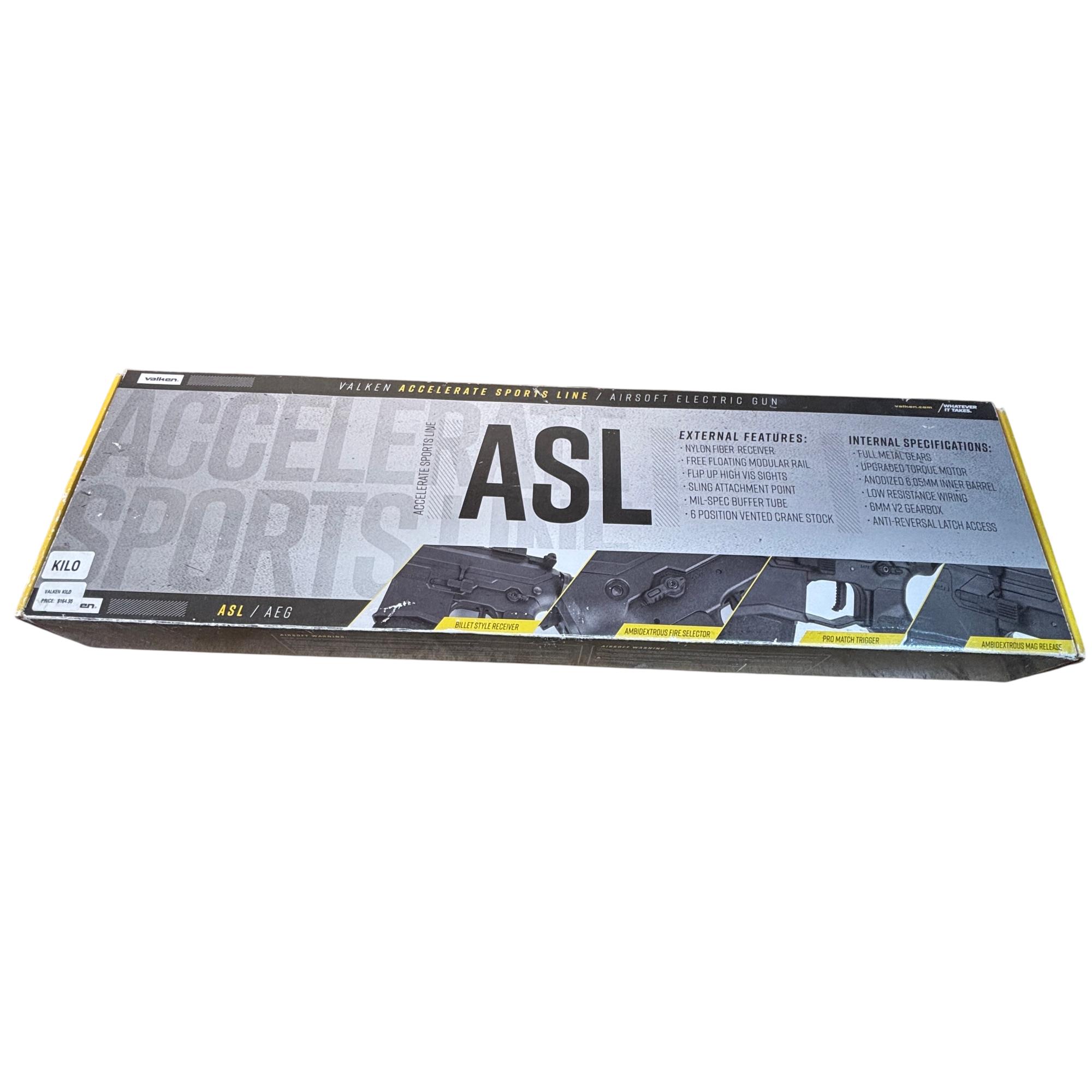 Valken ASL Kilo Airsoft Electric Gun (AEG) from the Accelerate Sports Line features a nylon fiber receiver and a free-floating modular rail system for enhanced durability and customization. Its internal components include full metal gears, an upgraded torque motor, and a 6mm V2 gearbox, all housed within a billet style receiver equipped with ambidextrous controls and flip-up high visibility sights for improved handling and accuracy.