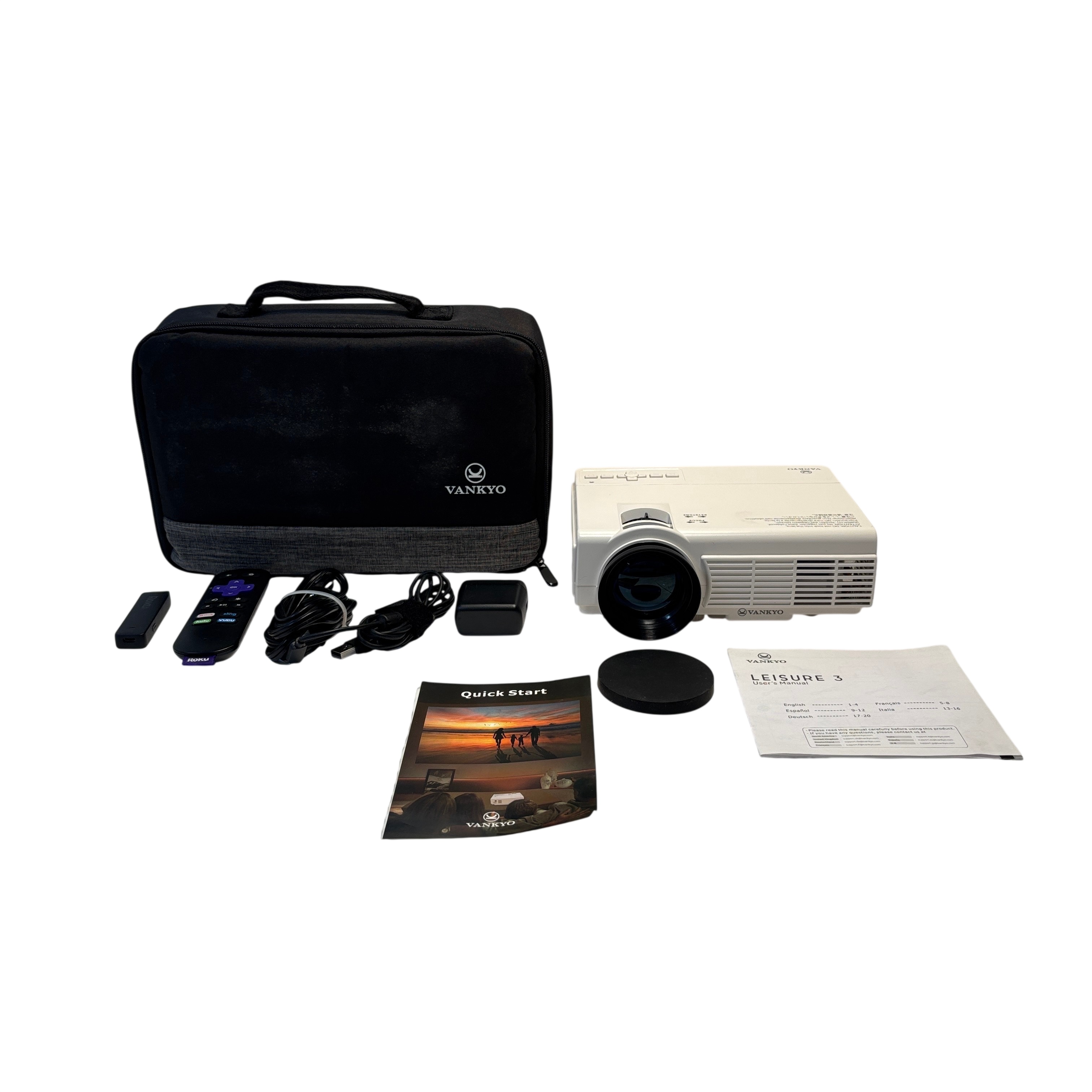 The Vankyo Leisure 3 Q5 Video Projector offers a versatile and portable home entertainment solution with LED lamp technology and wide voltage compatibility (AC 100-240V 50/60Hz). This compact white projector supports Roku streaming service and features HDMI and USB inputs for easy connectivity. Included in the set are a remote control, power adapter, cables, lens cap, carrying case, and user manuals, making it ideal for movie nights, gaming, and presentations. Its keystone correction and focus adjustment ensure a clear and customizable viewing experience in various environments.