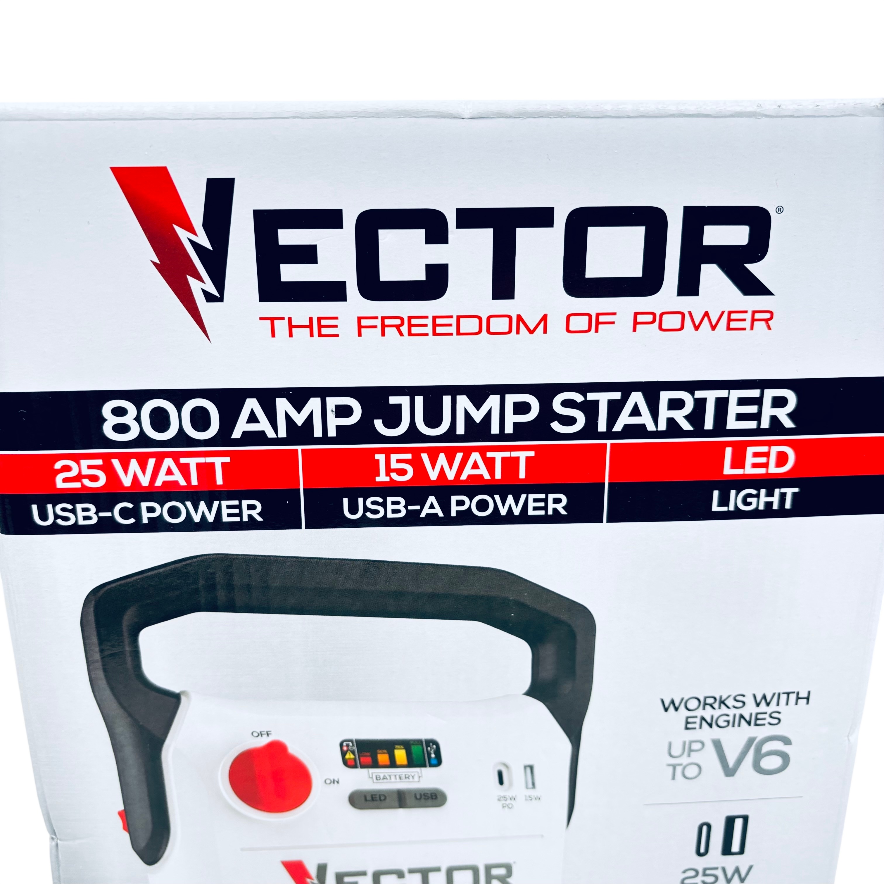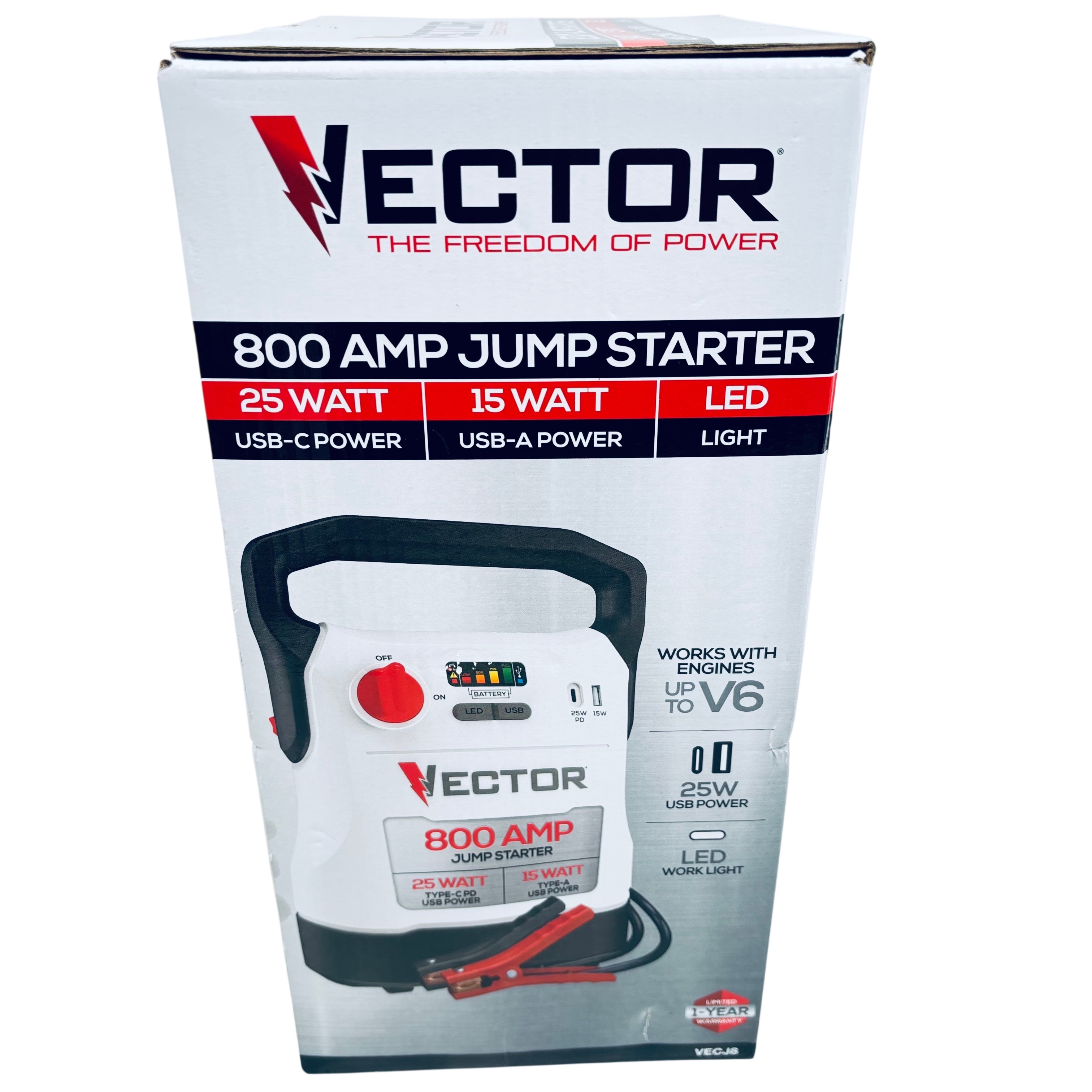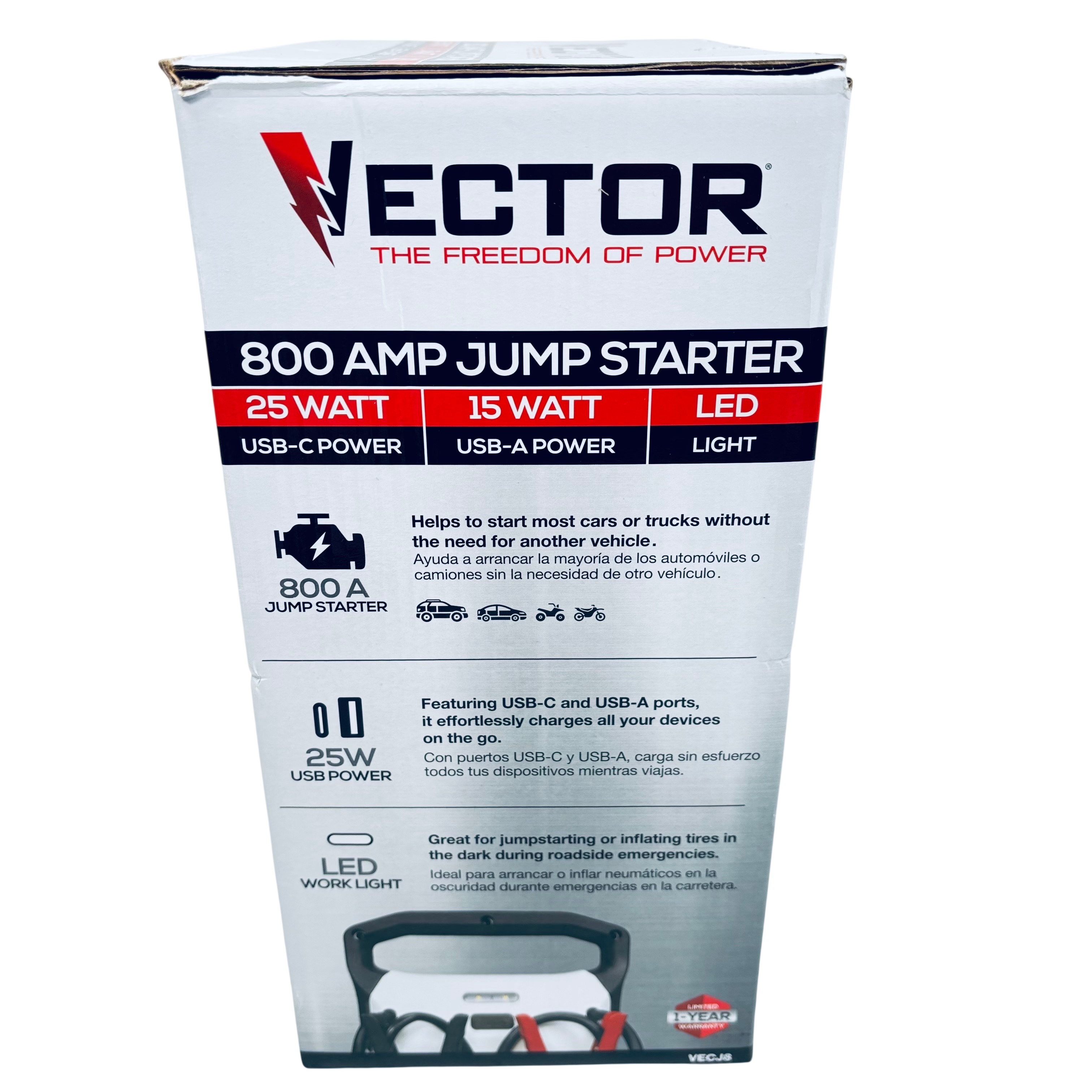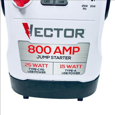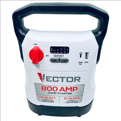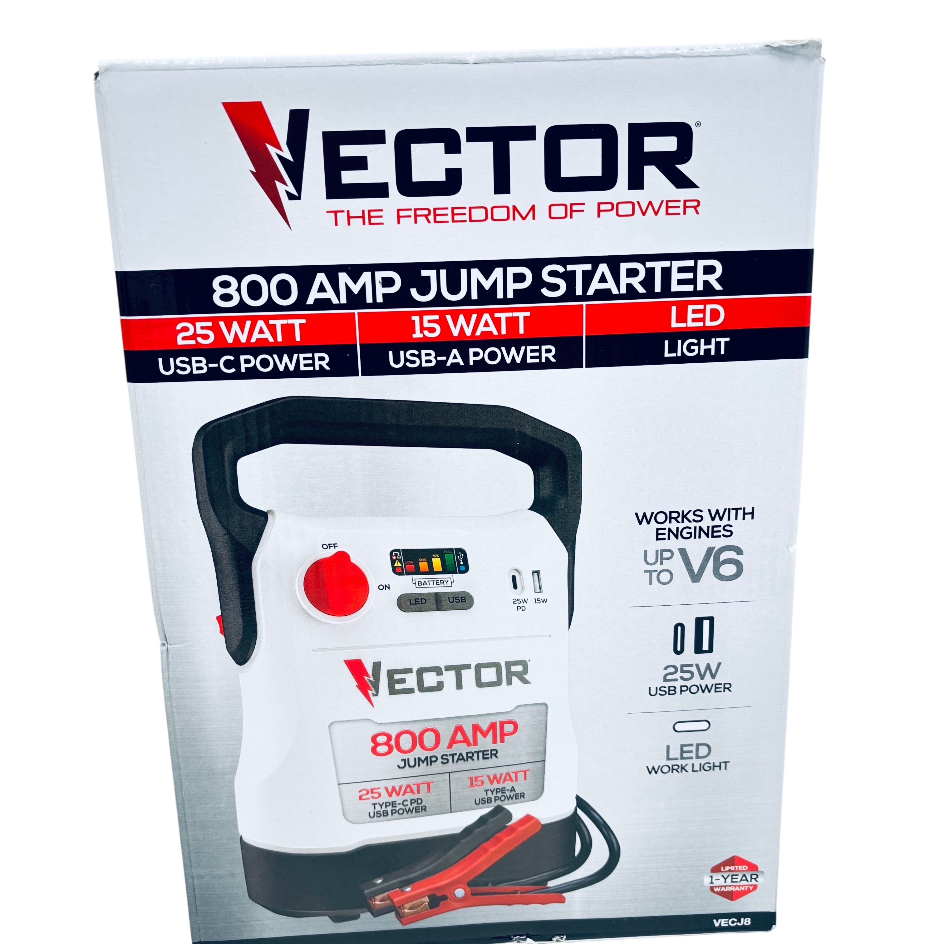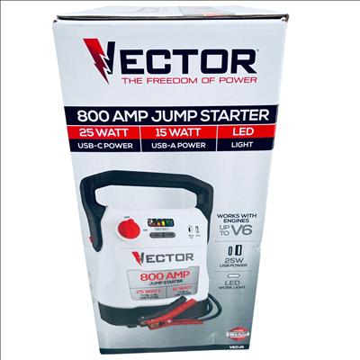 Vector 800 AMP Jump Starter (Model Vecj8) delivers reliable jump-start power for most cars and trucks with engines up to V6. Featuring 25 watt USB-C PD and 15 watt USB-A ports, it also charges your devices on the go. This compact jump starter includes an integrated LED work light and battery level indicator, making it ideal for roadside emergencies. The package contains the jump starter unit, power adapter, and user manual, providing a versatile and portable power solution.