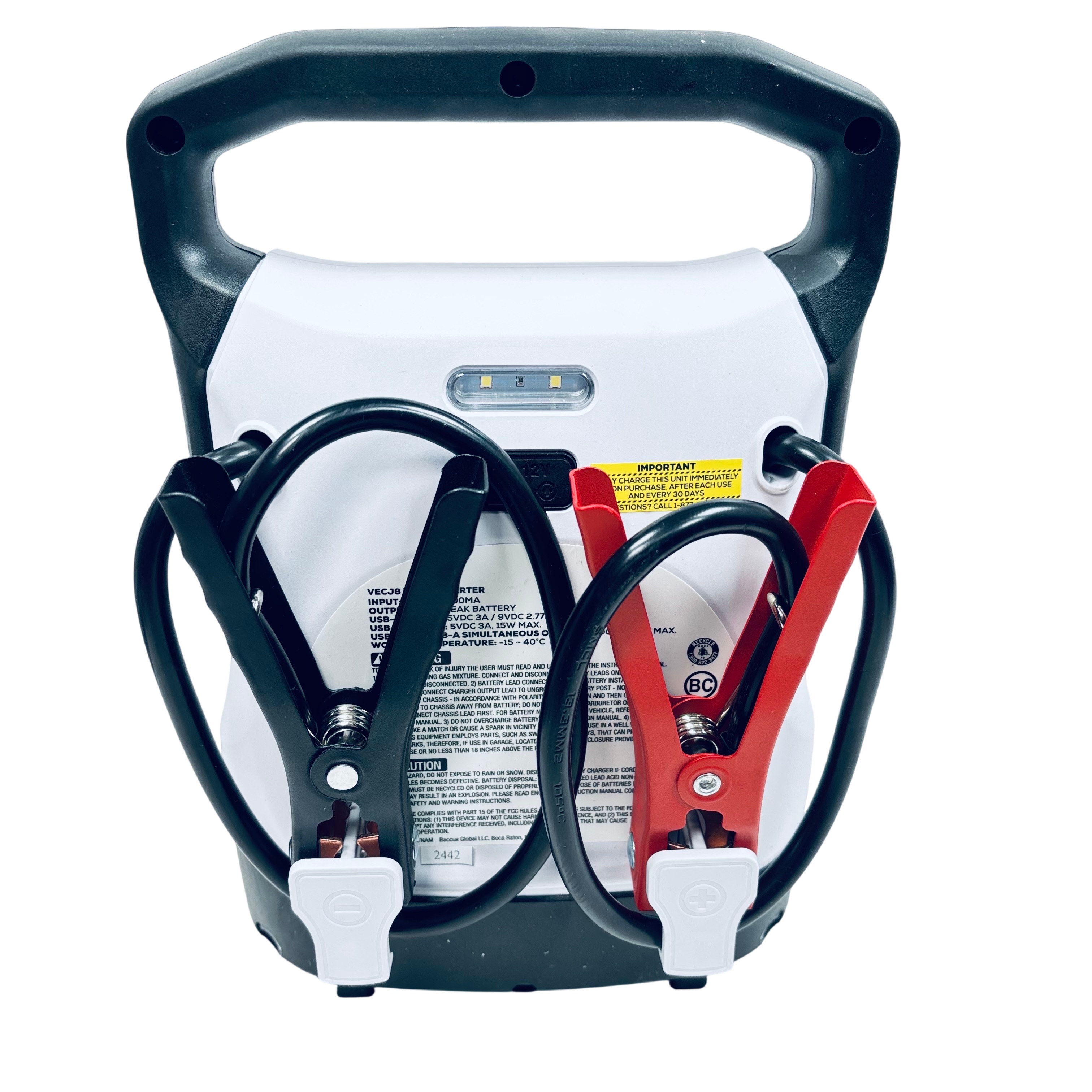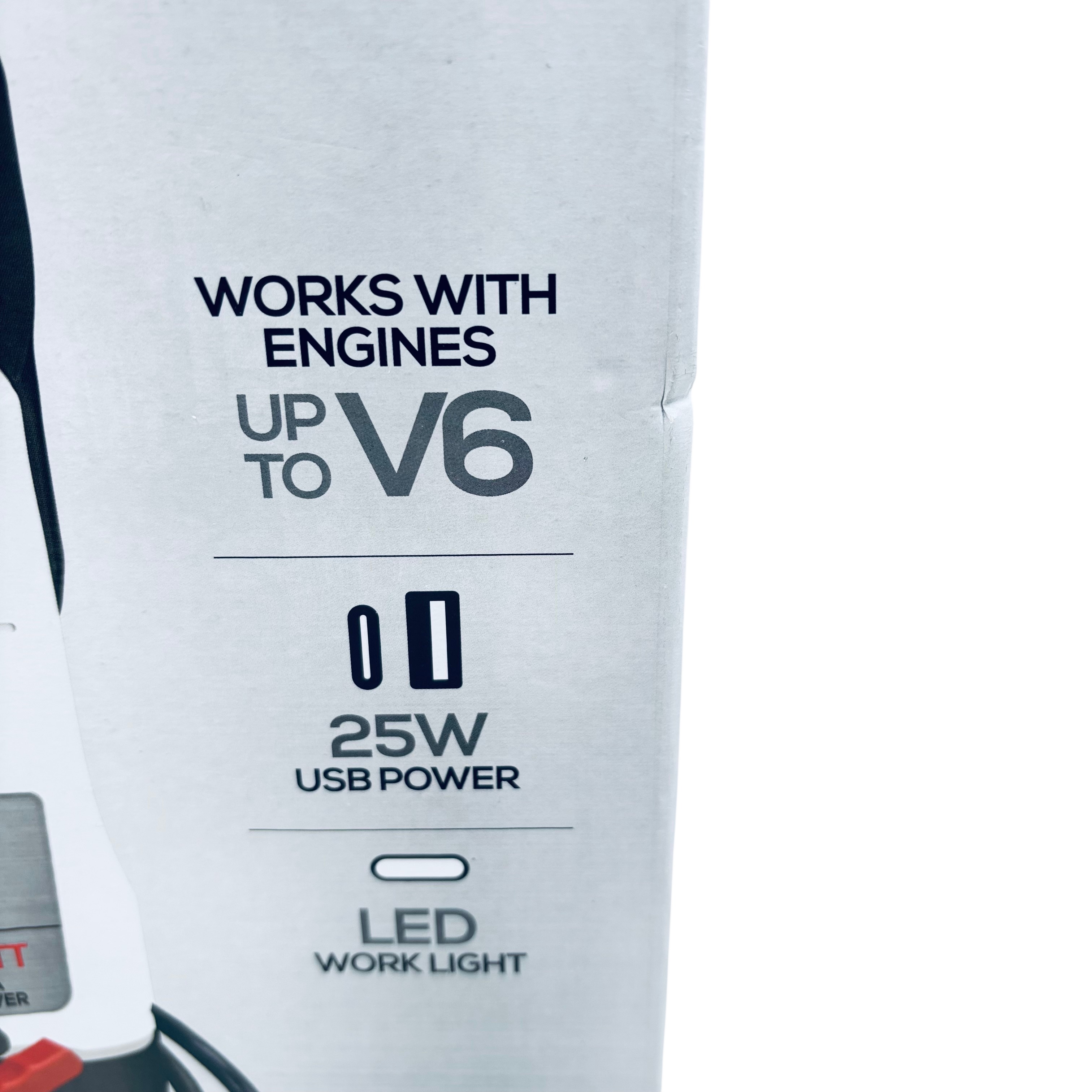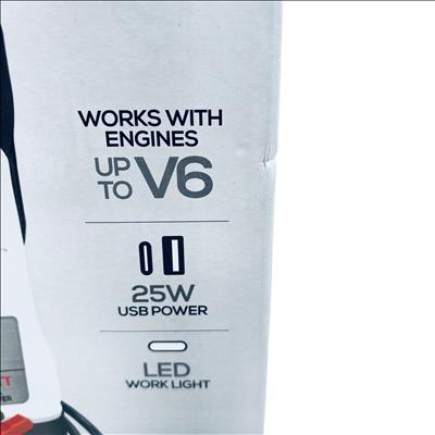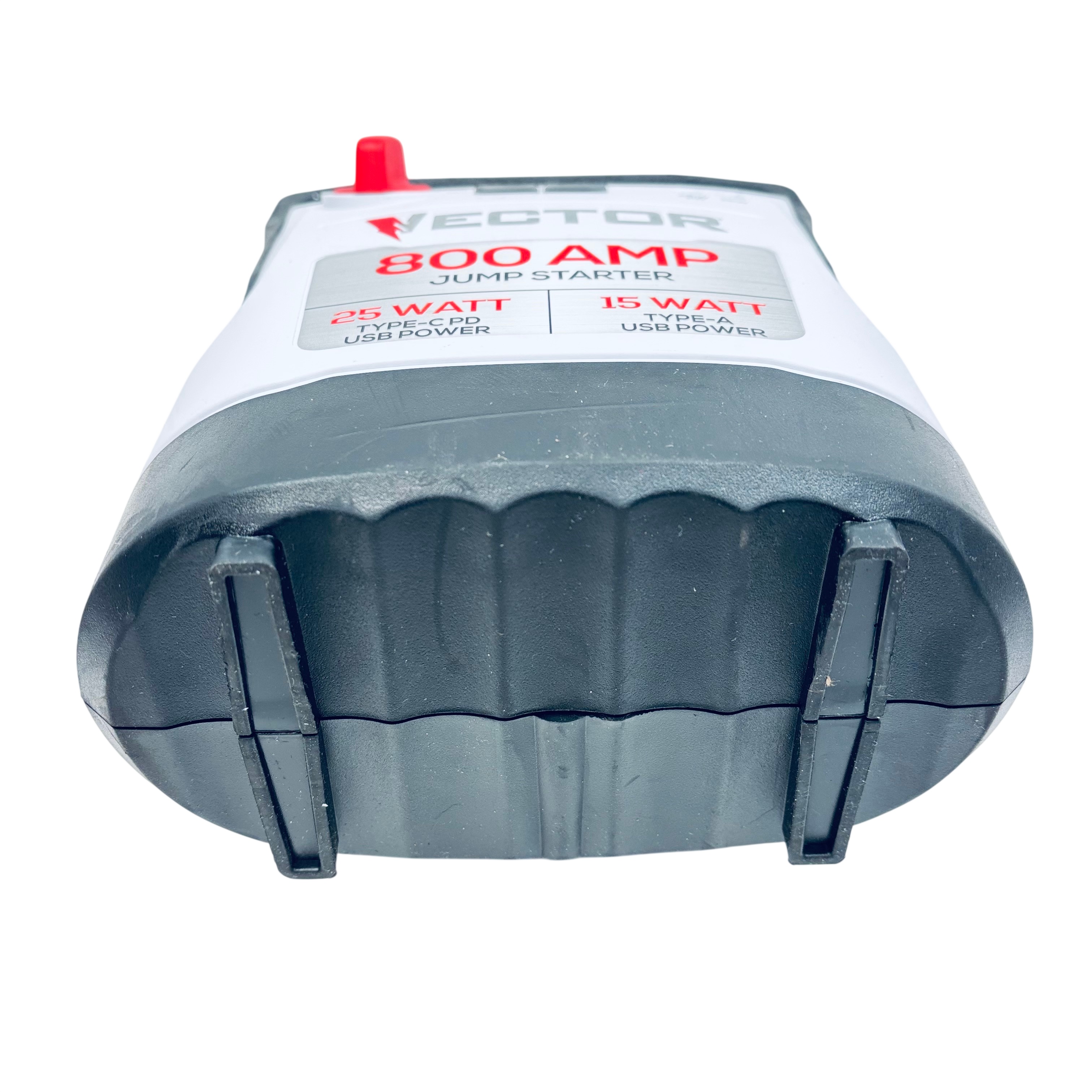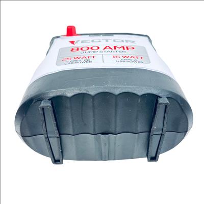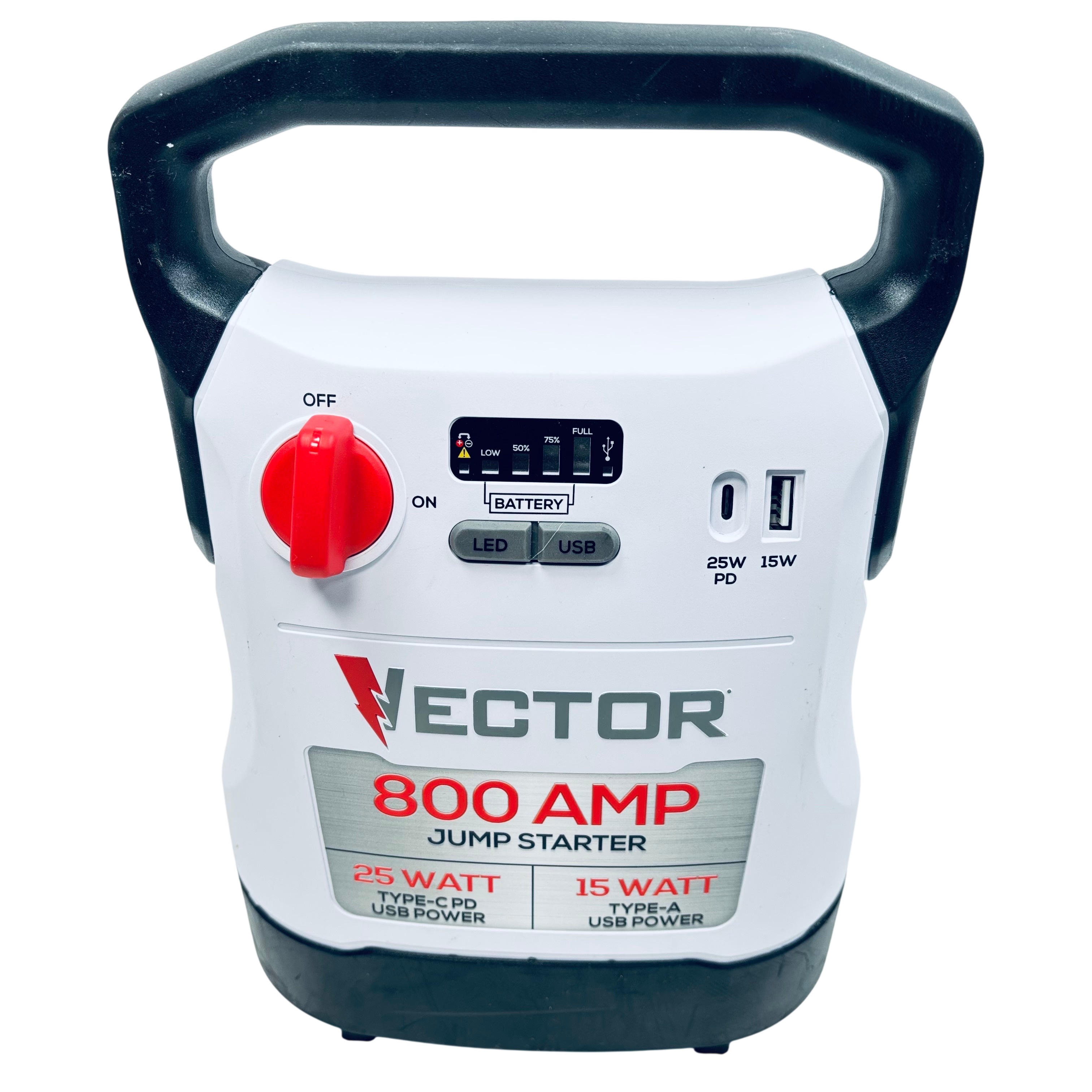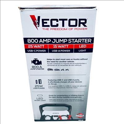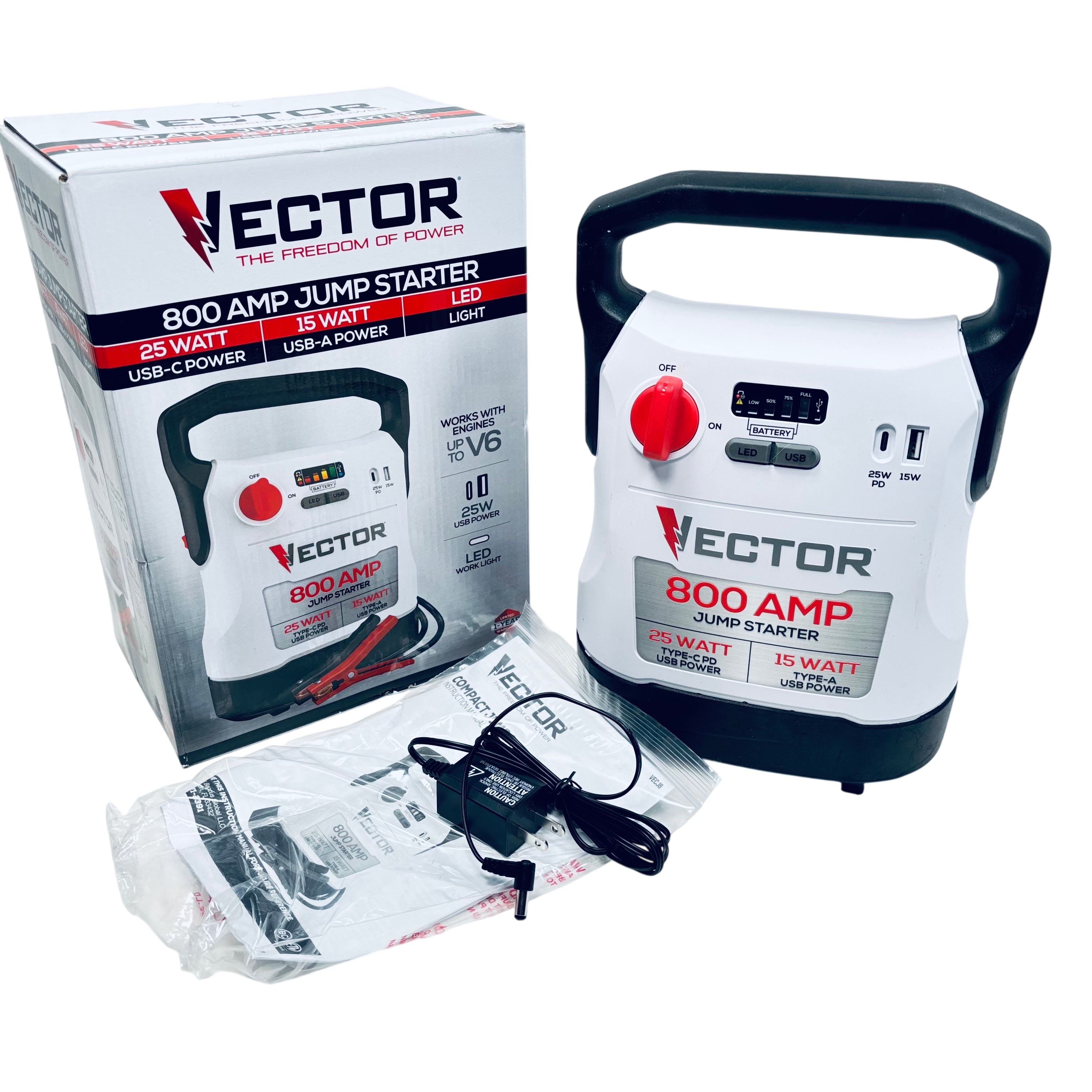 Vector 800 AMP Jump Starter (Model Vecj8) delivers reliable jump-start power for most cars and trucks with engines up to V6. Featuring 25 watt USB-C PD and 15 watt USB-A ports, it also charges your devices on the go. This compact jump starter includes an integrated LED work light and battery level indicator, making it ideal for roadside emergencies. The package contains the jump starter unit, power adapter, and user manual, providing a versatile and portable power solution.