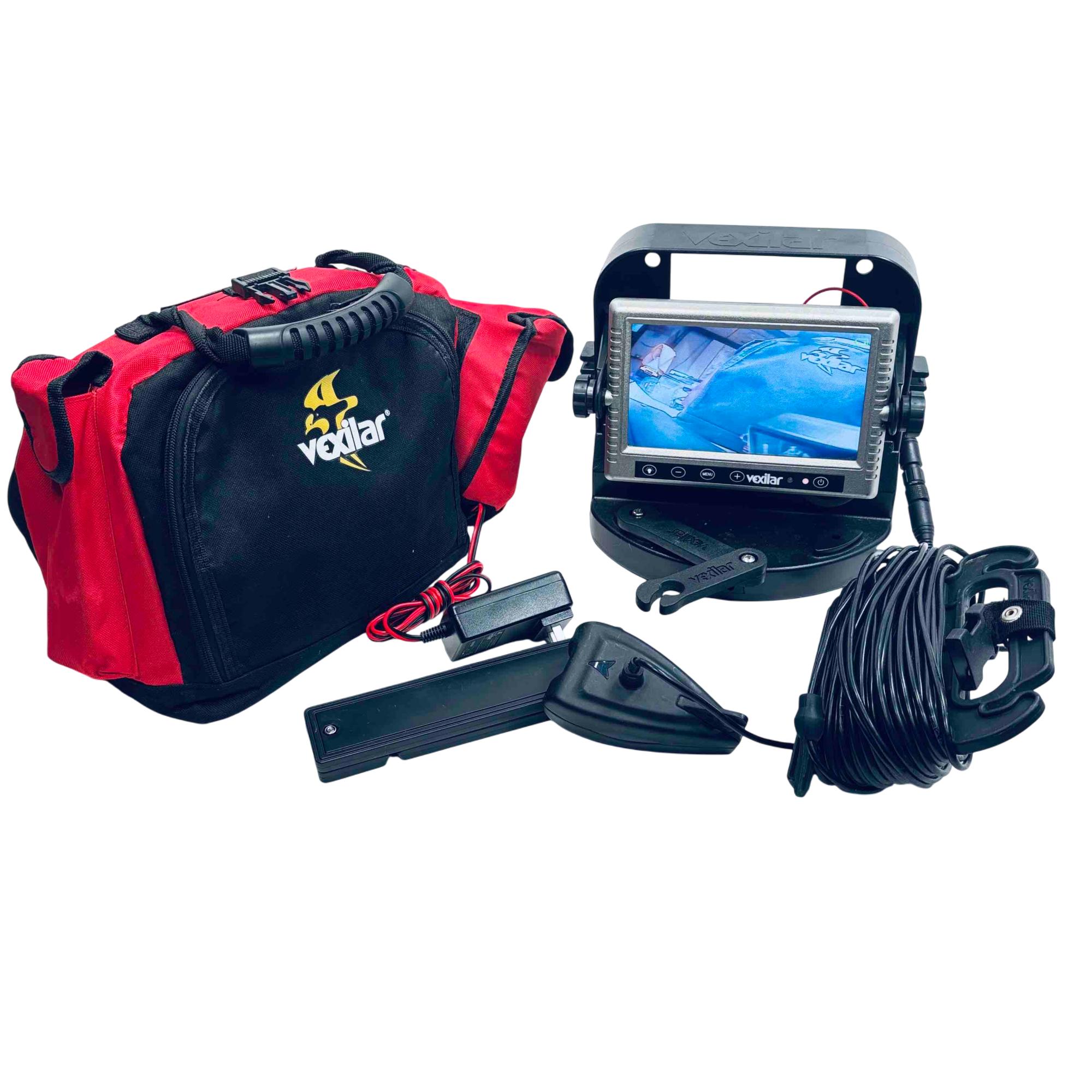 Vexilar Fish Scout FSM100D Underwater Camera Monitor System with Soft Pack features a high-resolution 7-inch display designed for underwater fishing. This electronic device includes a durable soft pack bag, multiple cables, and easy-to-use controls tailored for versatile underwater monitoring. Ideal for anglers seeking a reliable, portable solution with clear visuals for fishing and underwater exploration.