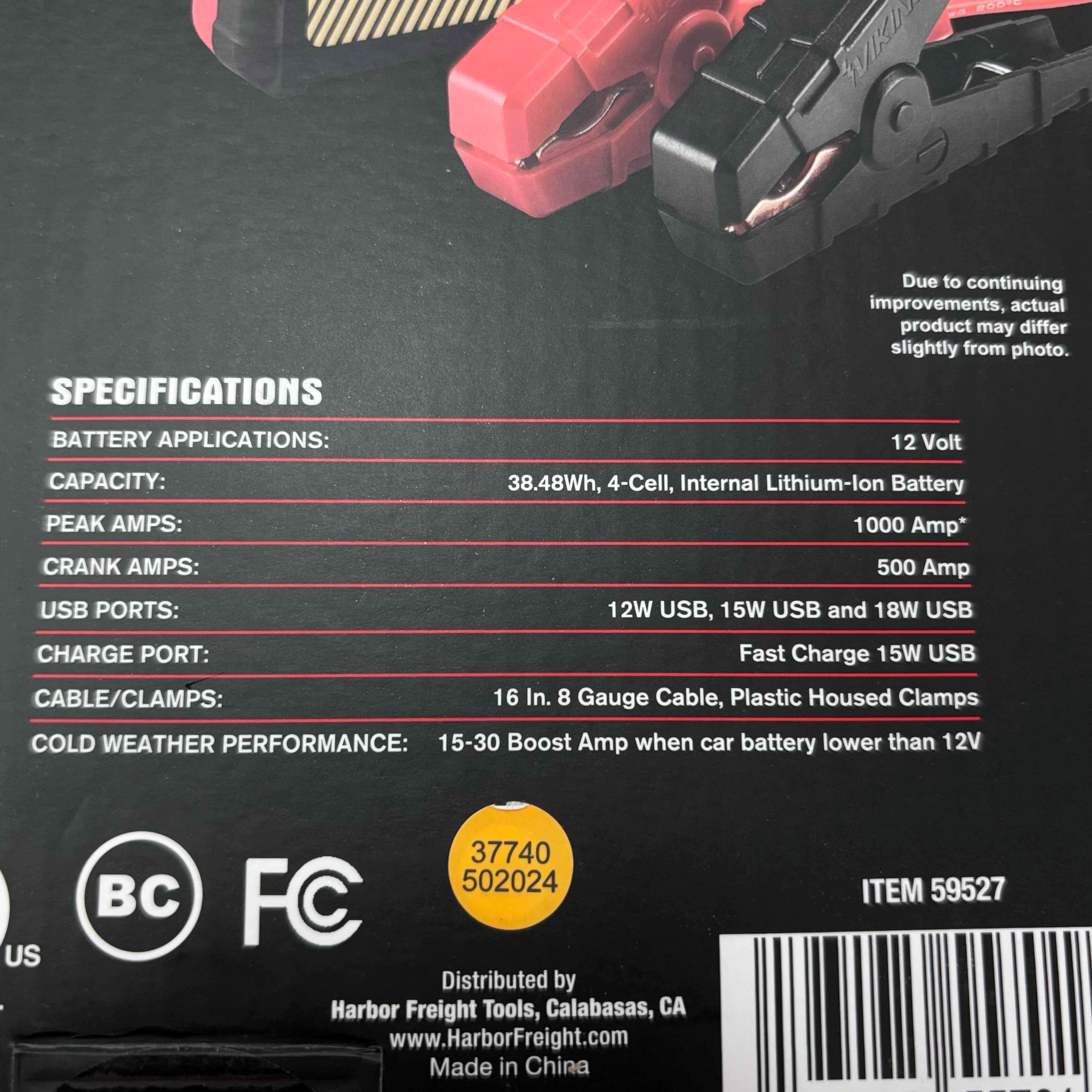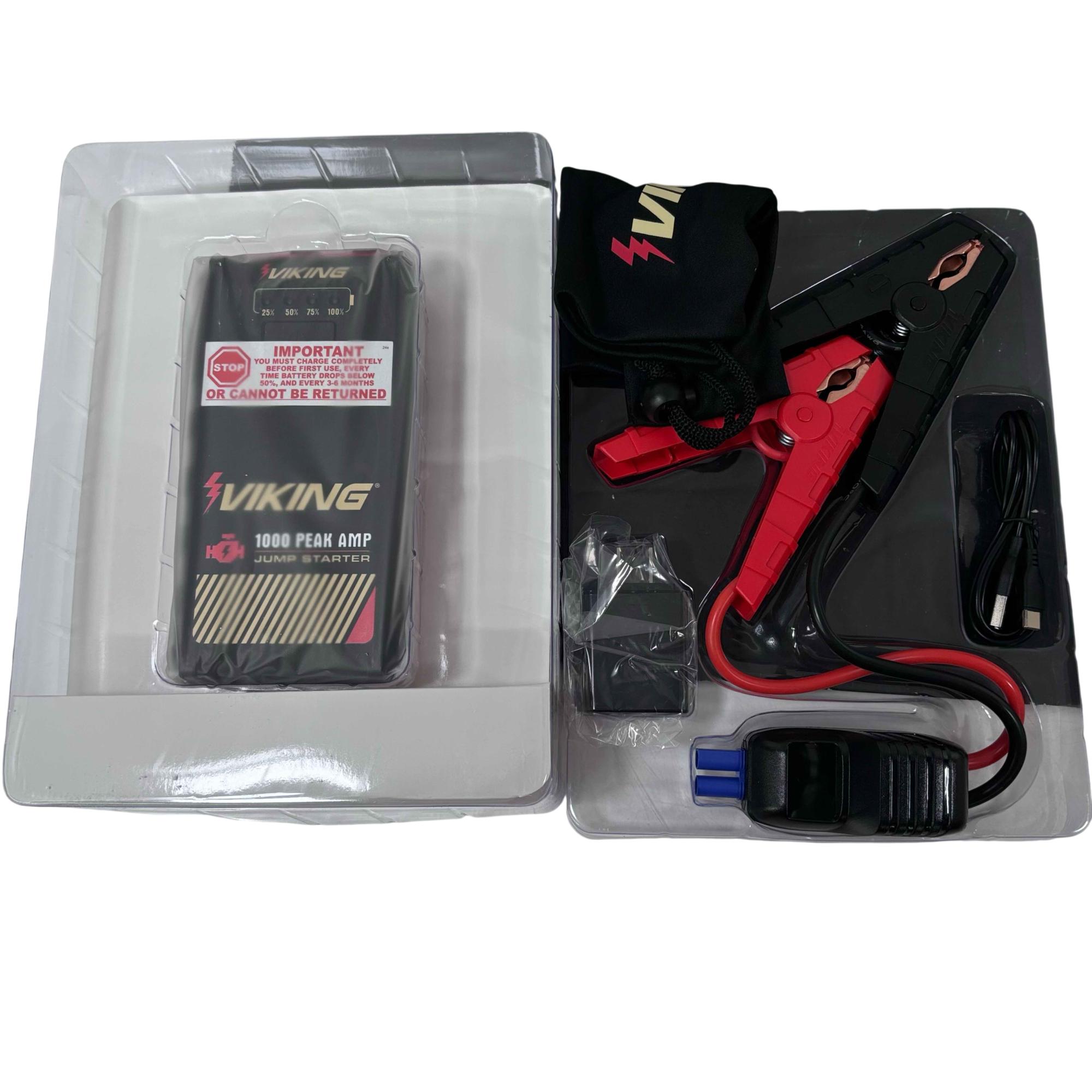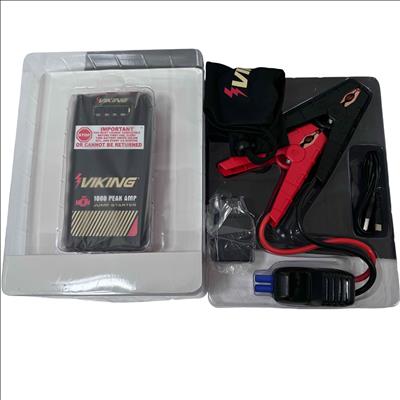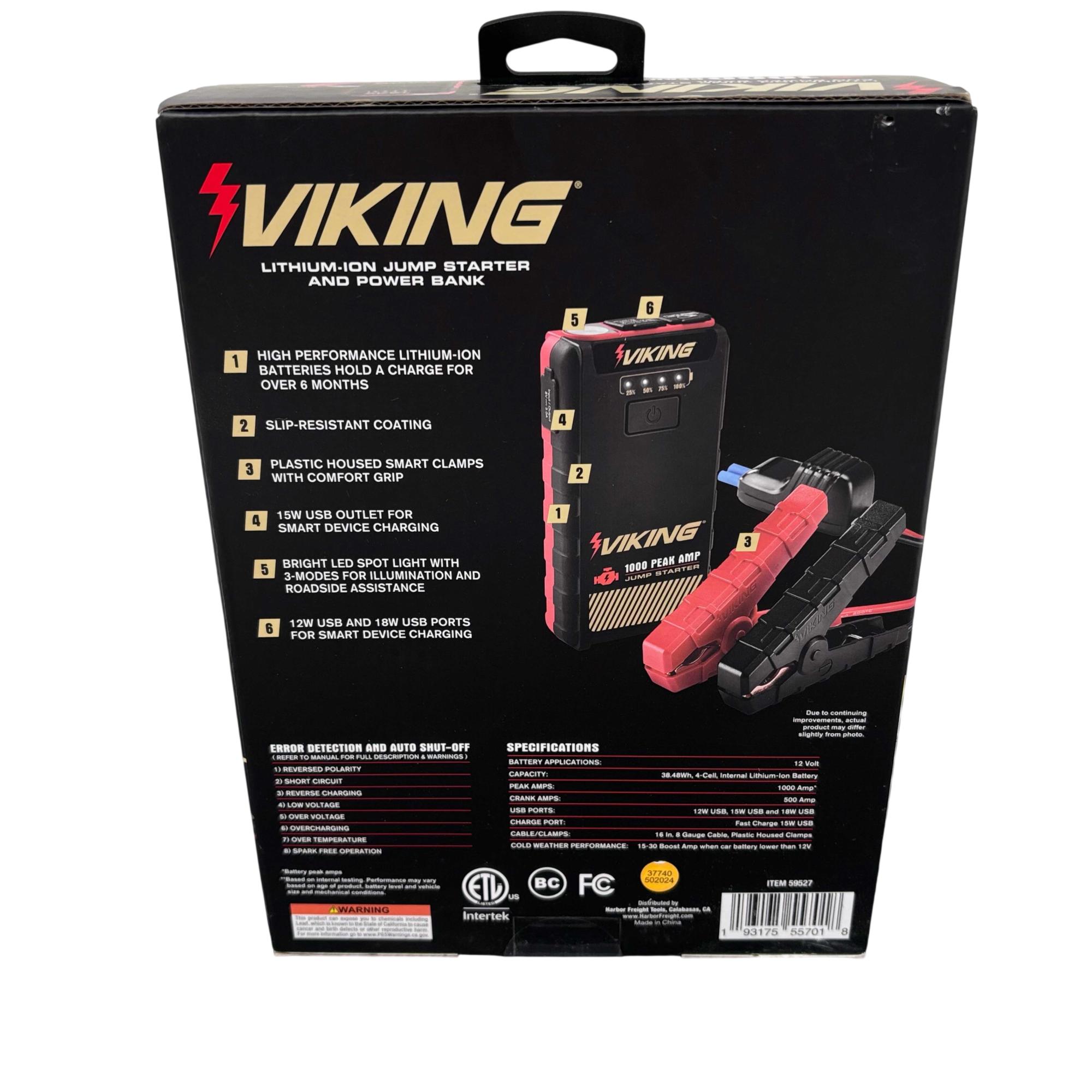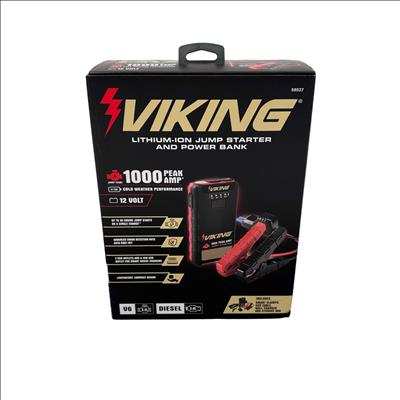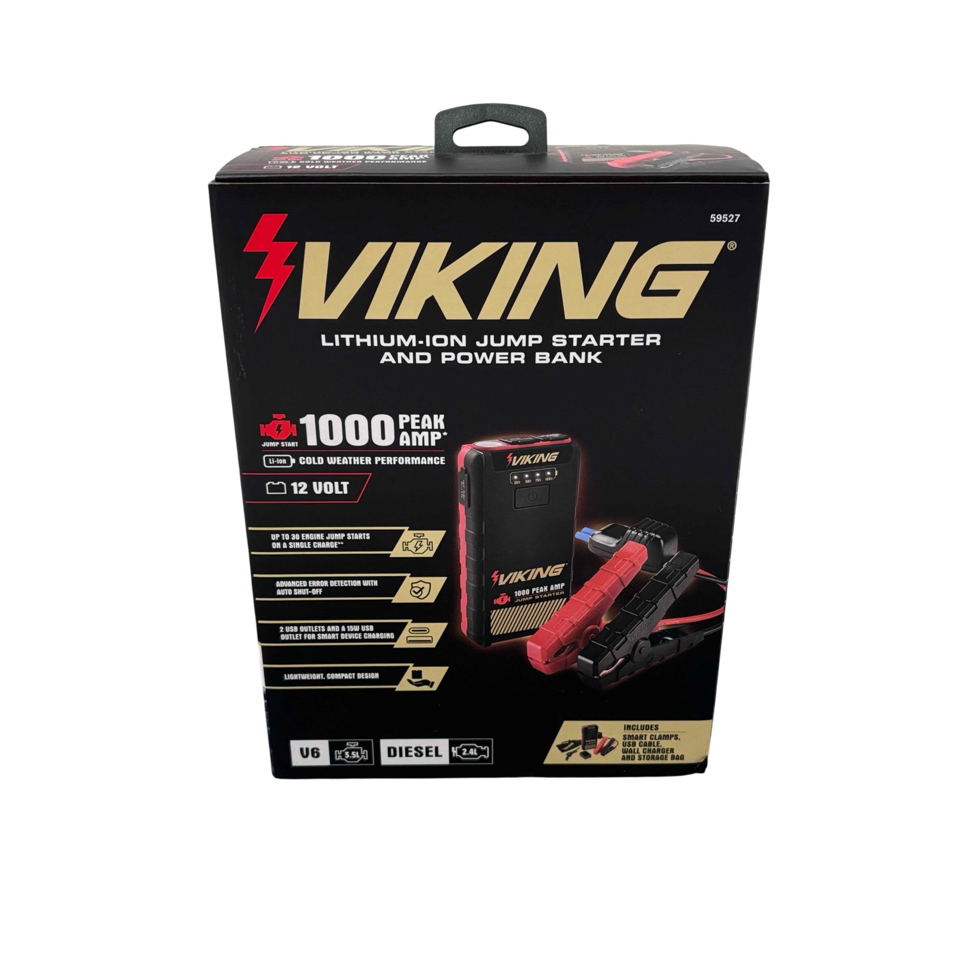 Viking 59527 1000 Peak Amp Lithium-Ion Jump Starter and Power Bank delivers reliable vehicle jump-starting capability with a powerful 1000 peak amp output and 500 crank amps. This compact device features advanced error detection and auto shut-off for safe operation, along with multiple USB ports including a 15W fast charge outlet to power smart devices. Its slip-resistant coating and plastic-housed smart clamps with comfort grip enhance durability and ease of use in roadside emergencies.