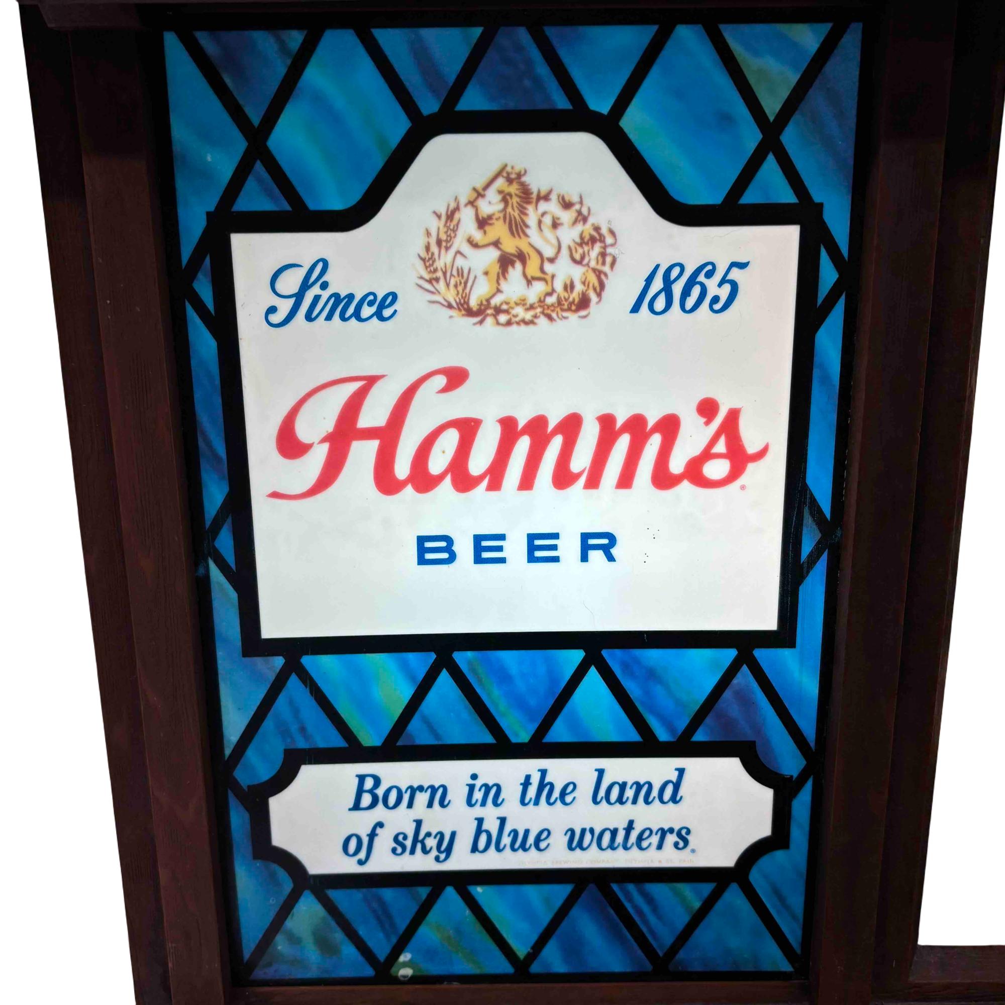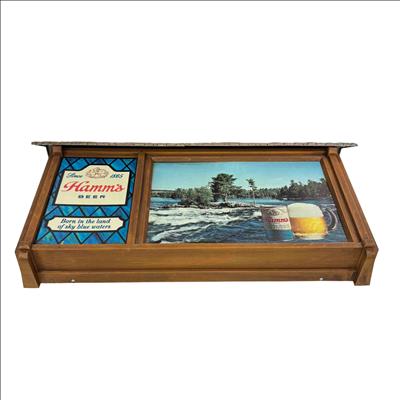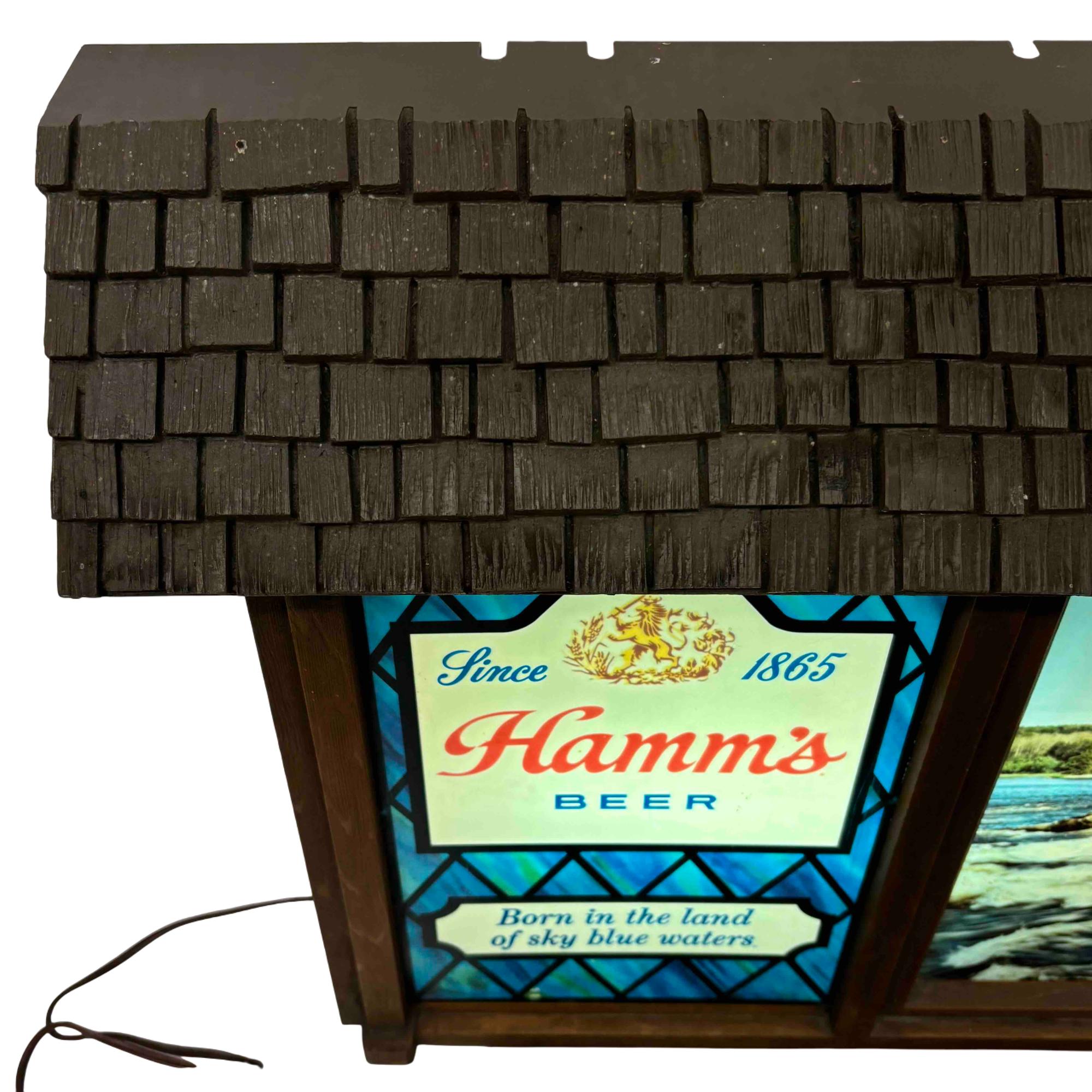 Illuminate your space with this iconic Hamms Beer Lighted Scene-O-Rama sign, featuring the memorable Born in the land of sky blue waters motif. This unique bar sign boasts a charming cabin roof design and showcases Hamm’s branding, picturesque river scenery, and classic beer imagery, making it a standout piece for any home bar, man cave, or collector. A must-have for breweriana enthusiasts or anyone looking to add retro flair and nostalgic ambiance to their décor.