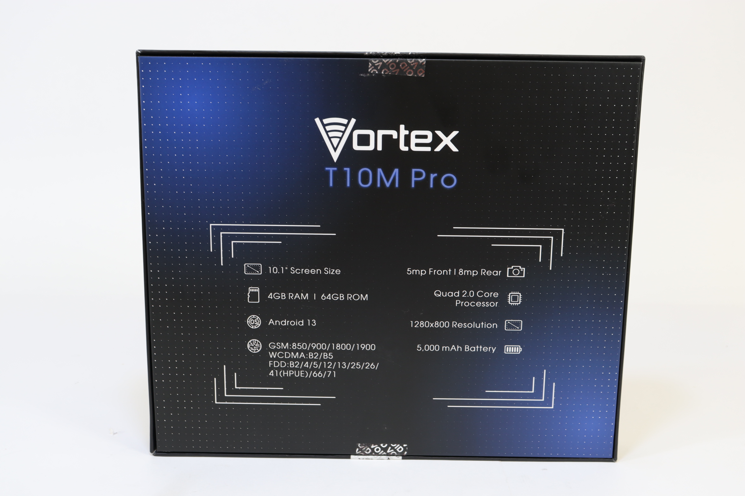 Vortex T10M Pro has a 10.1" screen 4GB RAM and 64GB storage. It operates on Android 13 and is 4G LTE/WiFi enabled. It has a 5mp front and 8mp rear camera. Quad Core 2.0 processor with 1280 x 800 LED resolution.