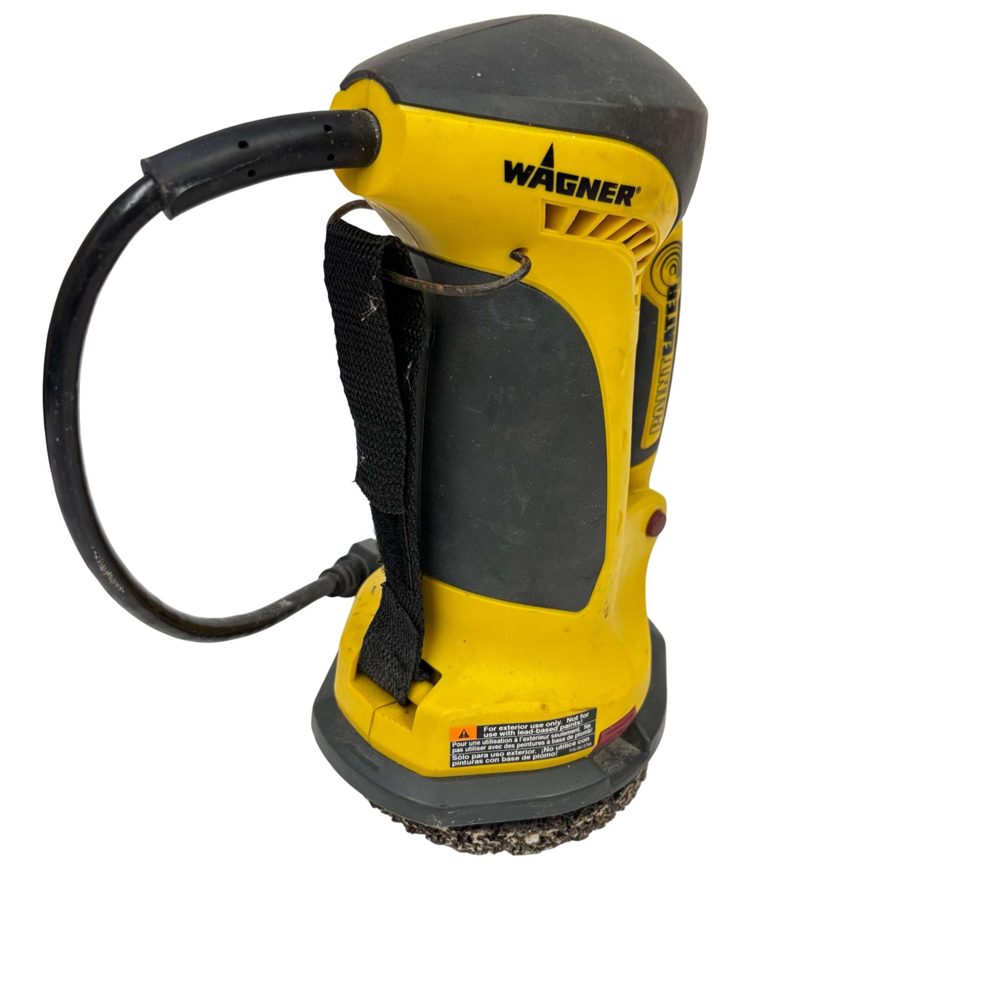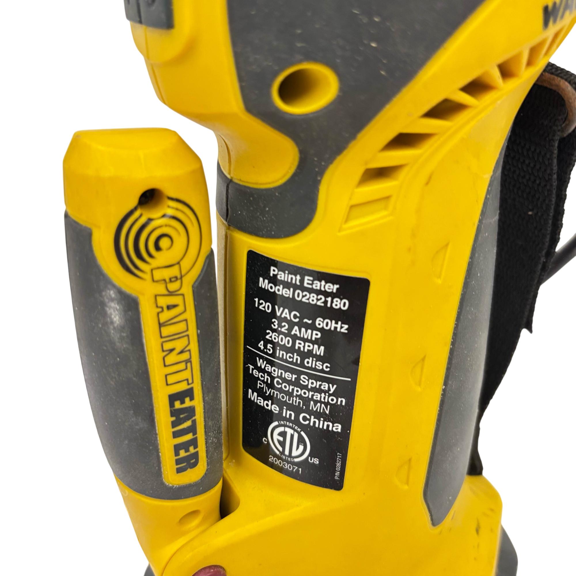 The Wagner PaintEATER Model 0282180 4-1/2 Inch Disc Surface Paint Remover is a powerful electric tool designed for efficient removal of paint and coatings. It operates at 120 VAC and 3.2 amps with a 2600 RPM motor, featuring a 4.5 inch disc for precise surface preparation on various materials. This robust paint remover is suited for professional and DIY applications requiring effective and controlled paint stripping.