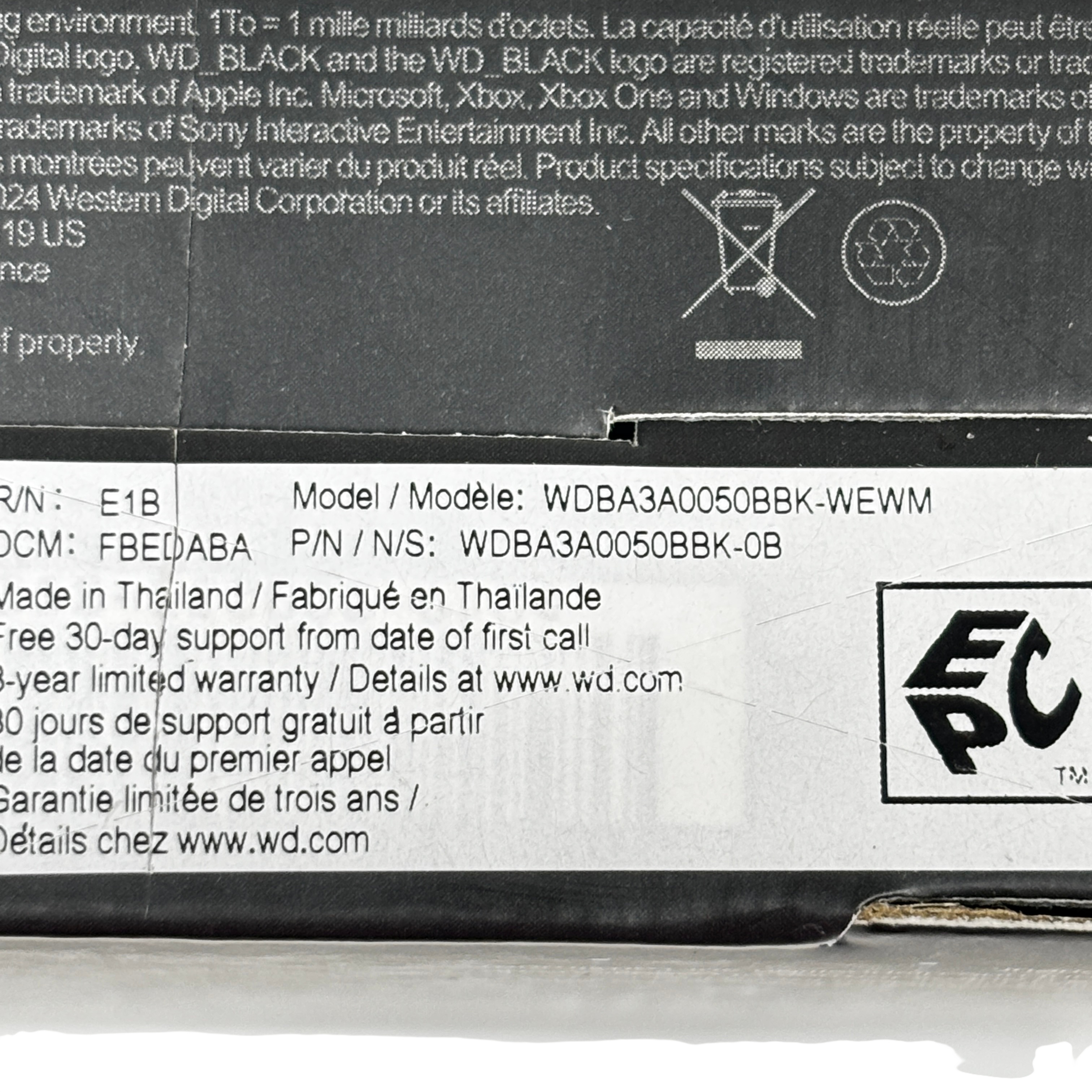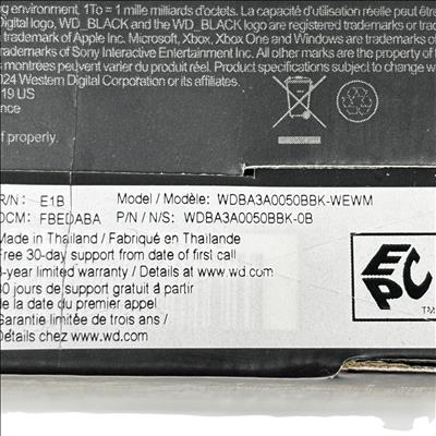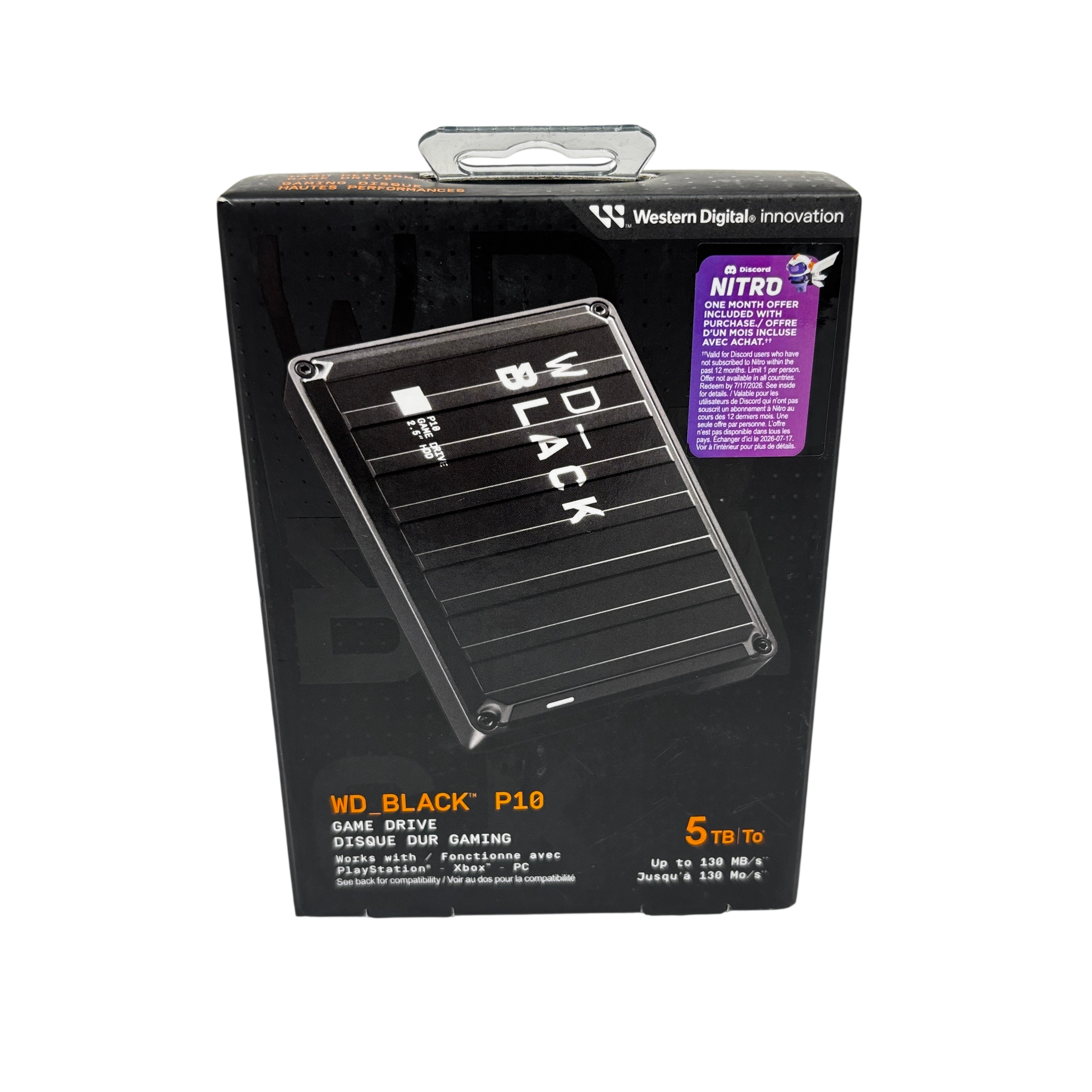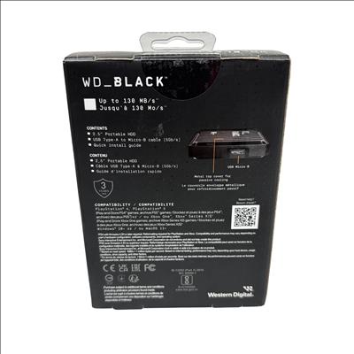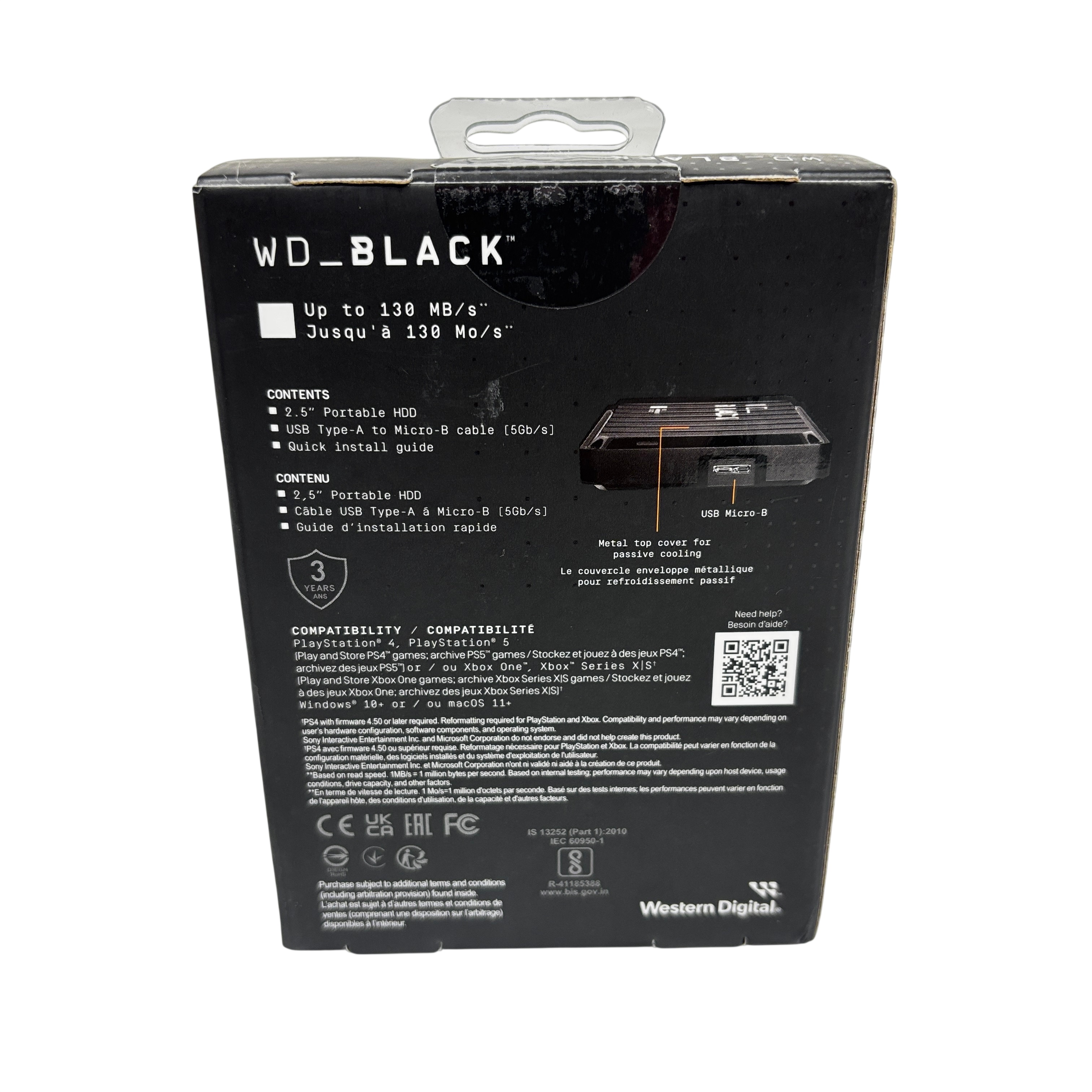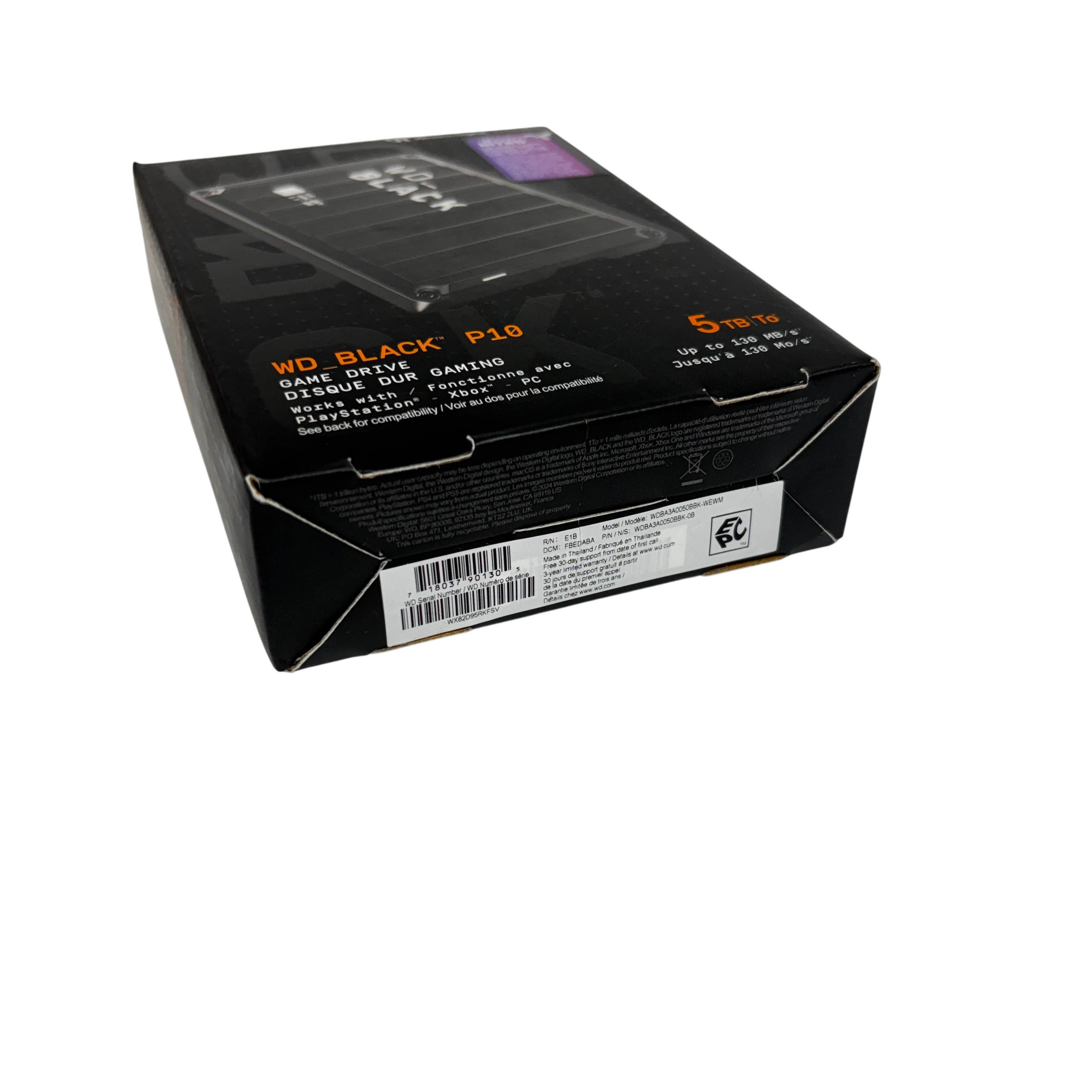 This Western Digital WD_BLACK P10 Game Drive 5TB Portable External Hard Drive offers high-performance storage with up to 130 MB/s transfer speeds. This 2.5-inch portable HDD is designed for gamers and works seamlessly with PlayStation 4, PlayStation 5, Xbox One, Xbox Series X|S, Windows 10+, and macOS 11+. The drive features a durable metal top cover for passive cooling and includes a USB Type-A to Micro-B cable and quick install guide. Its compact size and large capacity make it ideal for expanding game libraries and storing large media files on the go.
