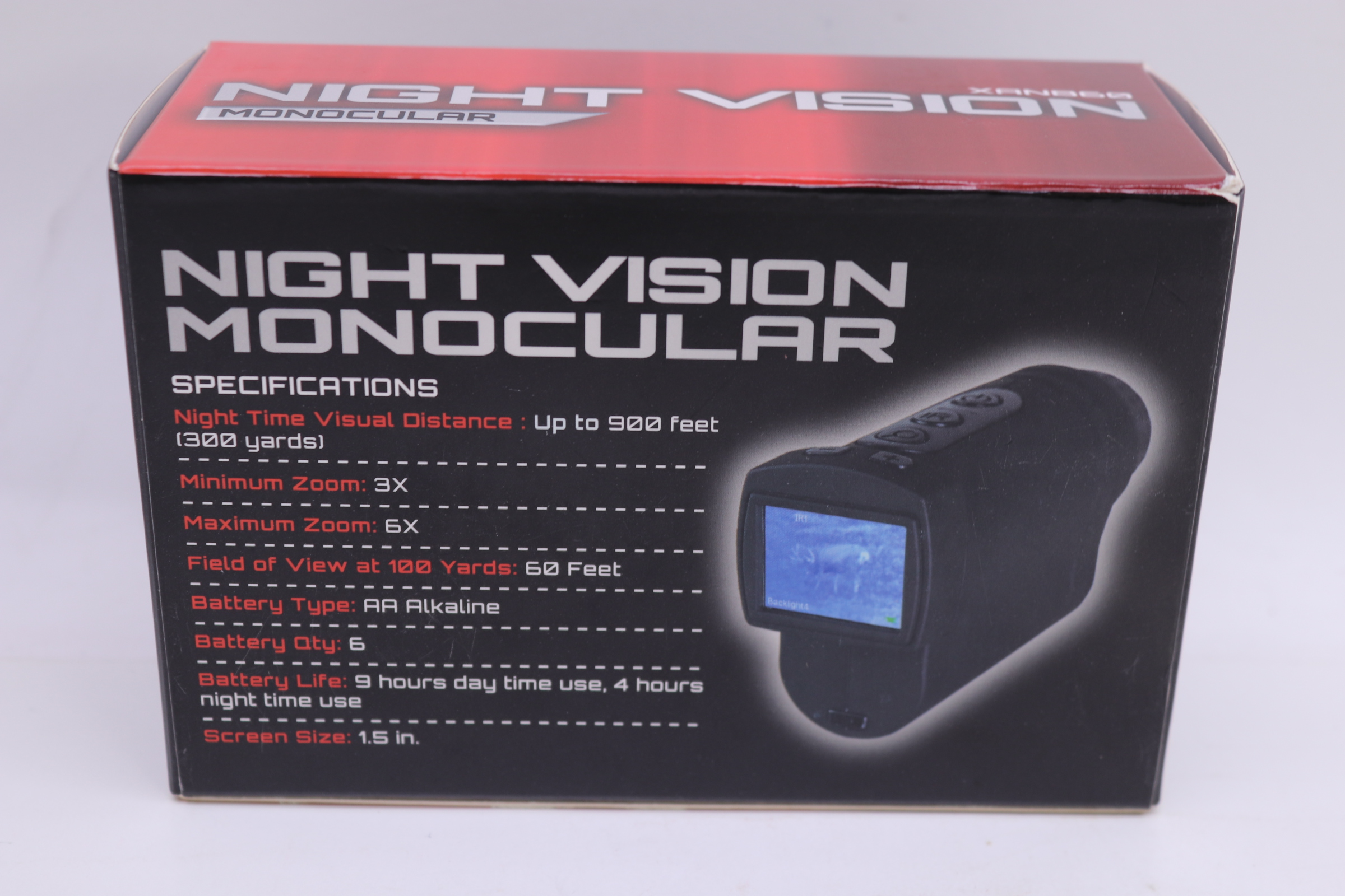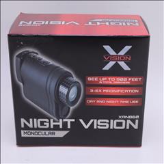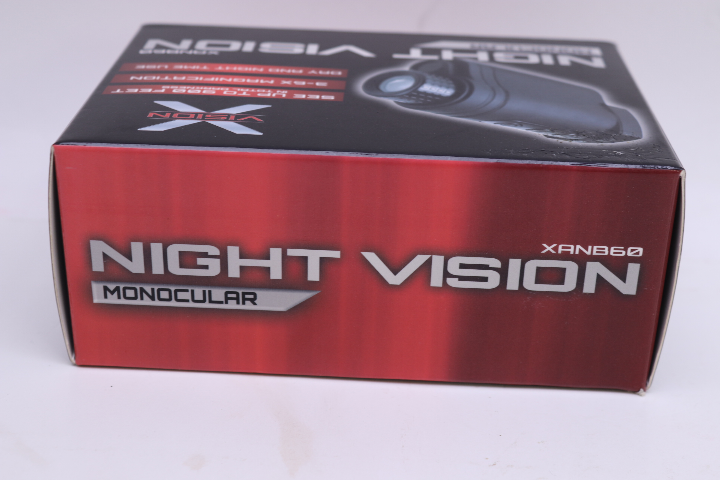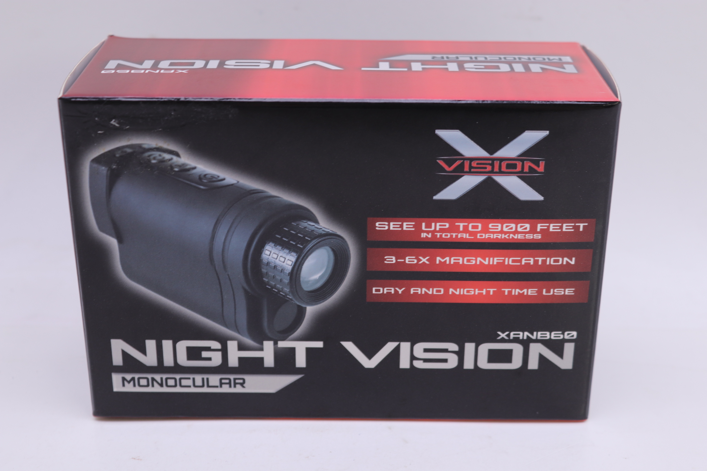 The all new Night Vision Monocular by X-Vision is the pocket-sized answer for every hunter. With a 200-yard distance in total darkness and 400-yard distance in the daytime, the XANB60 outperforms others twice its size! Perfect for Hunting, Camping, Sports Watching, etc. Pocket Size; Easy to Carry Electronic View Finder.