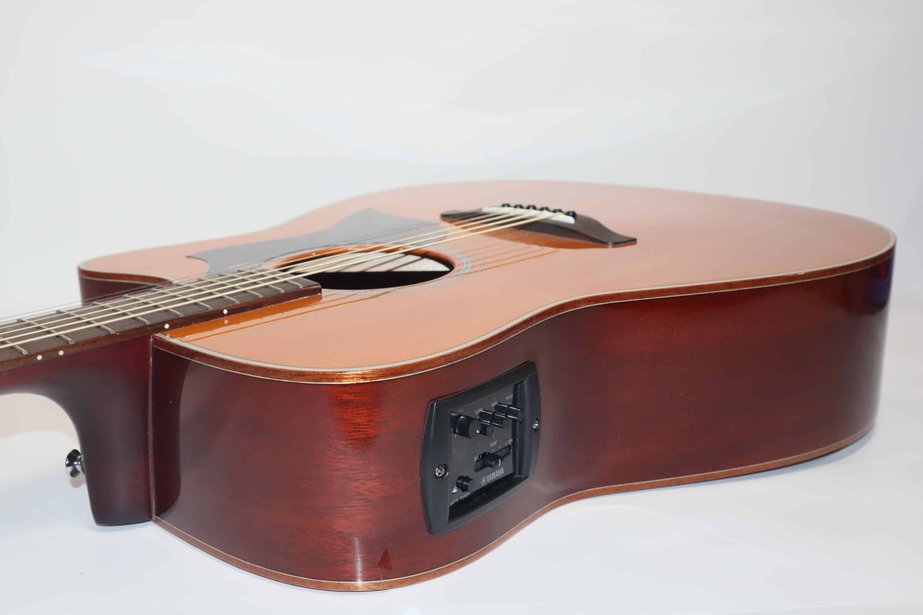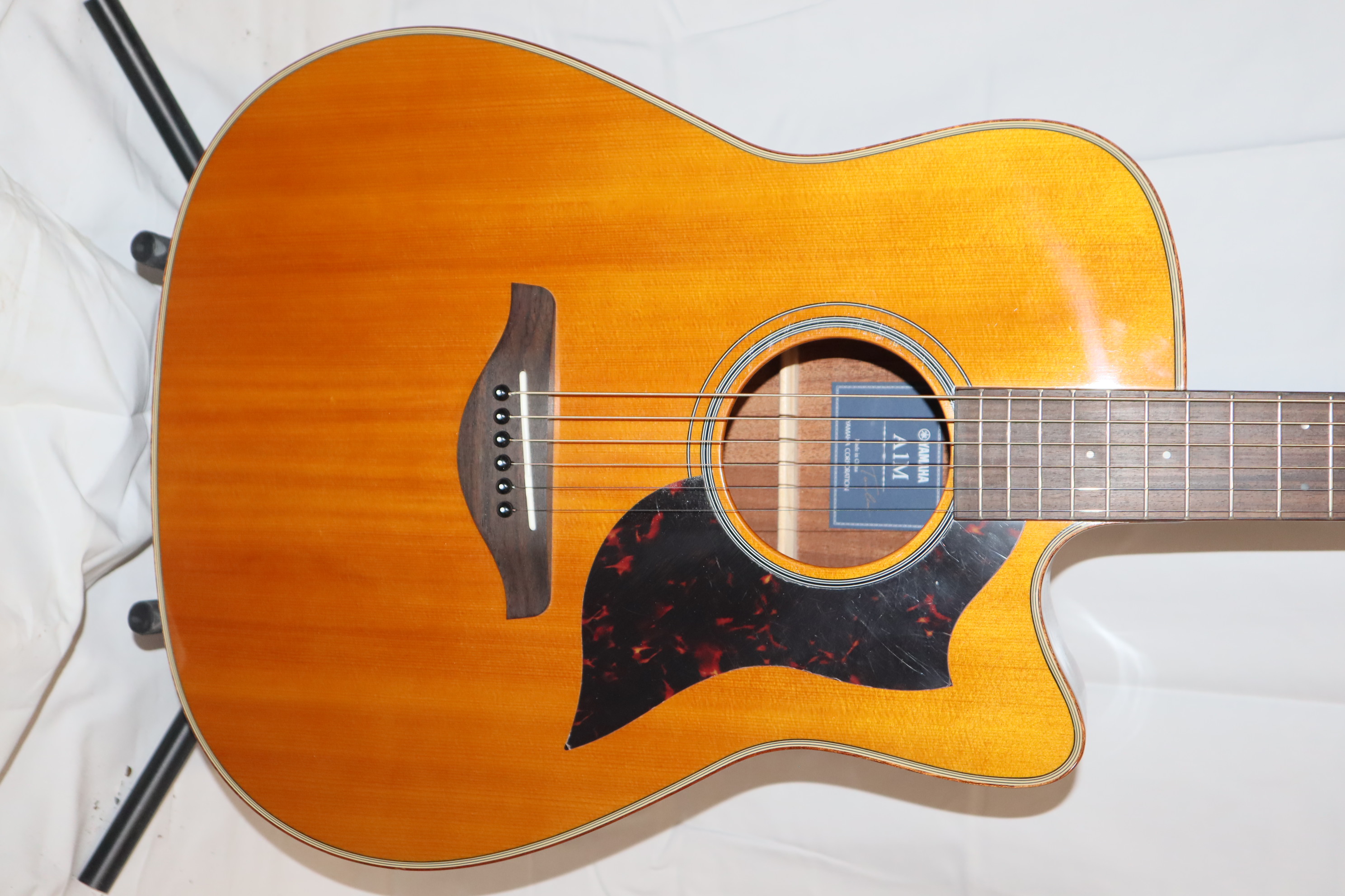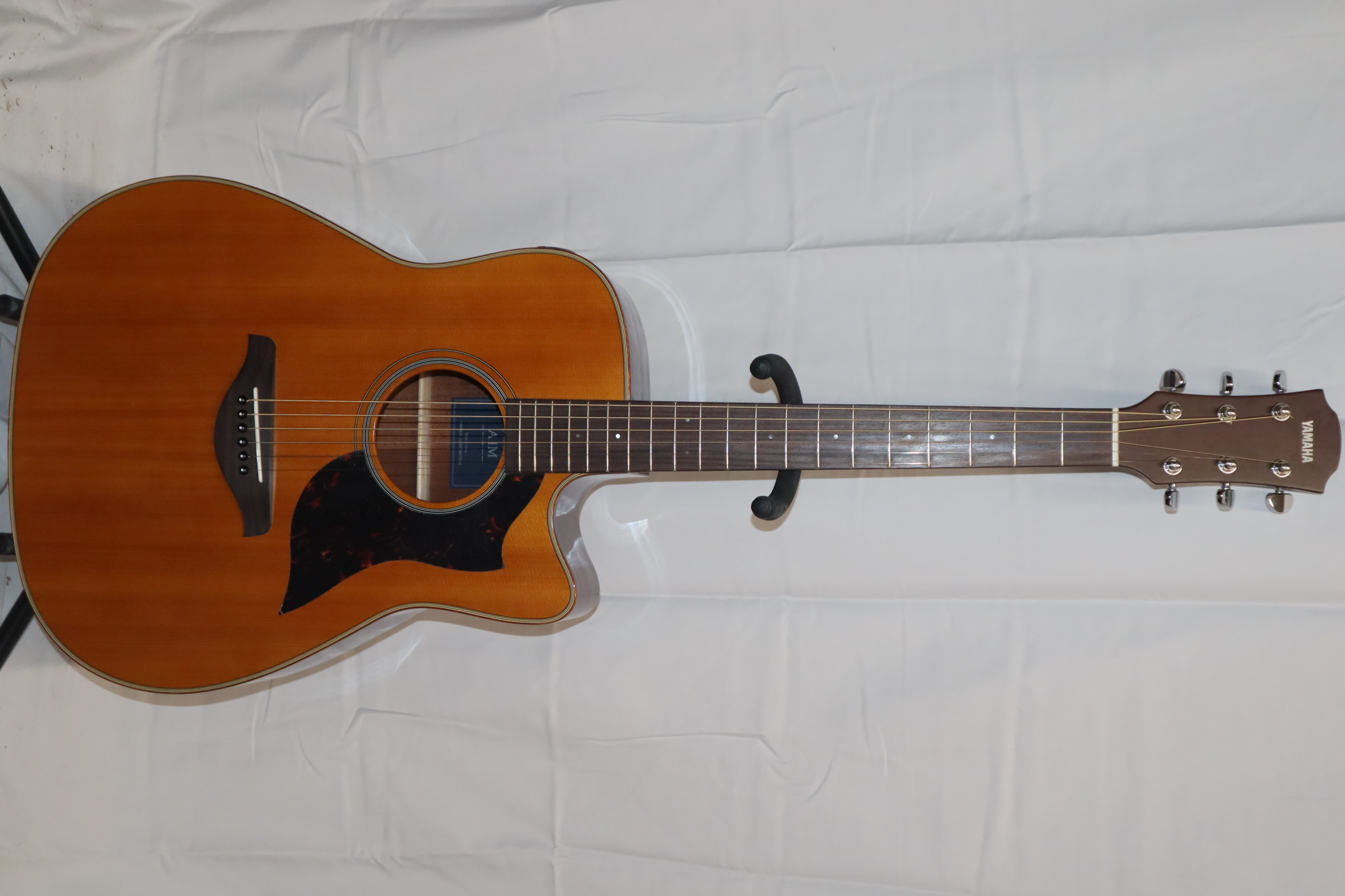 In the Yamaha A1M Dreadnought acoustic-electric guitar, Yamaha offers a vintage look, excellent volume in the low-mid ranges, and great playability. With a solid Sitka spruce top and mahogany back and sides, this guitar sounds fantastic. The Yamaha A1M Dreadnought takes full advantage of Yamaha's acclaimed SRT pickup for recording and stage performance. With its traditional System 66 preamp, you get volume, a built-in tuner, a 3-band EQ, and automatic midrange frequency control with a convenient slider.