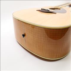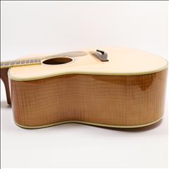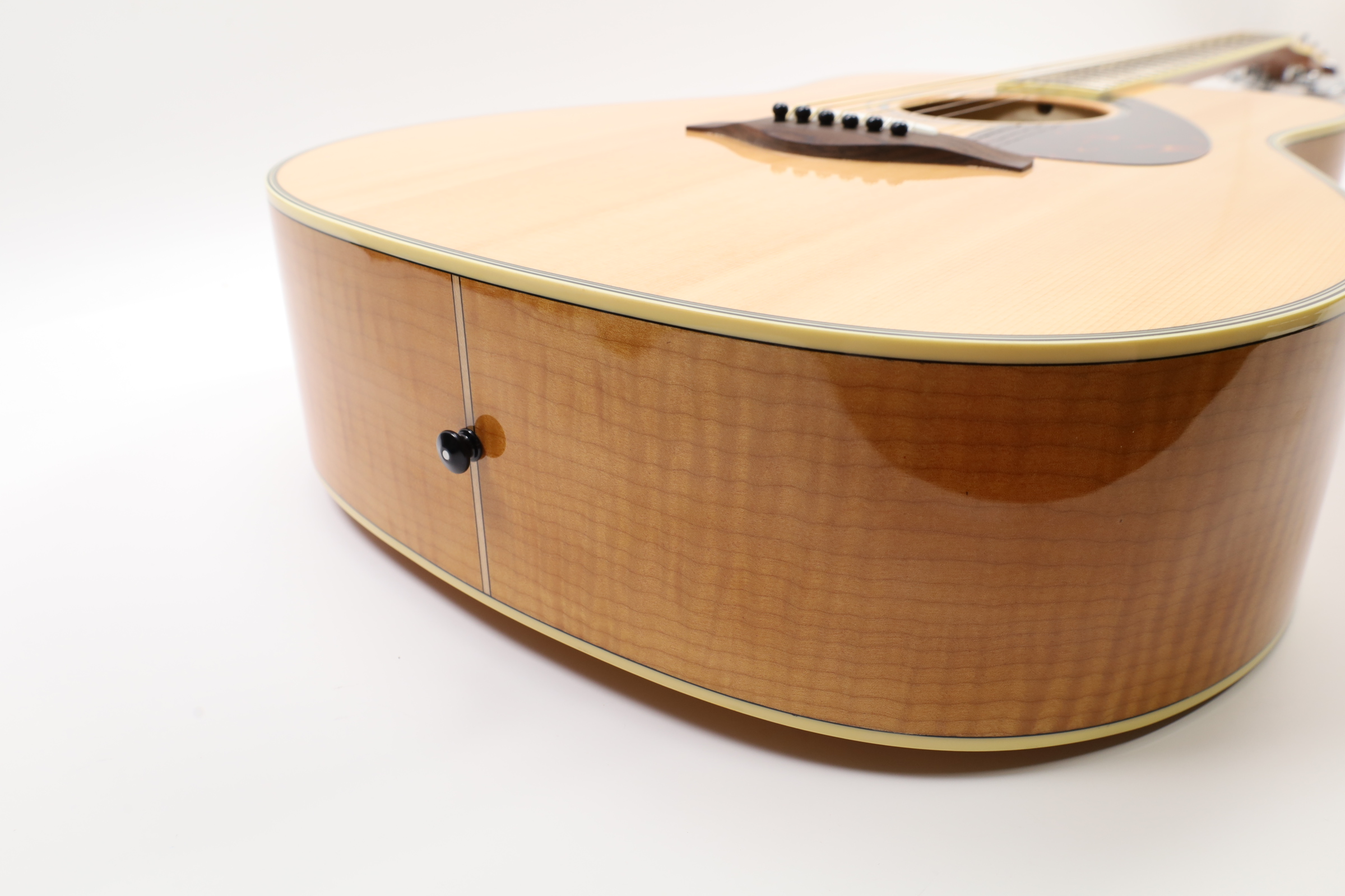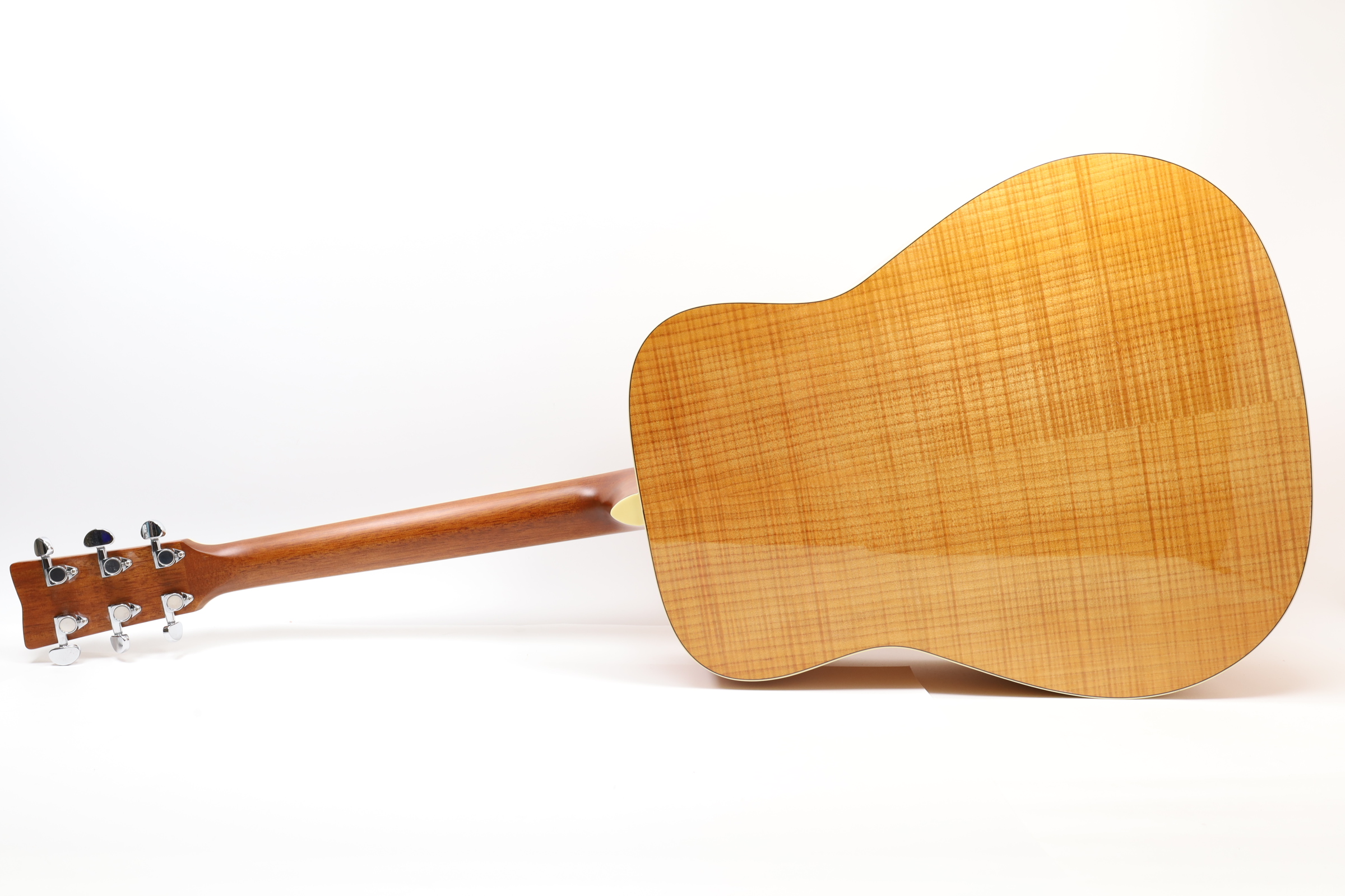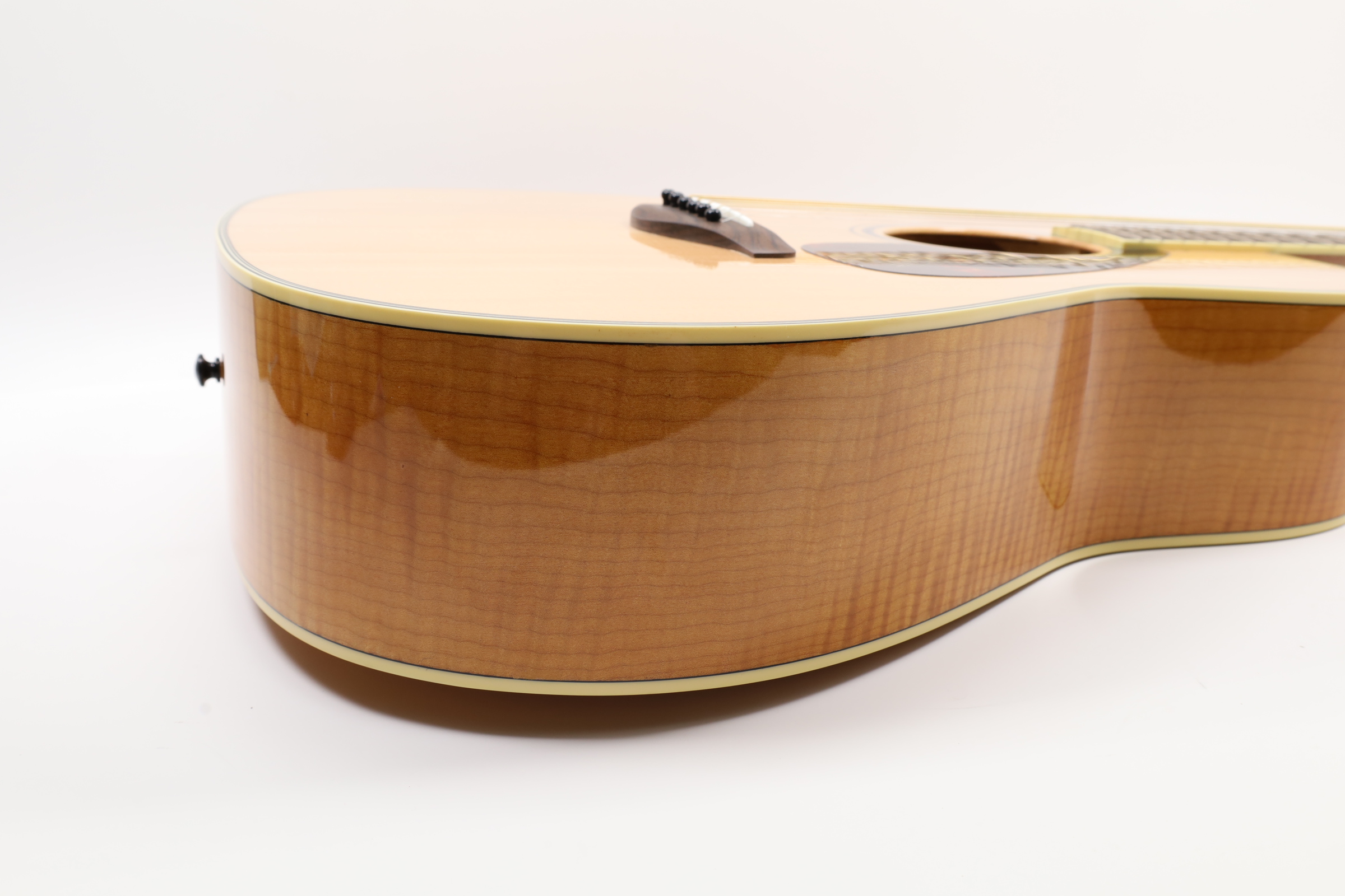 Features a traditional Western body with flamed maple back and sides, providing a distinctive and high-end appearance. The solid spruce top offers reliable and well-balanced projection, ensuring each note in a chord rings clear. The guitar includes an abalone with black and white inlaid double rosette, tortoise pattern pickguard, cream body binding, die-cast chrome tuners, and black ABS bridge pins with white dots. It has a non-cutaway dreadnought body, scalloped bracing, and a gloss body finish. The rosewood fingerboard and bridge, nato neck with a matte finish, and 20 frets complete its classic design.