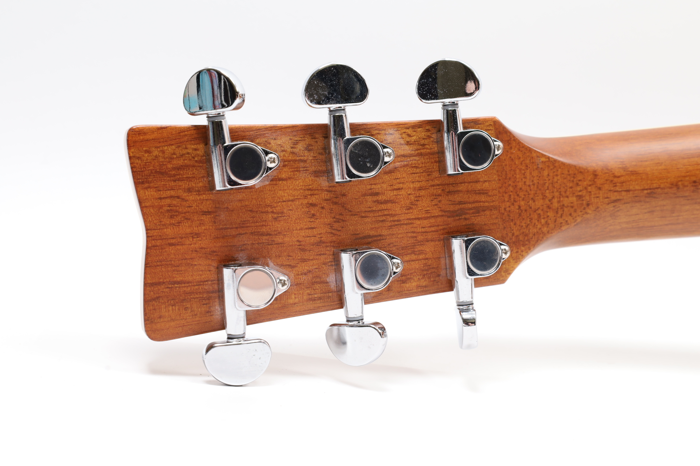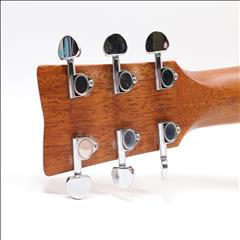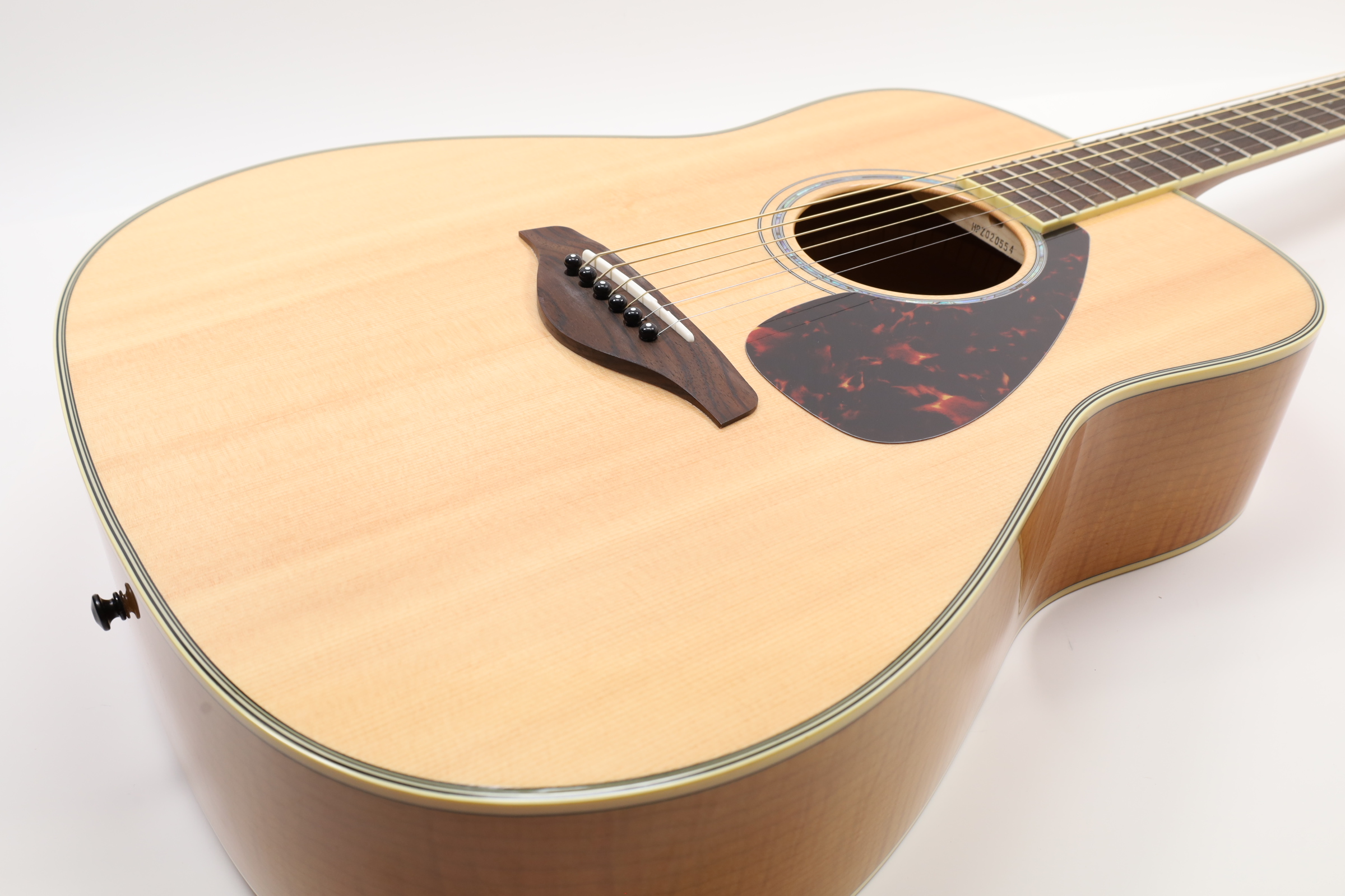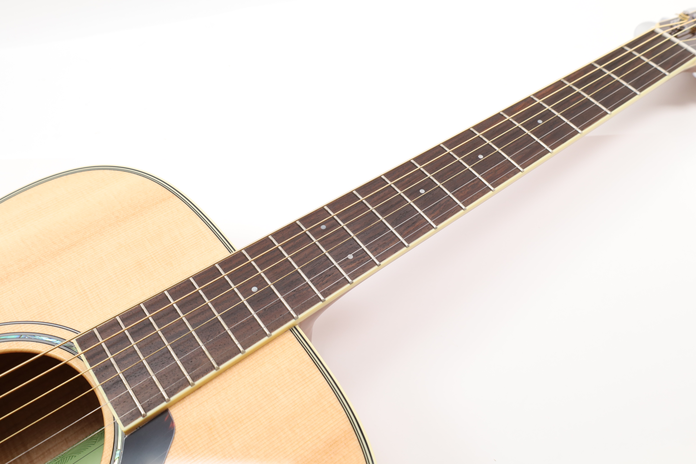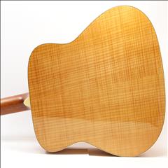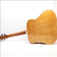 Features a traditional Western body with flamed maple back and sides, providing a distinctive and high-end appearance. The solid spruce top offers reliable and well-balanced projection, ensuring each note in a chord rings clear. The guitar includes an abalone with black and white inlaid double rosette, tortoise pattern pickguard, cream body binding, die-cast chrome tuners, and black ABS bridge pins with white dots. It has a non-cutaway dreadnought body, scalloped bracing, and a gloss body finish. The rosewood fingerboard and bridge, nato neck with a matte finish, and 20 frets complete its classic design.