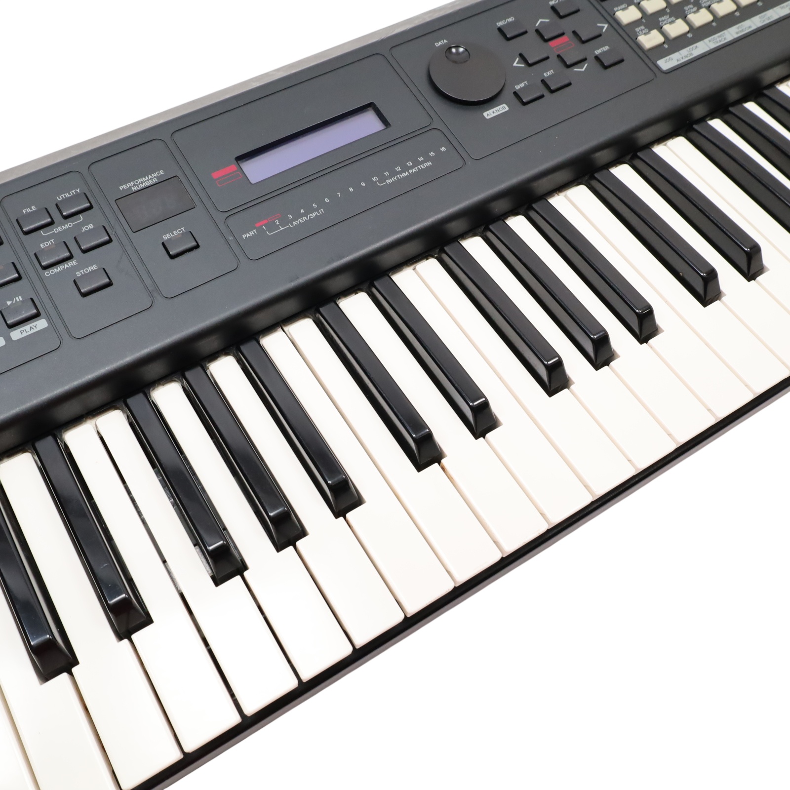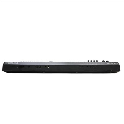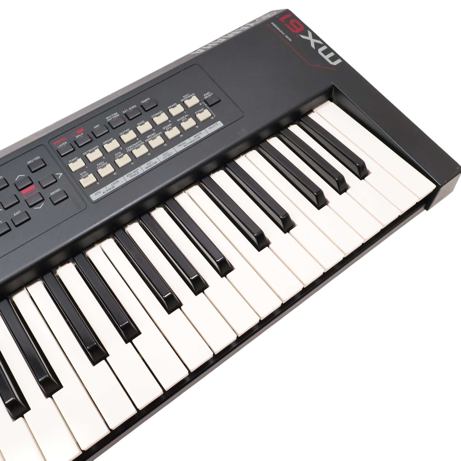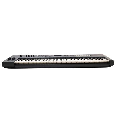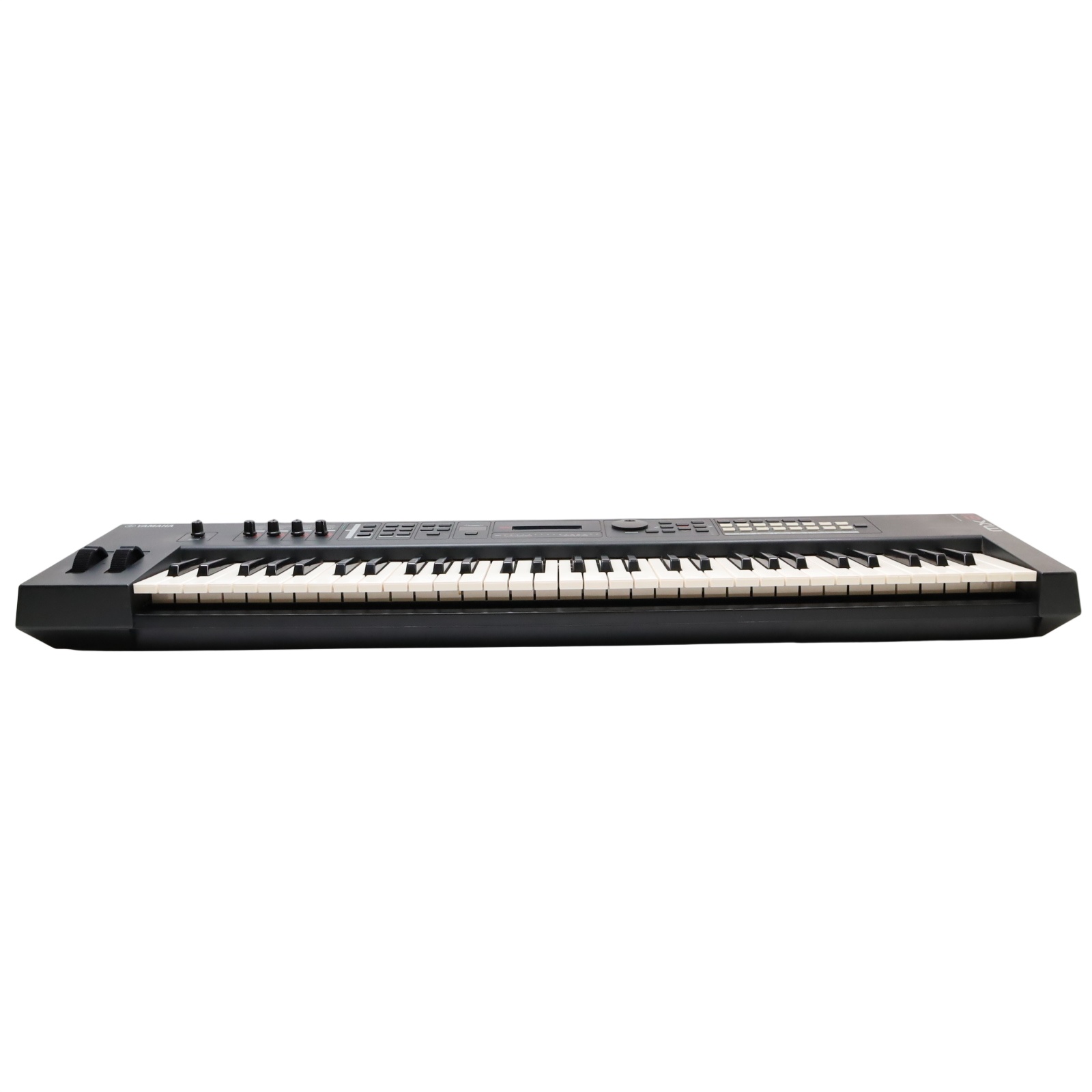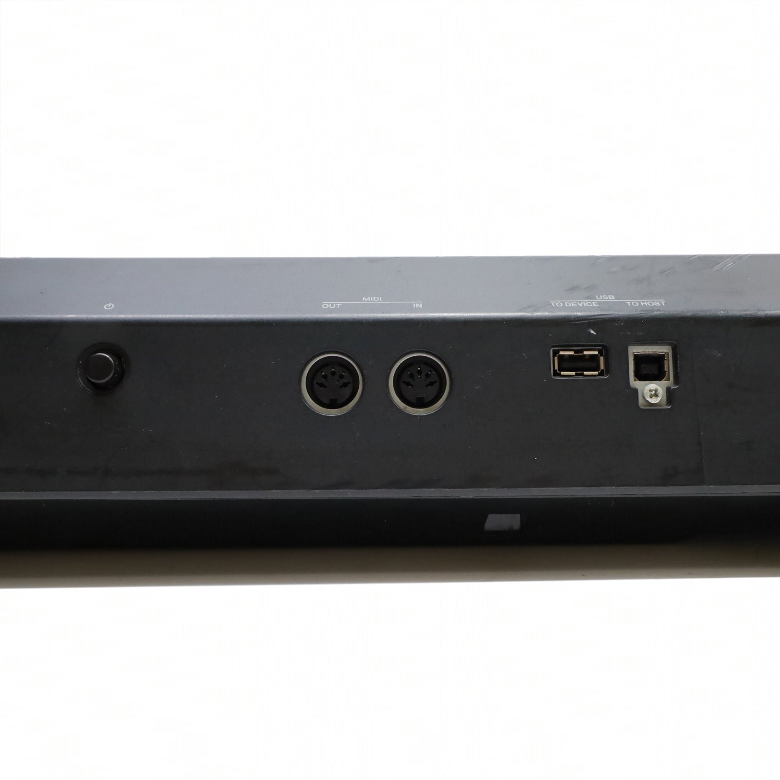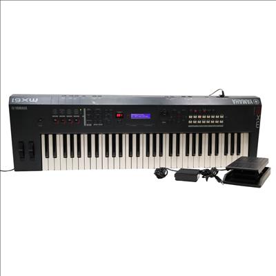 A 61-key music production keyboard synthesizer equipped with full-size velocity-sensitive keys. It features a MOTIF sound engine including over 1,000 presets, ranging from acoustic pianos and EPs to strings, drums, and synth textures. The unit supports 16-part multitimbral operation with 128-note polyphony. Connectivity options include a class-compliant USB audio and MIDI interface, a USB-to-device port for flash drive storage, and a 1/8-inch aux line input. The control surface includes knobs and buttons for adjusting internal sounds and DAW parameters. It incorporates VCM technology and Damper Resonance DSP for sound processing.