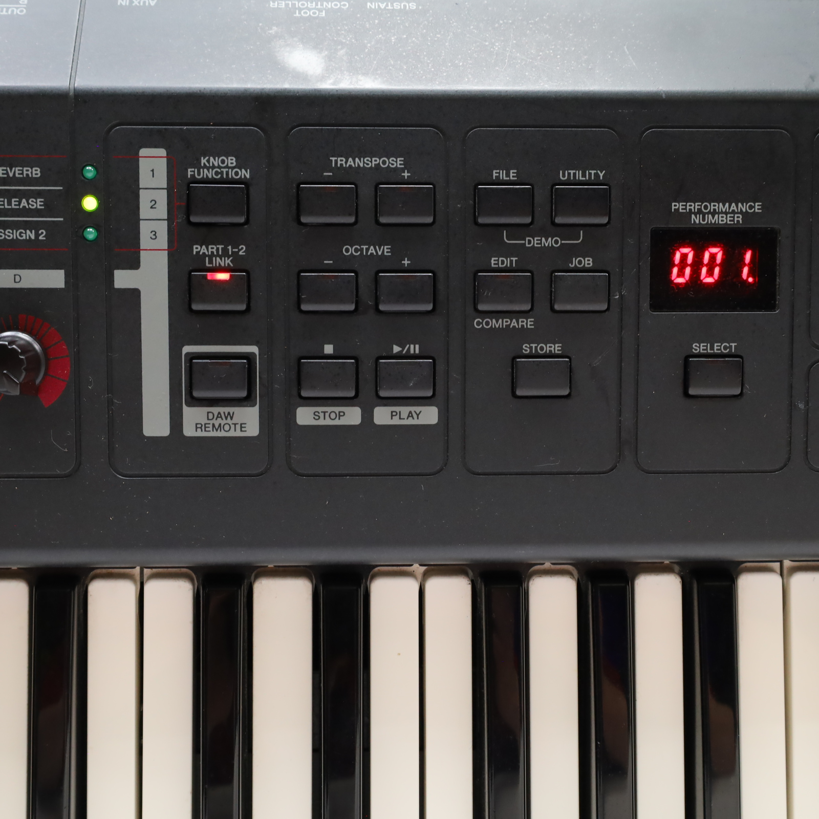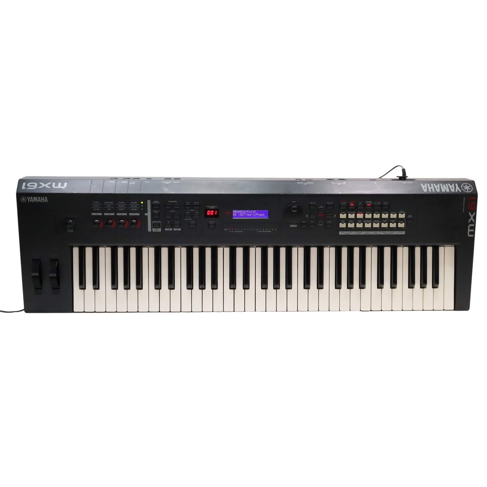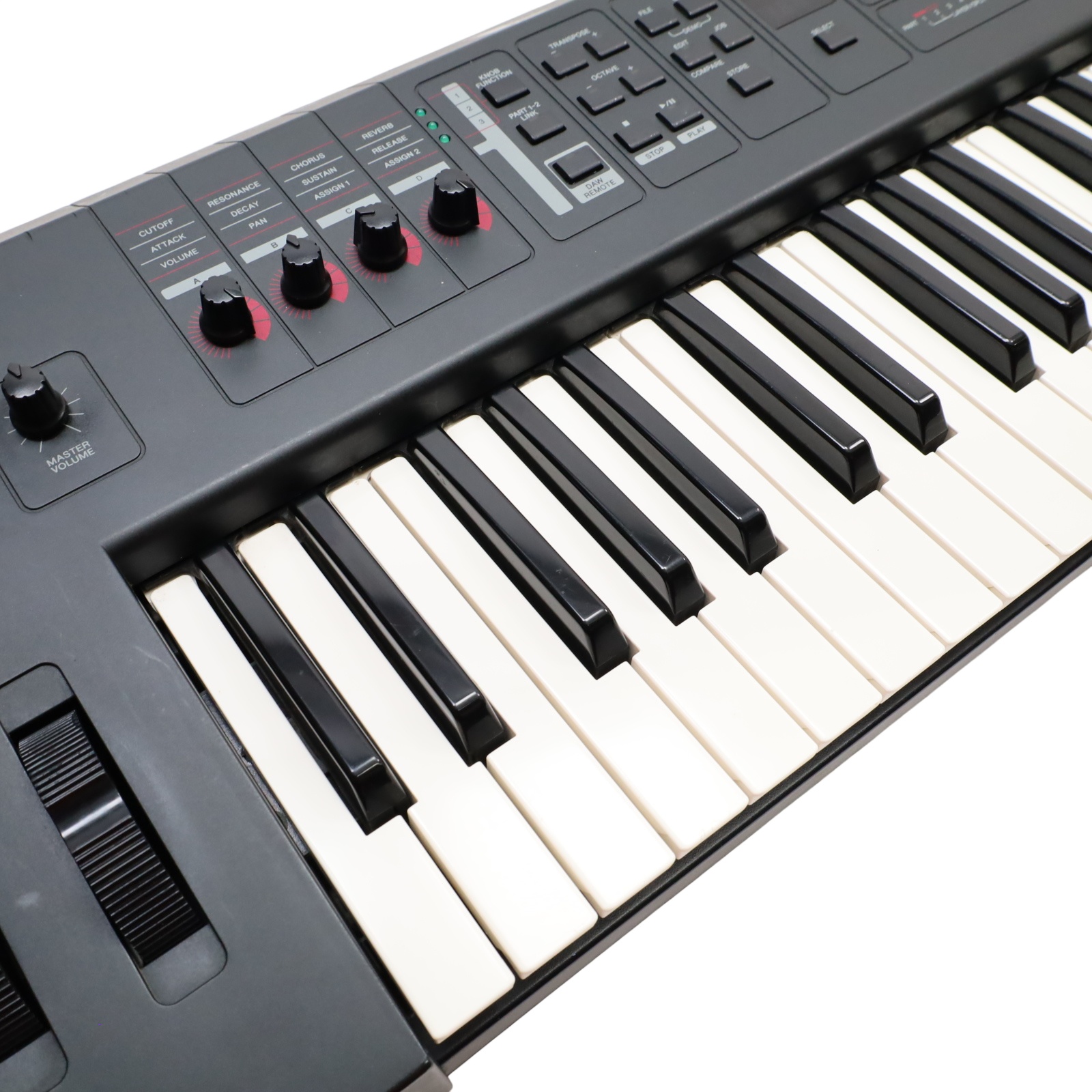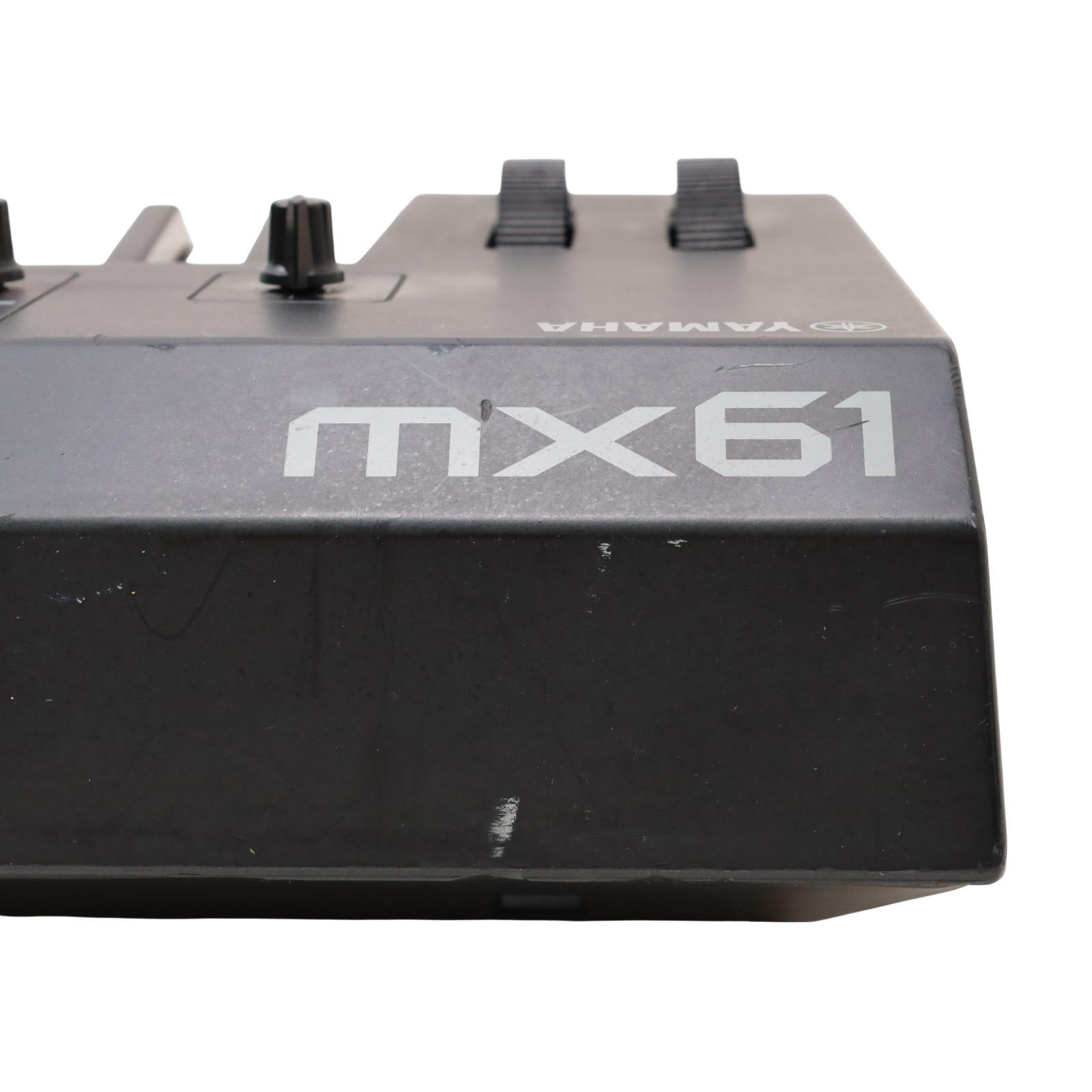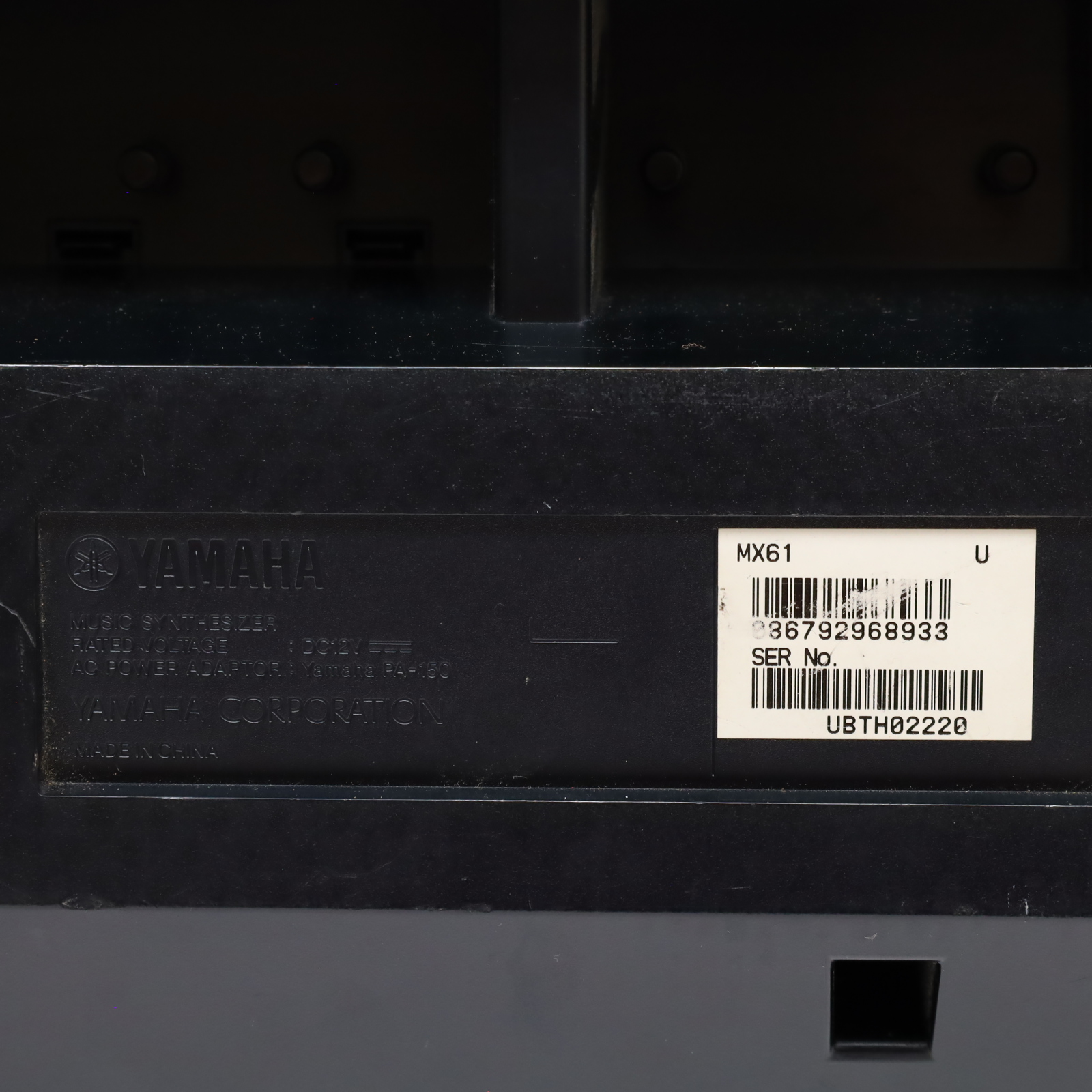 A 61-key music production keyboard synthesizer equipped with full-size velocity-sensitive keys. It features a MOTIF sound engine including over 1,000 presets, ranging from acoustic pianos and EPs to strings, drums, and synth textures. The unit supports 16-part multitimbral operation with 128-note polyphony. Connectivity options include a class-compliant USB audio and MIDI interface, a USB-to-device port for flash drive storage, and a 1/8-inch aux line input. The control surface includes knobs and buttons for adjusting internal sounds and DAW parameters. It incorporates VCM technology and Damper Resonance DSP for sound processing.