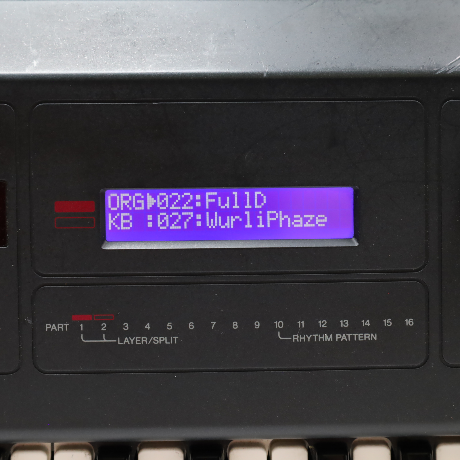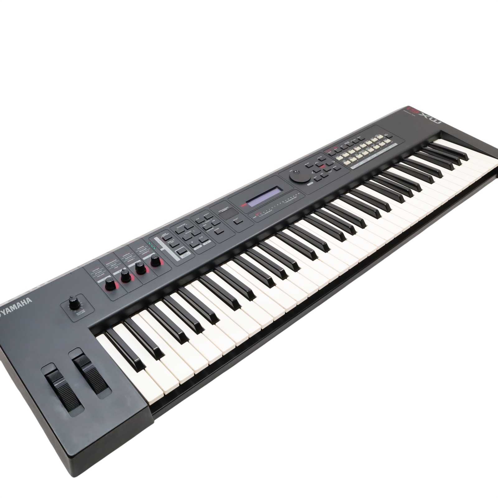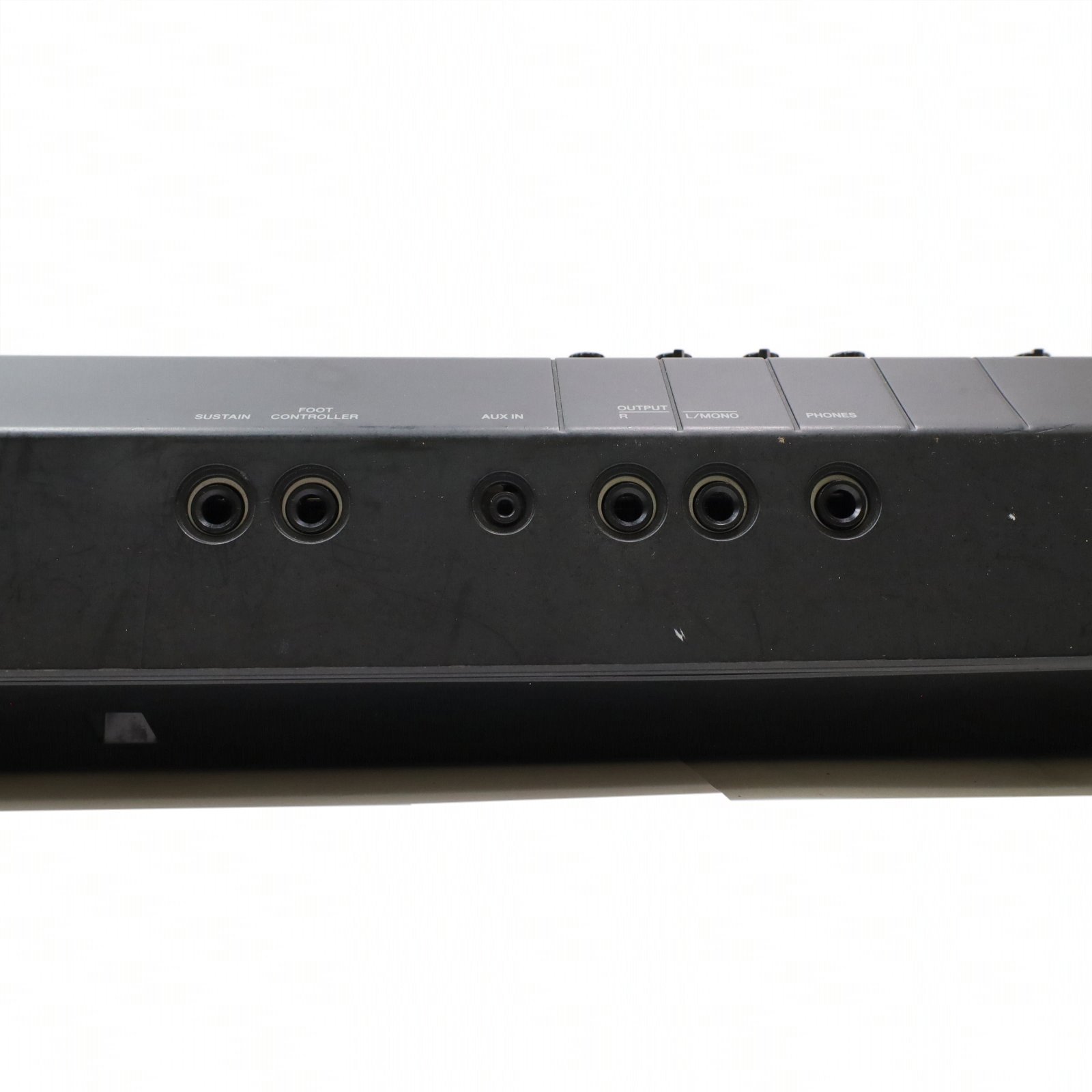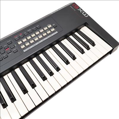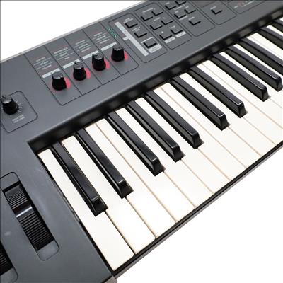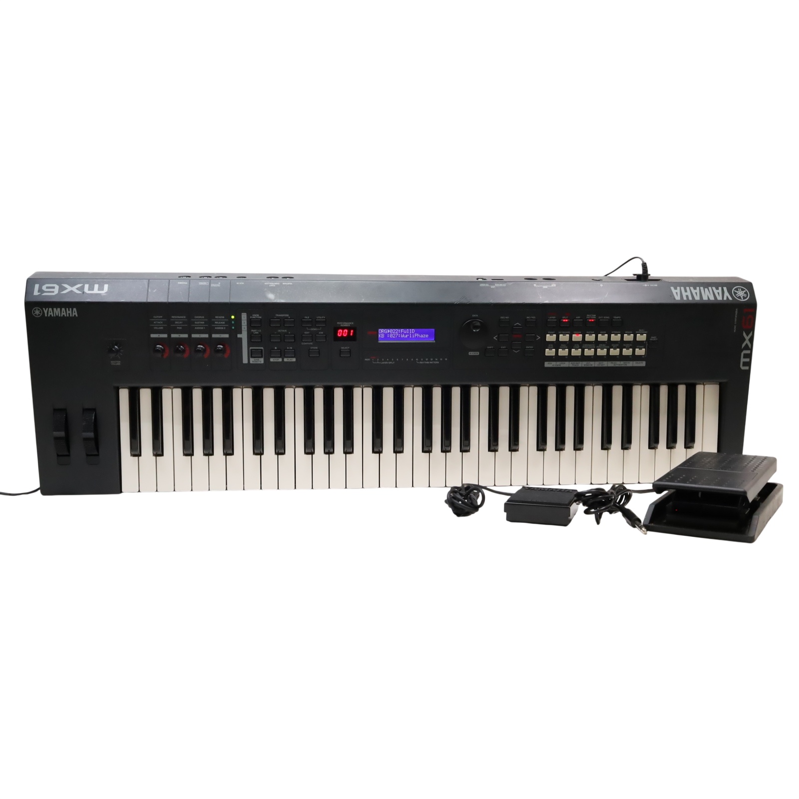 A 61-key music production keyboard synthesizer equipped with full-size velocity-sensitive keys. It features a MOTIF sound engine including over 1,000 presets, ranging from acoustic pianos and EPs to strings, drums, and synth textures. The unit supports 16-part multitimbral operation with 128-note polyphony. Connectivity options include a class-compliant USB audio and MIDI interface, a USB-to-device port for flash drive storage, and a 1/8-inch aux line input. The control surface includes knobs and buttons for adjusting internal sounds and DAW parameters. It incorporates VCM technology and Damper Resonance DSP for sound processing.