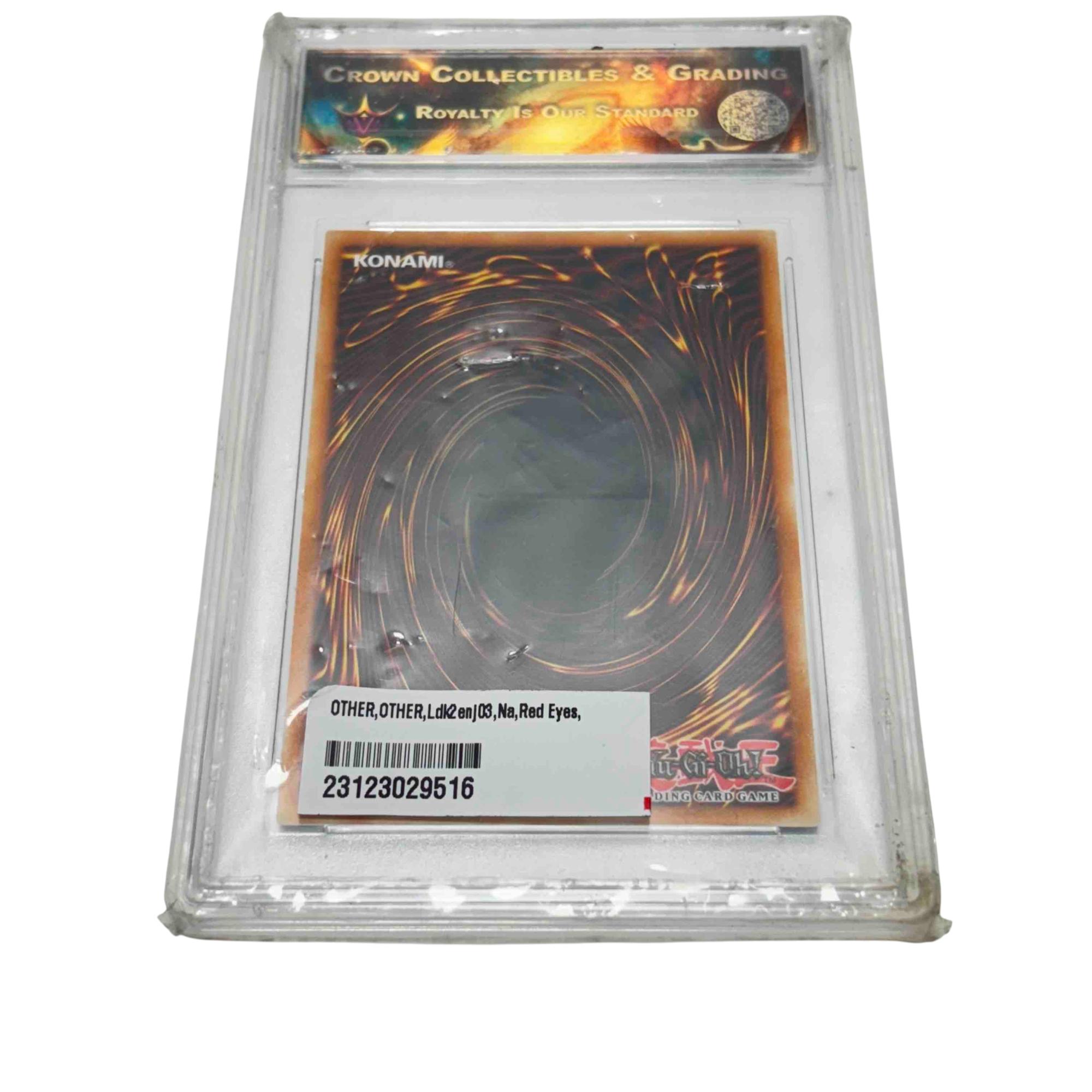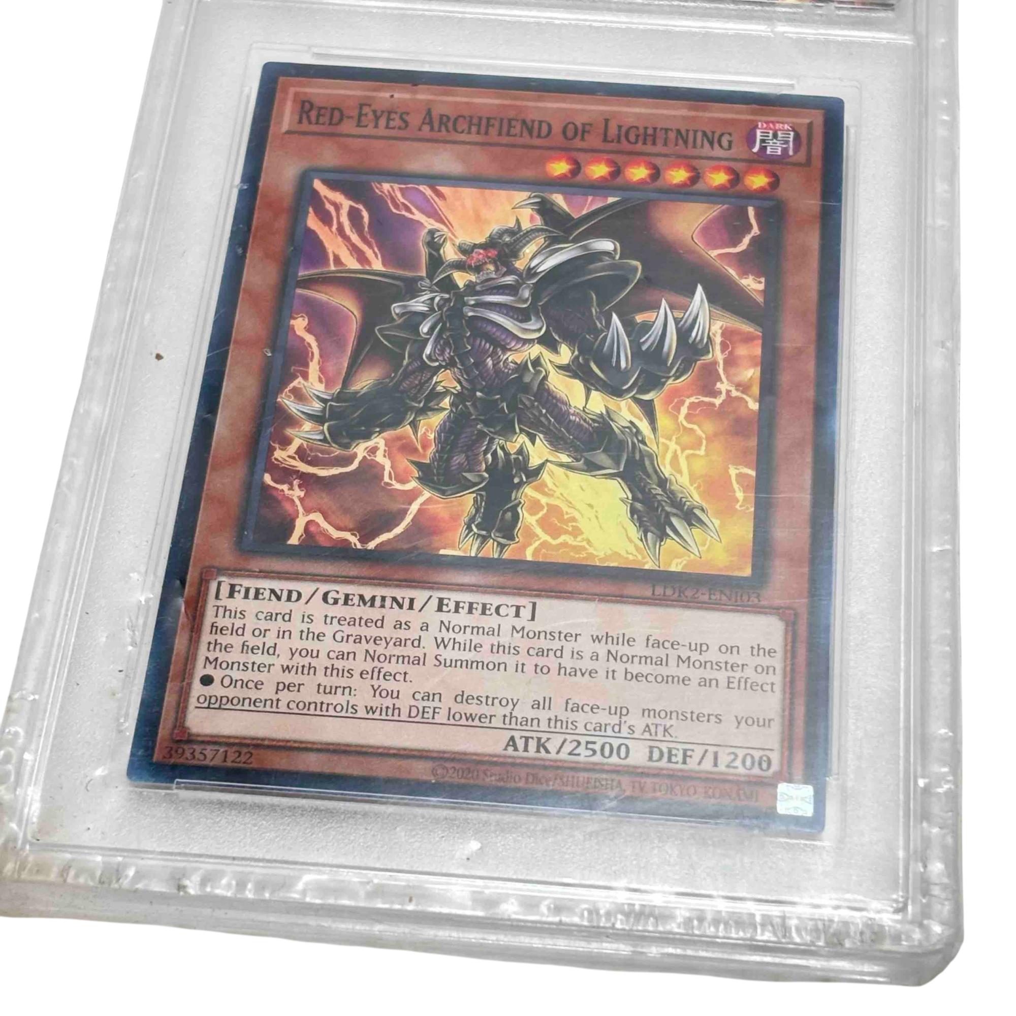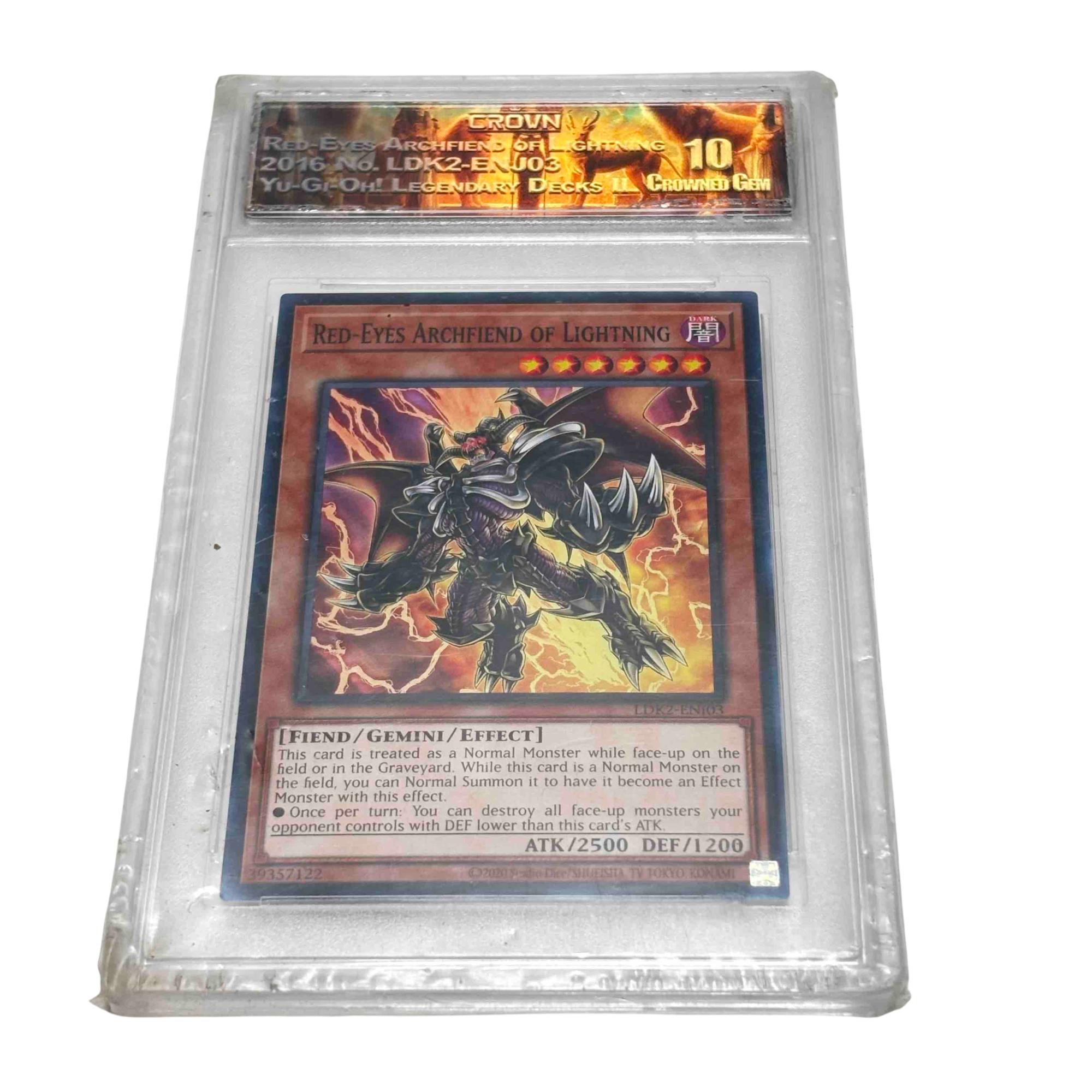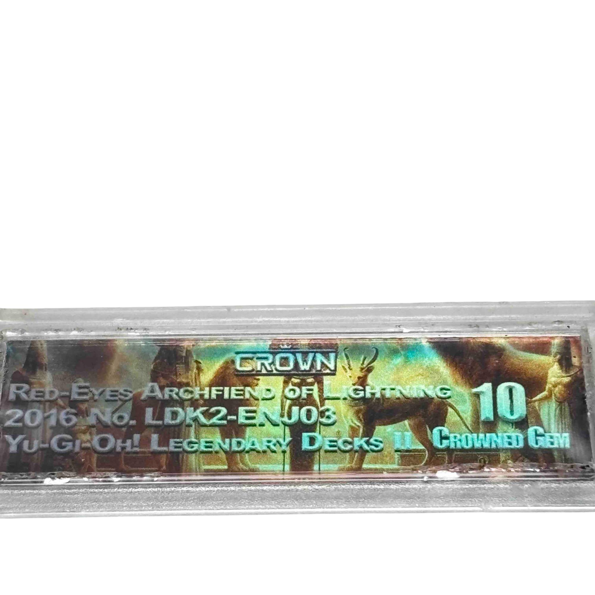 This is a graded Yu-Gi-Oh! Red-Eyes Archfiend of Lightning trading card (LDK2-ENJ03) encased by Crown Collectibles & Grading, perfect for serious collectors and fans of the legendary card game. Featuring the powerful Fiend/Gemini/Effect monster with stunning artwork and collectible value, its preserved in a hard plastic case for display and protection. Add this rare and visually striking card to elevate your trading card collection!