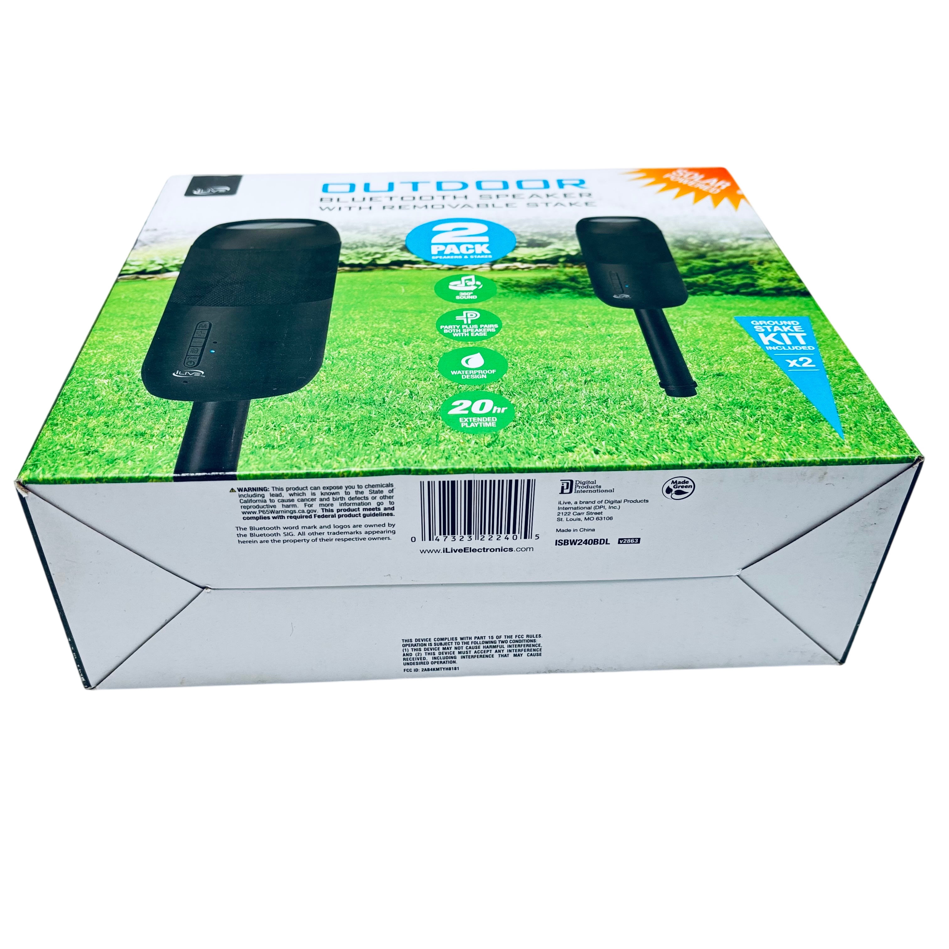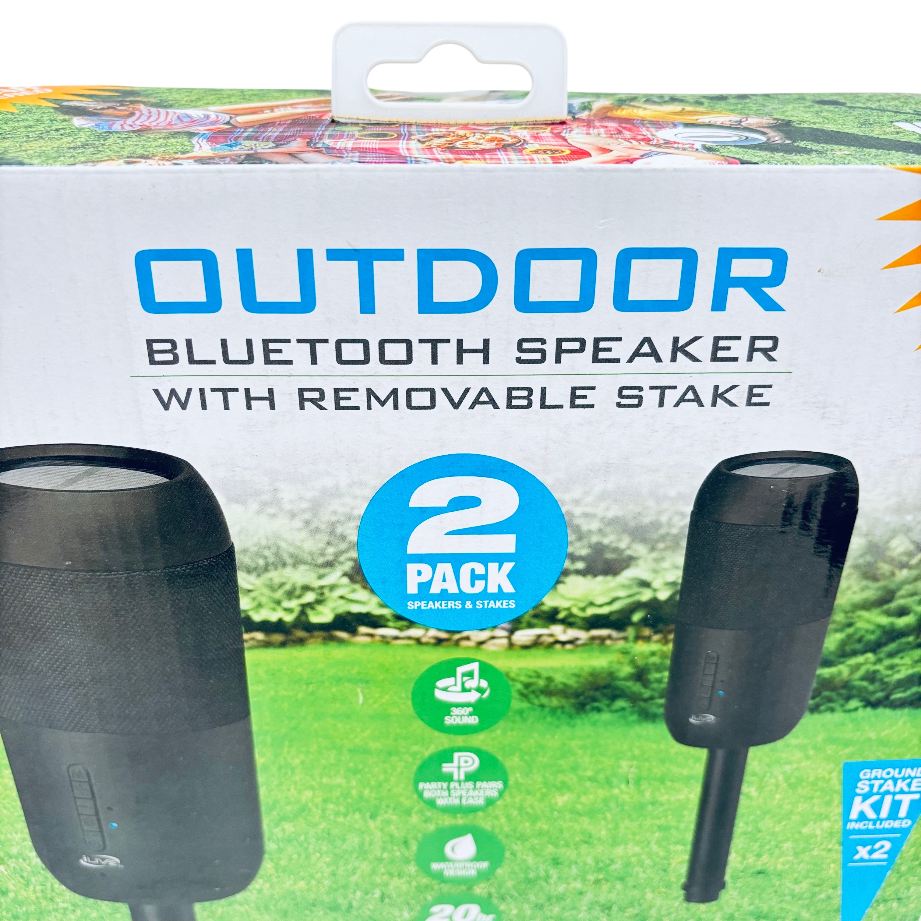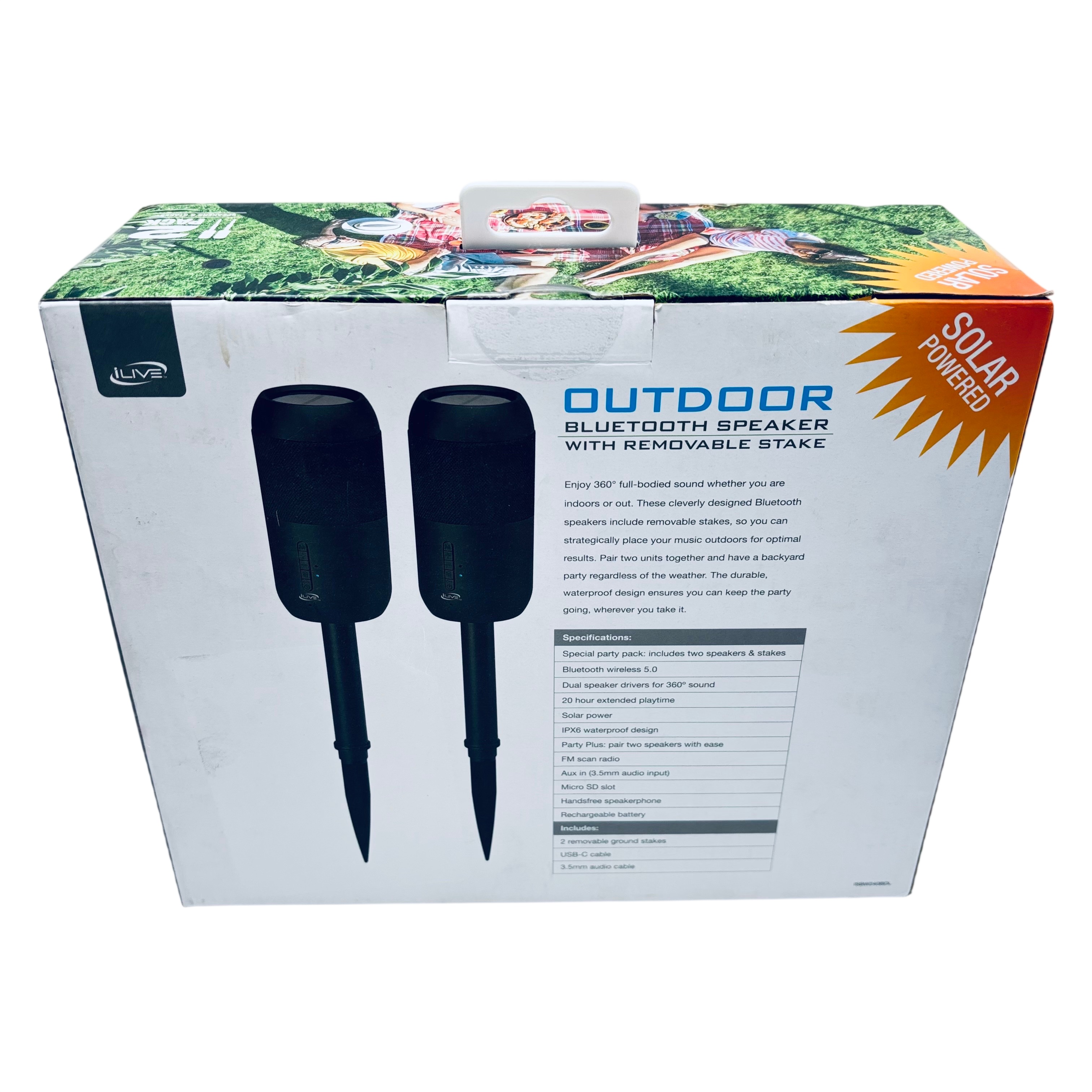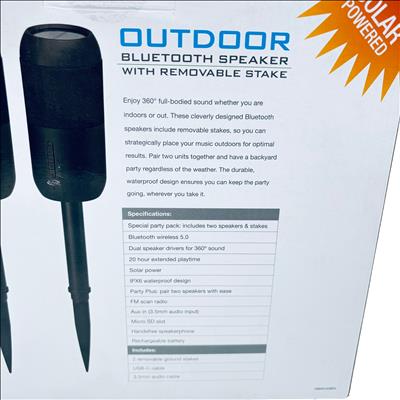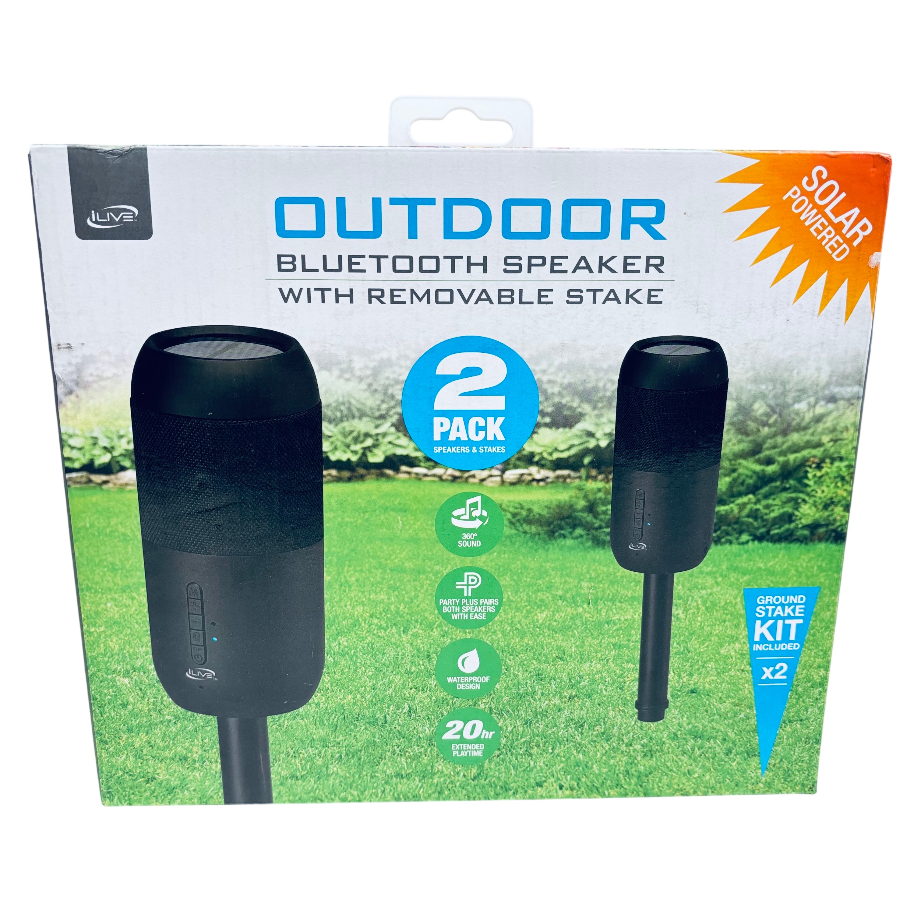 The iLive Outdoor Bluetooth Speaker 2 Pack (Model ISBW240BDL) offers a versatile and durable audio solution for outdoor entertainment. Featuring Bluetooth 5.0 connectivity, dual speaker drivers deliver 360° full-bodied sound, while the IPX6 waterproof design ensures reliable performance in various weather conditions. Powered by solar energy with a rechargeable battery, these speakers provide up to 20 hours of extended playtime. Each pack includes two speakers with removable ground stakes, allowing you to strategically place your music outdoors and easily pair both units using the Party Plus feature for an enhanced backyard party experience.