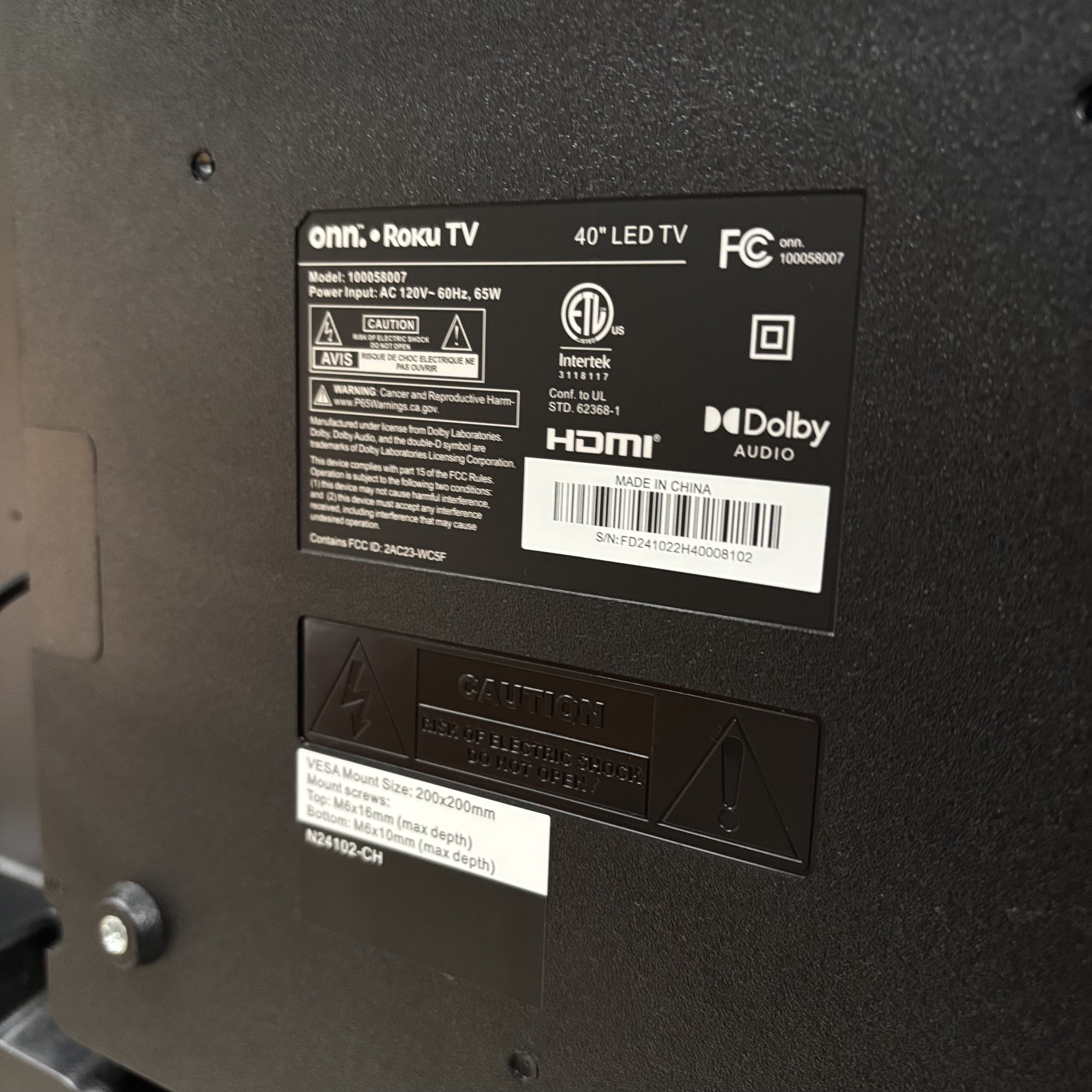 onn. 40" Class FHD (1080P) LED Roku Smart TV (Model: 100058007) features a full high-definition LED display that delivers crisp and vibrant 1080p resolution. This smart TV offers multiple HDMI inputs including an ARC-enabled port, built-in Dolby audio support, and a VESA 200x200mm compatible mounting design for versatile installation options.