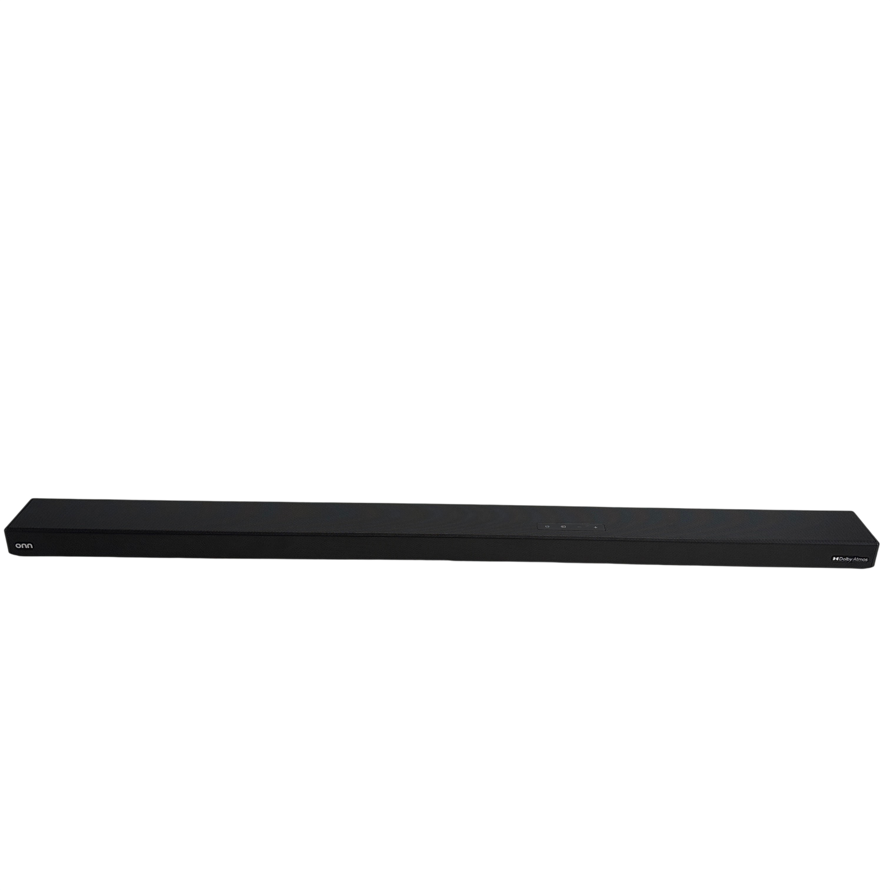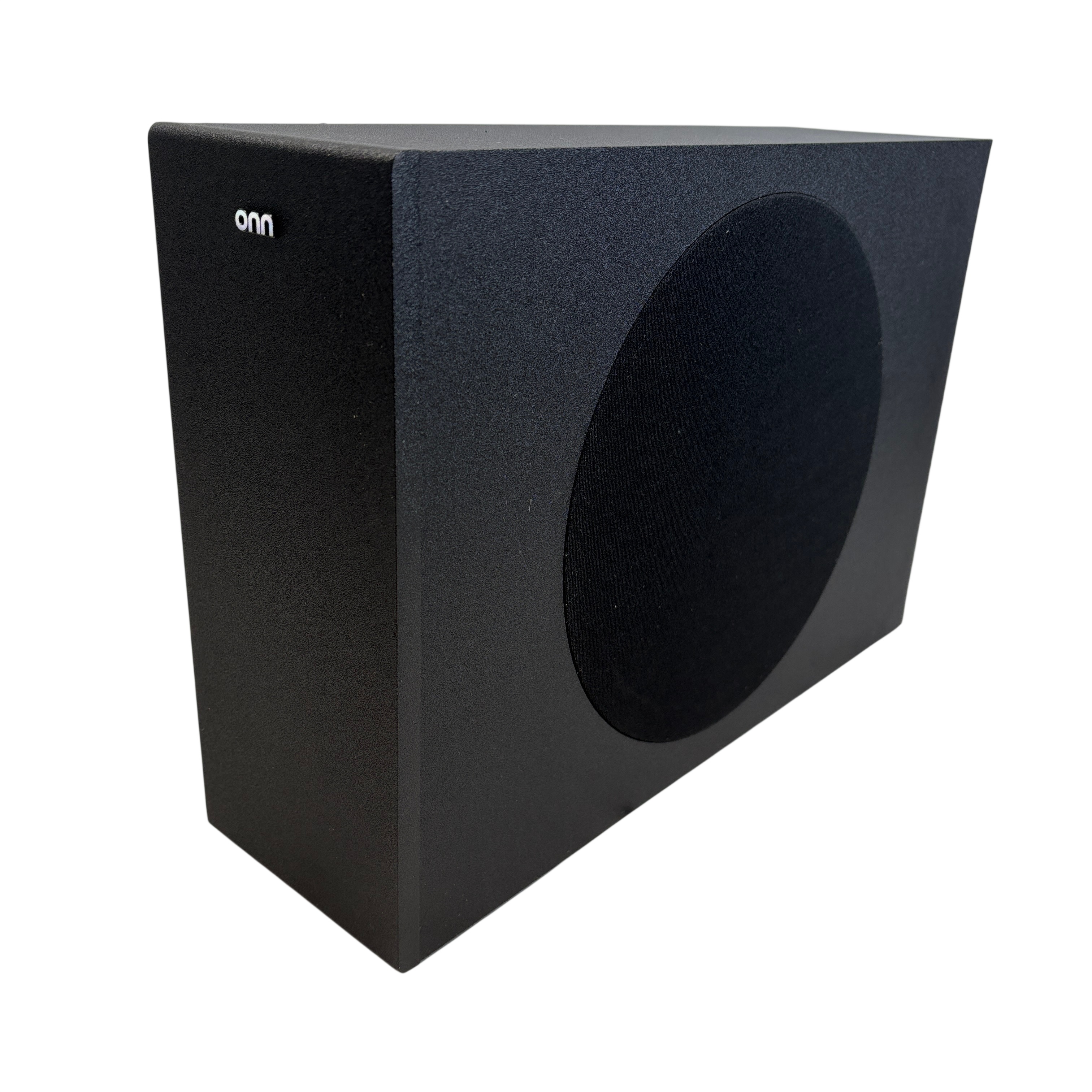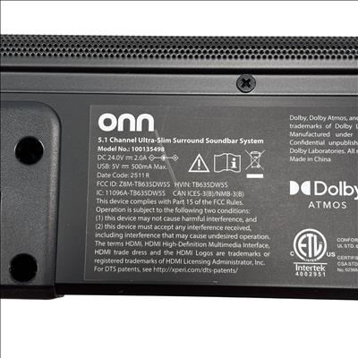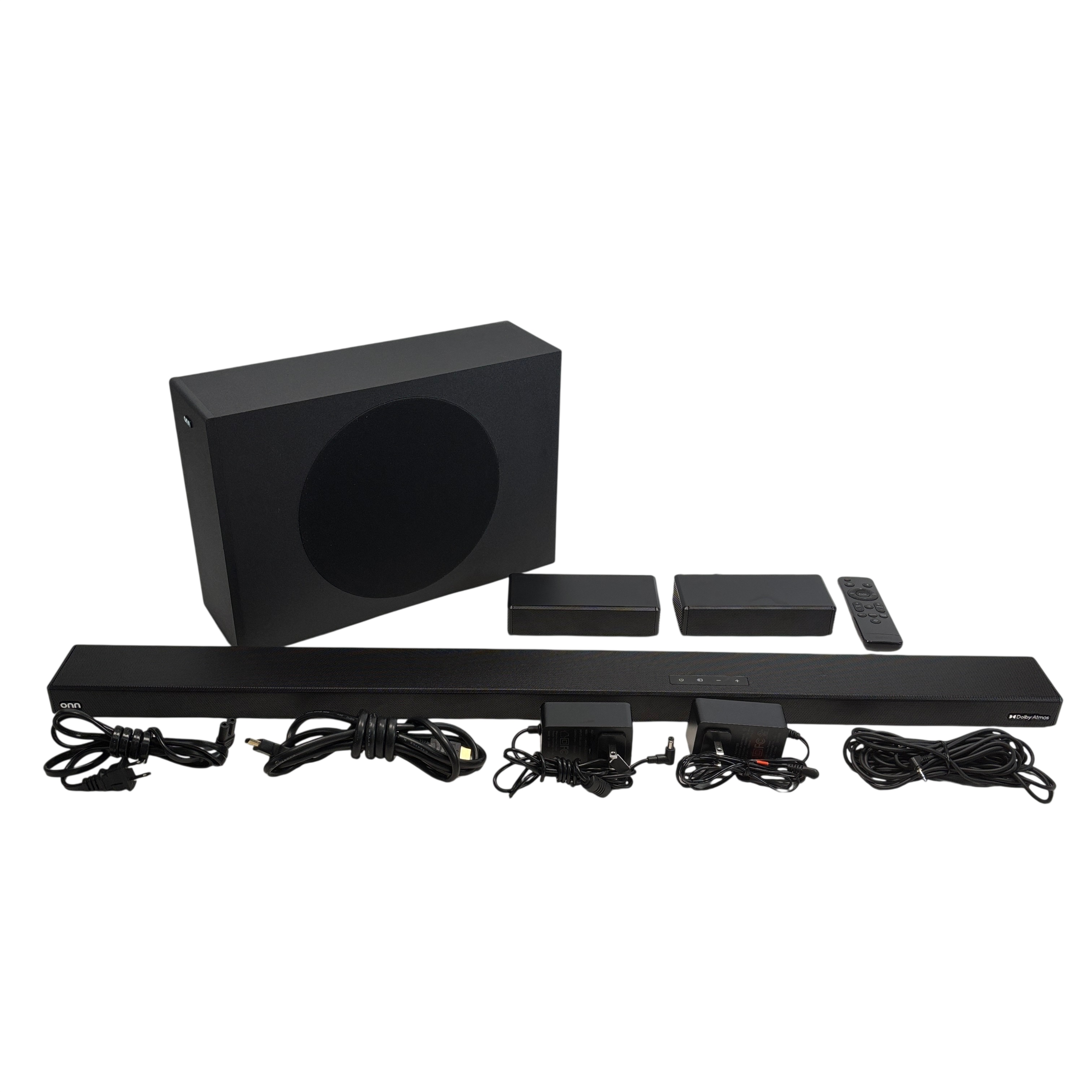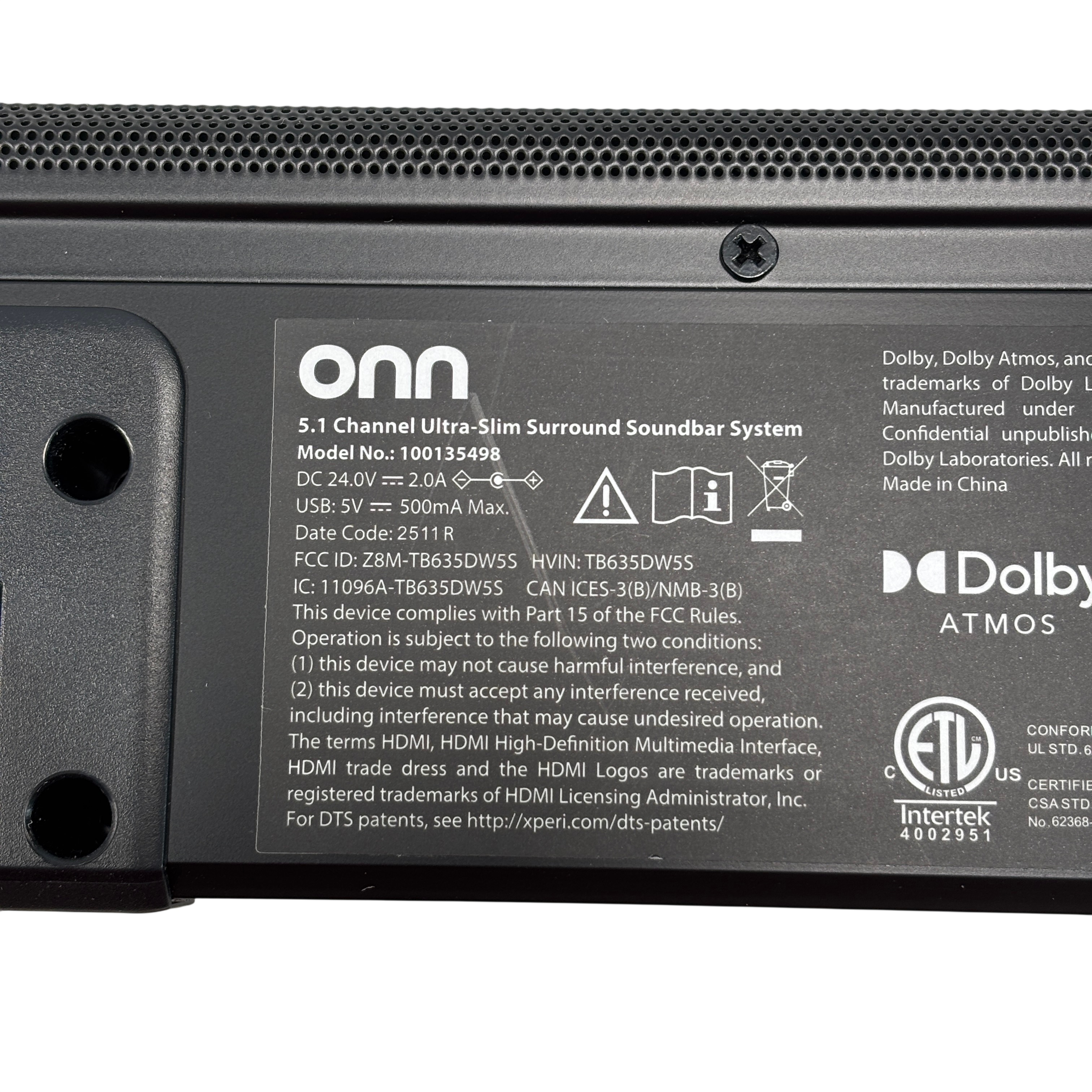 The onn. 5.1-Channel Ultra-Slim Soundbar System 100135498 delivers immersive home theater audio with Dolby Atmos support. This complete system includes an ultra-slim soundbar, wireless subwoofer, and two surround speakers for a full surround sound experience. Designed with sleek black finishes, it features easy setup with included power cords, HDMI cable, and remote control. Ideal for enhancing your TV audio with rich, room-filling sound and deep bass, this system is perfect for home entertainment enthusiasts seeking quality and style.