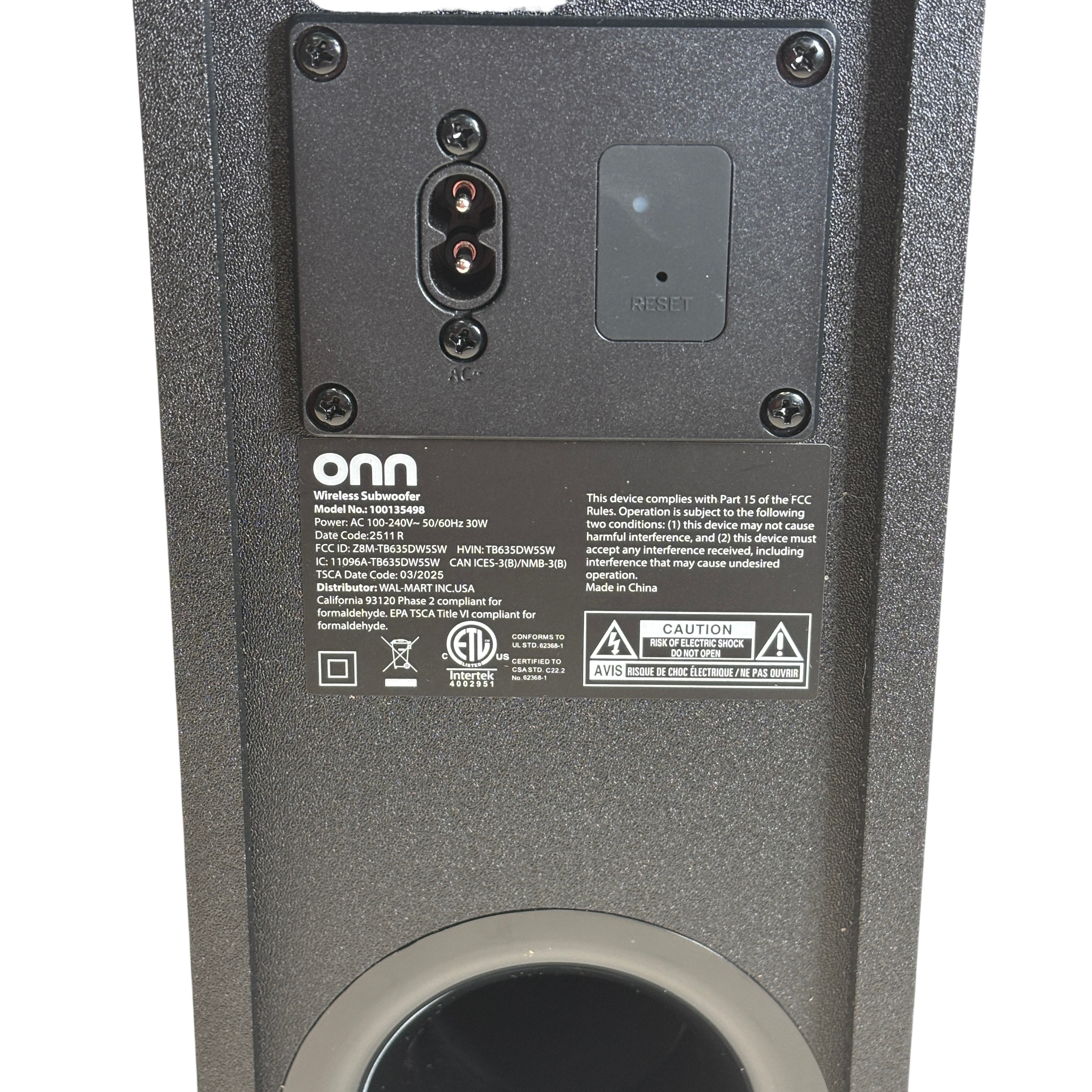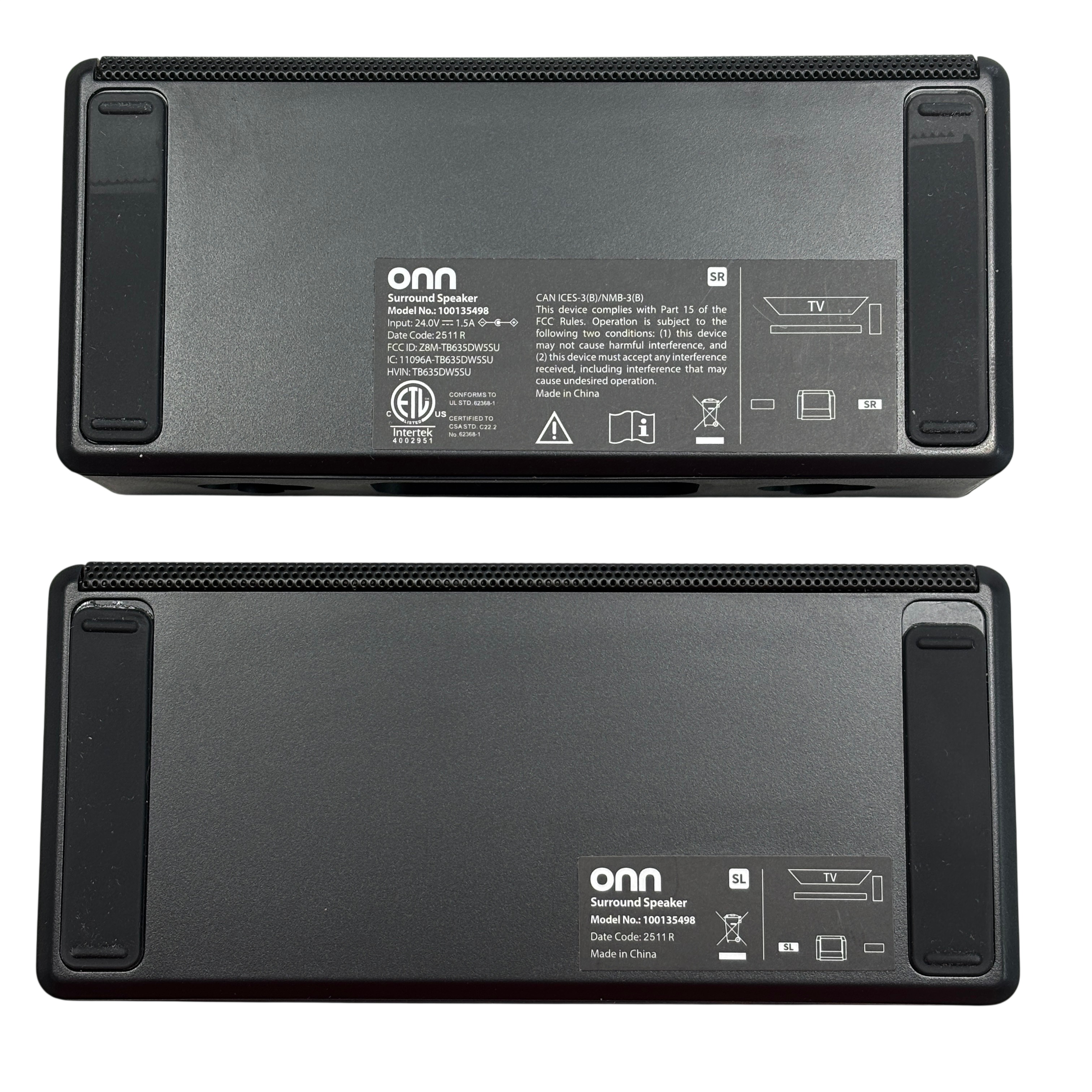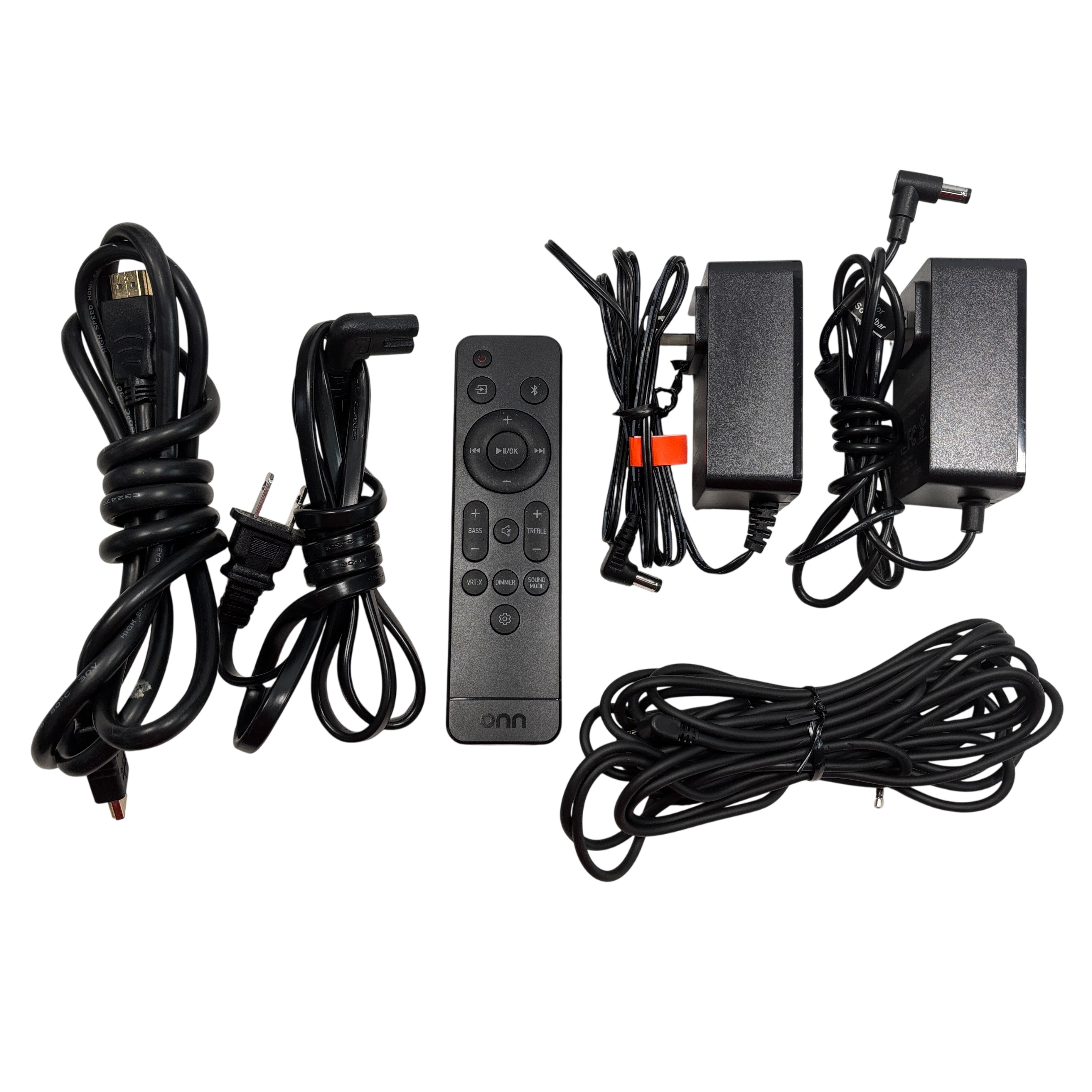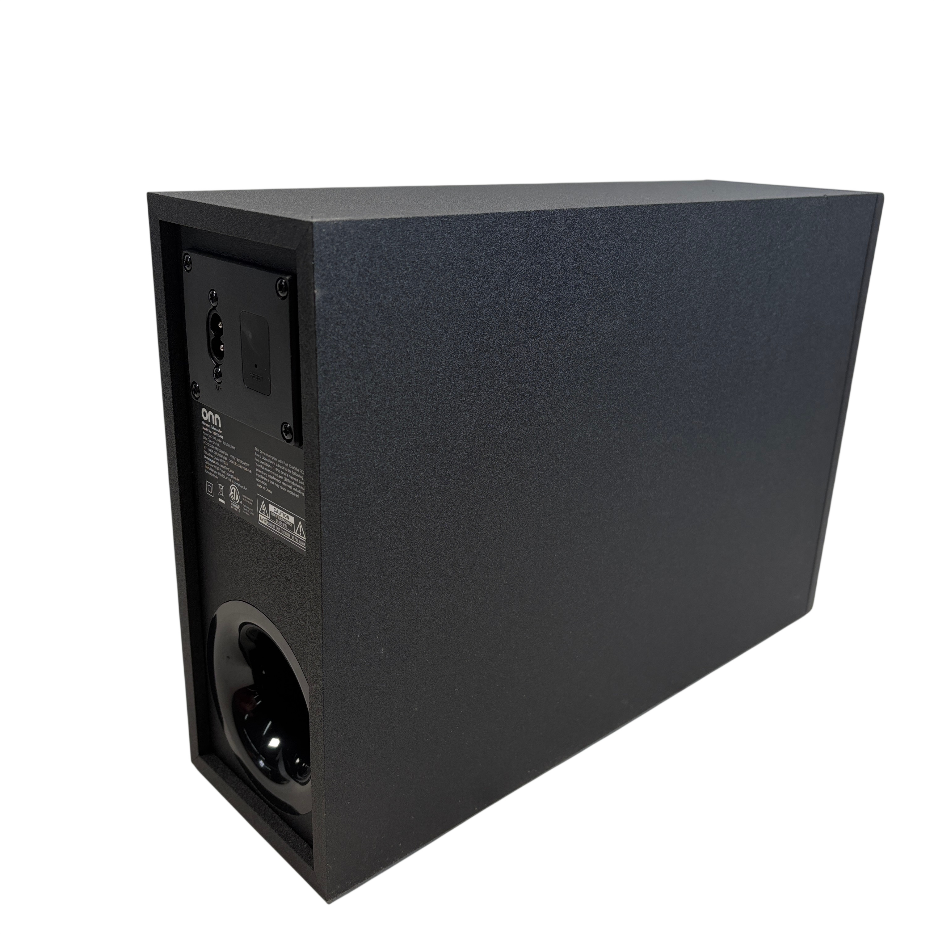 The onn. 5.1-Channel Ultra-Slim Soundbar System 100135498 delivers immersive home theater audio with Dolby Atmos support. This complete system includes an ultra-slim soundbar, wireless subwoofer, and two surround speakers for a full surround sound experience. Designed with sleek black finishes, it features easy setup with included power cords, HDMI cable, and remote control. Ideal for enhancing your TV audio with rich, room-filling sound and deep bass, this system is perfect for home entertainment enthusiasts seeking quality and style.